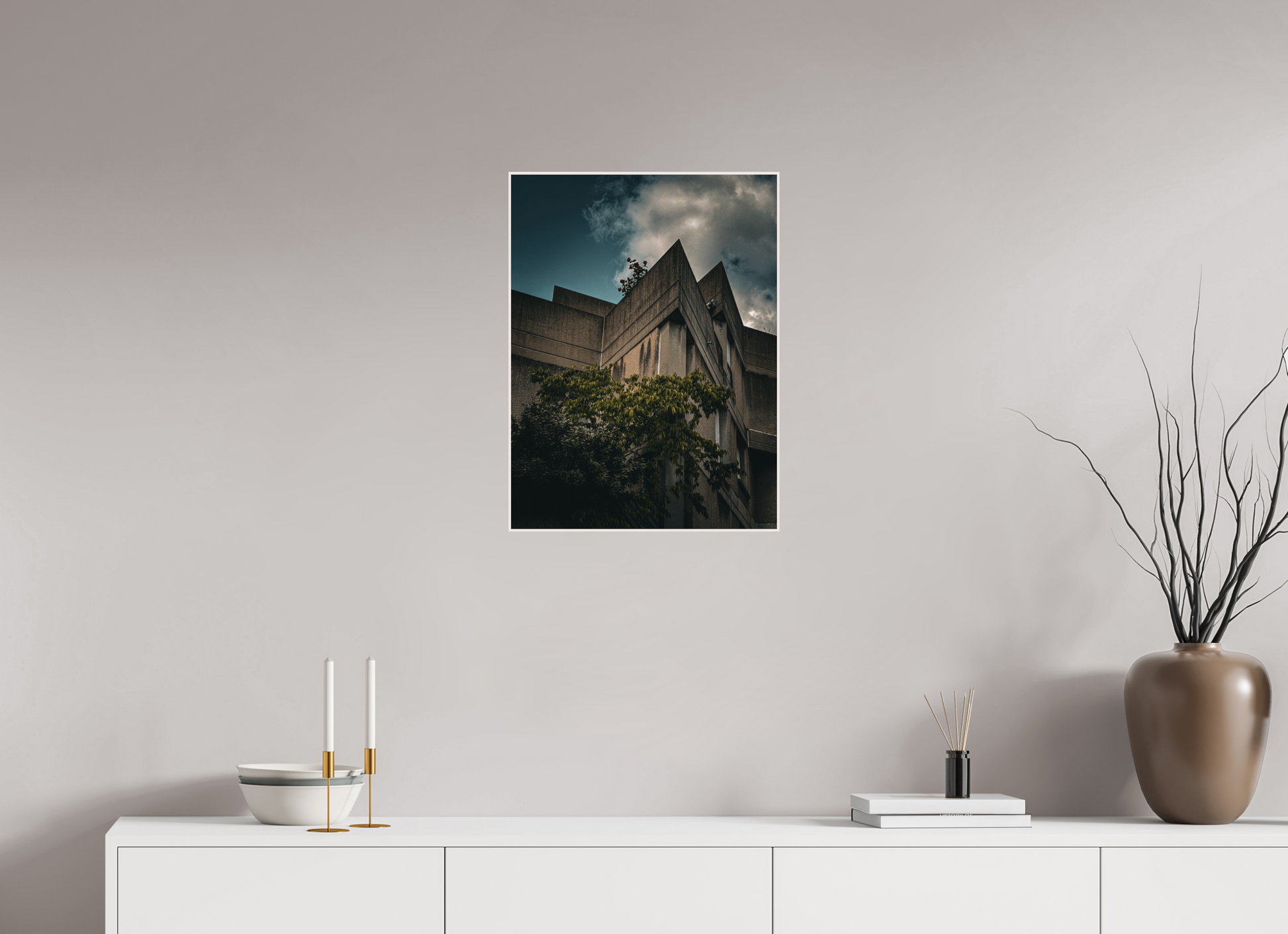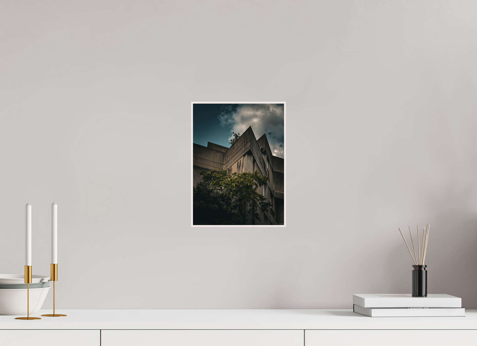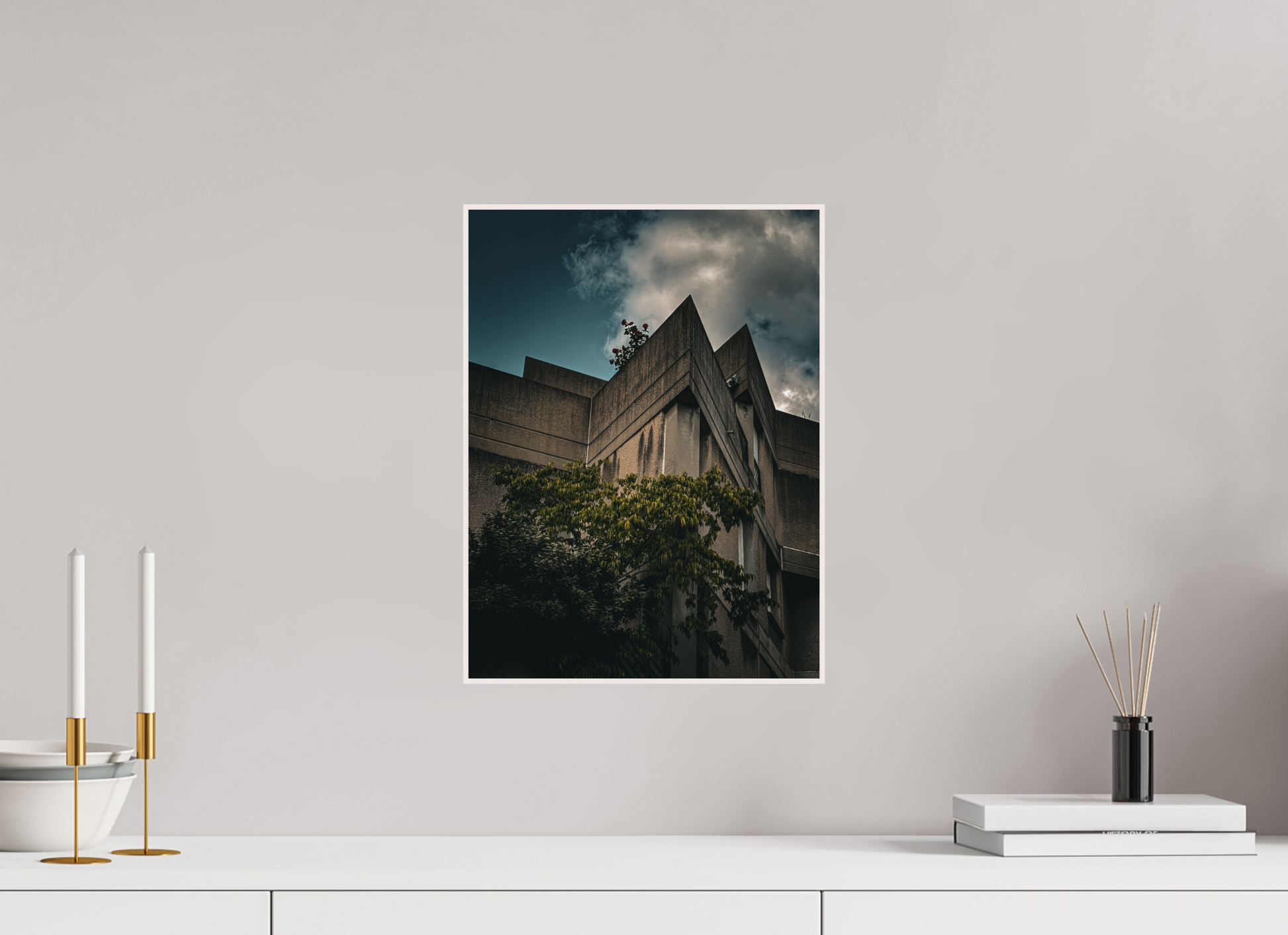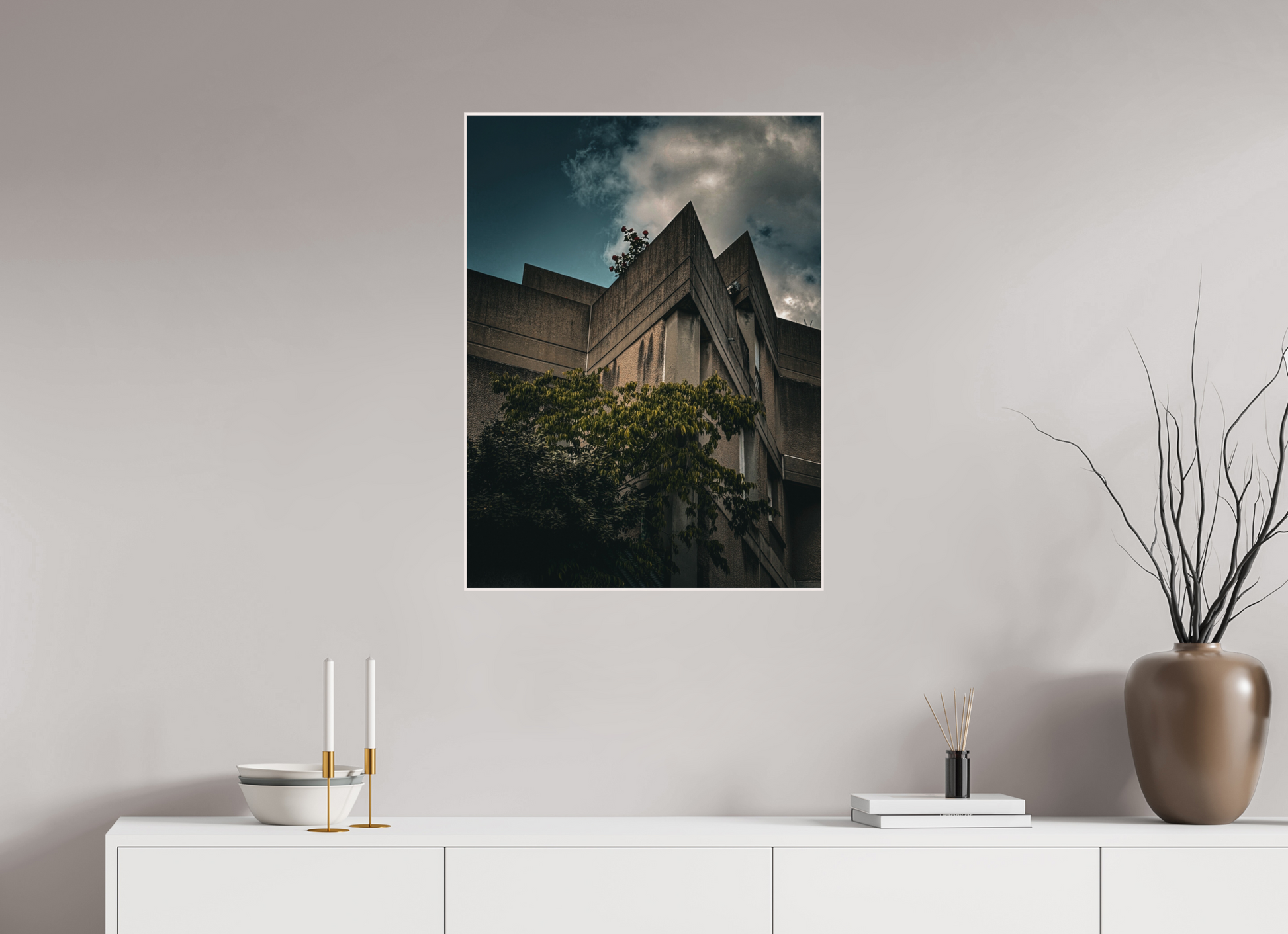 Hierdie beeld vang die essensie van brutalistiese argitektuur vas met sy vet, hoekige lyne en skerp betonvorms. Die foto beklemtoon die dramatiese wisselwerking tussen die mensgemaakte strukture en die natuurlike lug, wat 'n treffende visuele kontras skep. Die perspektief beklemtoon die grootsheid en imposante aard van die geboue en vertoon die unieke estetika van brutalisme.