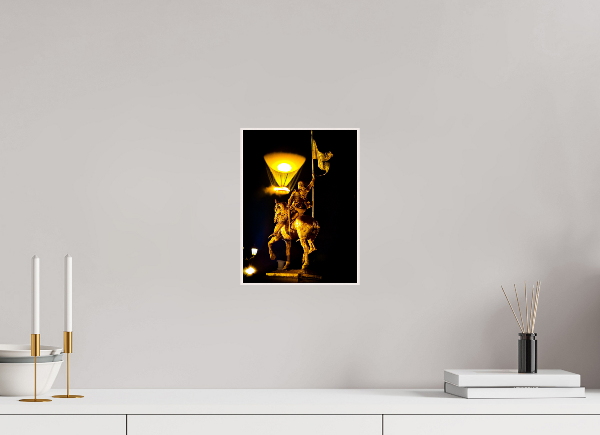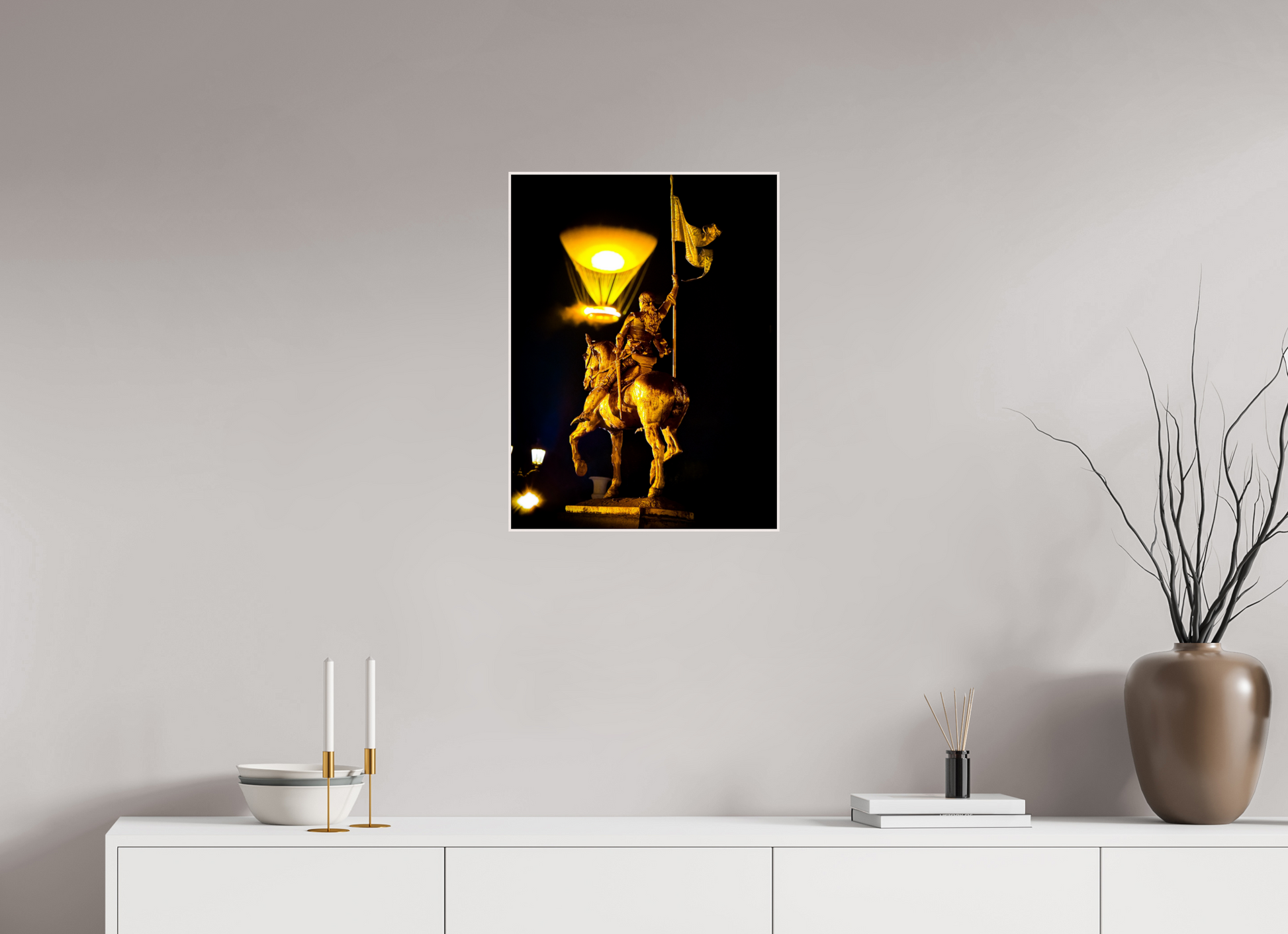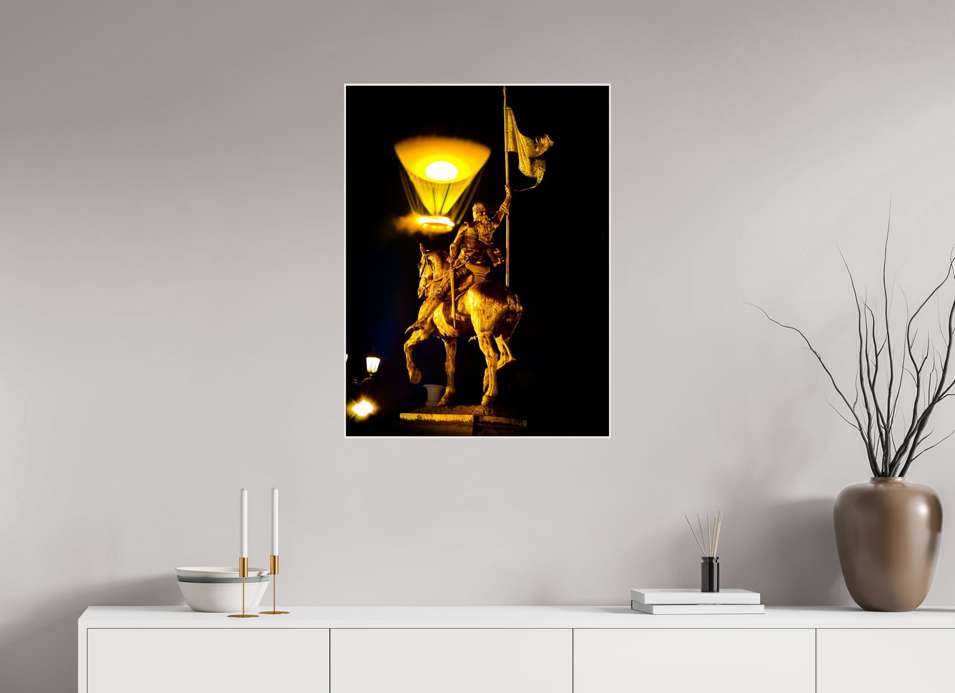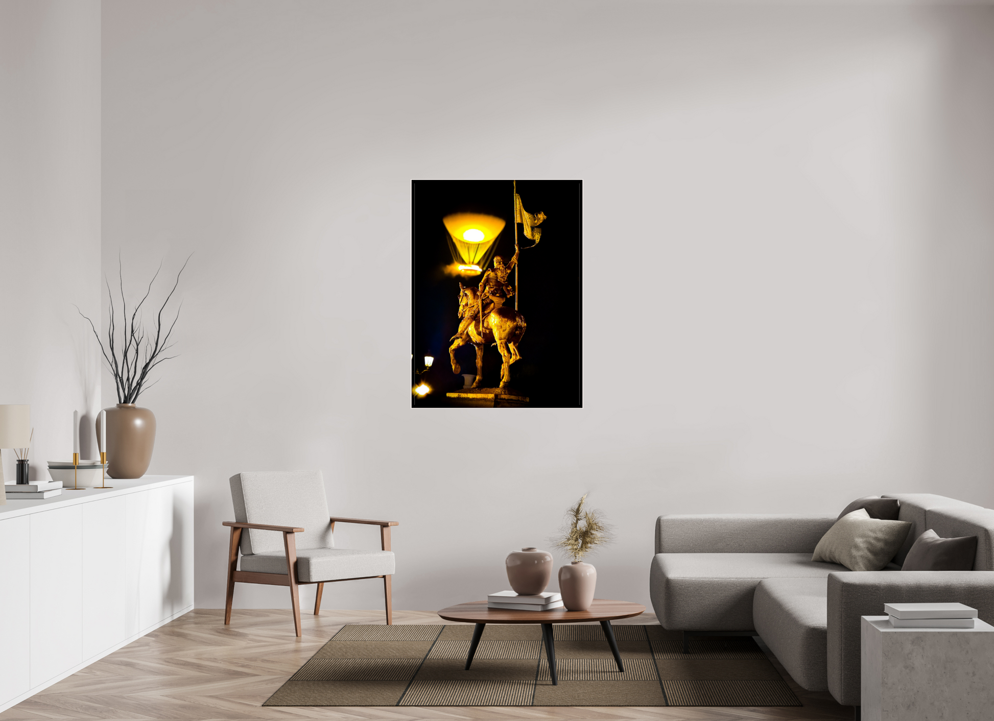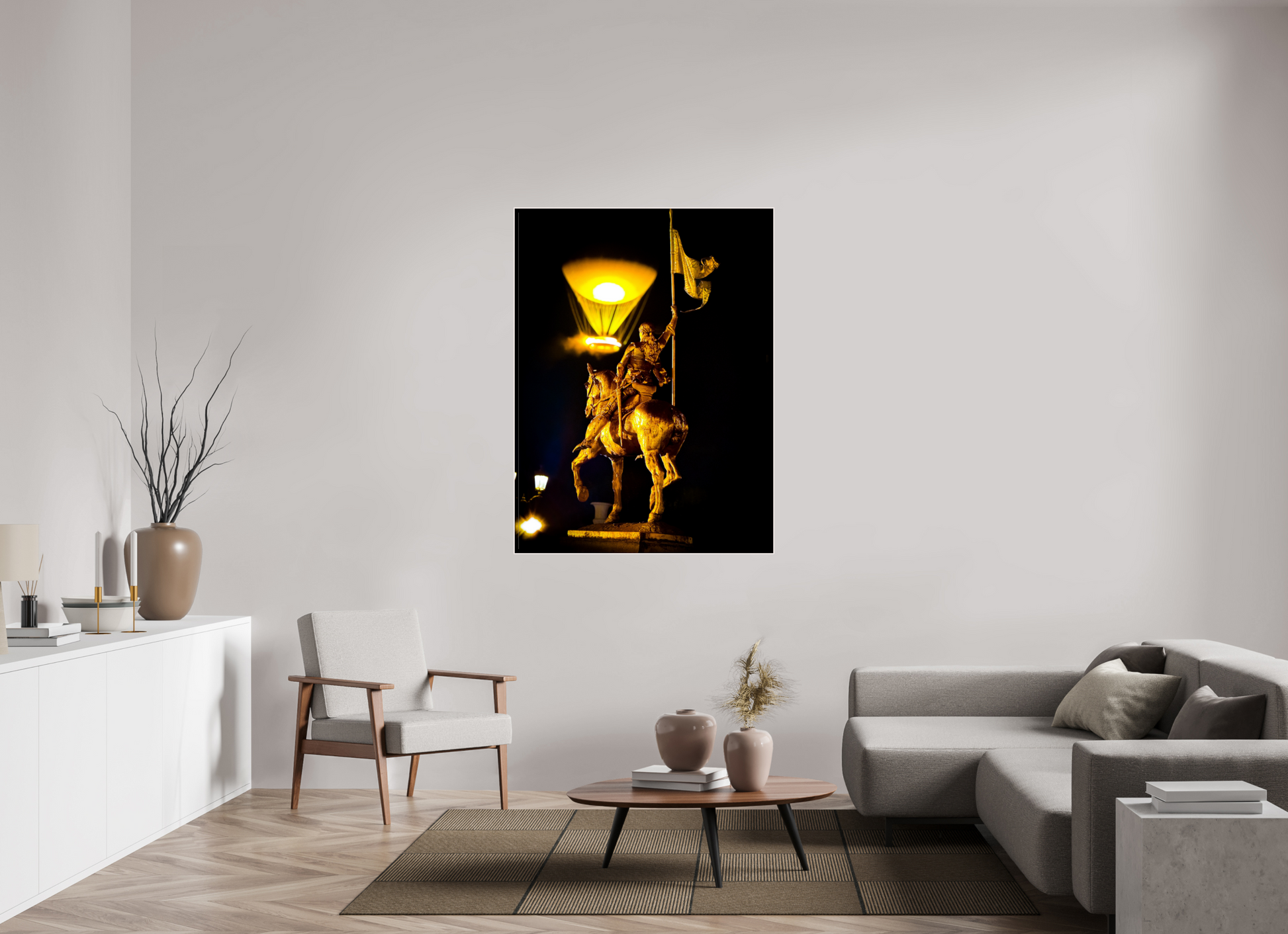 Onder die warm gloed van 'n straatlamp verskyn die standbeeld van 'n gemonteerde figuur uit die nag, gebad in 'n goue lig wat die ingewikkelde besonderhede en majestueuse postuur beklemtoon. Die spel van lig en skaduwee skep 'n dramatiese kontras, wat die figuur se wapenrusting en die vloeiende draperie van die perd beklemtoon. Die toneel is deurdrenk met 'n gevoel van plegtigheid en eerbied, aangesien die standbeeld as 'n stille wag in die donkerte staan.