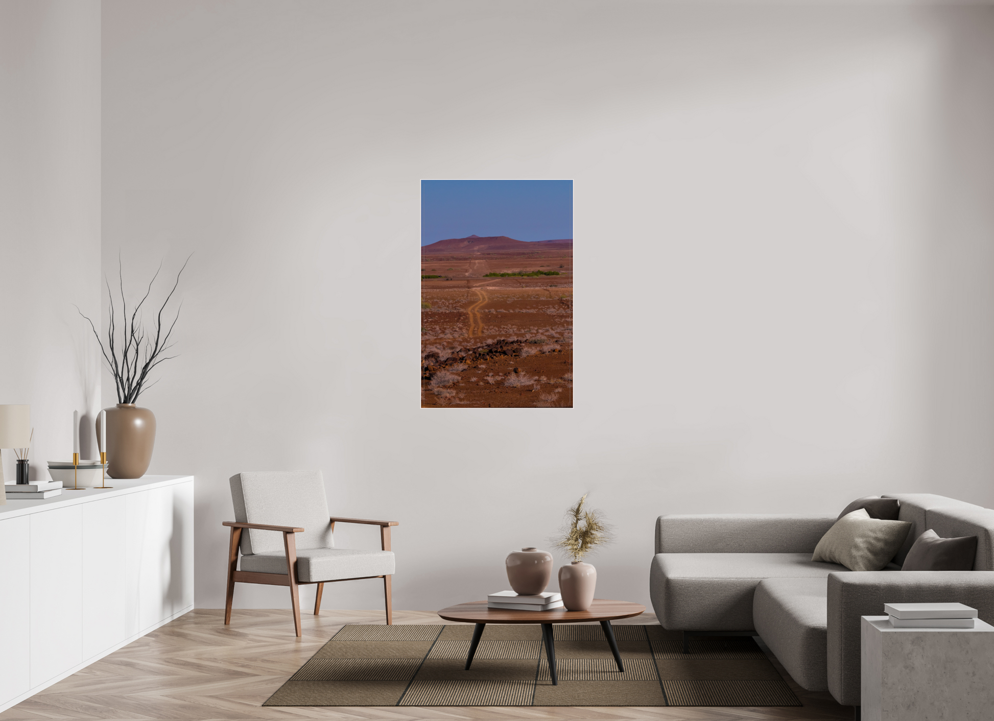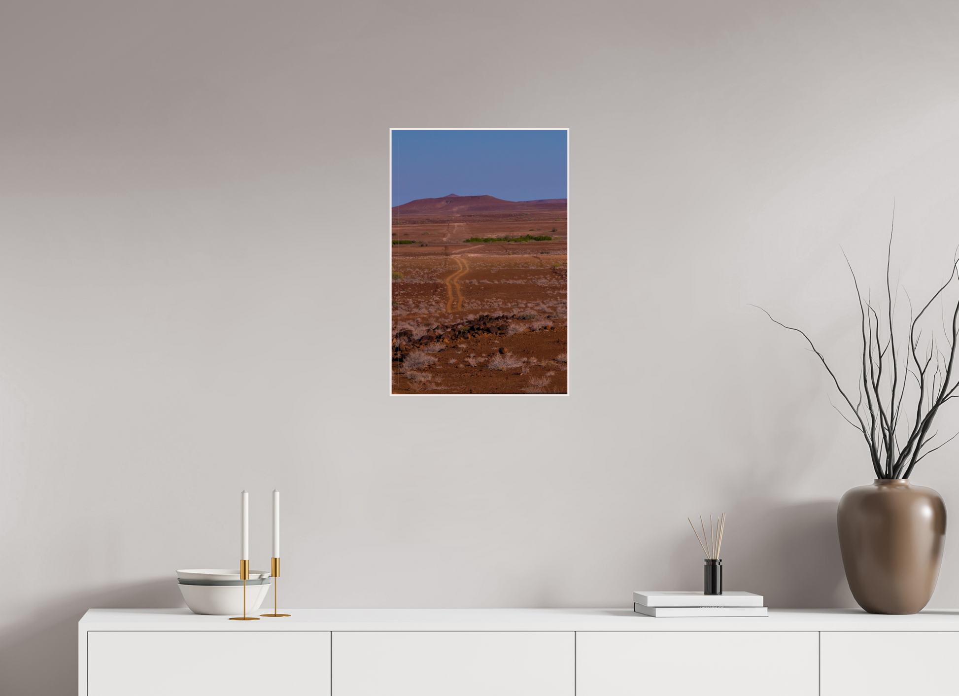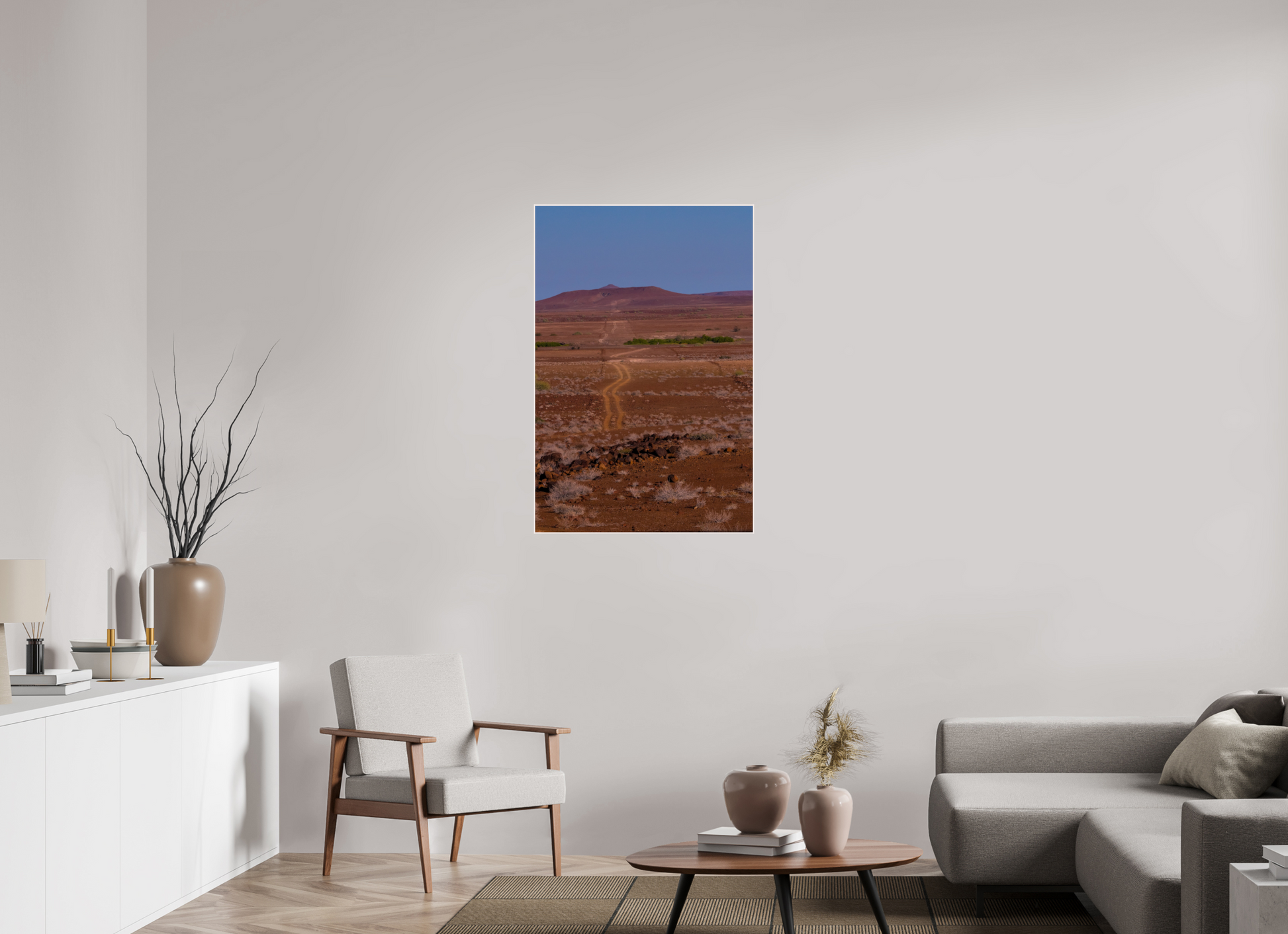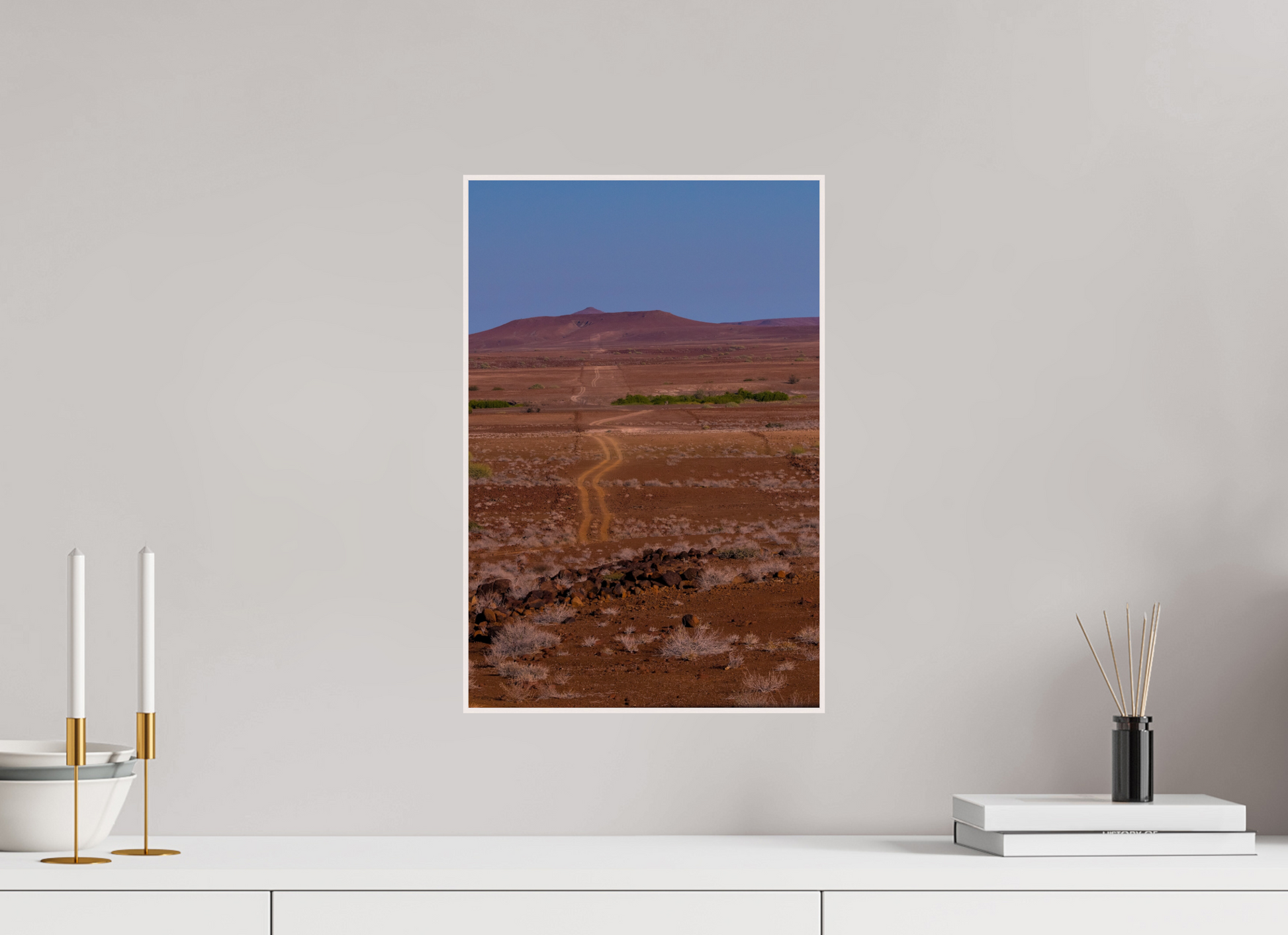 Hierdie asemrowende beeld vang die uitgestrekte en ruwe skoonheid van die Namibiese landskap vas. 'n Kronkelende grondpad sny deur die dorre terrein en lei die kyker se oog na die verre berge wat majestueus teen die helderblou lug verrys. Die skerp kontras tussen die rooi aarde en die welige groen plantegroei beklemtoon die veerkragtigheid en diversiteit van die lewe in hierdie strawwe omgewing. Die beeld roep 'n gevoel van avontuur en verkenning op en nooi die kyker uit om 'n reis deur een van die wêreld se mees asemrowende en ongerepte landskappe aan te pak.