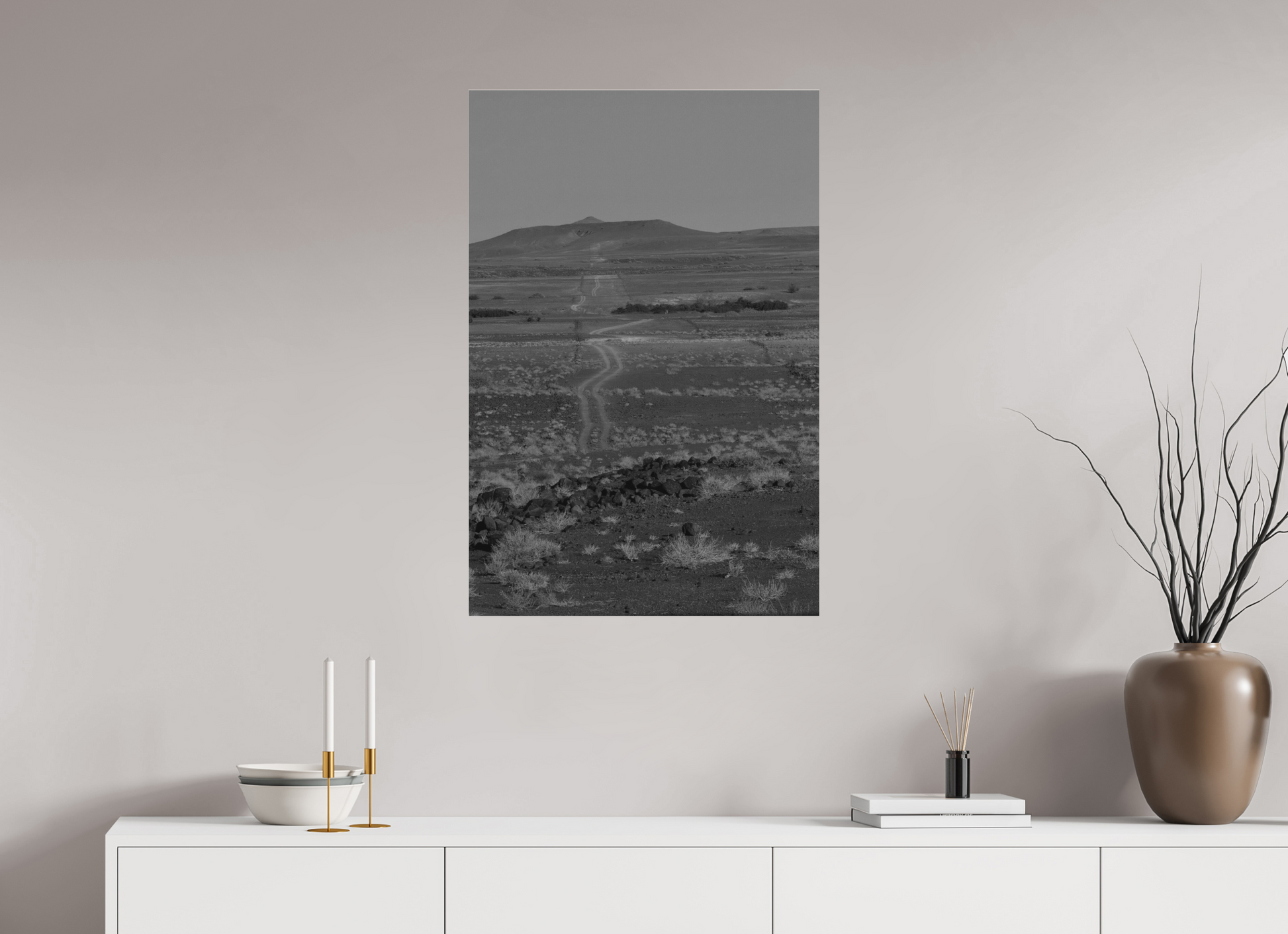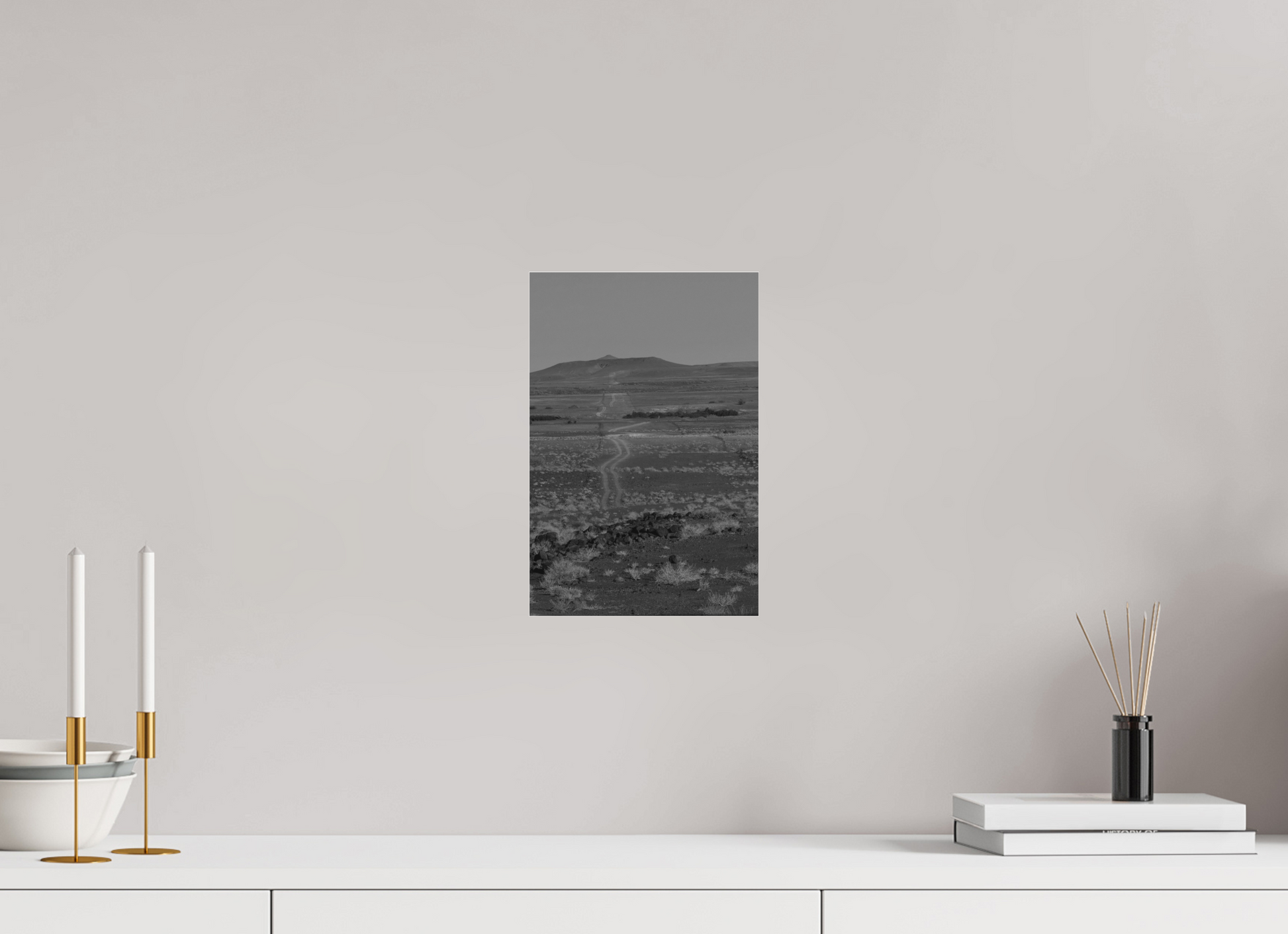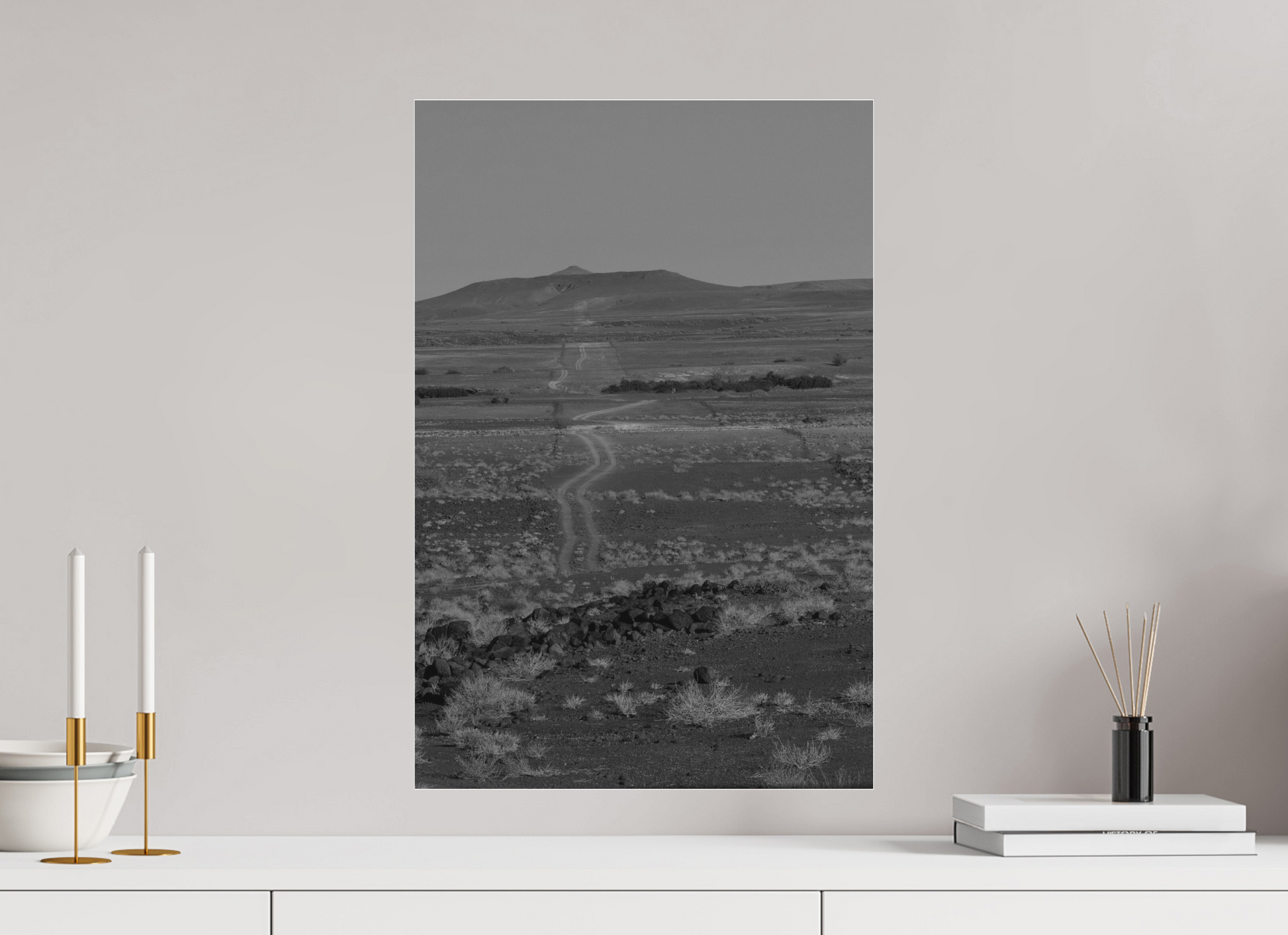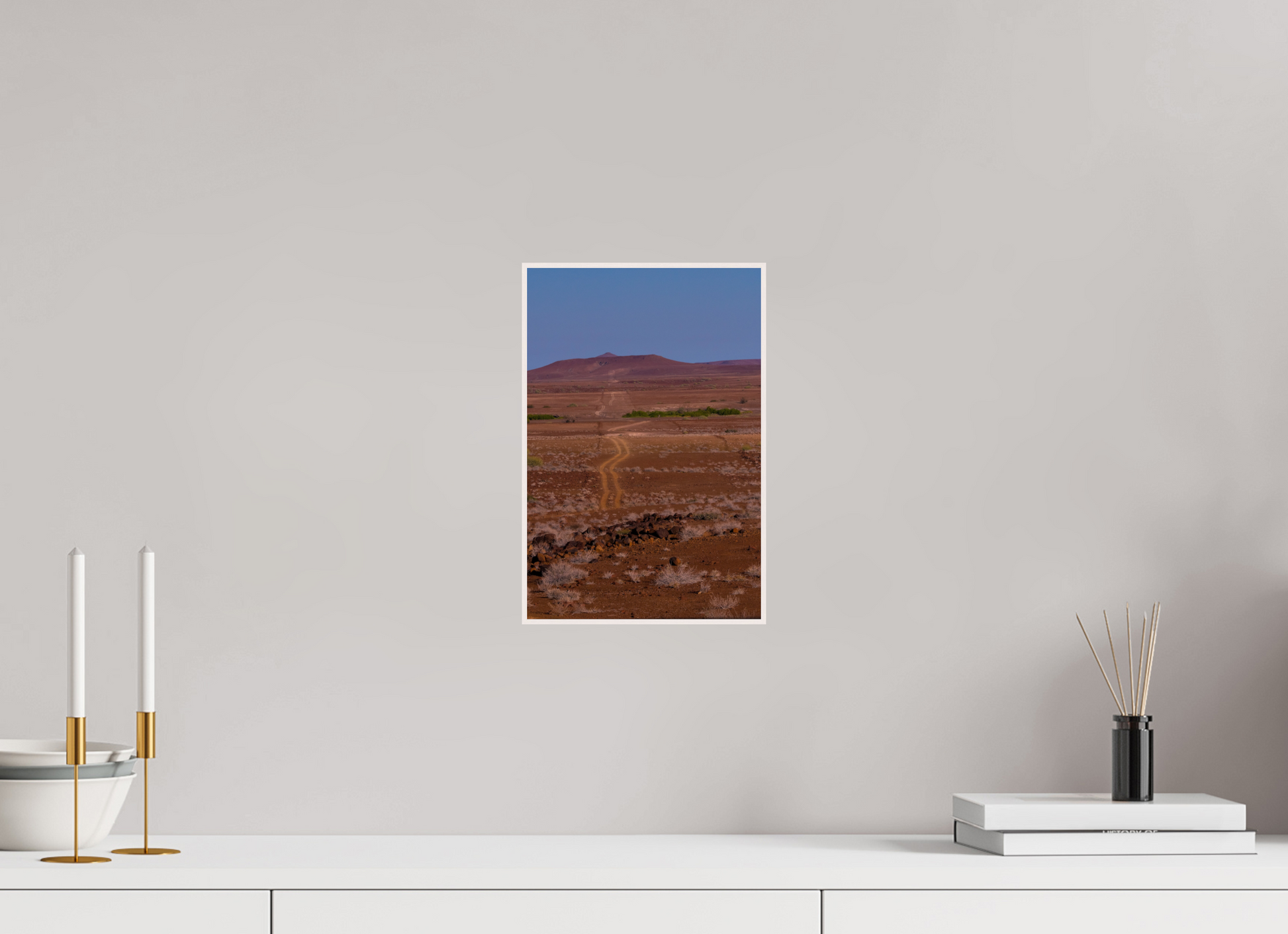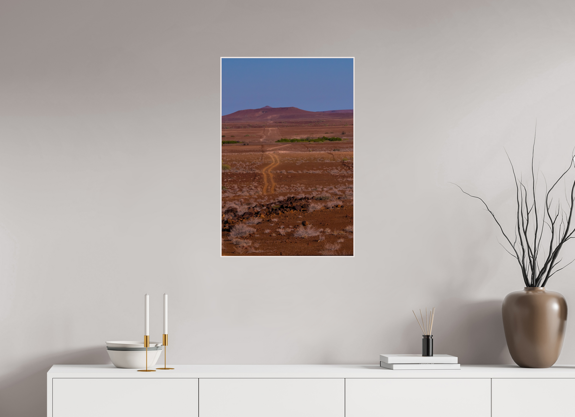 Hierdie asemrowende beeld vang die uitgestrekte en ruwe skoonheid van die Namibiese landskap vas. 'n Kronkelende grondpad sny deur die dorre terrein en lei die kyker se oog na die verre berge wat majestueus teen die helderblou lug verrys. Die skerp kontras tussen die rooi aarde en die welige groen plantegroei beklemtoon die veerkragtigheid en diversiteit van die lewe in hierdie strawwe omgewing. Die beeld roep 'n gevoel van avontuur en verkenning op en nooi die kyker uit om 'n reis deur een van die wêreld se mees asemrowende en ongerepte landskappe aan te pak.