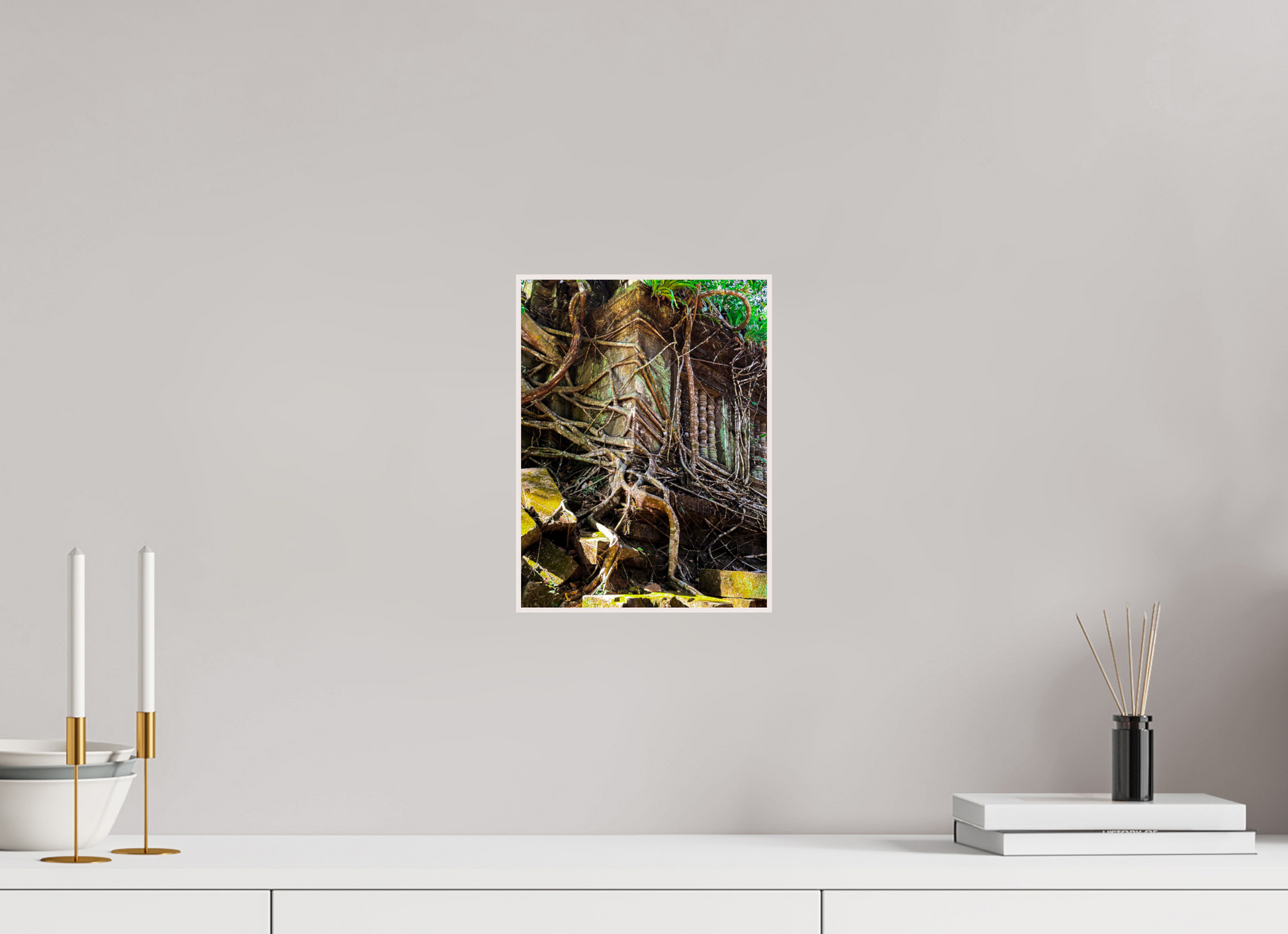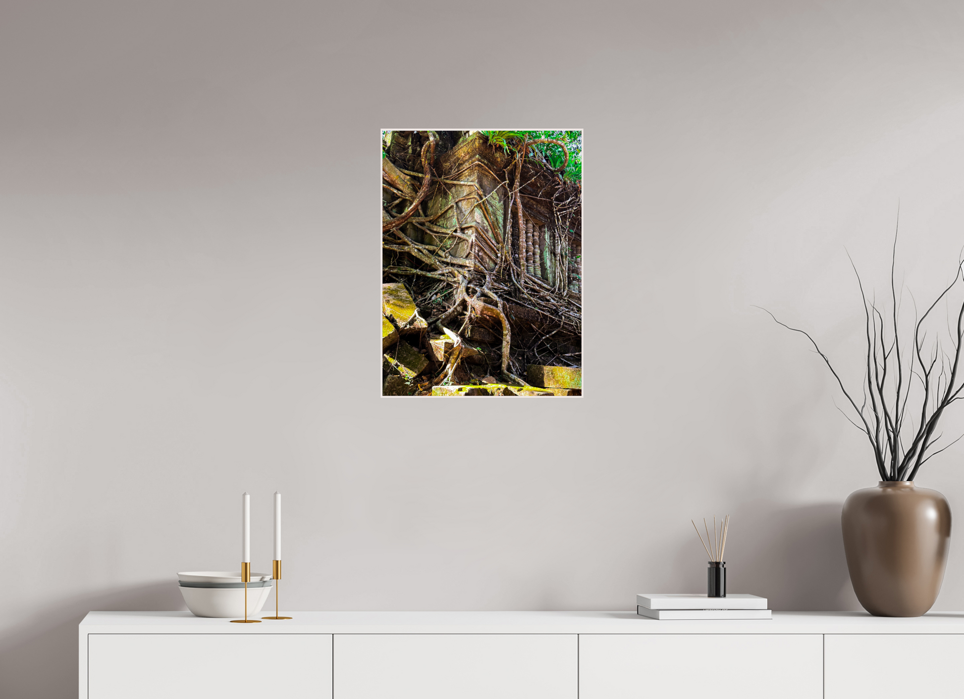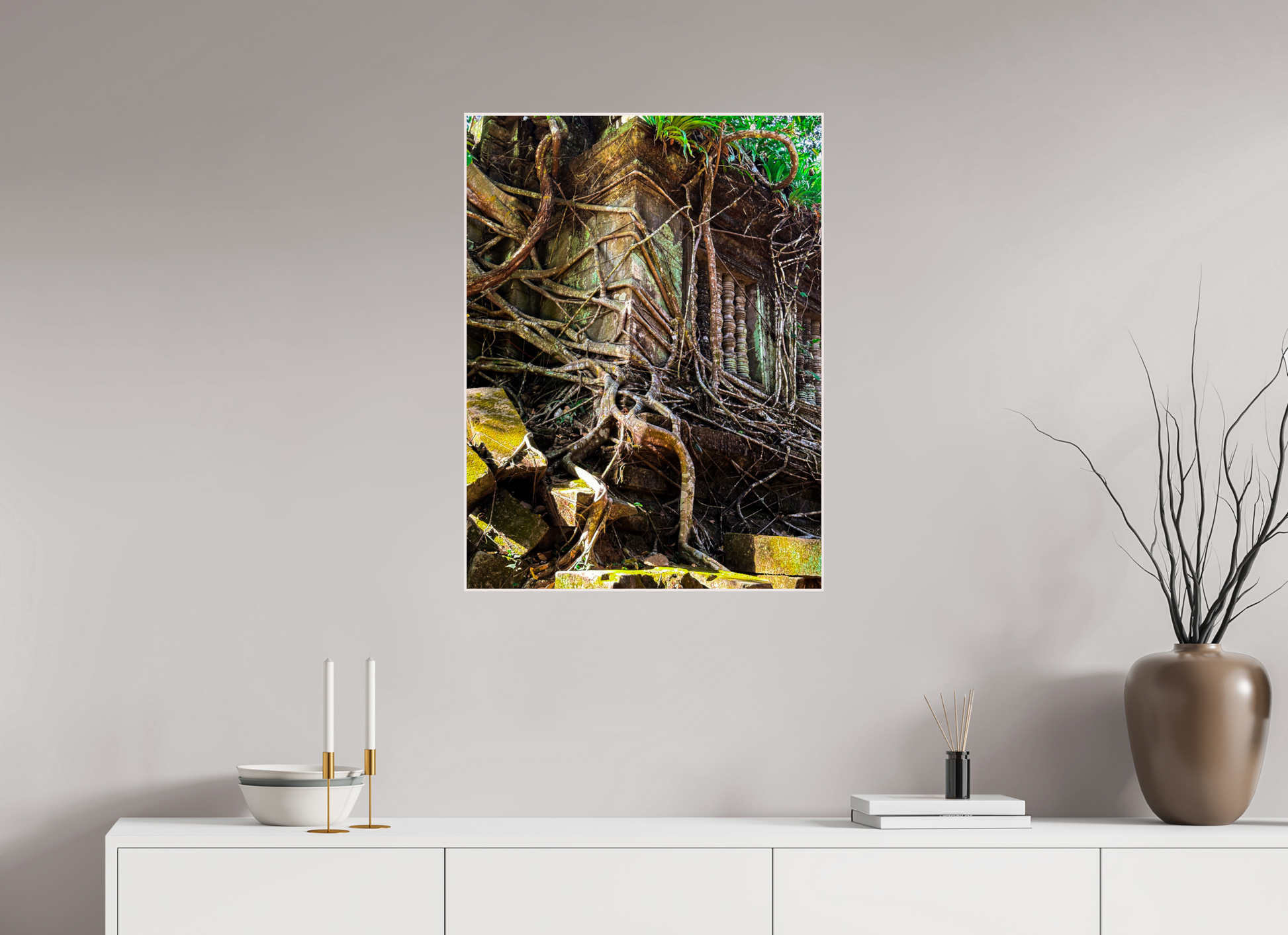 Die antieke klippe van Angkor is verweef met die wortels van massiewe bome, wat 'n toneel van die natuur se meedoënlose omhelsing skep. Die kontras tussen die gedempte grys en bruin skakerings van die verweerde klip en die heldergroen van die indringende wortels skep 'n treffende visuele tableau. Die sagte lig wat deur die oerwoudkap filter, gooi gespikkelde skaduwees, wat diepte en tekstuur aan die toneel gee. Hierdie beeld vang die blywende skoonheid van Angkor vas, waar natuur en geskiedenis saambestaan in 'n delikate dans. Die ingewikkelde besonderhede van die klipwerk en die kragtige wortels roep 'n gevoel van eerbied en ontsag op.
