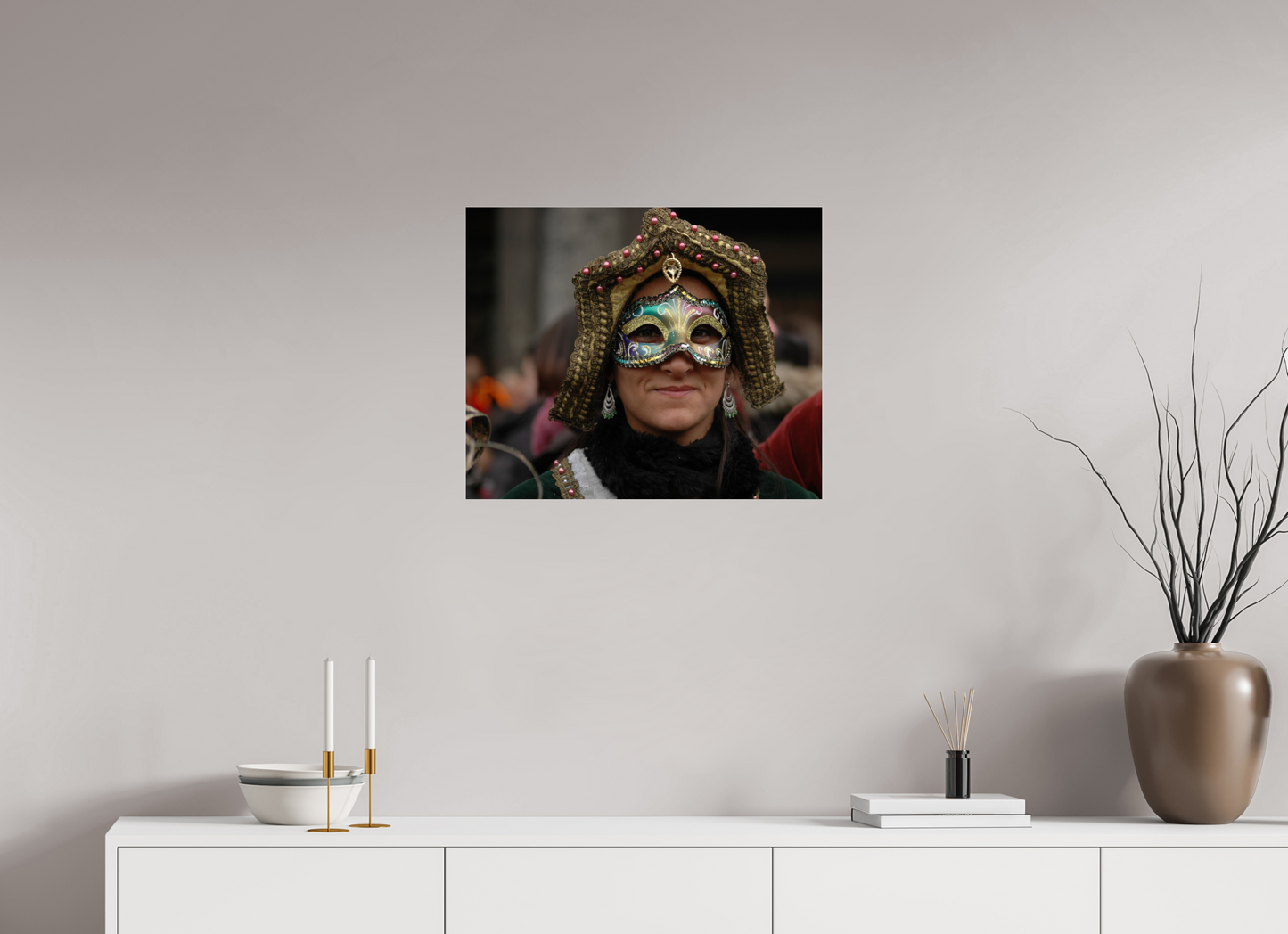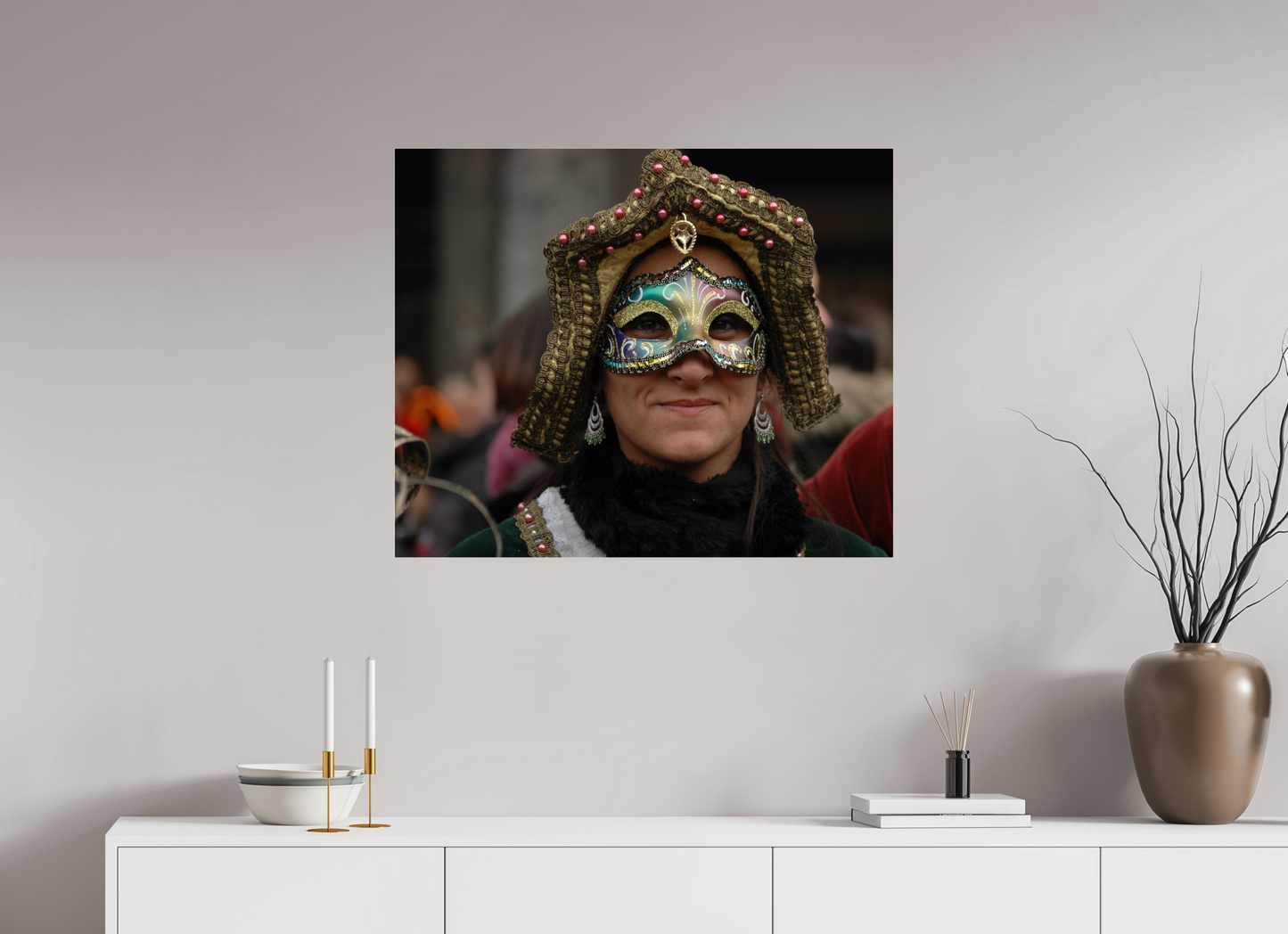 Hierdie masker, pragtig in goud en versier met juwele, beliggaam die grootsheid en ekstravagansie van die Venesiese Karnaval. Die ryk kleure en ingewikkelde besonderhede van die kostuum beklemtoon die draer se koninklike teenwoordigheid en vang die feestelike gees van die viering vas. Die masker se ontwerp weerspieël die weelde en artistieke flair van Venesiaanse tradisies, waar elke stuk 'n storie van vakmanskap en geskiedenis vertel.