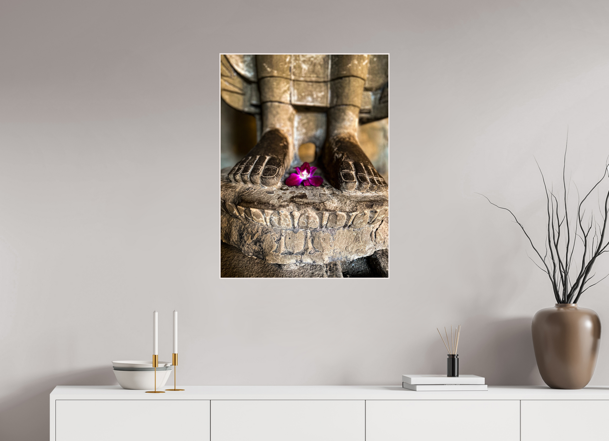 A delicate flower rests in the hands of an ancient stone statue at Angkor, symbolizing a timeless offering and the enduring spirituality that permeates the sacred grounds.