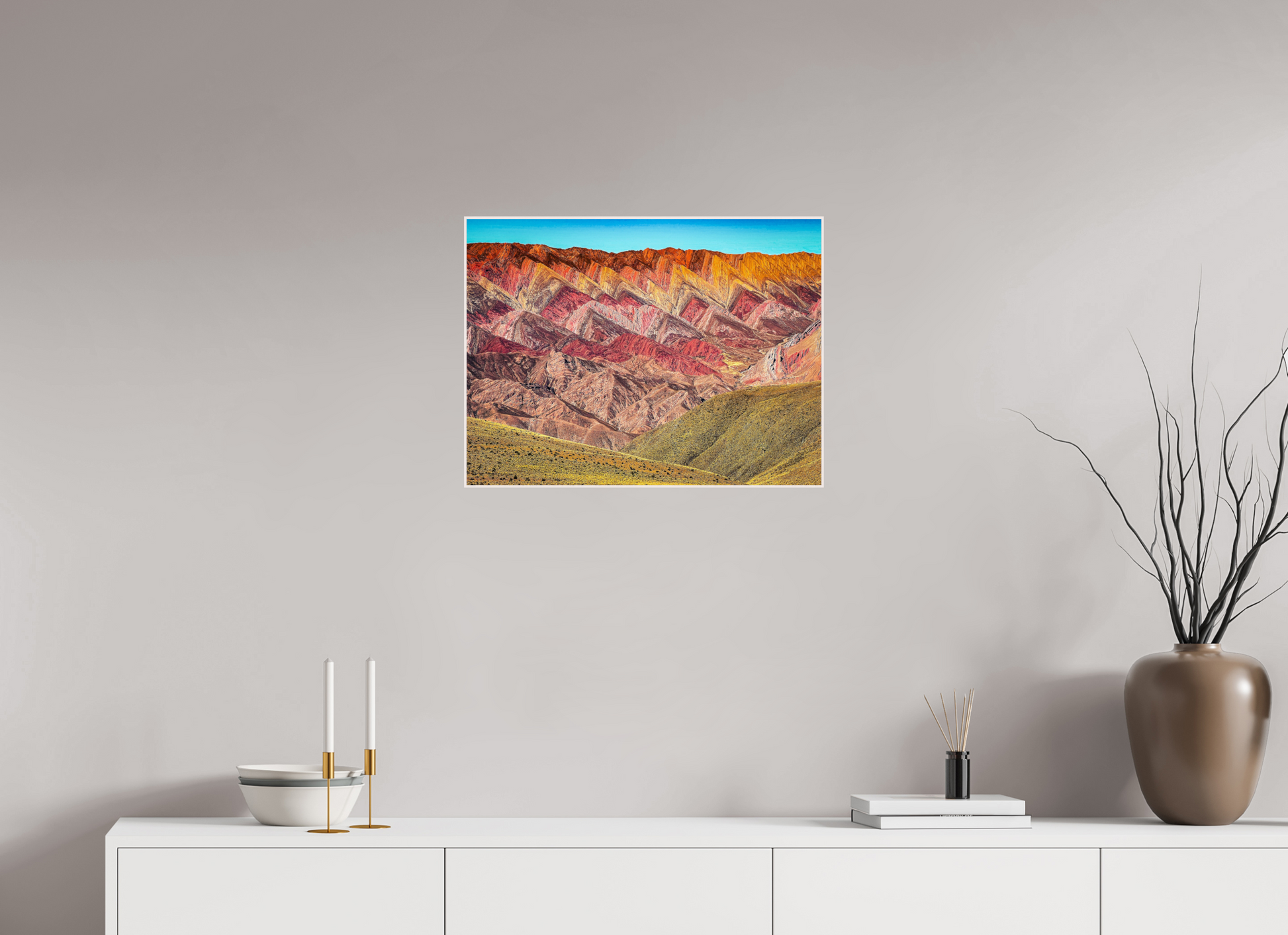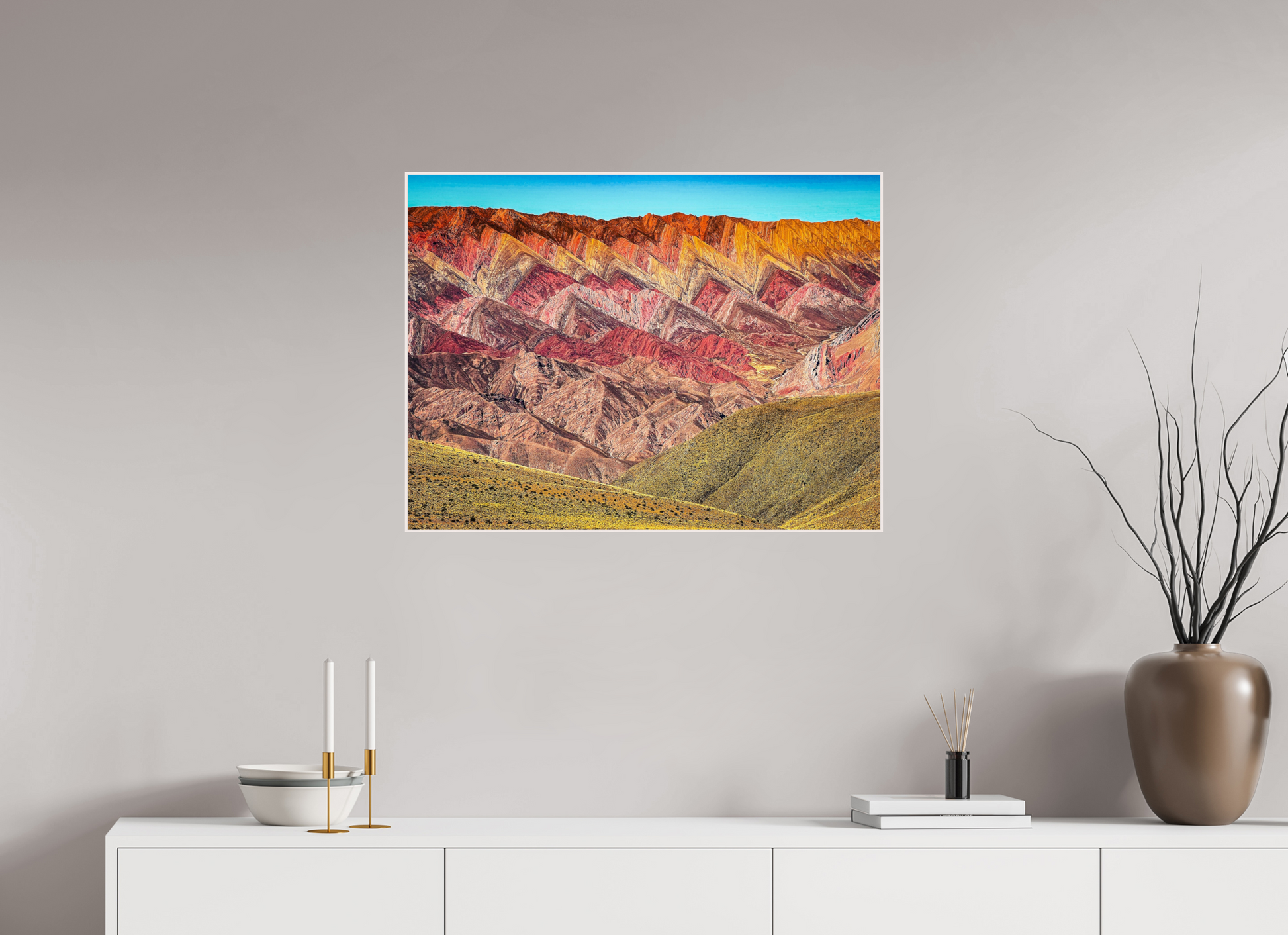 This breathtaking image showcases the vibrant and rugged beauty of the mountains in Argentina. The layers of colorful rock formations create a dramatic and dynamic landscape that stretches out under the clear blue sky. The interplay of light and shadow accentuates the textures and patterns of the mountains, highlighting their natural beauty and grandeur. The image captures the essence of Argentina's stunning landscapes, evoking a sense of adventure and awe.