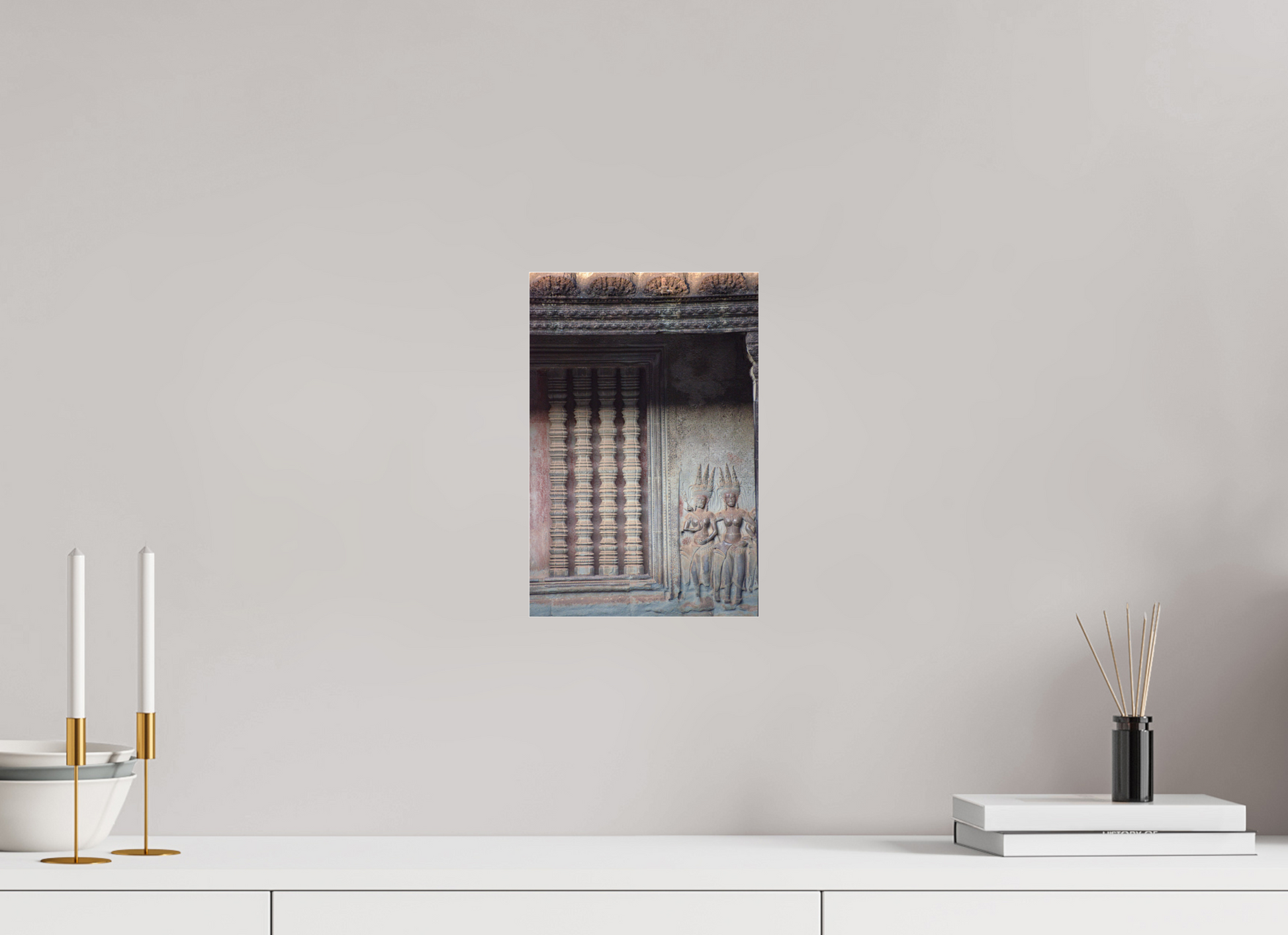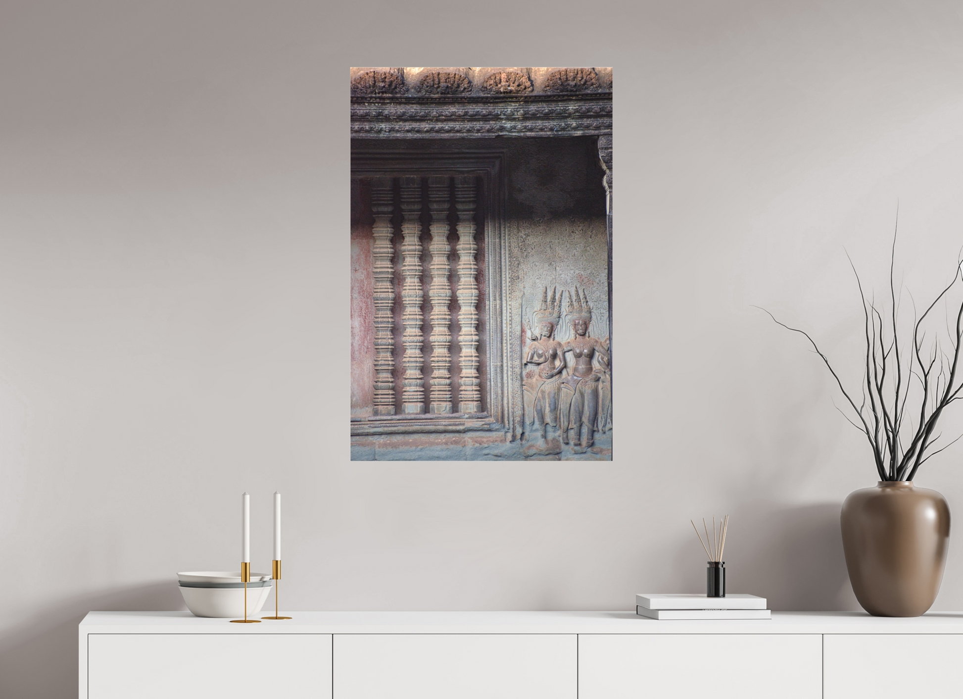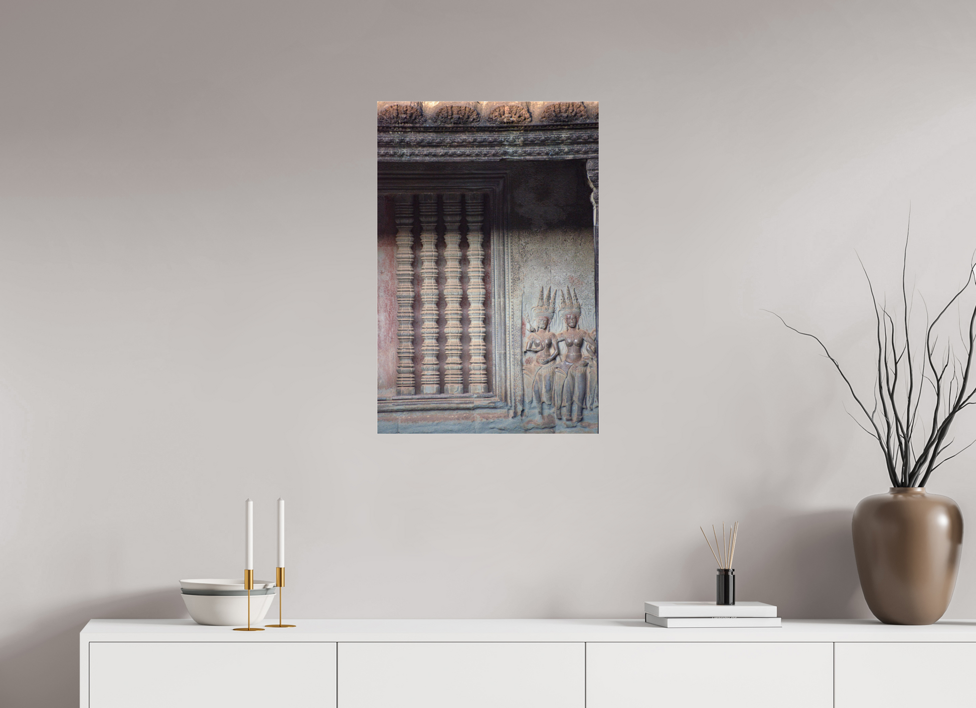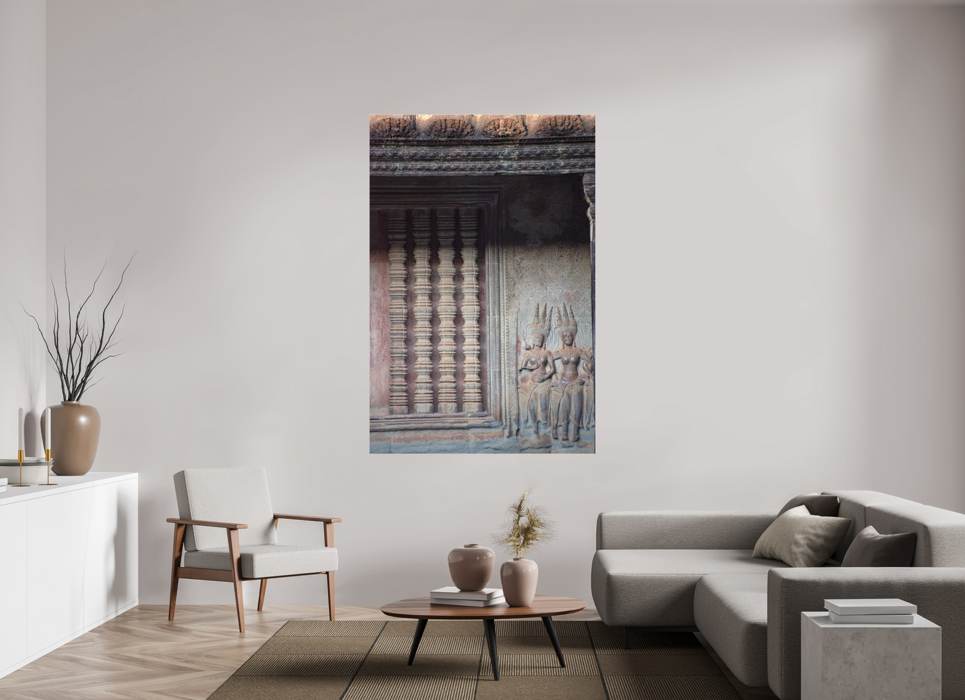 In the soft light filtering through the dense jungle canopy, the intricate carvings of Angkor Wat come to life. The stone figures, adorned with detailed headdresses and flowing garments, stand as silent guardians of a bygone era. The muted greys and browns of the weathered stone contrast beautifully with the vibrant greens of the encroaching foliage, creating a scene of timeless beauty. The play of light and shadow on the carved surfaces adds depth and texture, highlighting the craftsmanship of a civilization lost to time. This image captures the essence of Angkor's mystical allure, where nature and history intertwine.