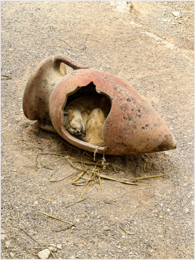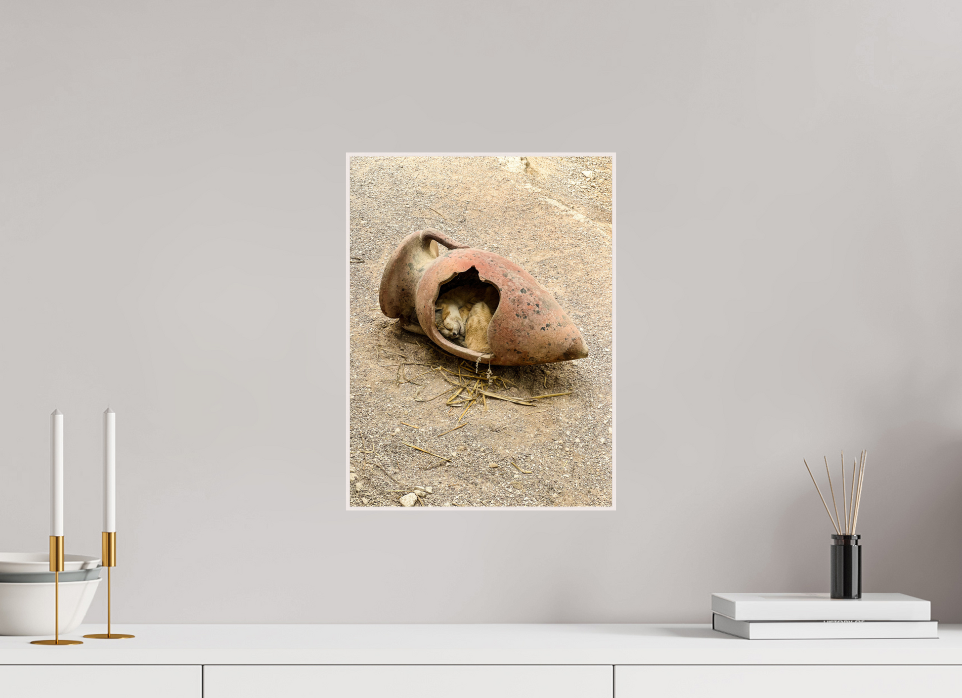 This intriguing image captures a sand cat taking shelter within the confines of a broken clay pot. The cat's camouflage blends seamlessly with the arid surroundings, highlighting its adaptation to the desert environment. The texture of the clay pot and the surrounding dry terrain evoke a sense of resilience and survival in harsh conditions. The play of light and shadow adds depth to the image, emphasizing the natural beauty of life.