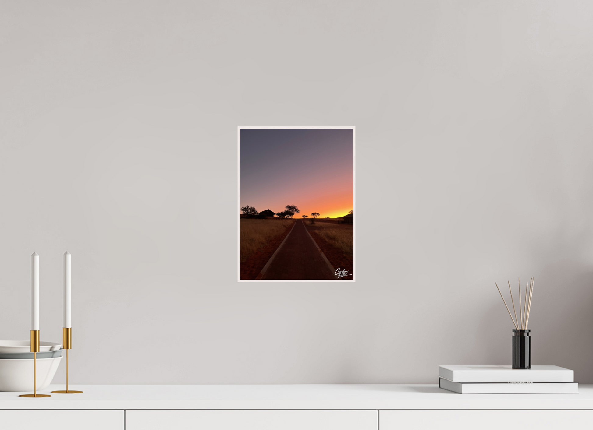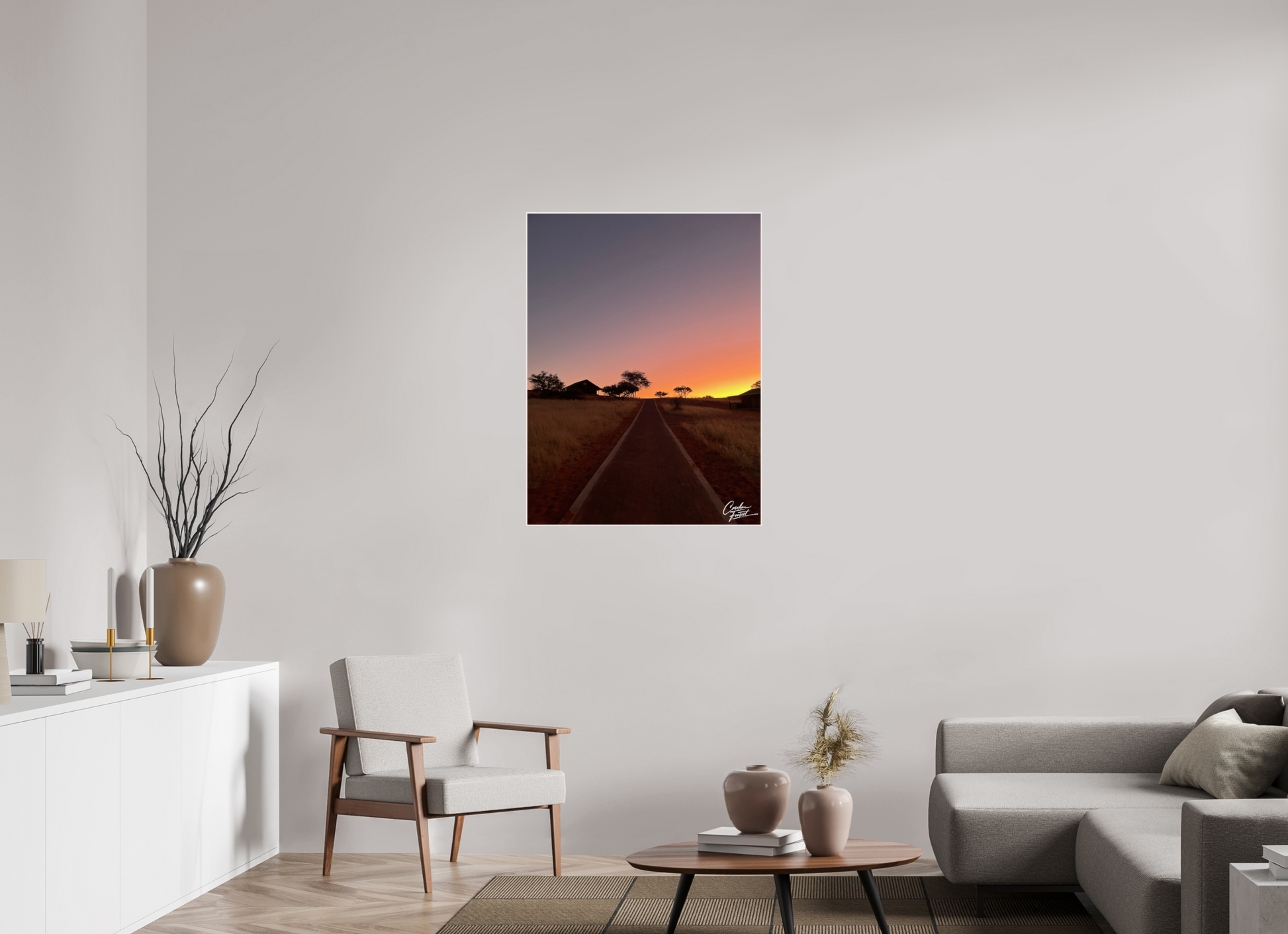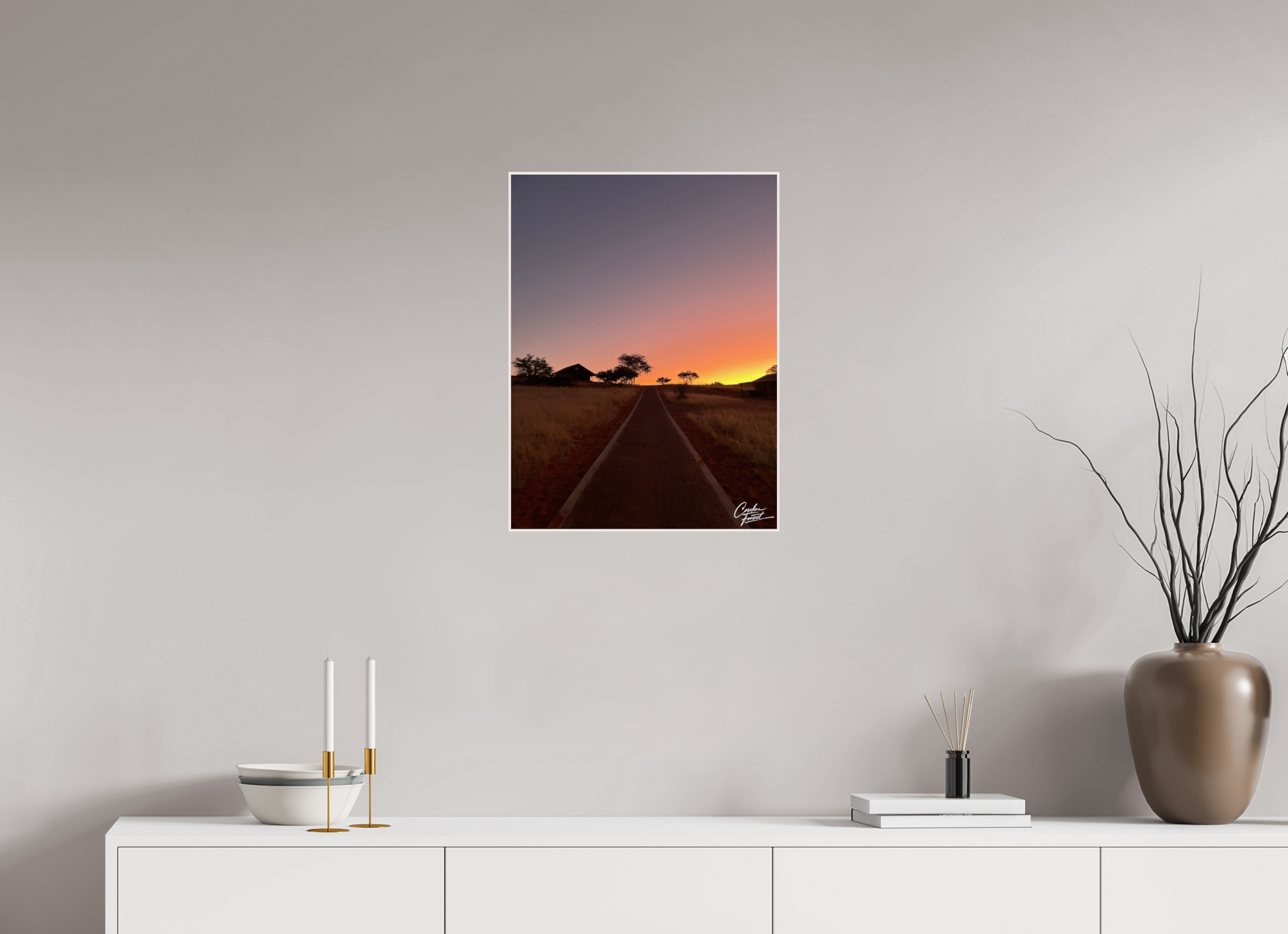 A road stretches into the horizon, flanked by golden grasses and bathed in the warm hues of twilight.