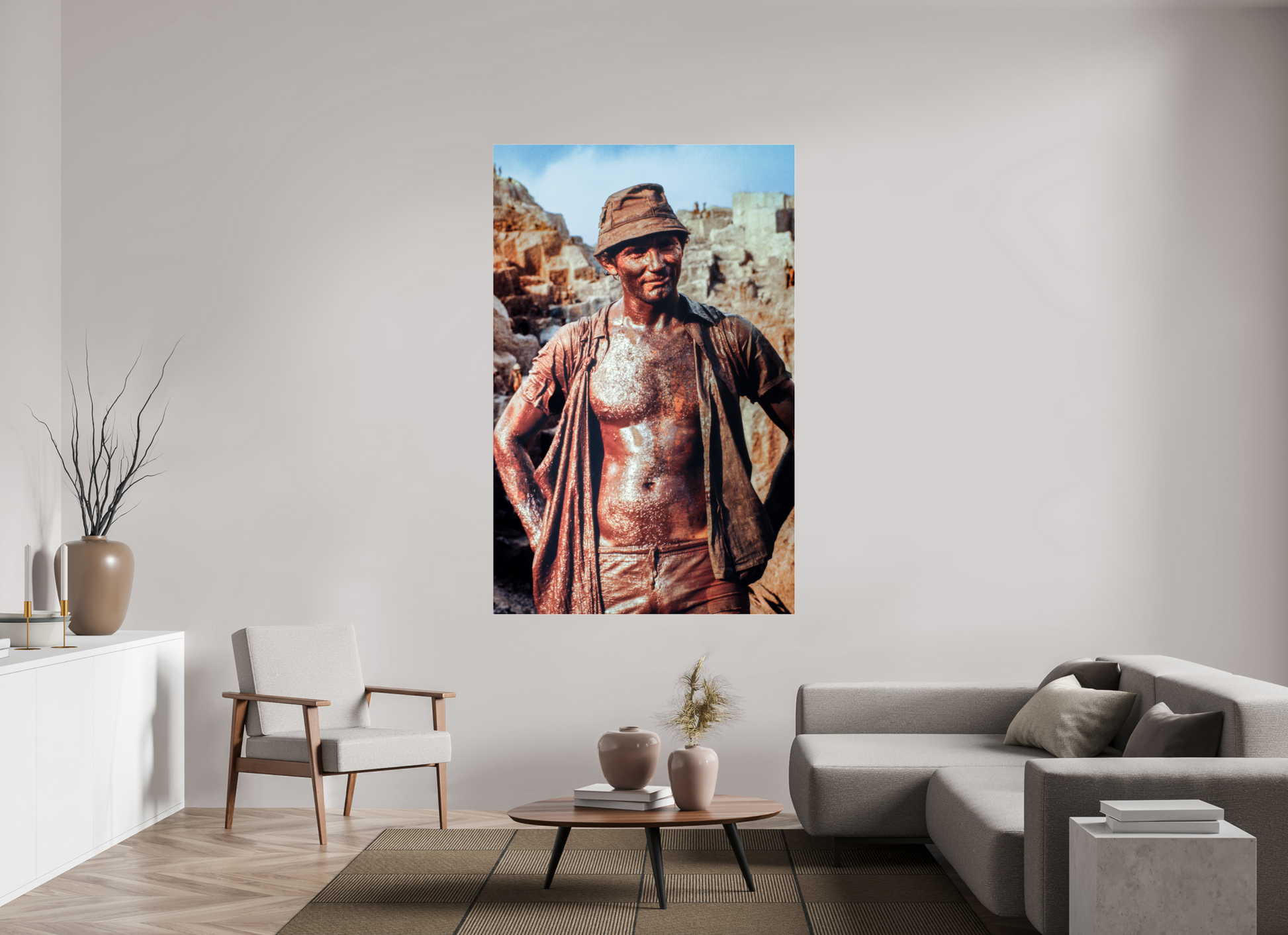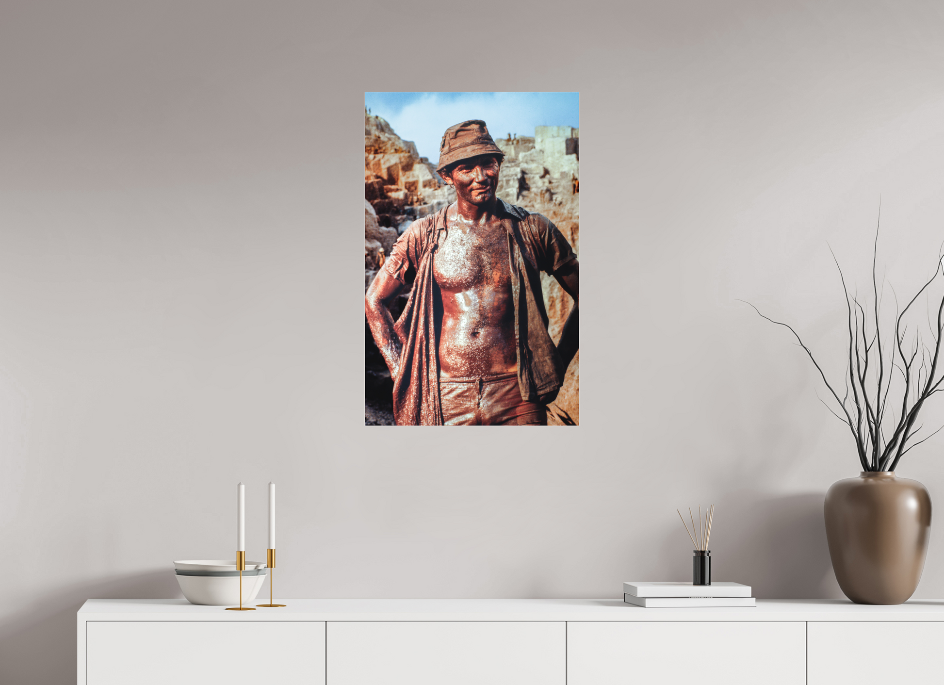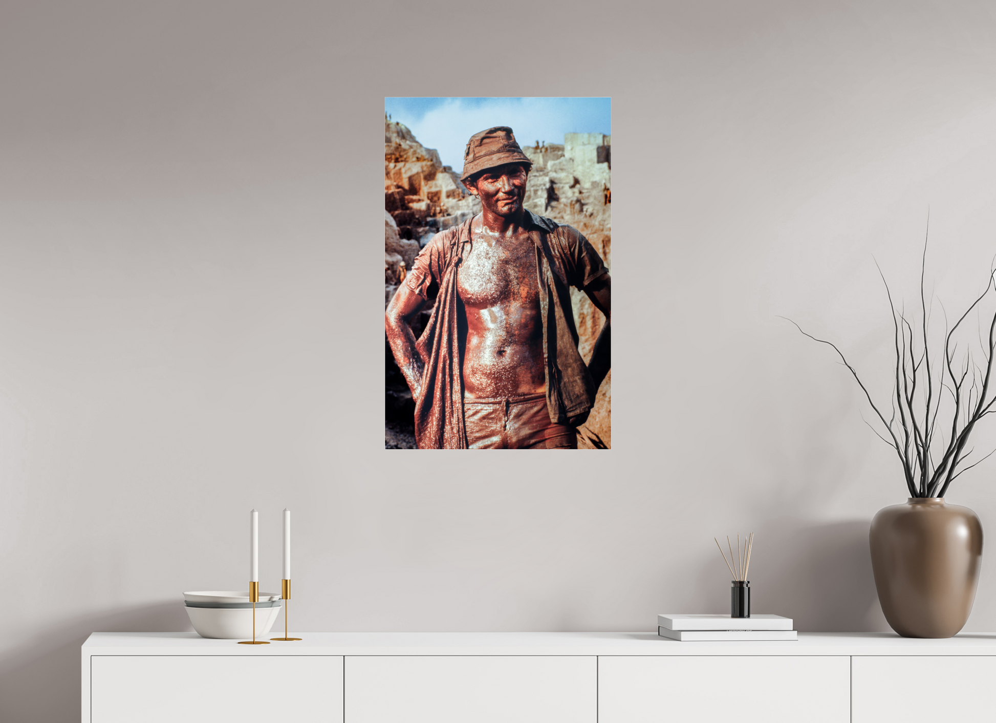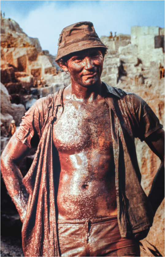 A miner stands proudly amidst the rugged terrain of Sierra Pelada, Brazil, his body coated in the golden dust he seeks, a testament to the relentless pursuit of dreams in the face of adversity.