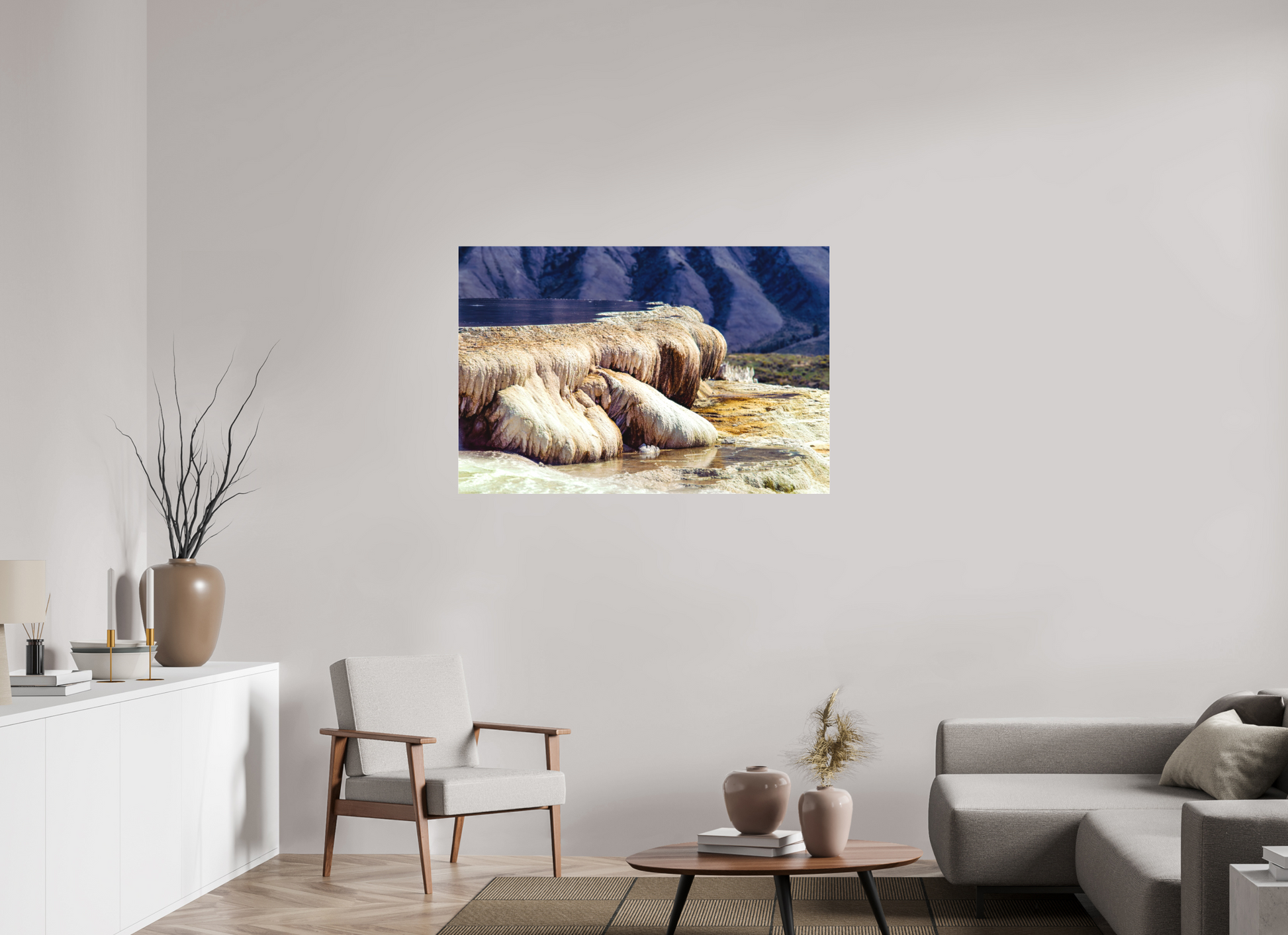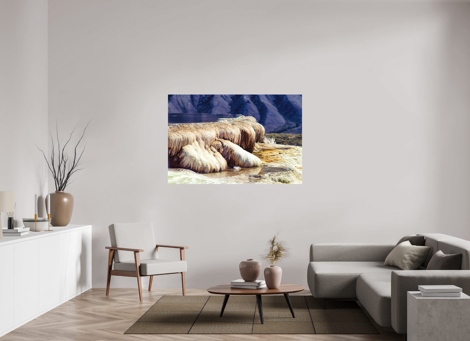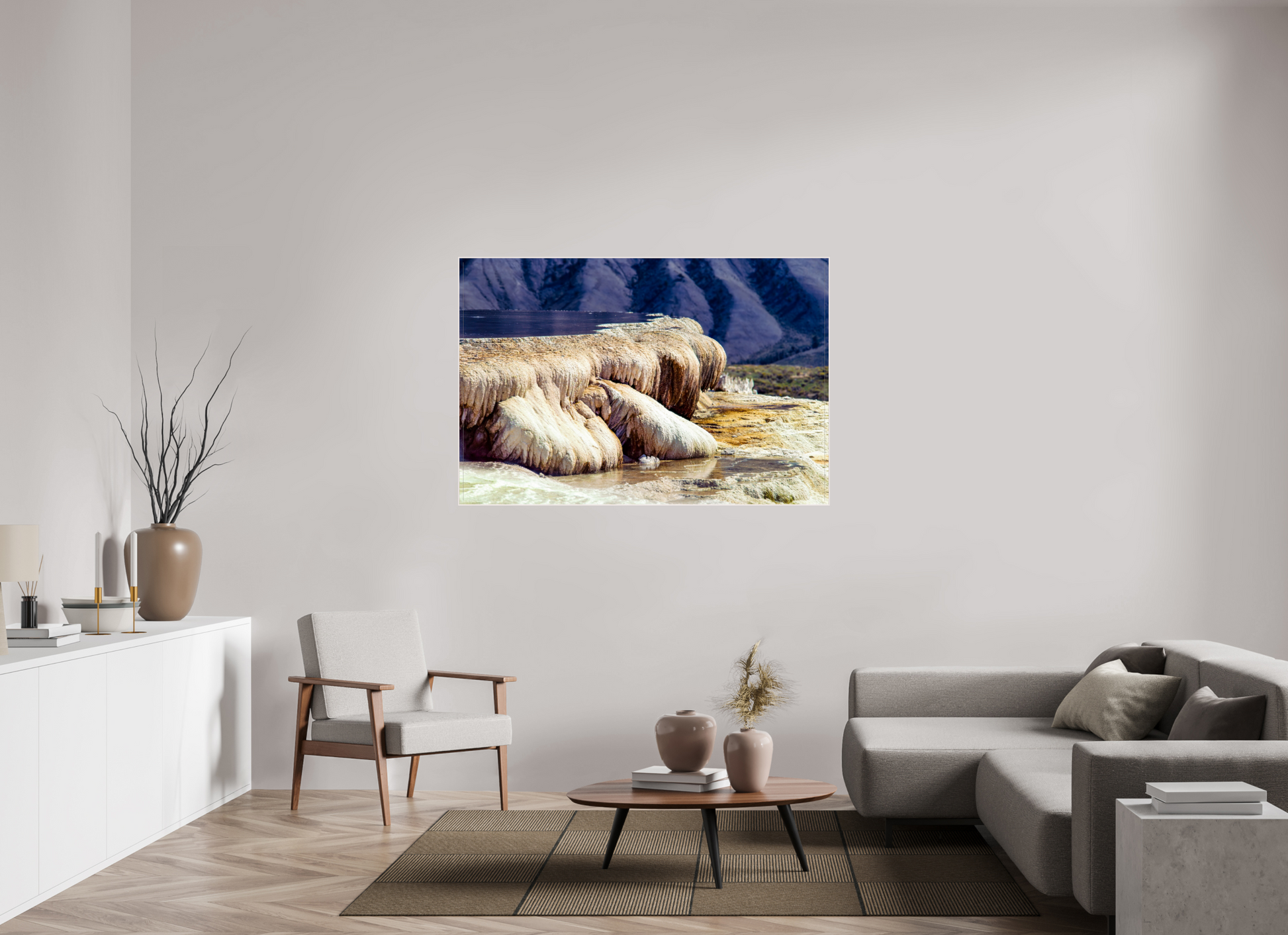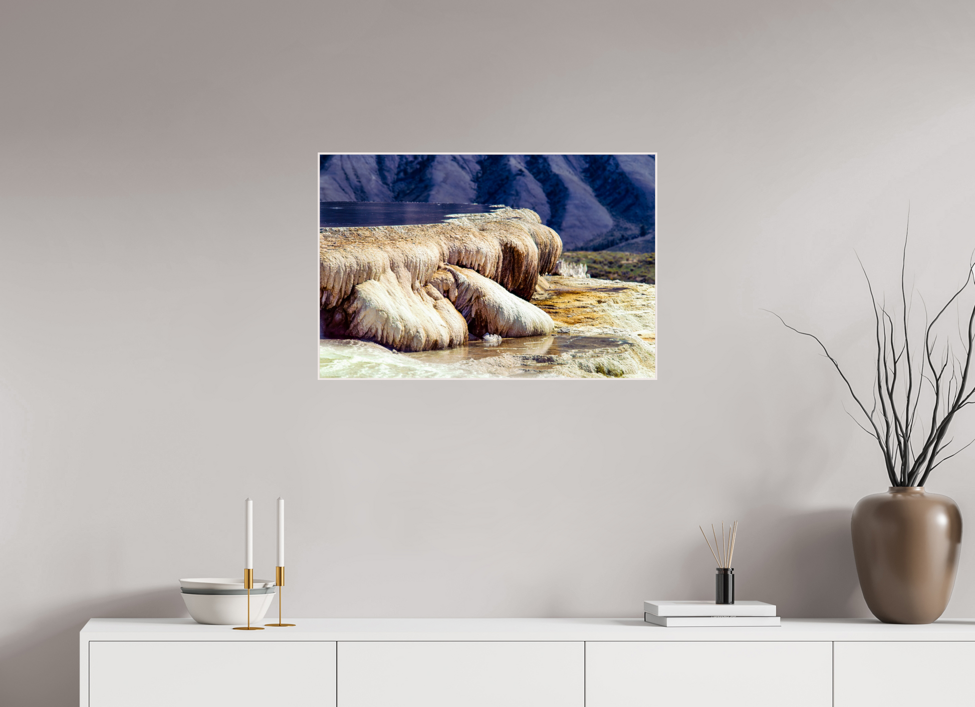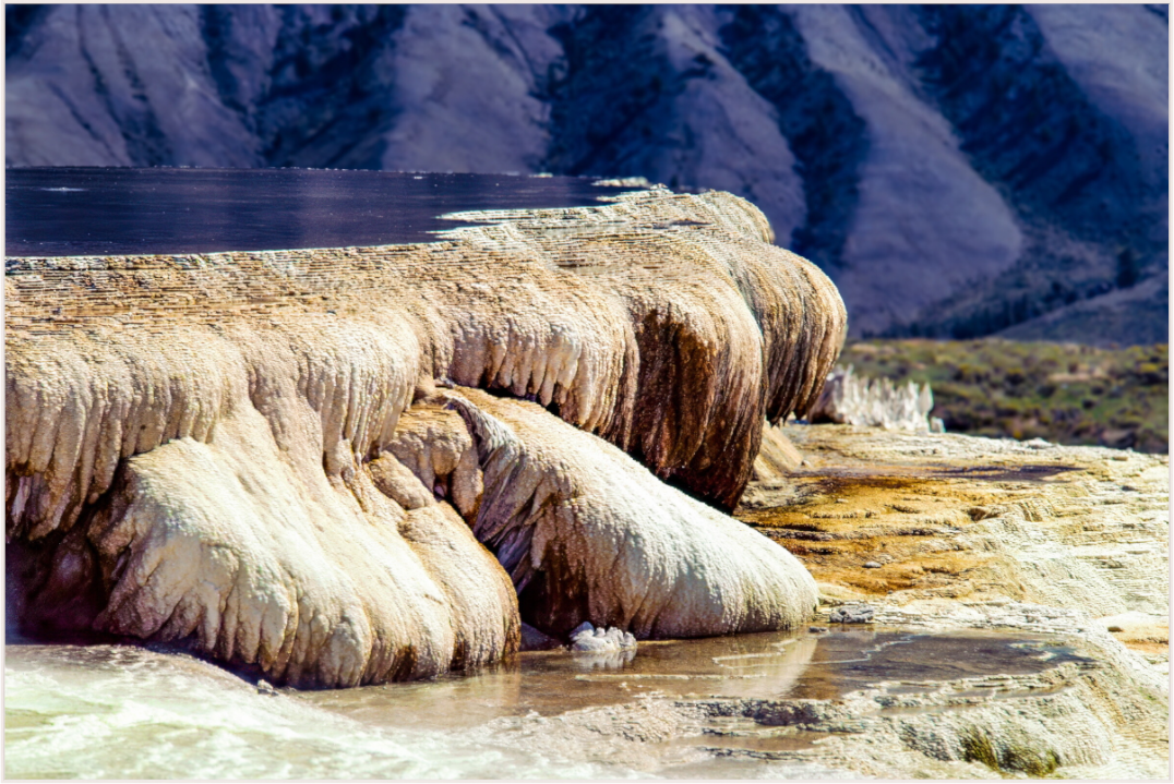 Natural terraces sculpted by time and water create a mesmerizing landscape, showcasing the earth's artistic prowess against a backdrop of rugged mountains.