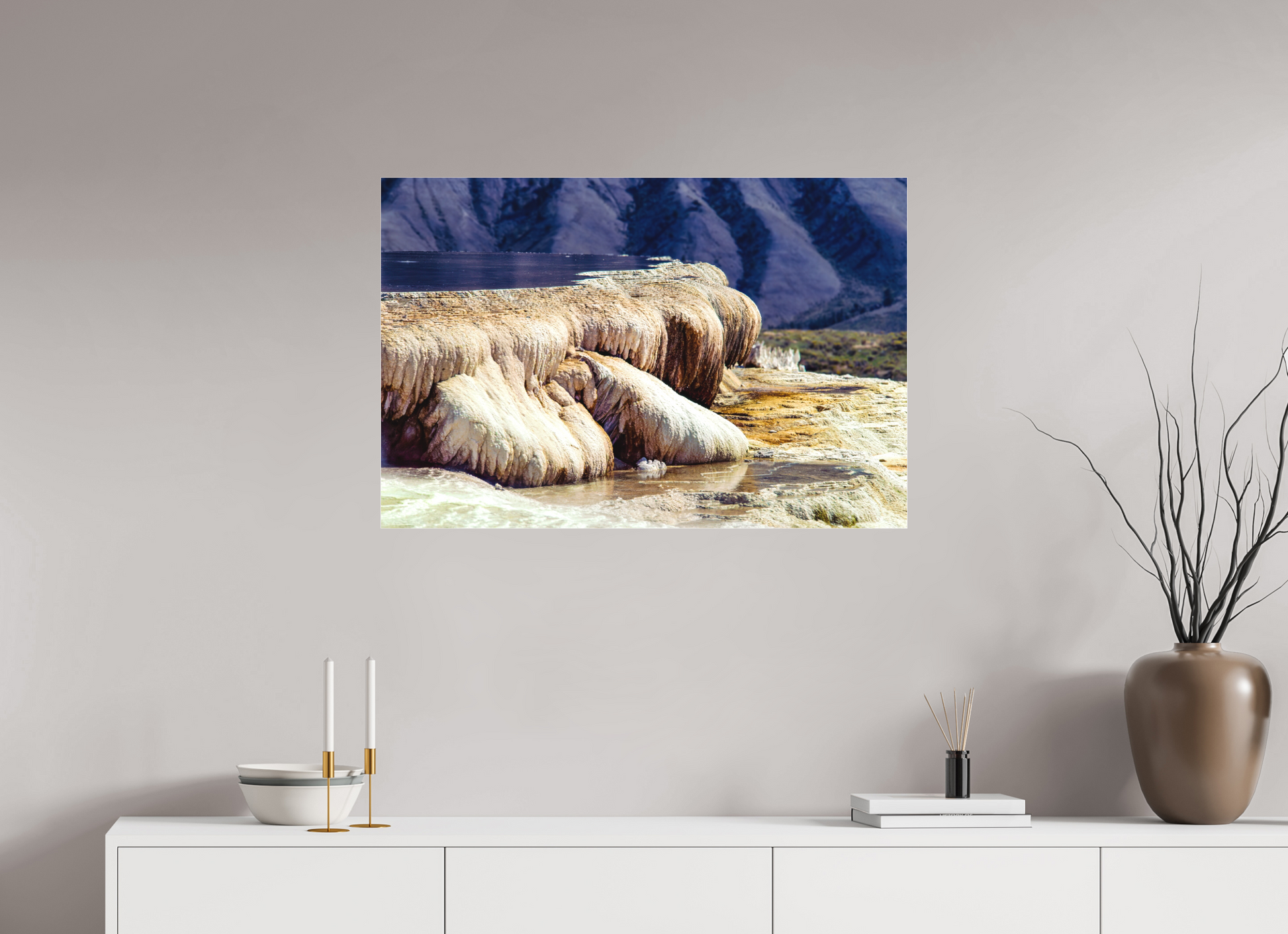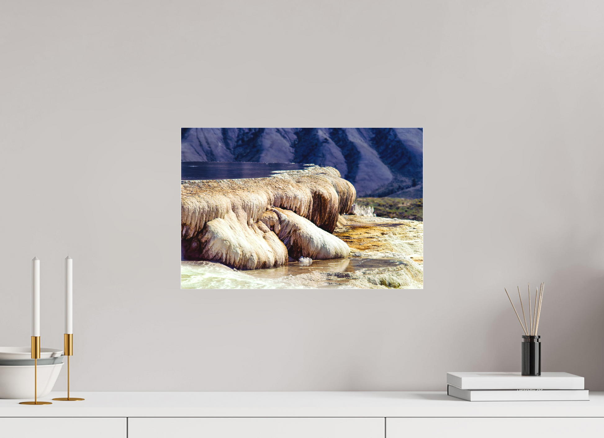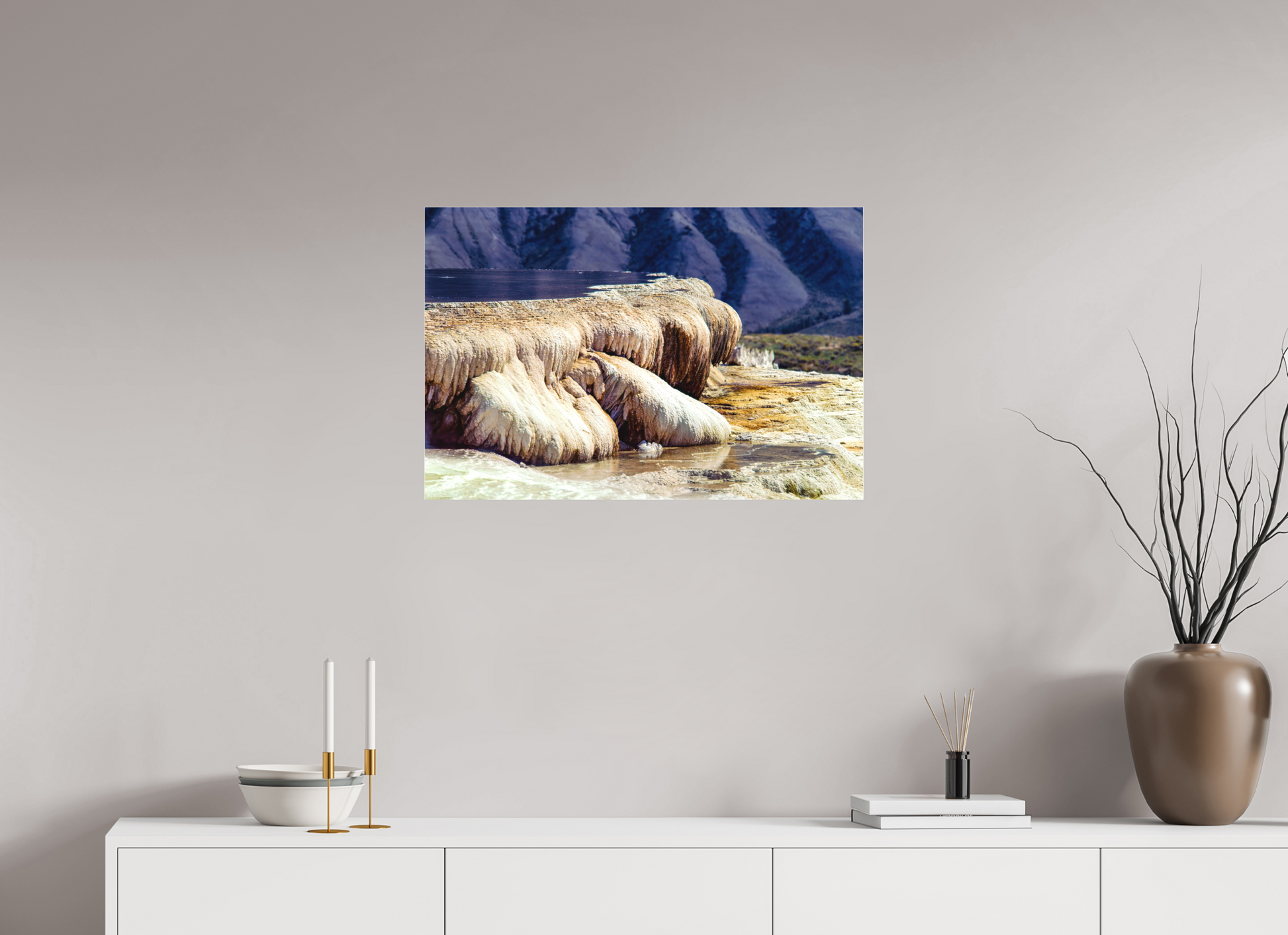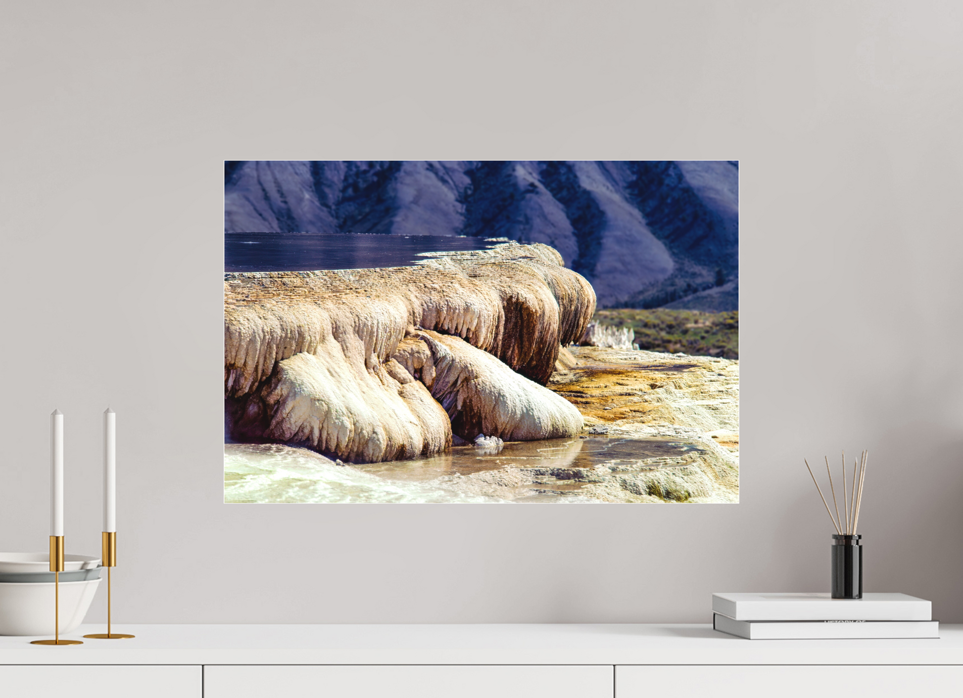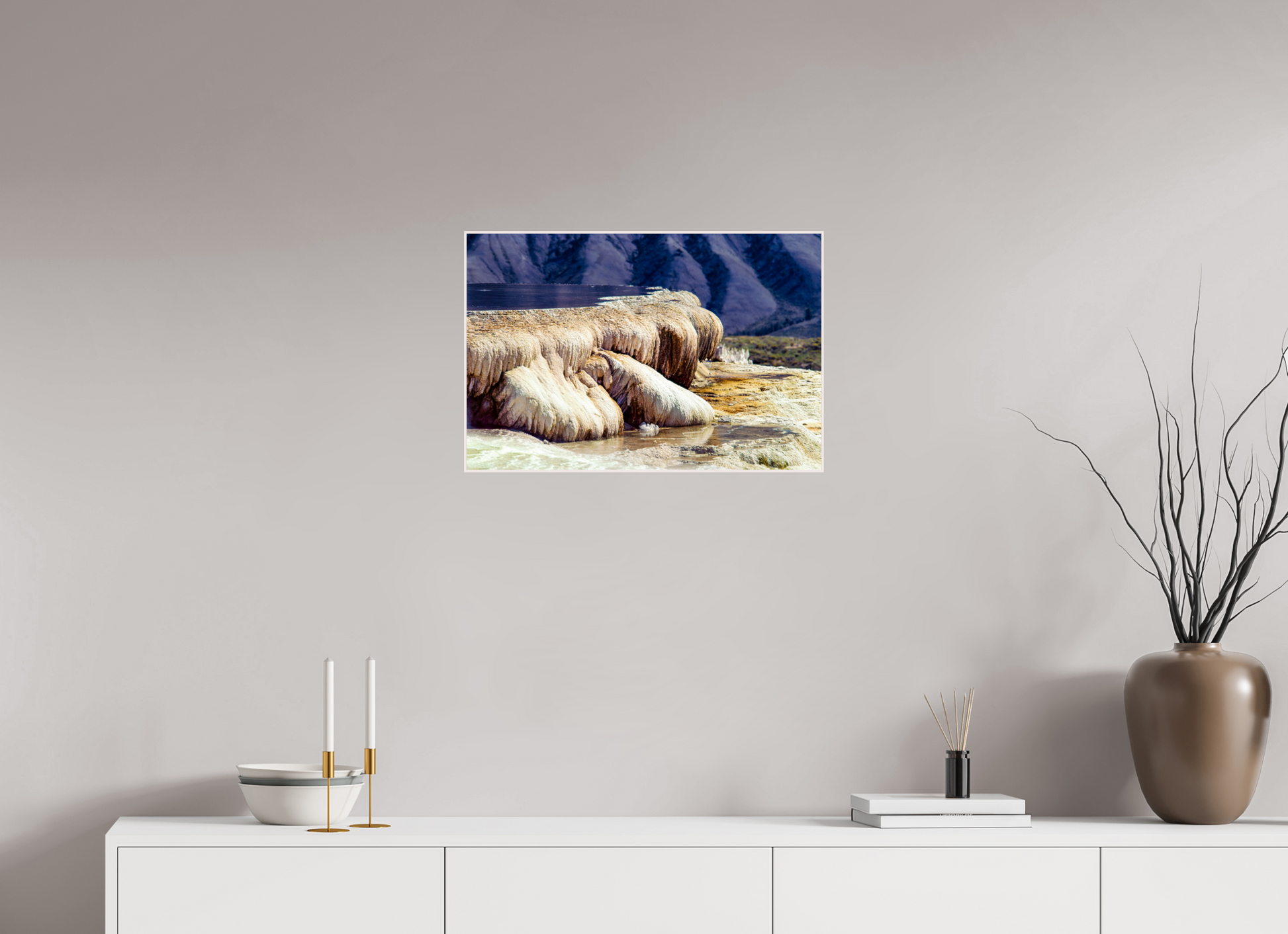 Natural terraces sculpted by time and water create a mesmerizing landscape, showcasing the earth's artistic prowess against a backdrop of rugged mountains.