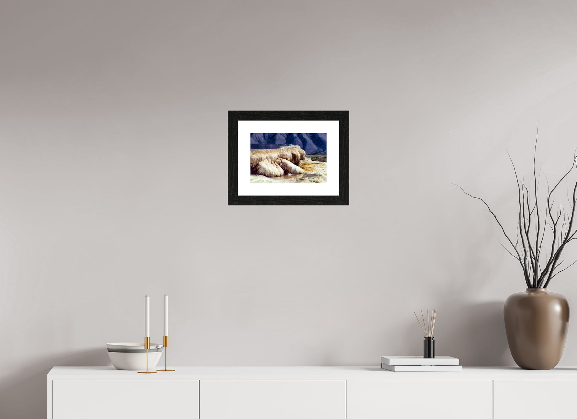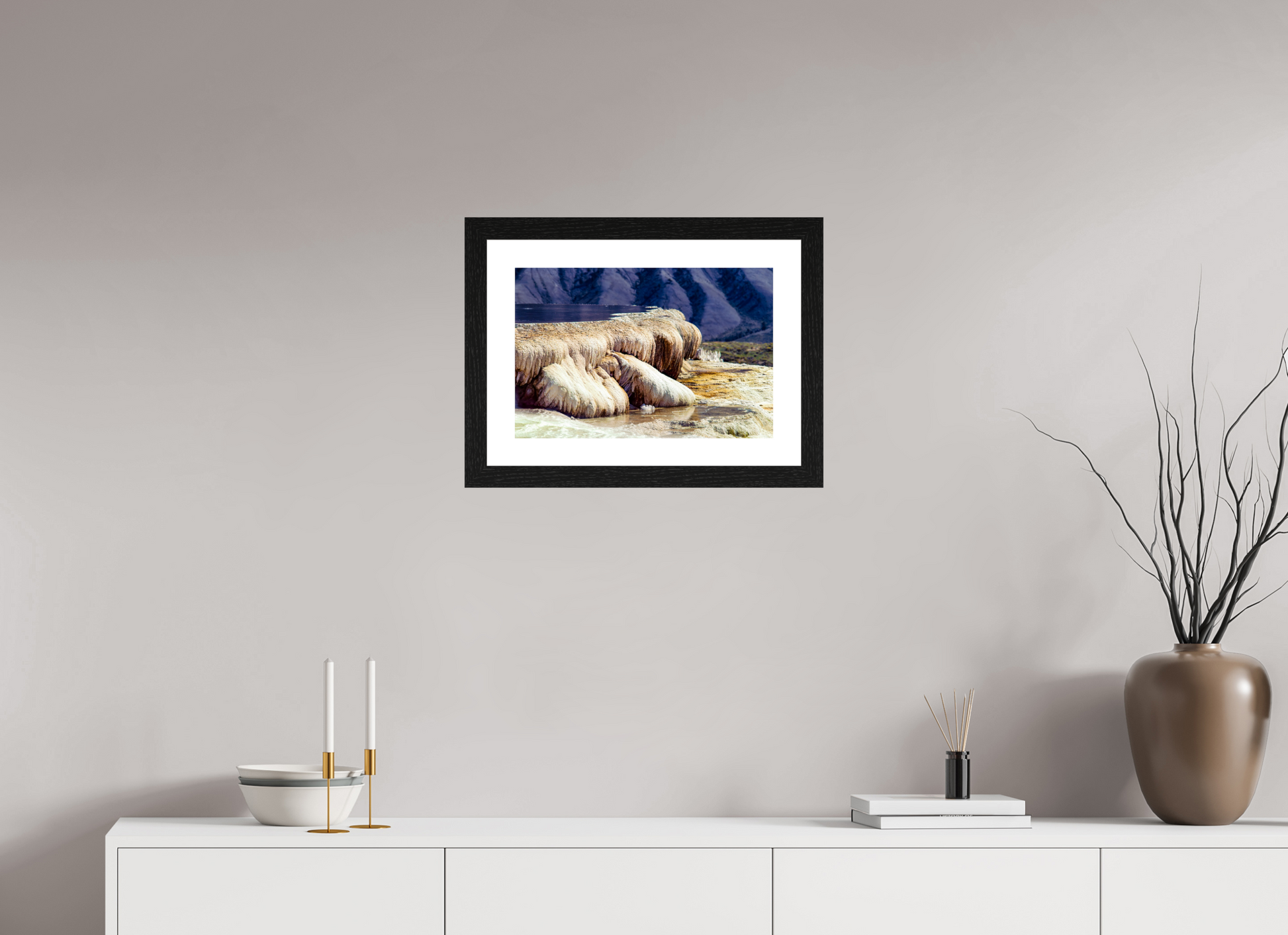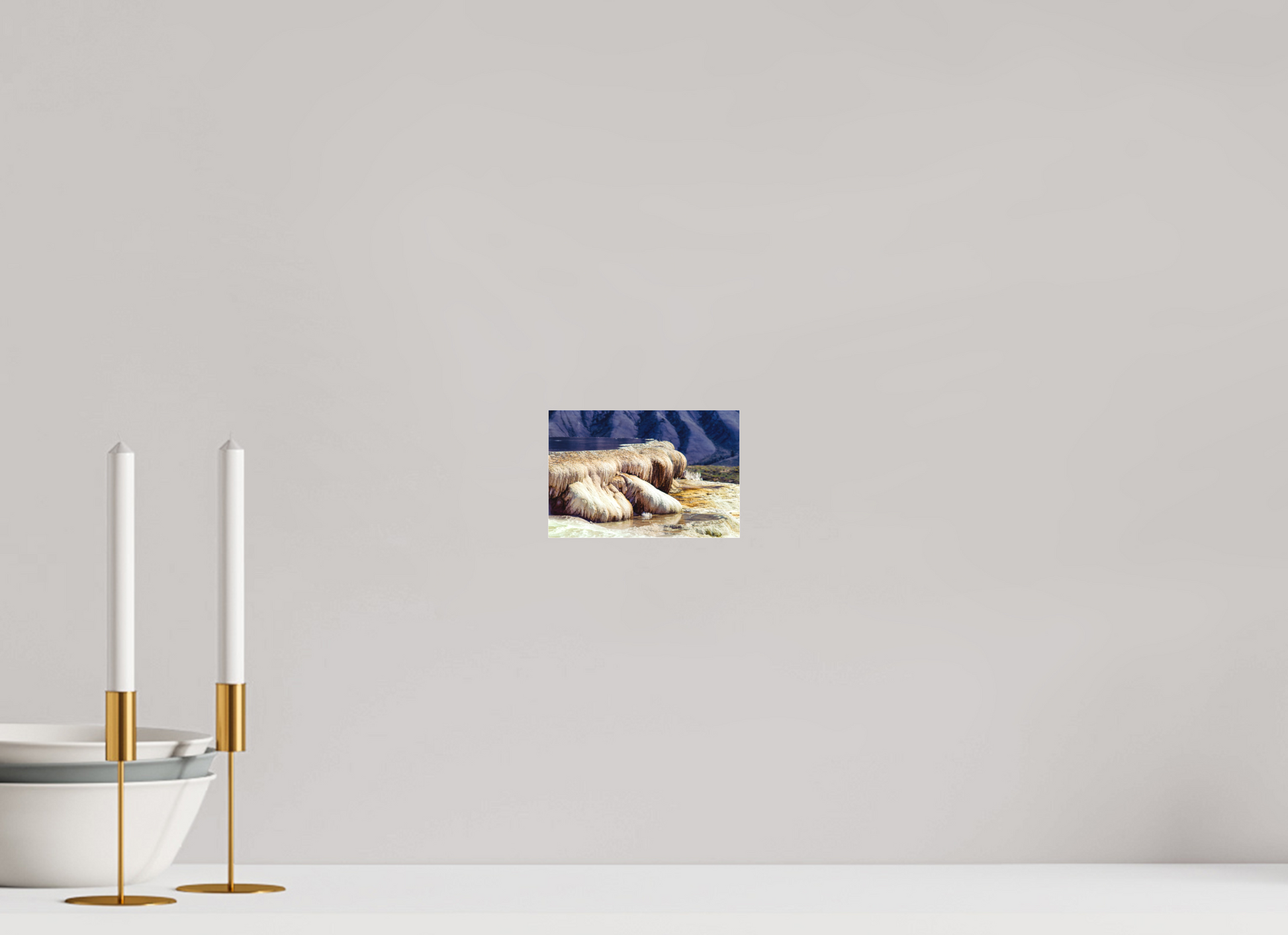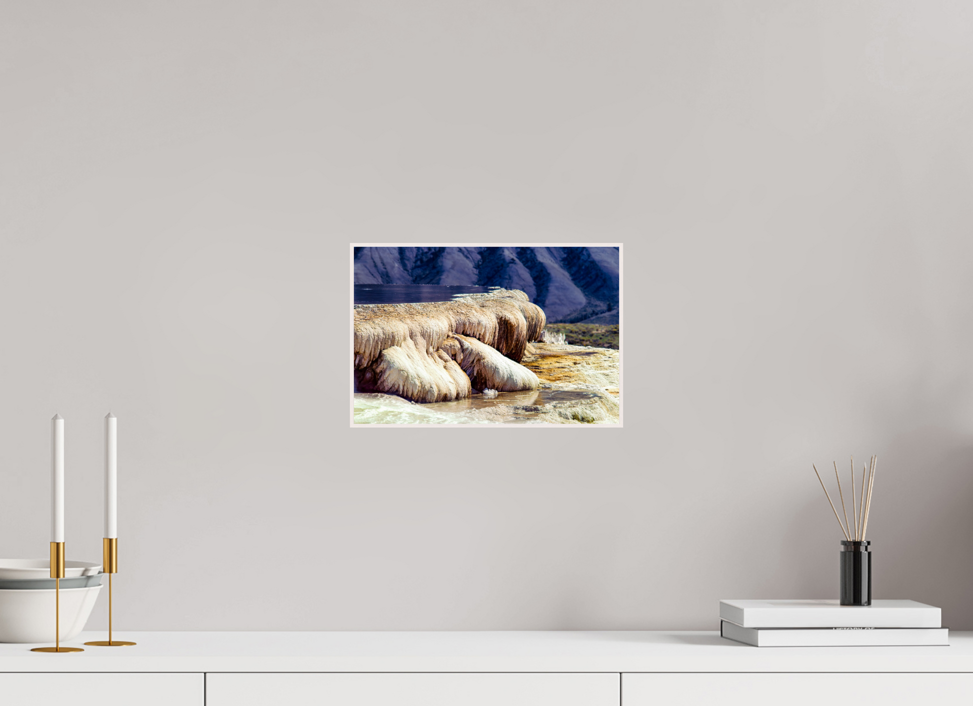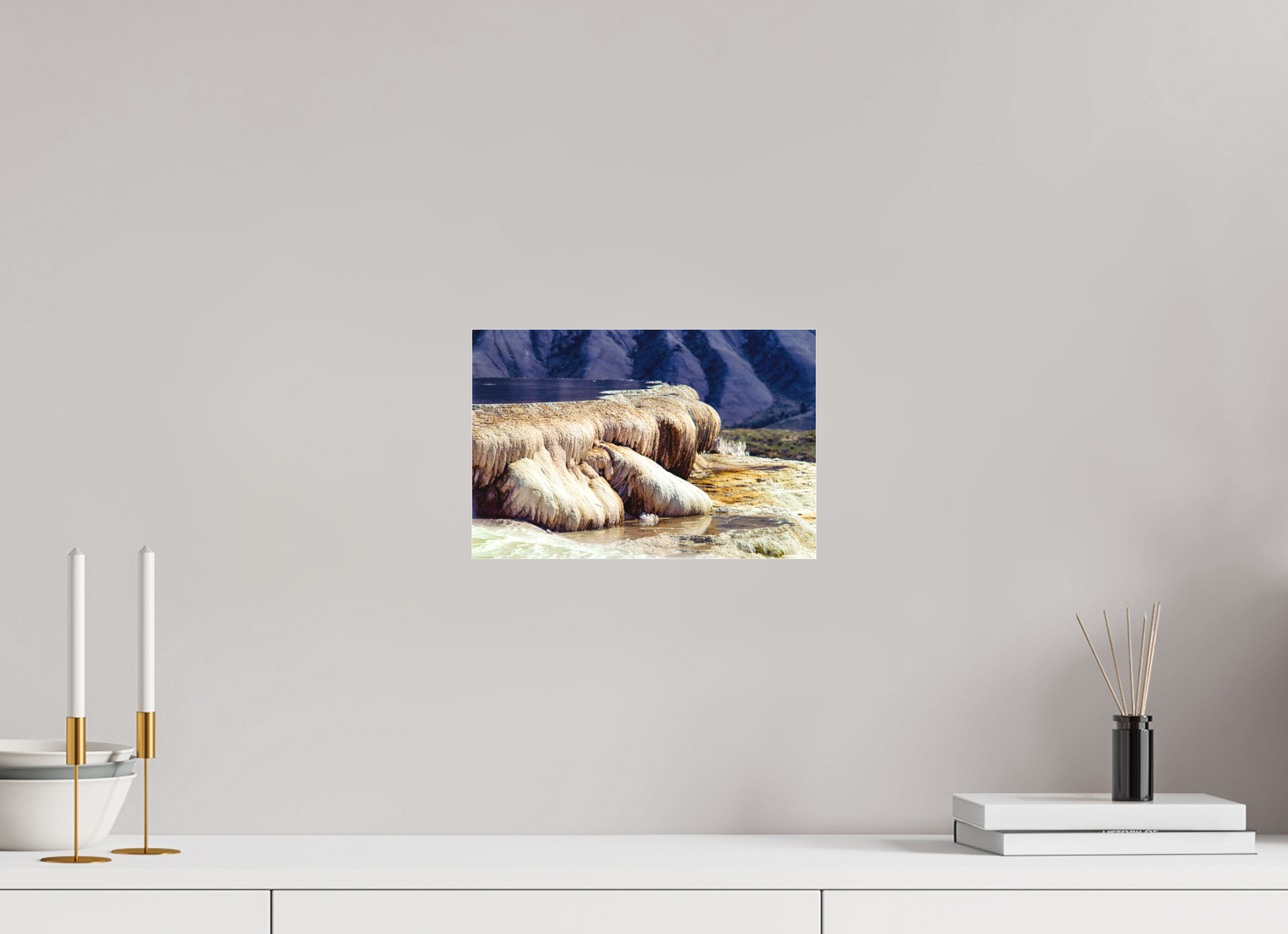 Natural terraces sculpted by time and water create a mesmerizing landscape, showcasing the earth's artistic prowess against a backdrop of rugged mountains.