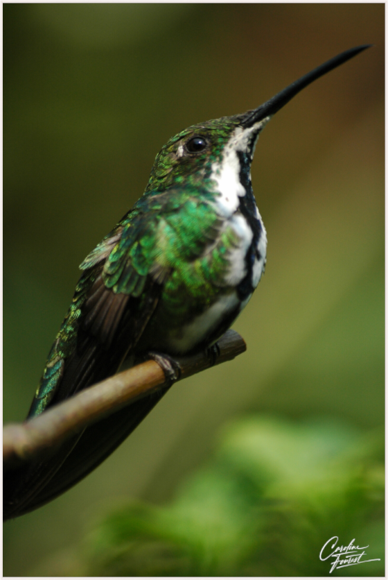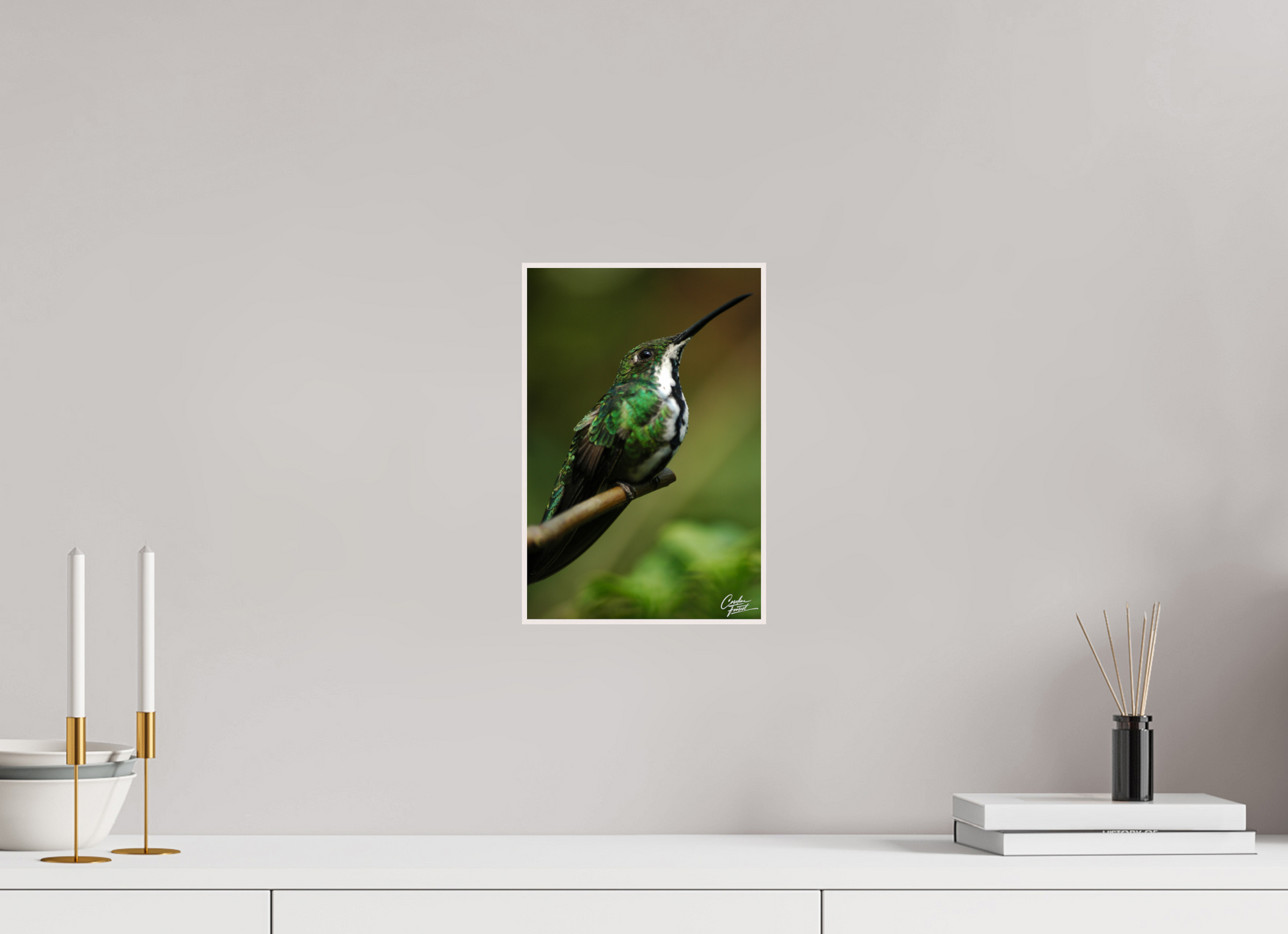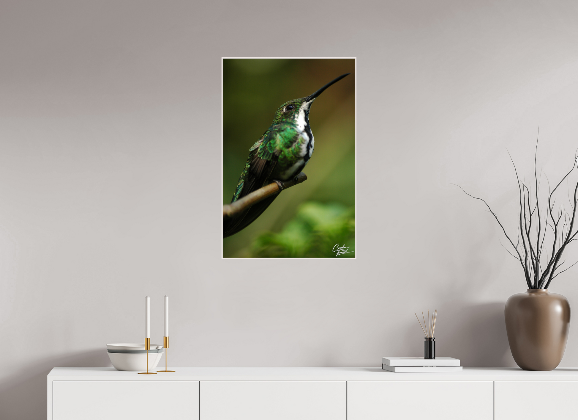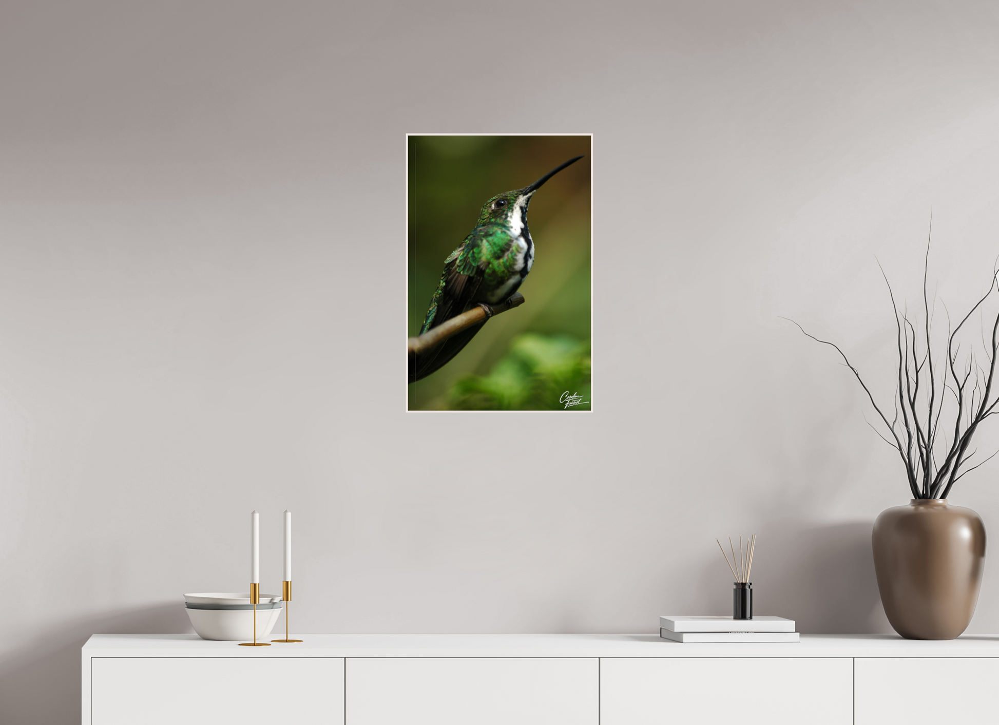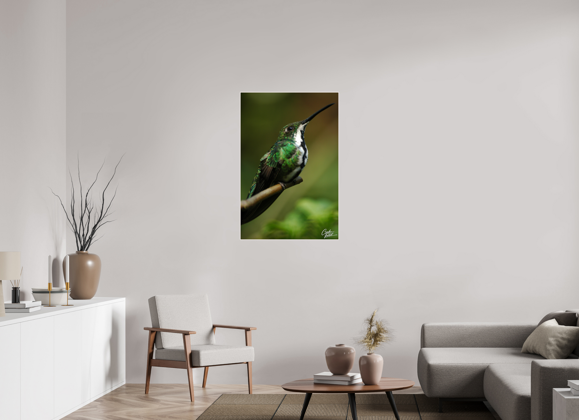 Perched delicately on a slender branch, this hummingbird showcases a dazzling array of iridescent greens and blues. The intricate details of its feathers catch the light, highlighting the bird's natural elegance and the serene beauty of its surroundings. The soft, blurred background enhances the focus on the bird, creating a sense of depth and tranquility.