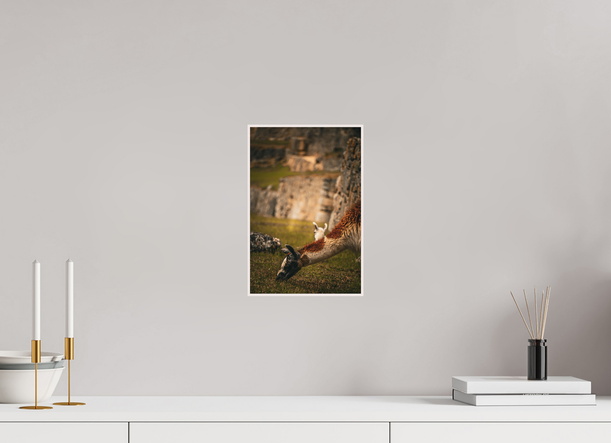 Amidst the ancient stones and lush greenery of Machu Picchu, a lama rests peacefully, embodying the serene spirit of the Andes. Its soft, woolly coat, a blend of earthy browns and creamy whites, contrasts beautifully with the vibrant greens of the terraced landscape. The golden light of the afternoon sun casts gentle shadows, highlighting the textures of the lama's fur and the intricate stonework of the ruins. This tranquil scene captures the harmony between nature and history, with the lama as a gentle guardian of this sacred place. The colors of the landscape, from the deep greens to the warm browns, create a picturesque and timeless setting.
