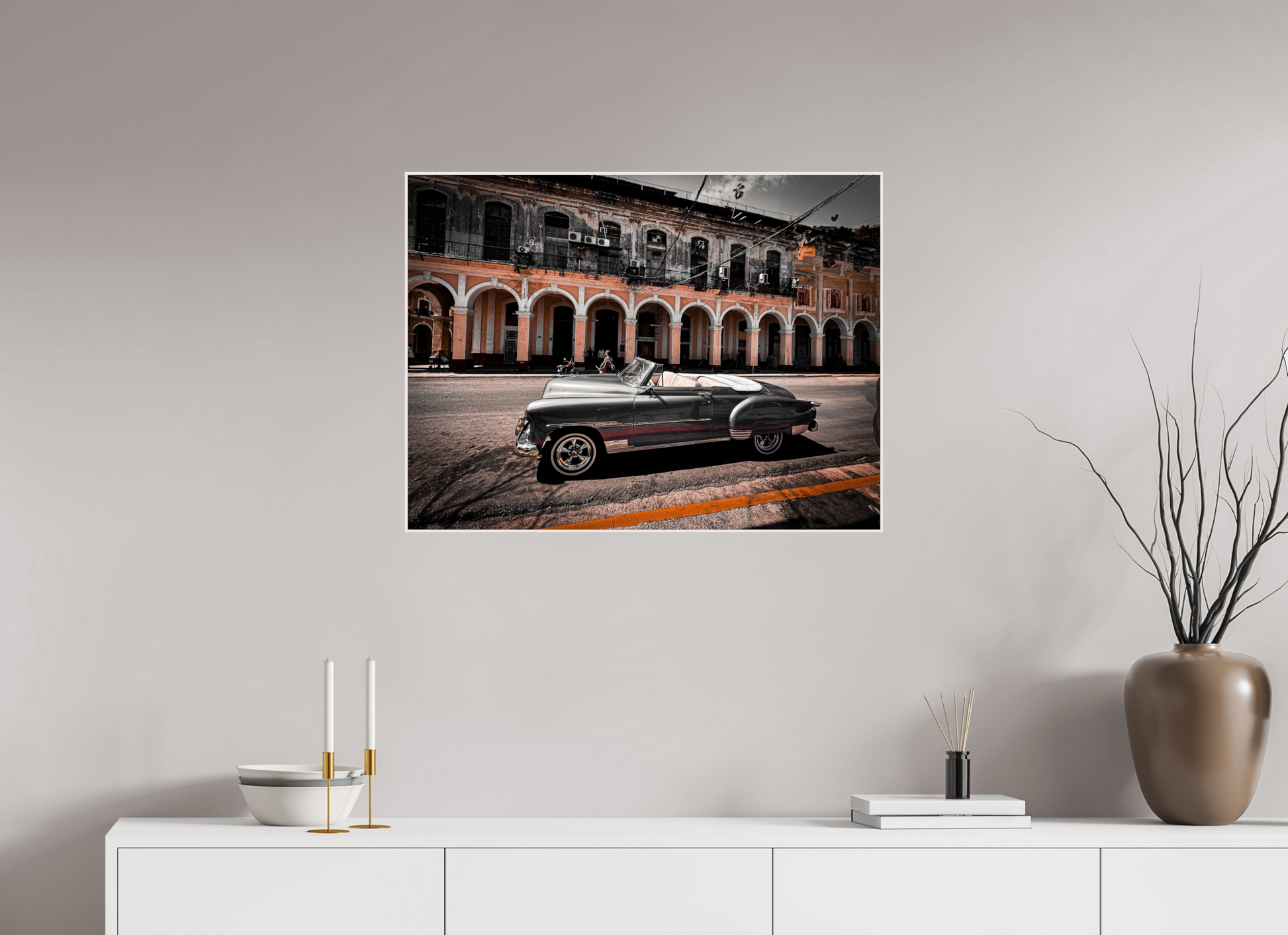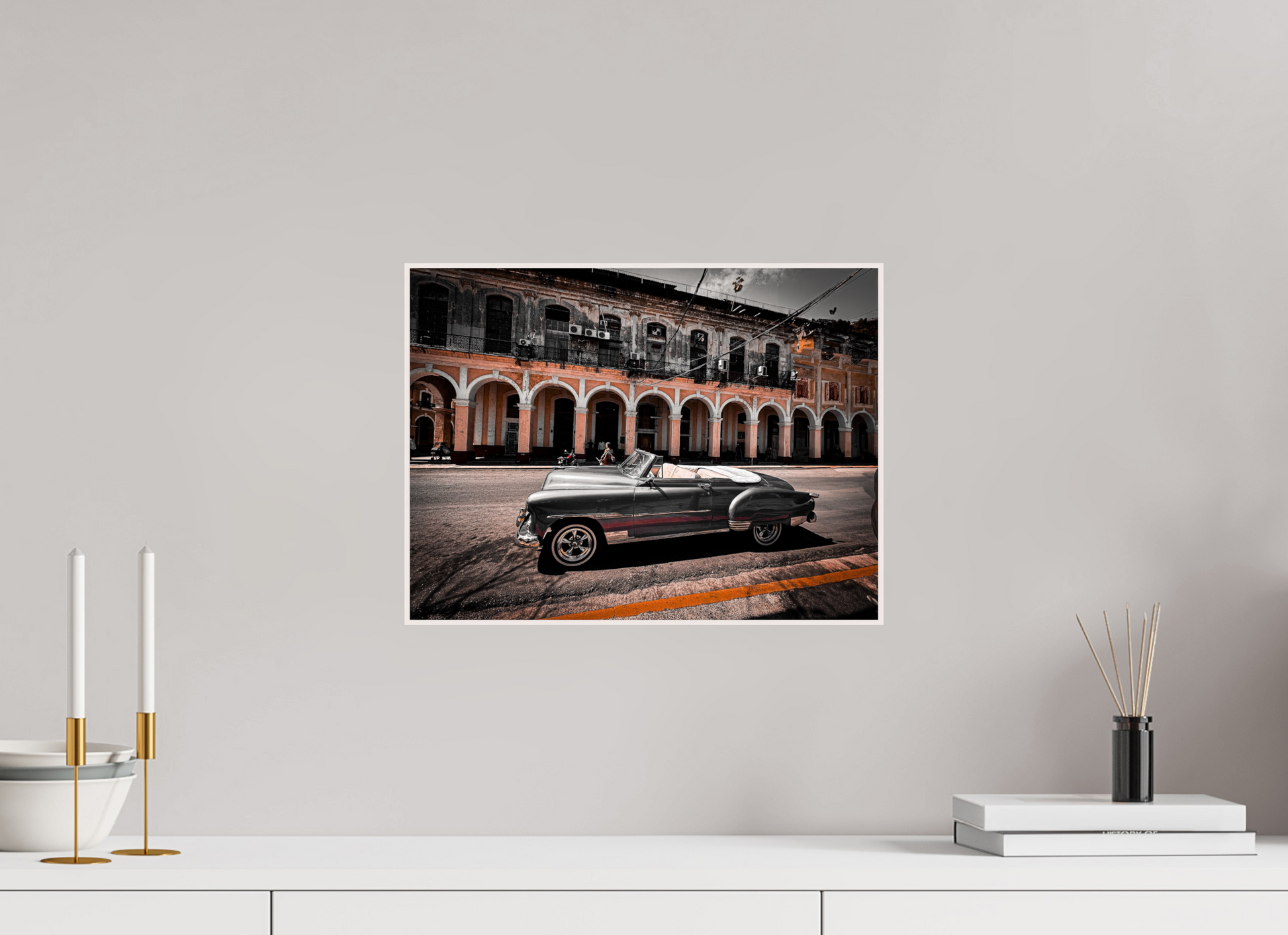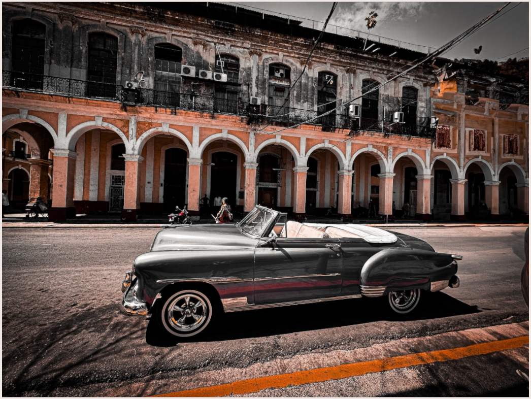 The image showcases a sleek, black and white classic car parked in front of an elegant, arched building in Havana. The monochromatic tones of the car contrast sharply with the warm, earthy hues of the building, creating a visually striking scene. The soft, natural light enhances the textures and details, adding depth and character to the photograph.