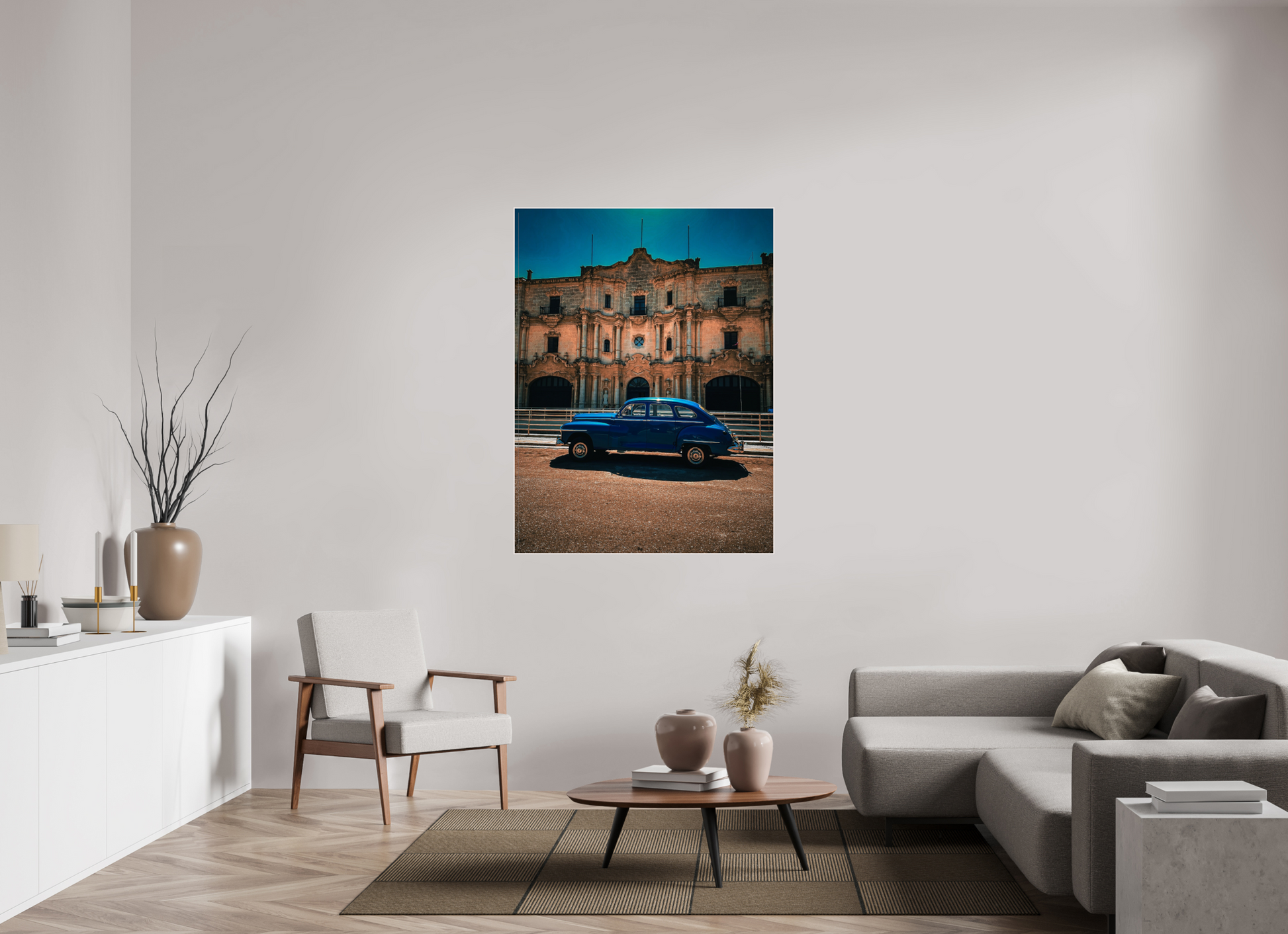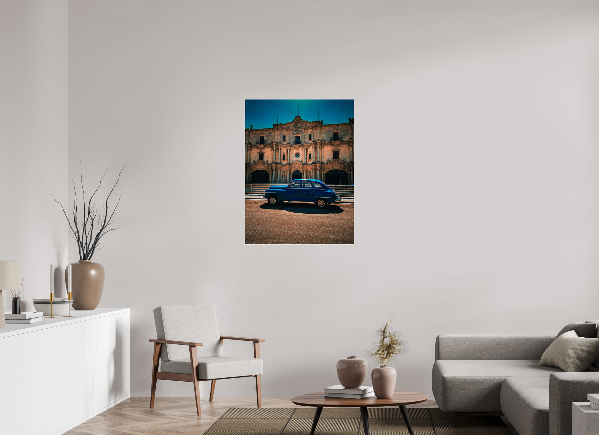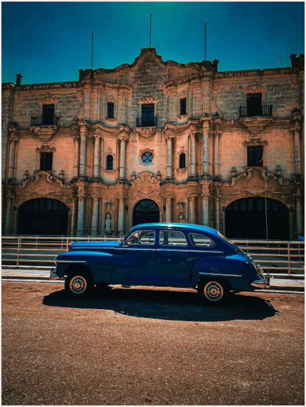 This image captures the timeless beauty of Havana with a classic blue car parked in front of an imposing historic building. The car's sleek lines and vibrant color contrast with the weathered, grand facade of the architecture, evoking a sense of nostalgia and elegance. The warm, golden light of the setting sun bathes the scene, highlighting the textures and details of both the car and the building.