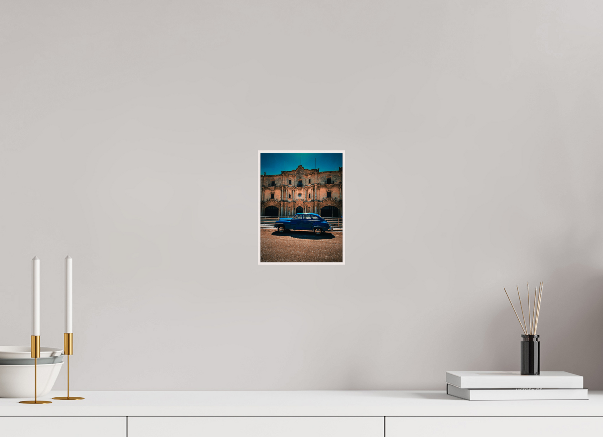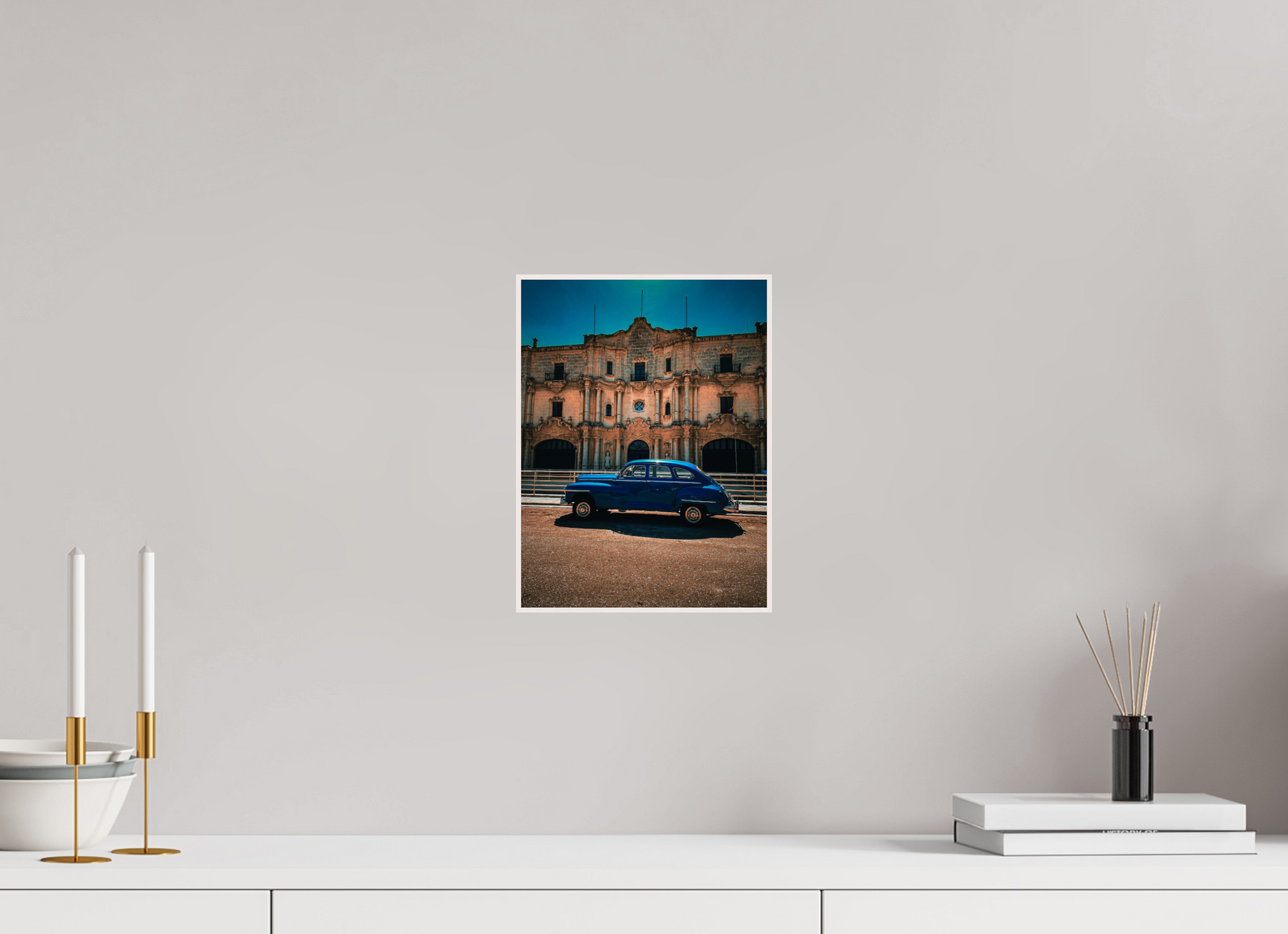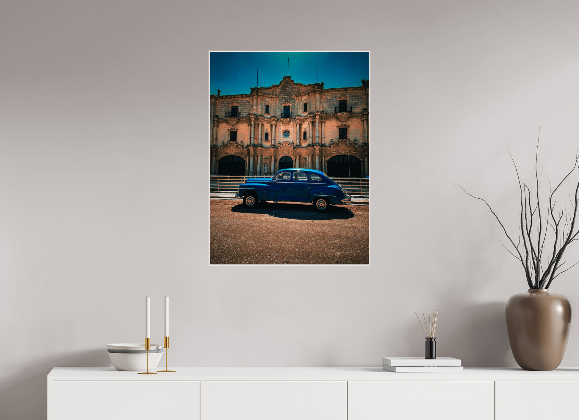 This image captures the timeless beauty of Havana with a classic blue car parked in front of an imposing historic building. The car's sleek lines and vibrant color contrast with the weathered, grand facade of the architecture, evoking a sense of nostalgia and elegance. The warm, golden light of the setting sun bathes the scene, highlighting the textures and details of both the car and the building.