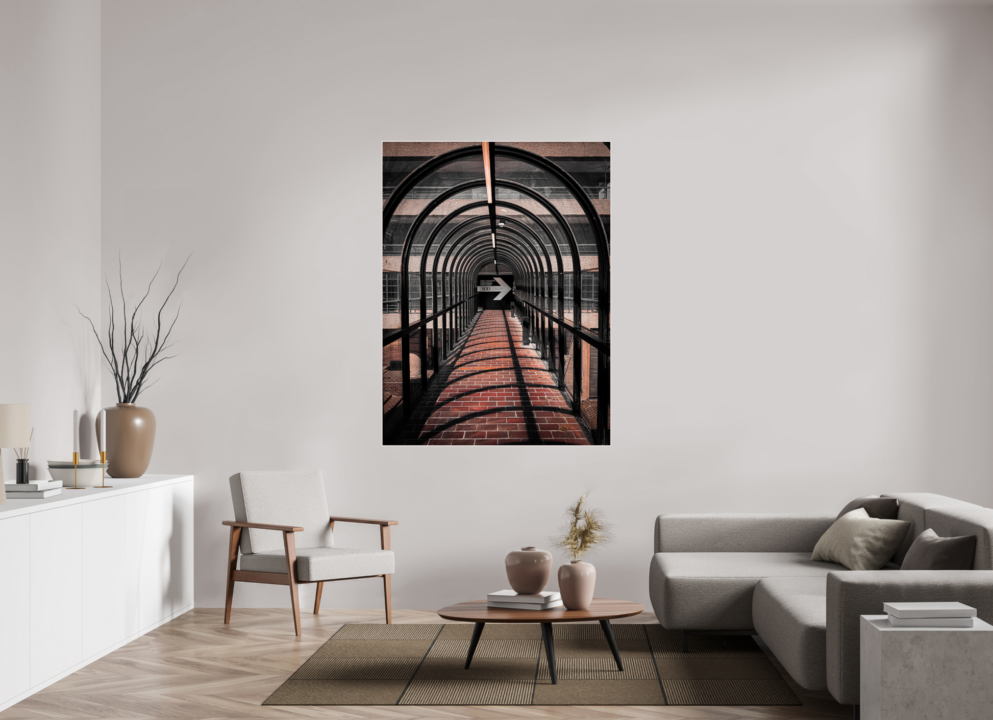 This image captures the intriguing perspective of a covered walkway at the Barbican Estate, where the interplay of light and shadow creates a mesmerizing pattern along the brick-paved path. The repetitive arches frame the scene, drawing the viewer's eye towards the distant light at the end of the tunnel, symbolizing a journey through the architectural marvels of this Brutalist icon.