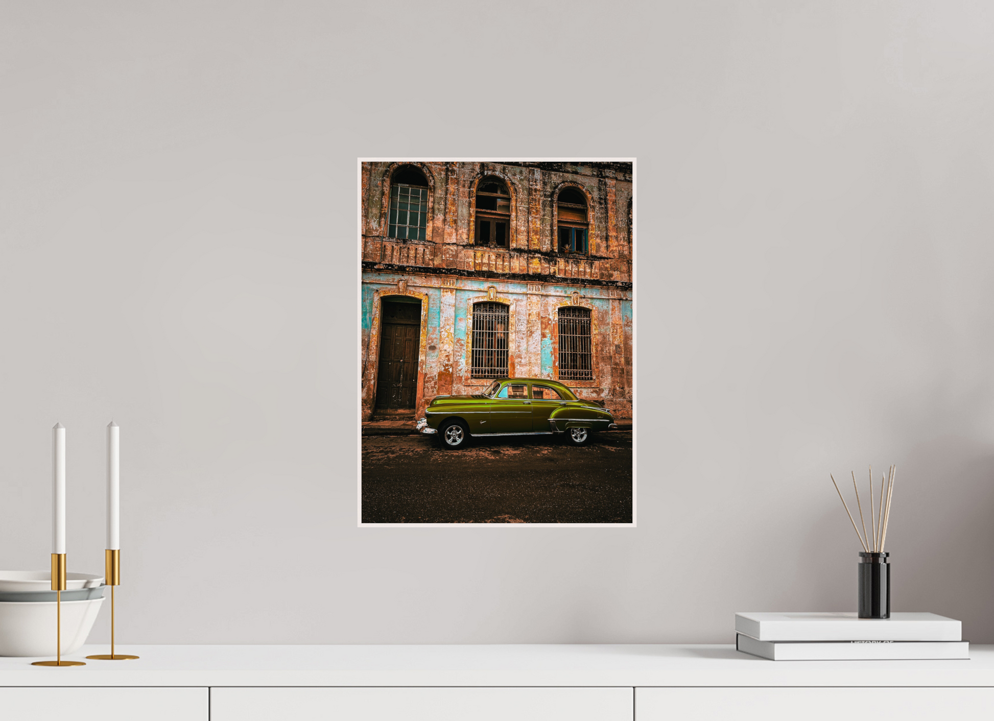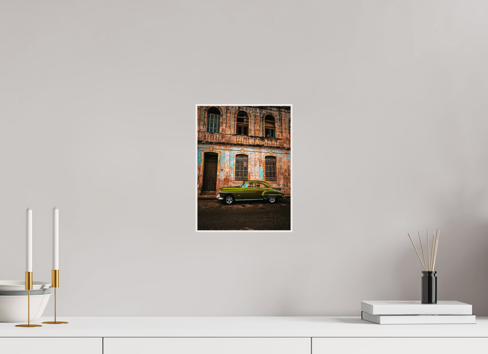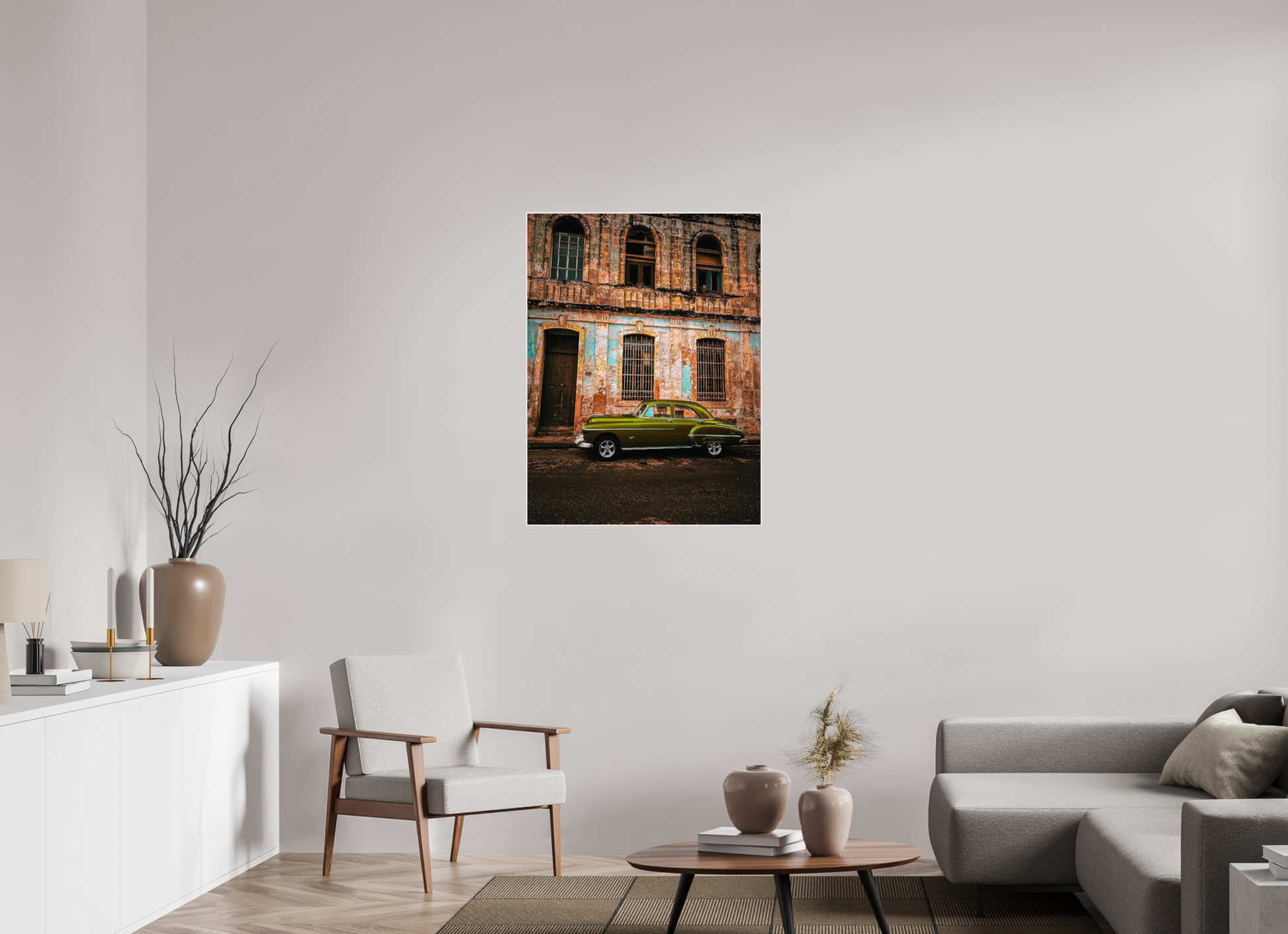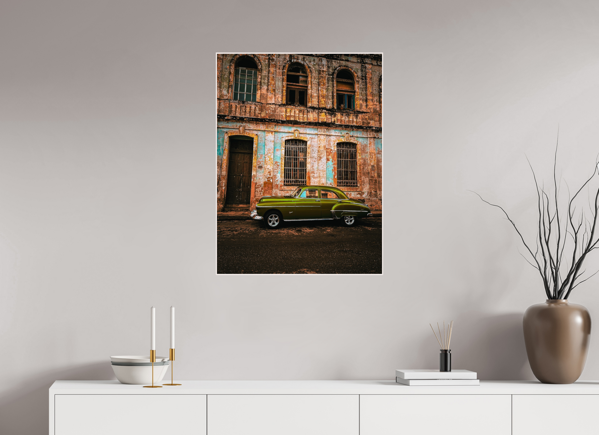 Featuring a classic white car driving down a Havana street, this image is bathed in the warm, golden glow of the setting sun. The car's elegant design and the soft light create a dreamy, nostalgic atmosphere, evoking the timeless beauty of Havana. The city's historic buildings and palm trees line the street, adding to the charm and character of the scene.