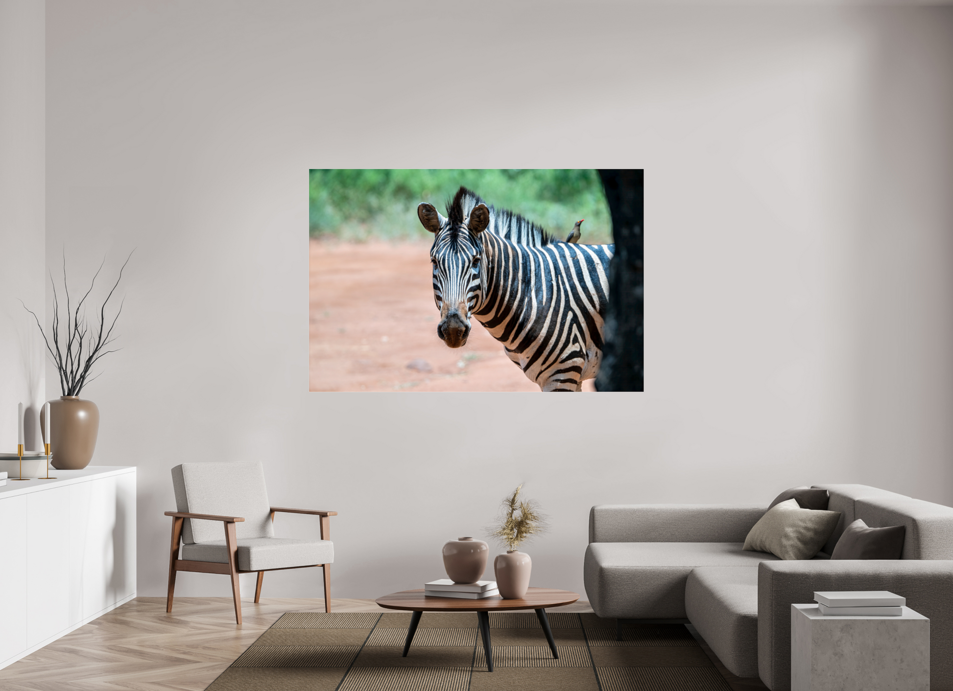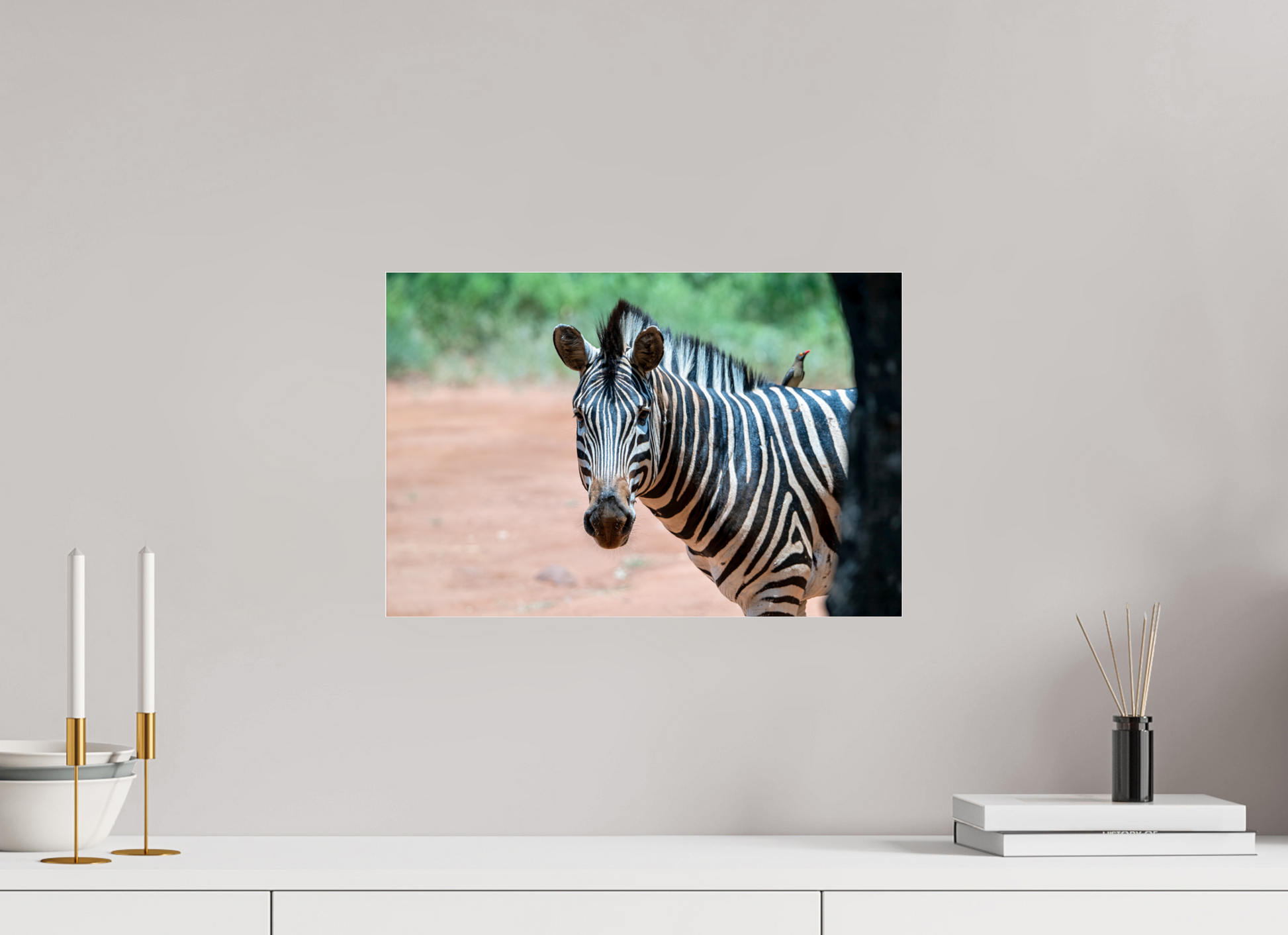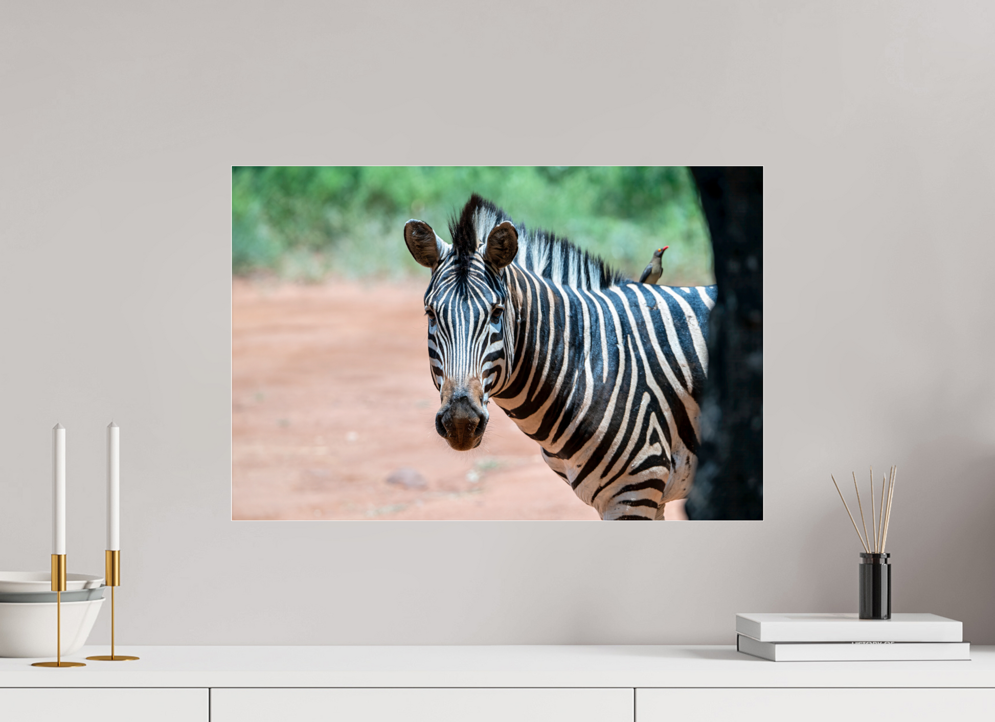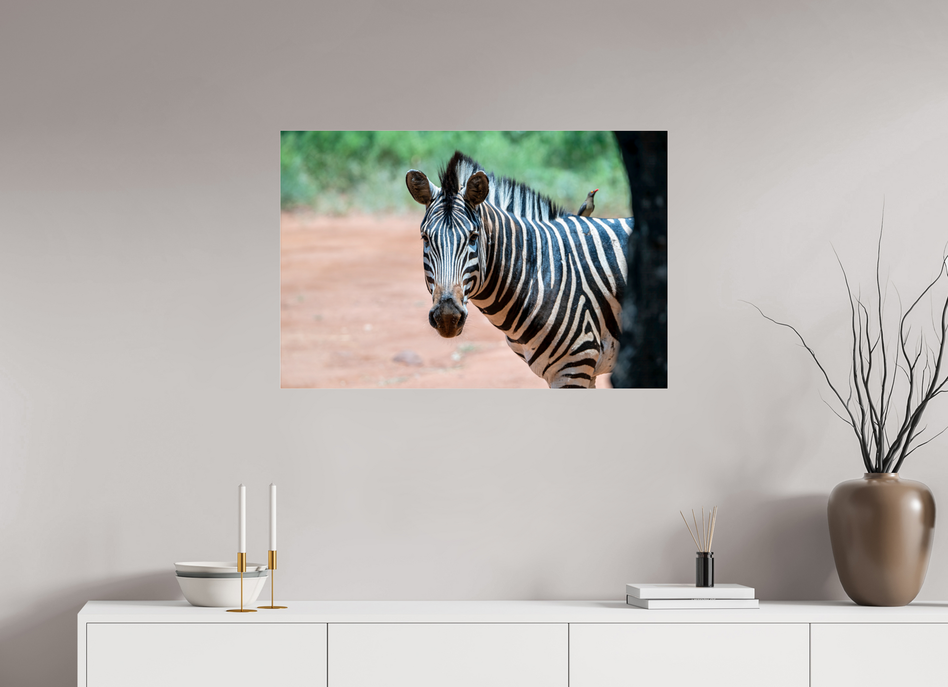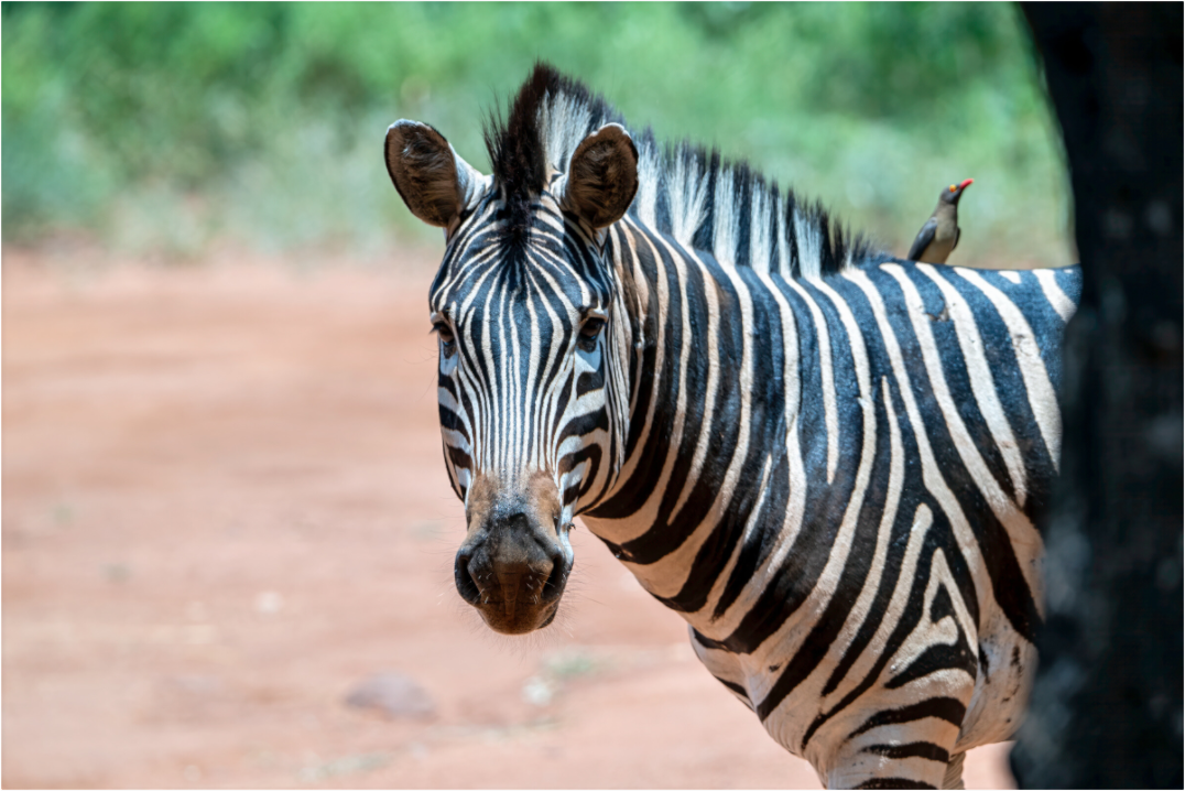 A zebra stands gracefully under the shade of a tree, its striking black and white stripes contrasting beautifully with the earthy tones of the savannah, capturing a moment of peaceful coexistence with nature.