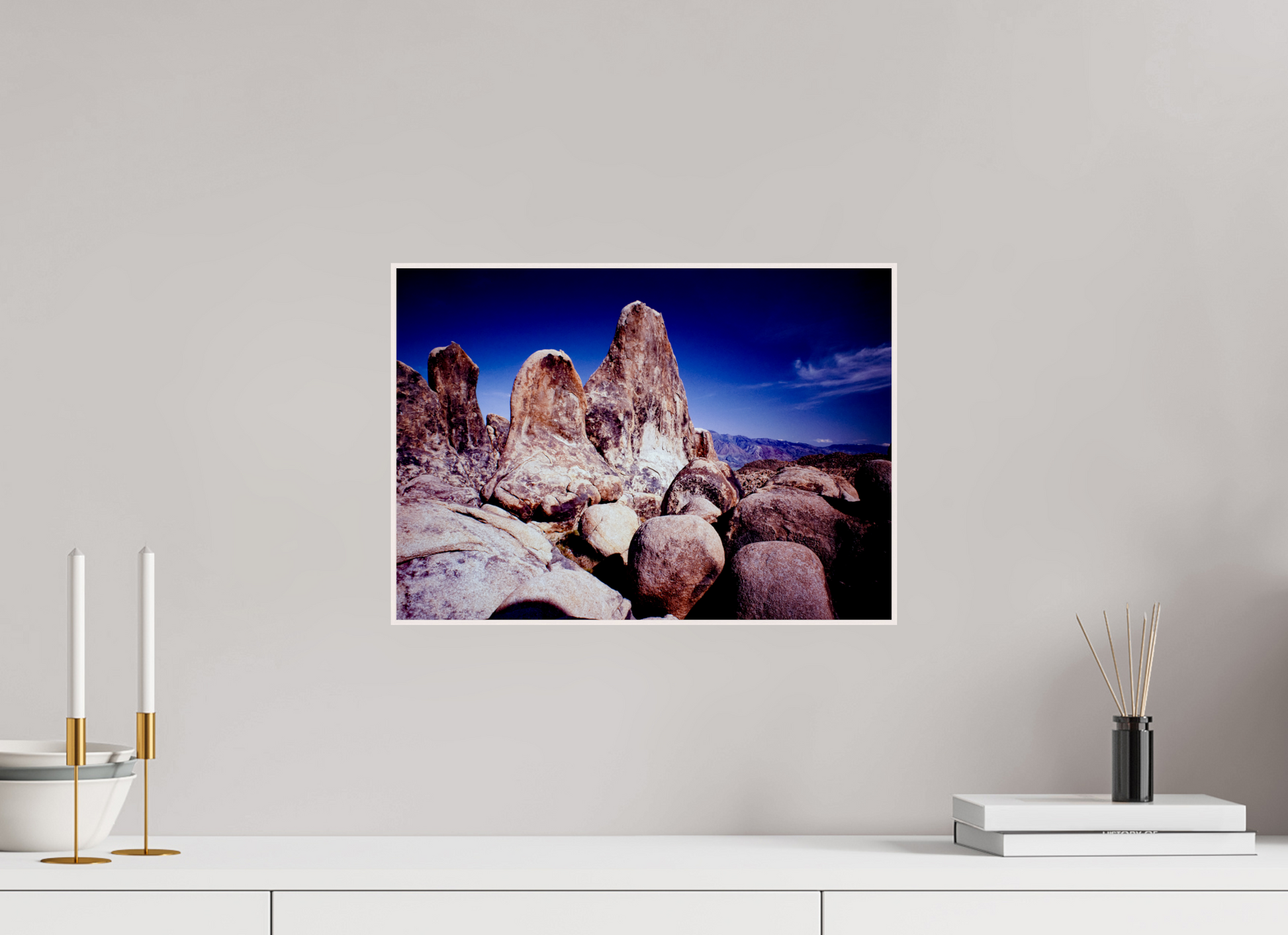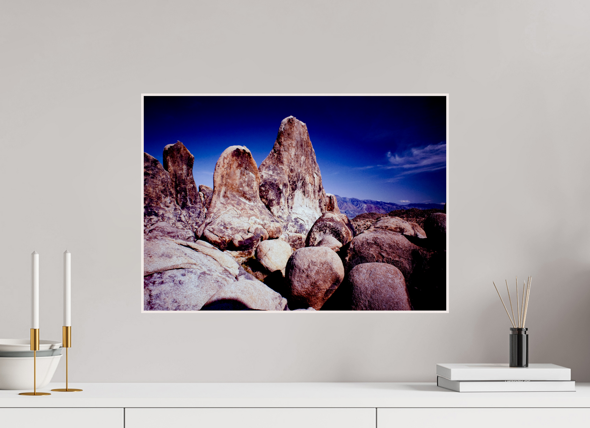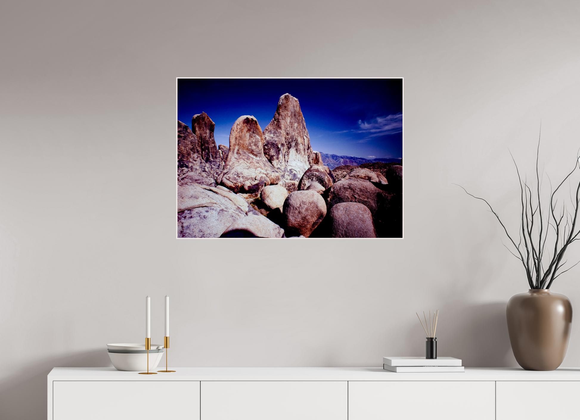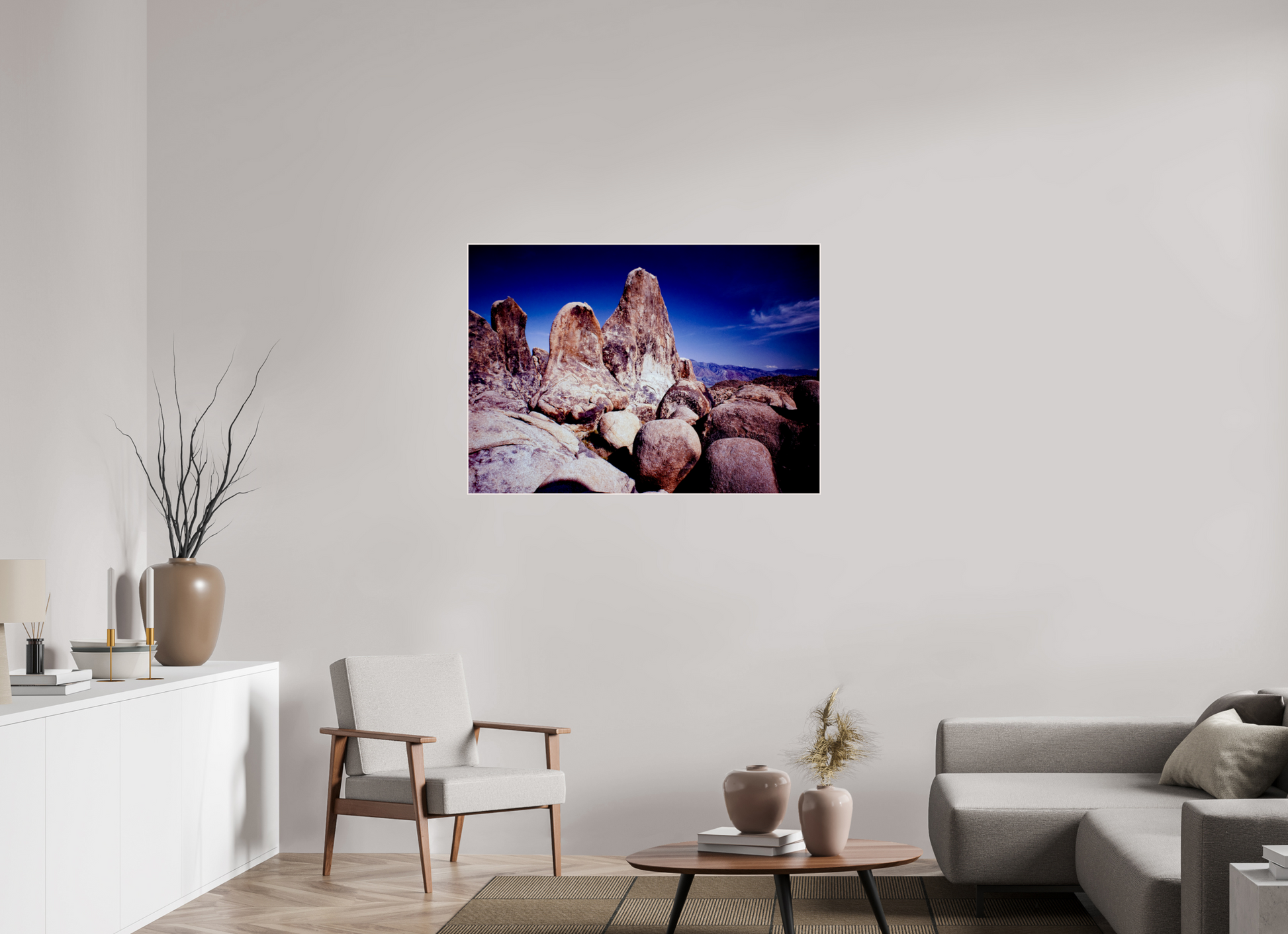 Towering rock formations stand as ancient guardians against a backdrop of clear blue skies and distant mountains.