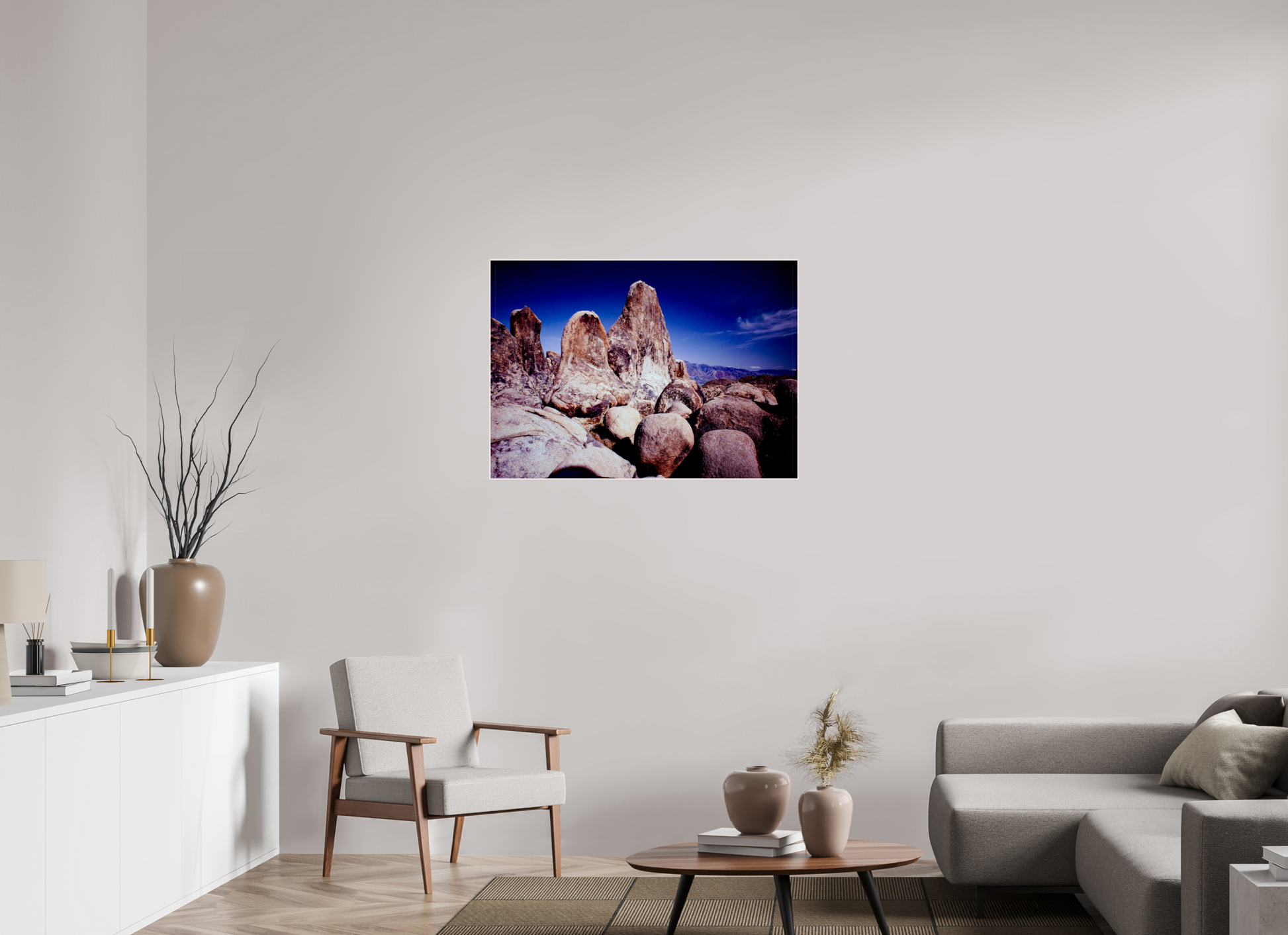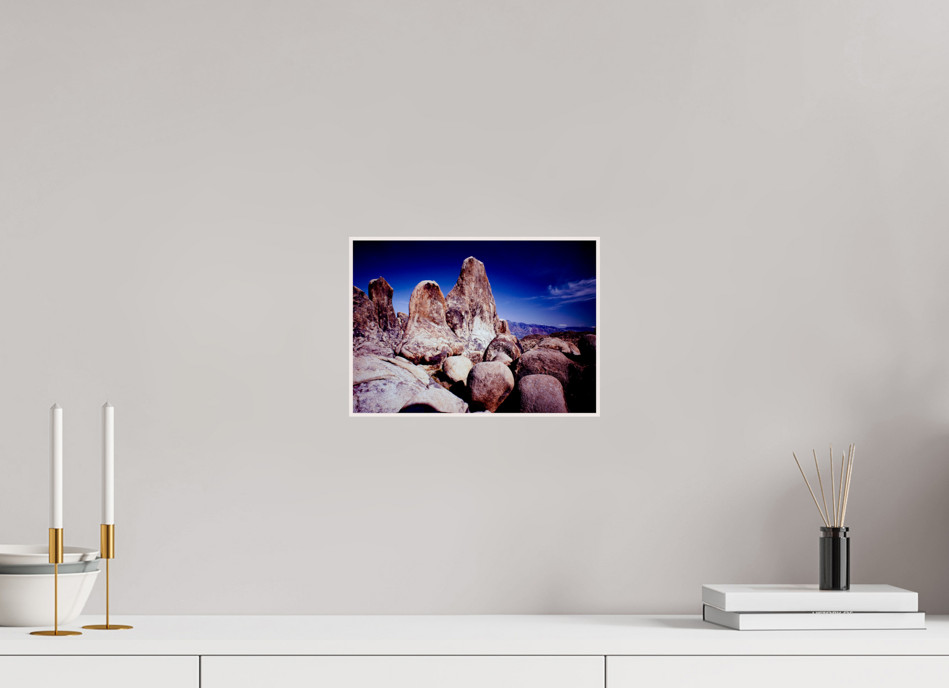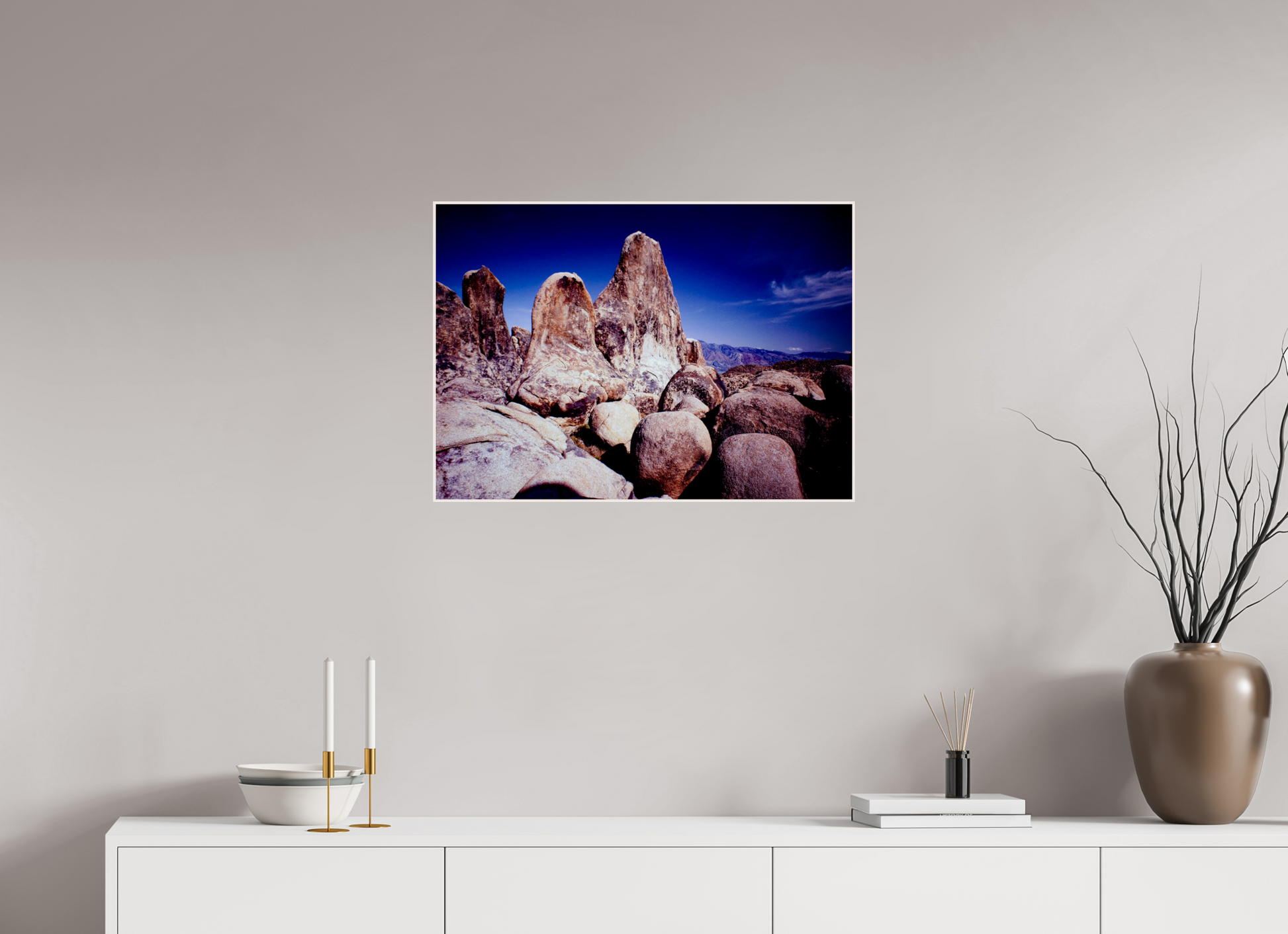 Towering rock formations stand as ancient guardians against a backdrop of clear blue skies and distant mountains.