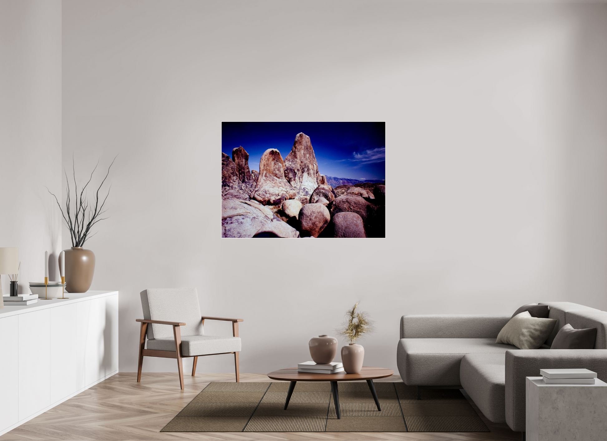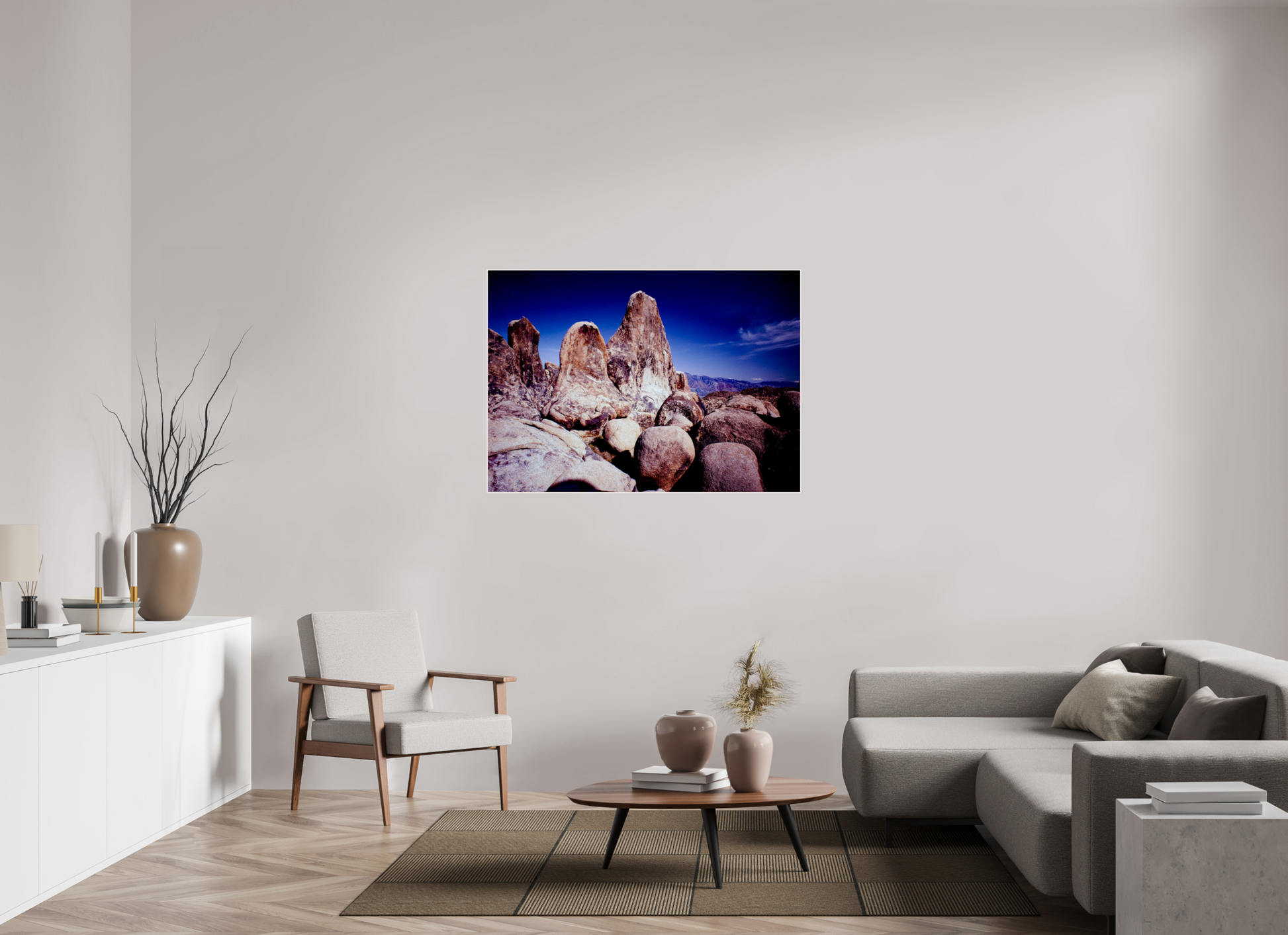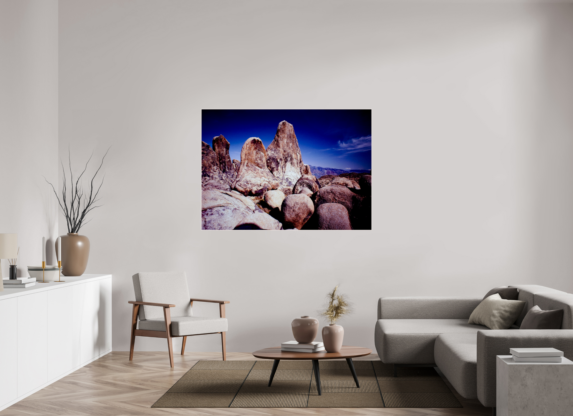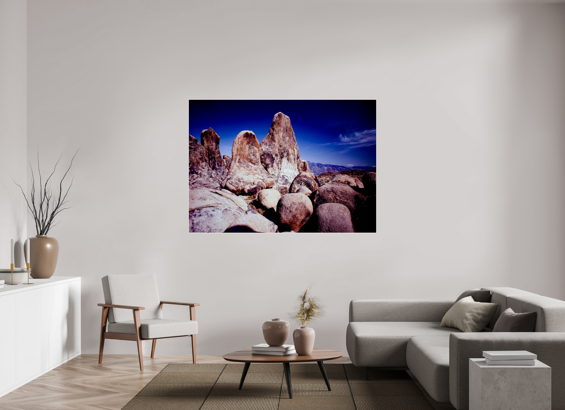 Towering rock formations stand as ancient guardians against a backdrop of clear blue skies and distant mountains.