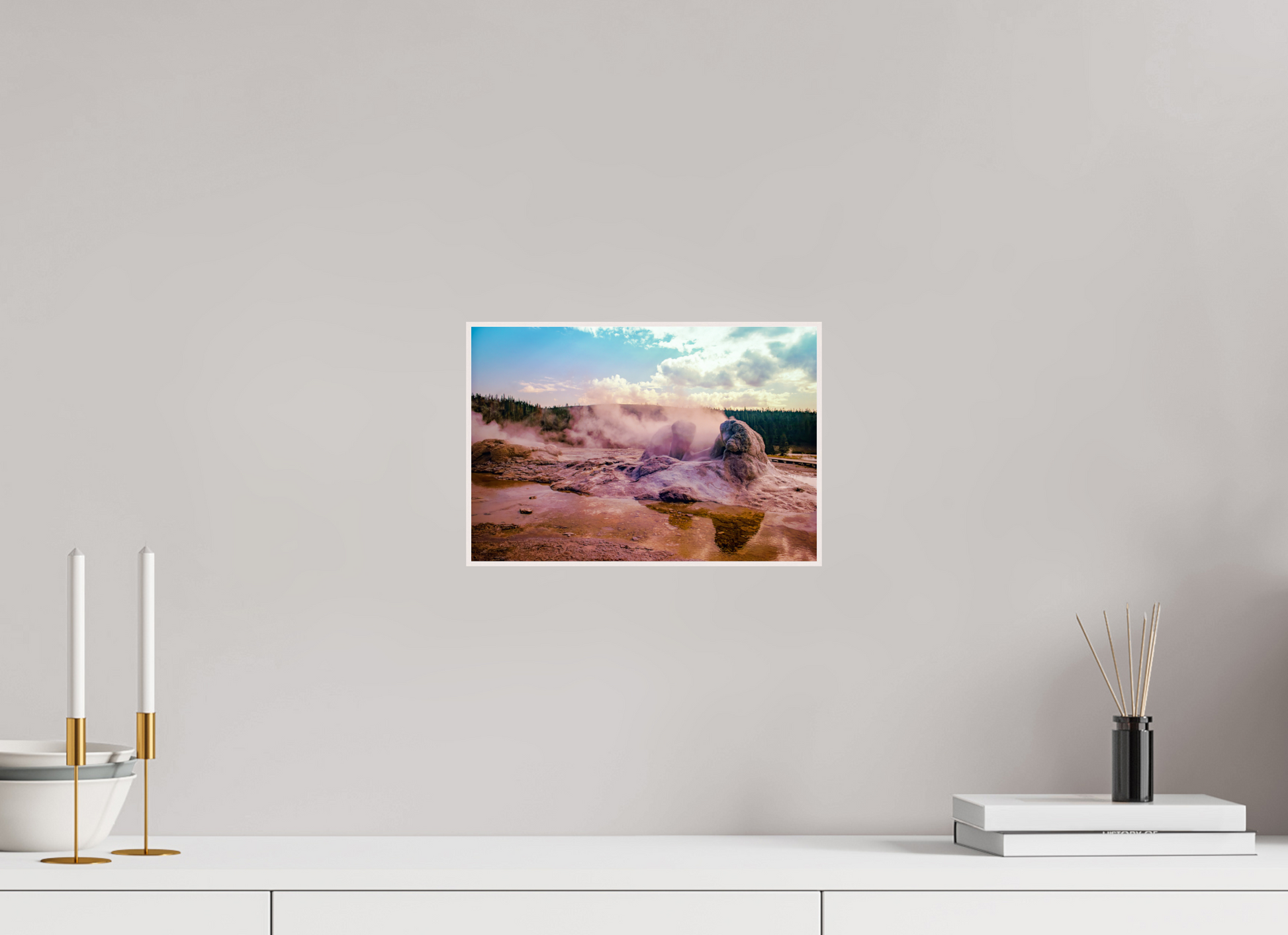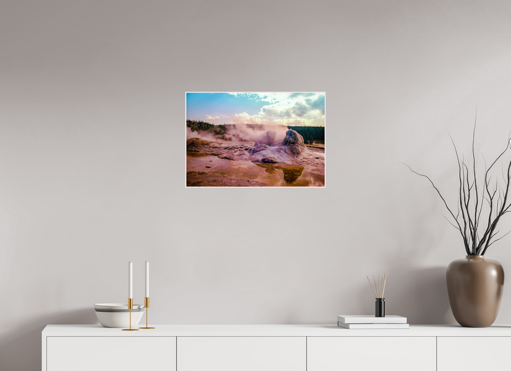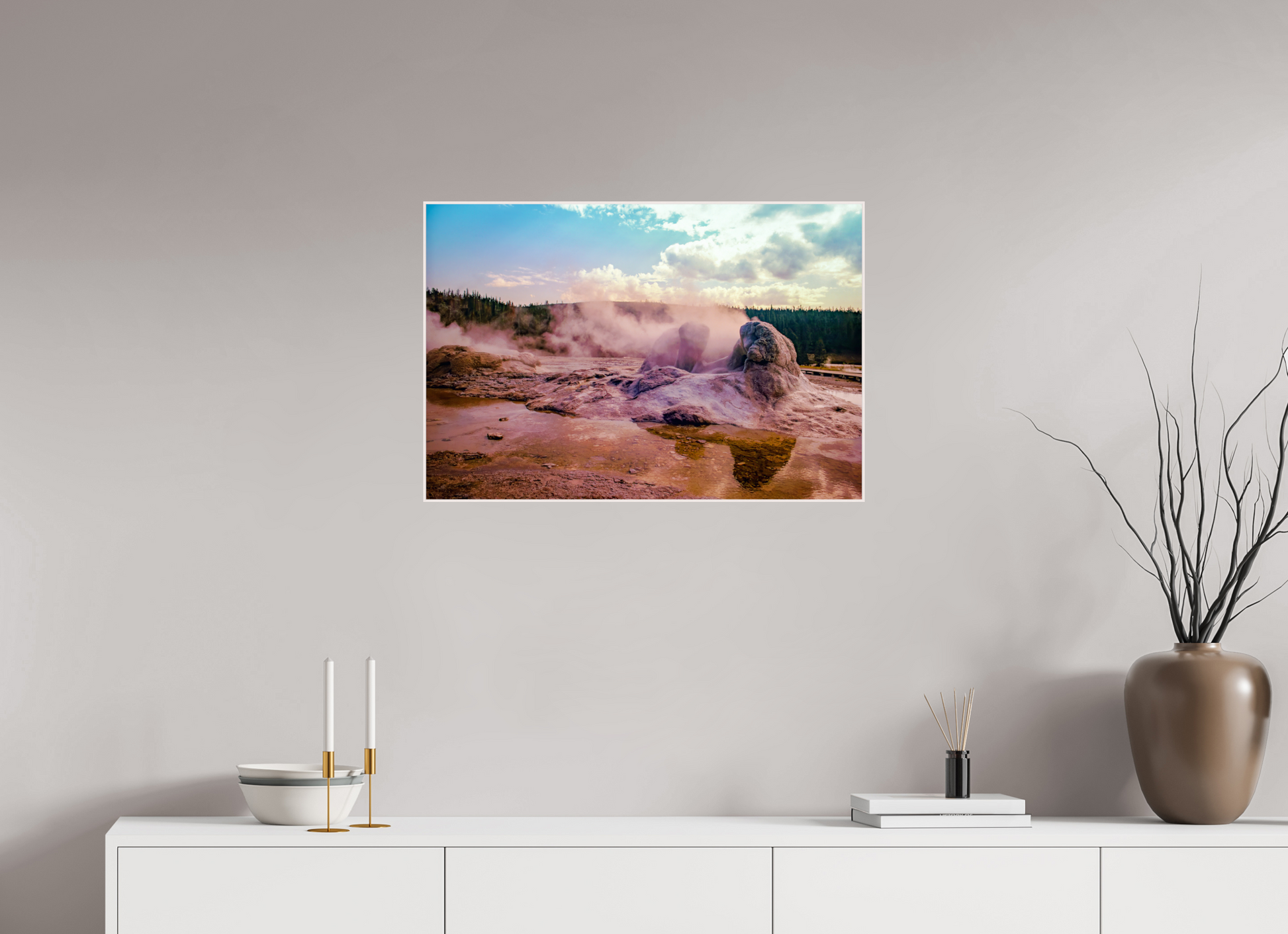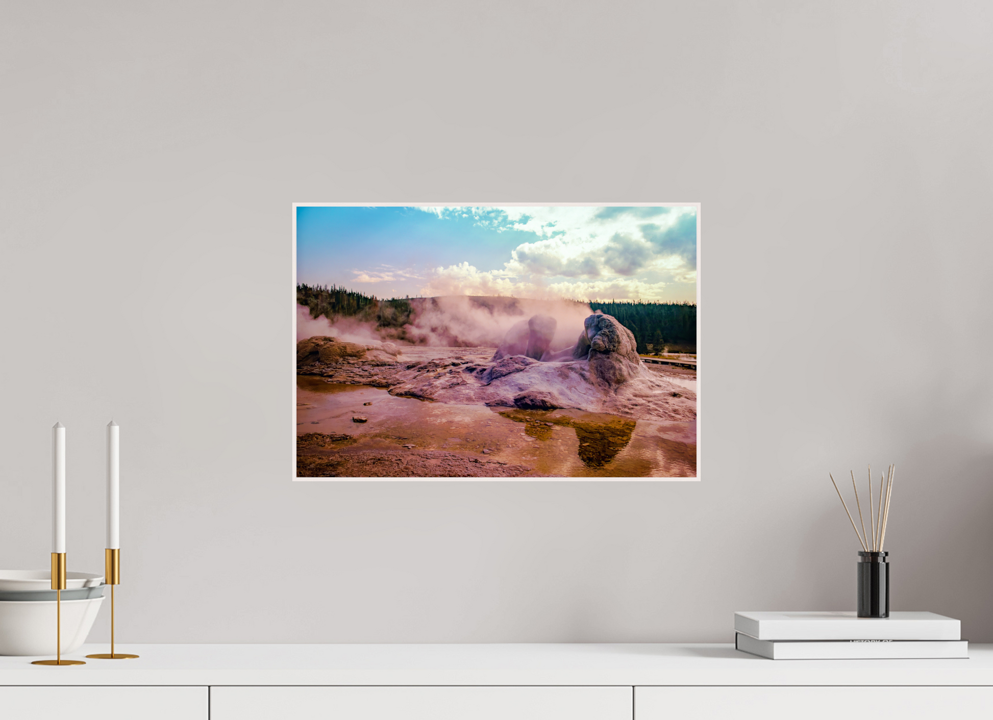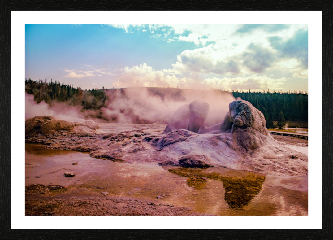 Steam rises from the thermal pools, casting an ethereal glow over the landscape, as the setting sun paints the sky with hues of pink and gold, creating a scene of serene beauty and mystique.