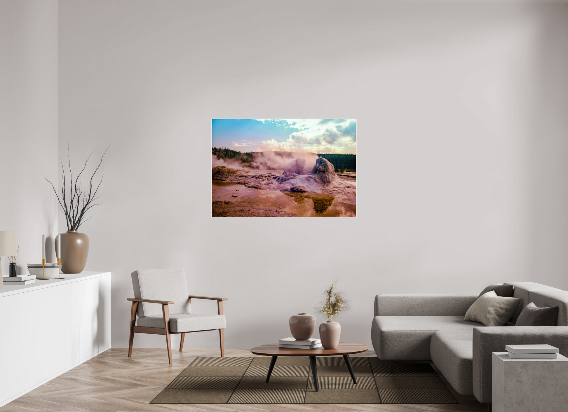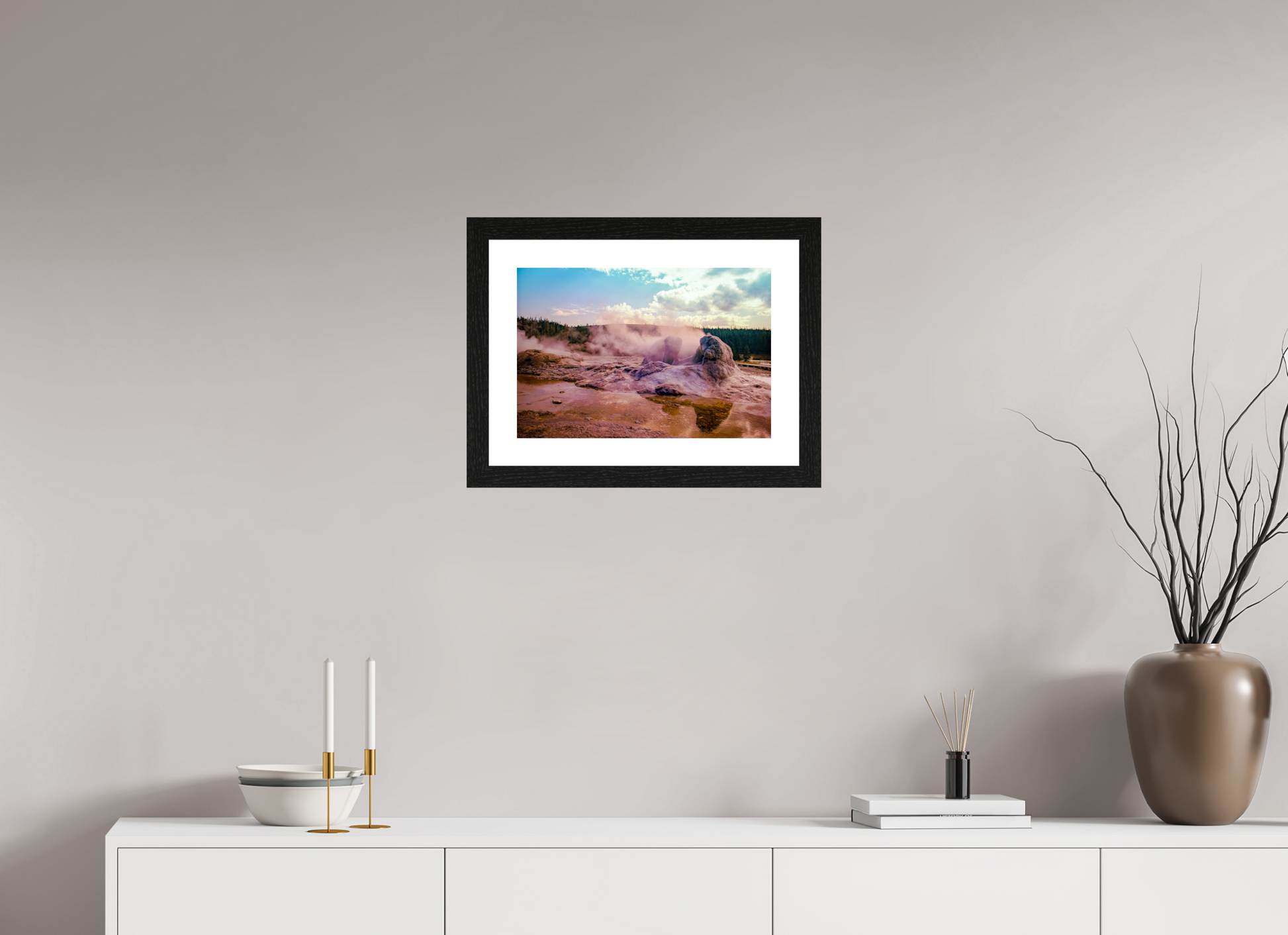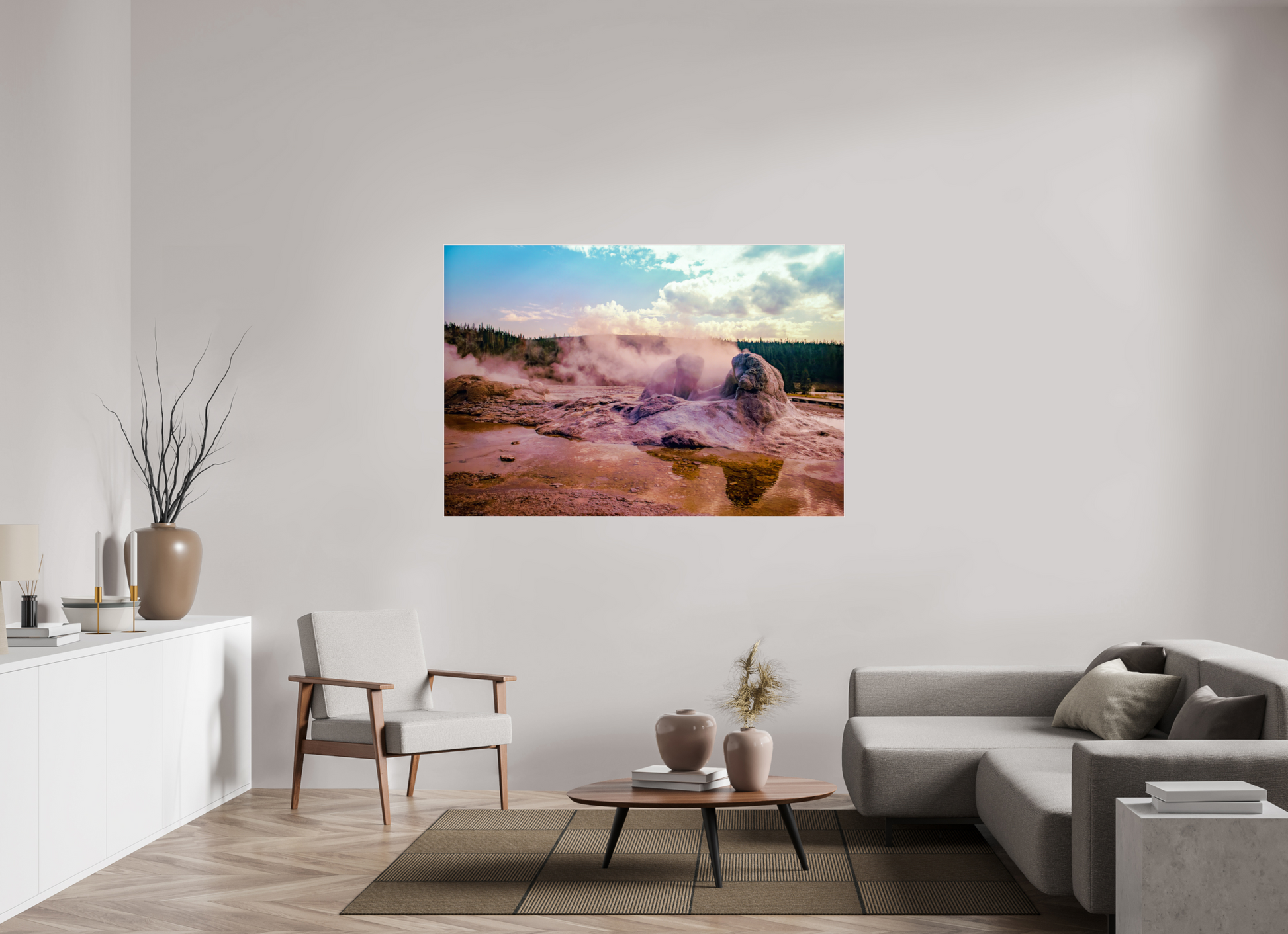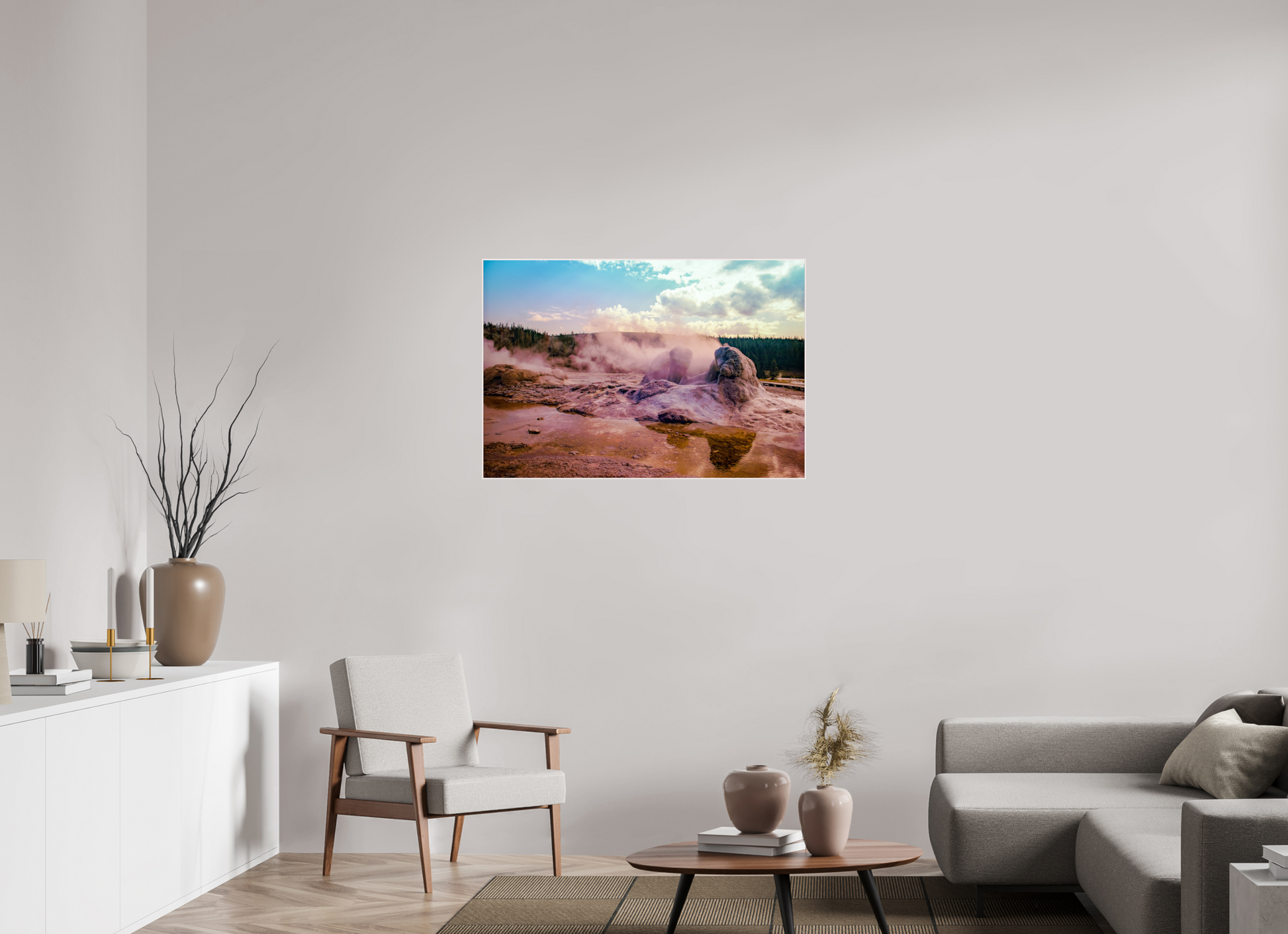 Steam rises from the thermal pools, casting an ethereal glow over the landscape, as the setting sun paints the sky with hues of pink and gold, creating a scene of serene beauty and mystique.