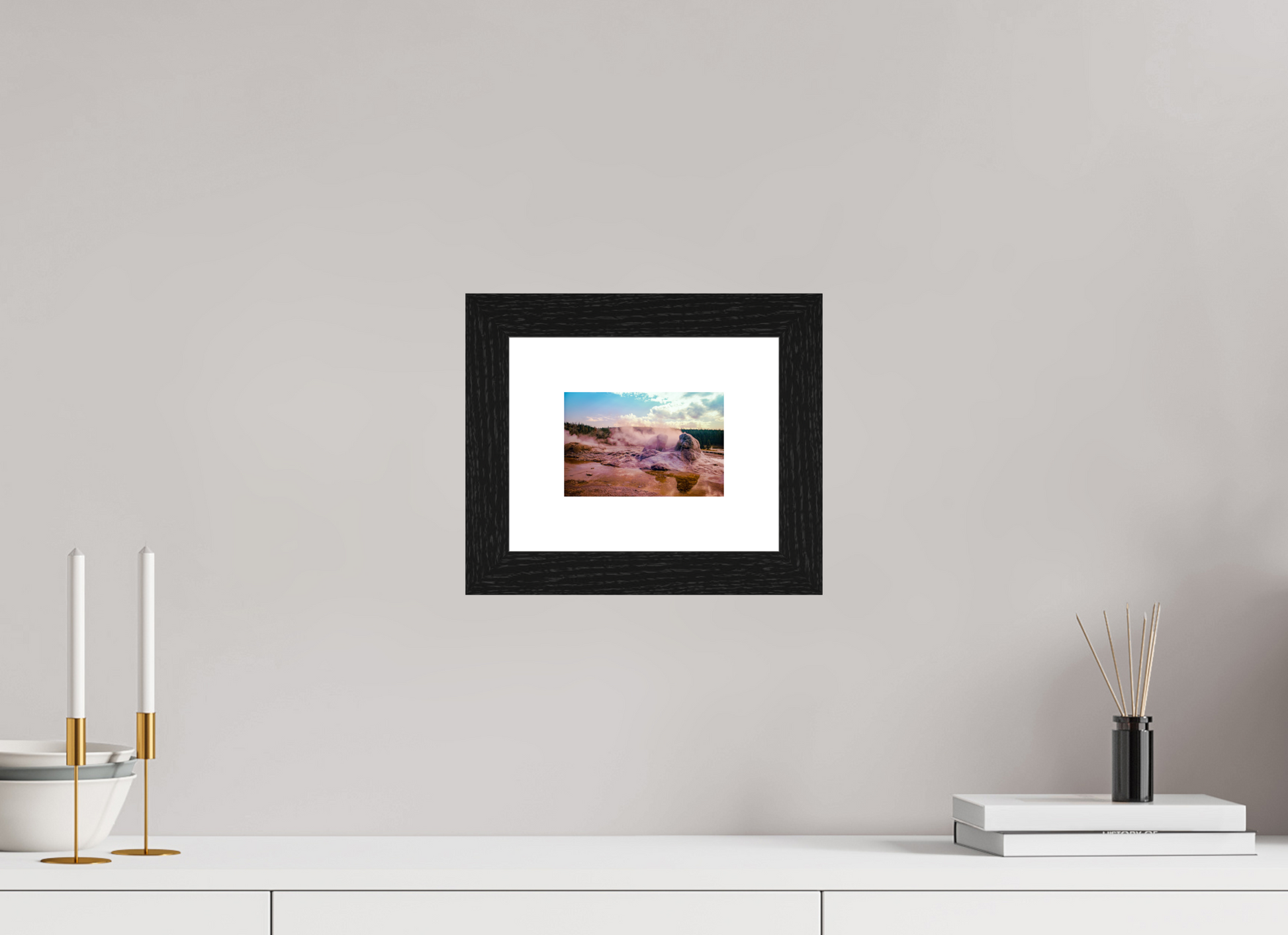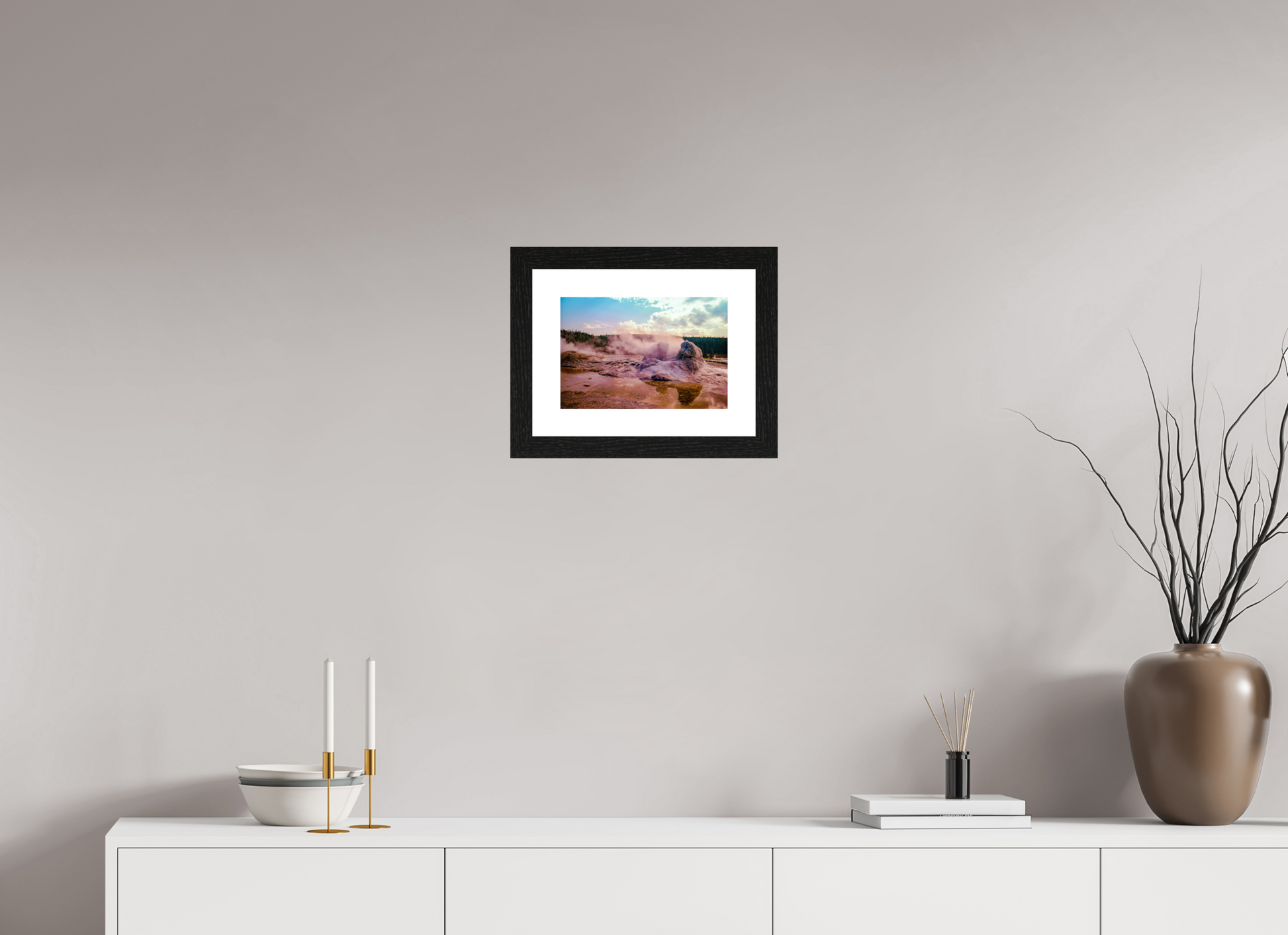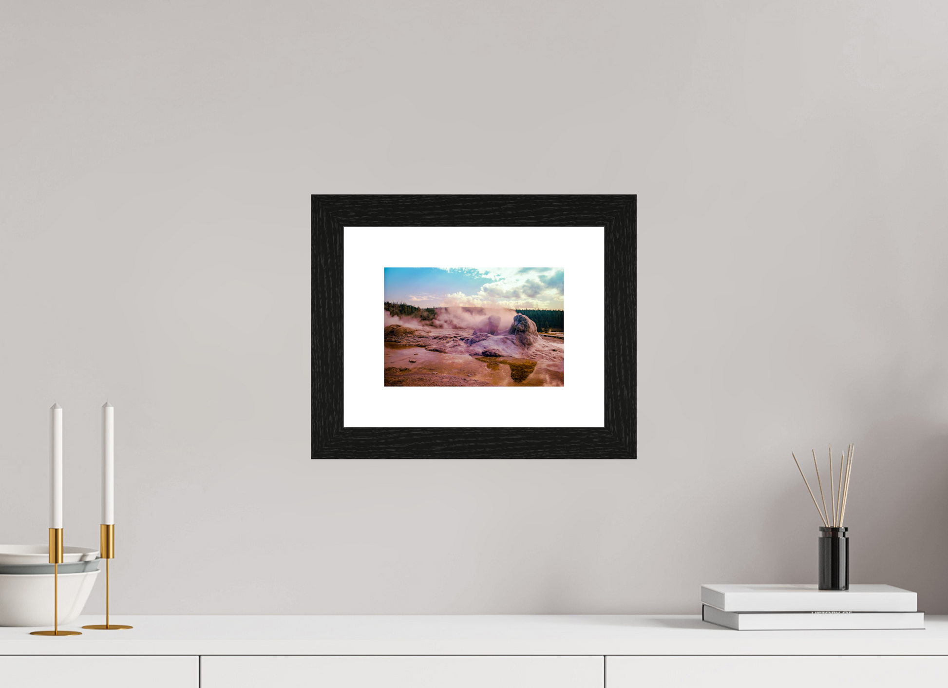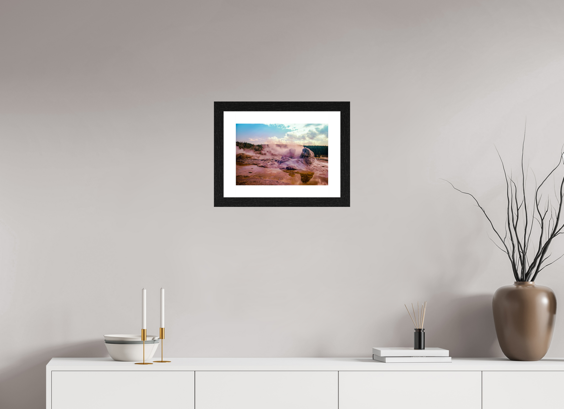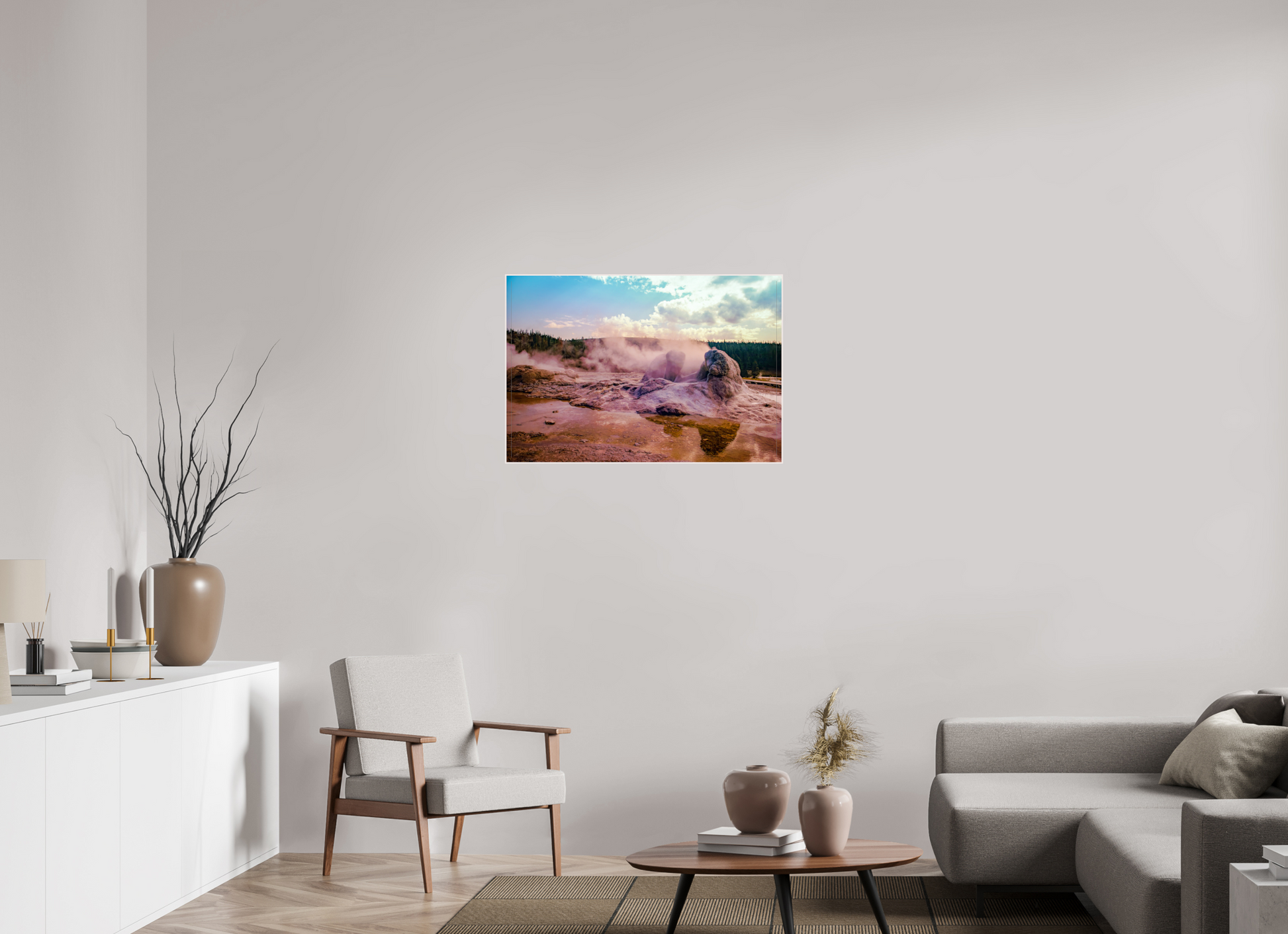 Steam rises from the thermal pools, casting an ethereal glow over the landscape, as the setting sun paints the sky with hues of pink and gold, creating a scene of serene beauty and mystique.