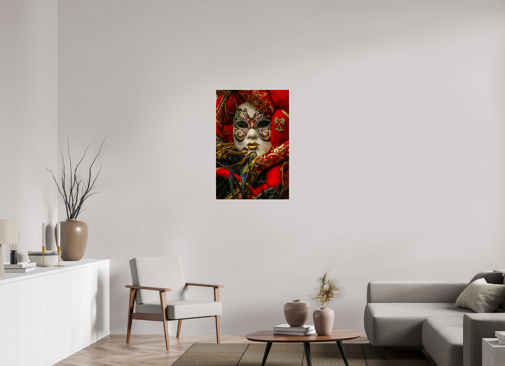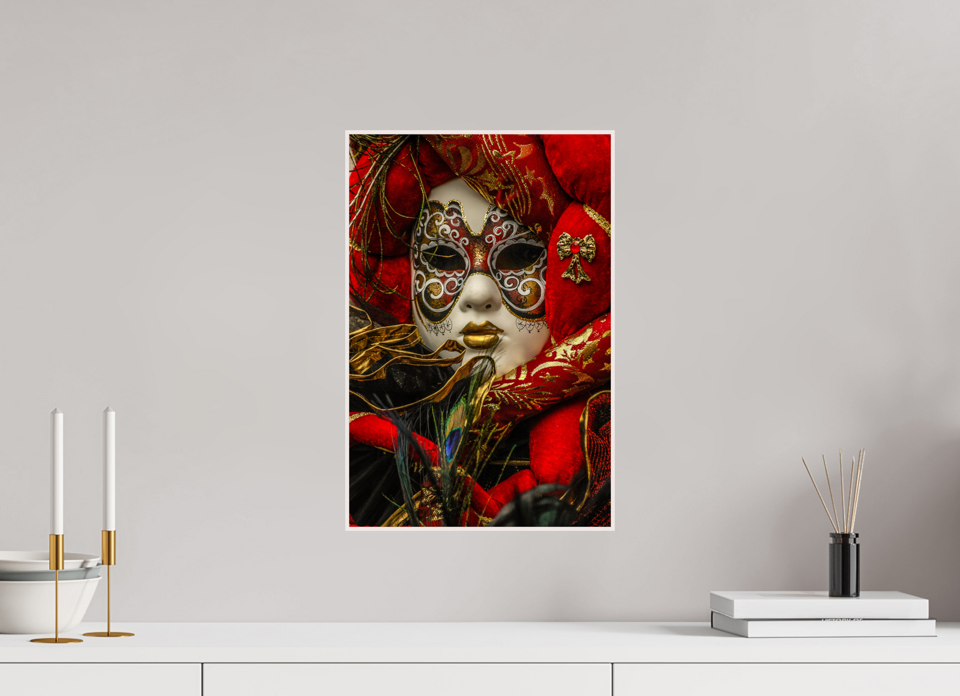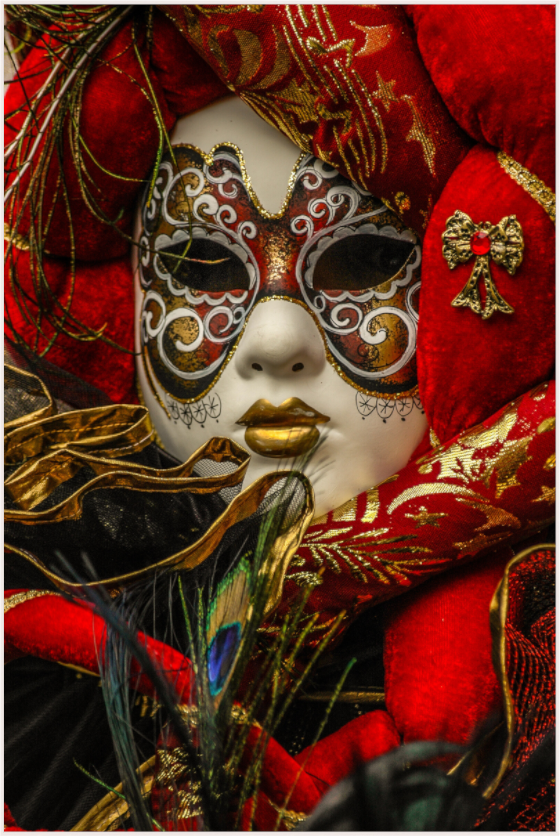 This image exudes regal splendor with a mask that combines vibrant colors and luxurious fabrics. The gold accents and rich red cloak evoke the grandeur of Venetian nobility. The mask's elaborate design, featuring feathers and jewels, highlights the wearer's status and the festive spirit of the Carnival.