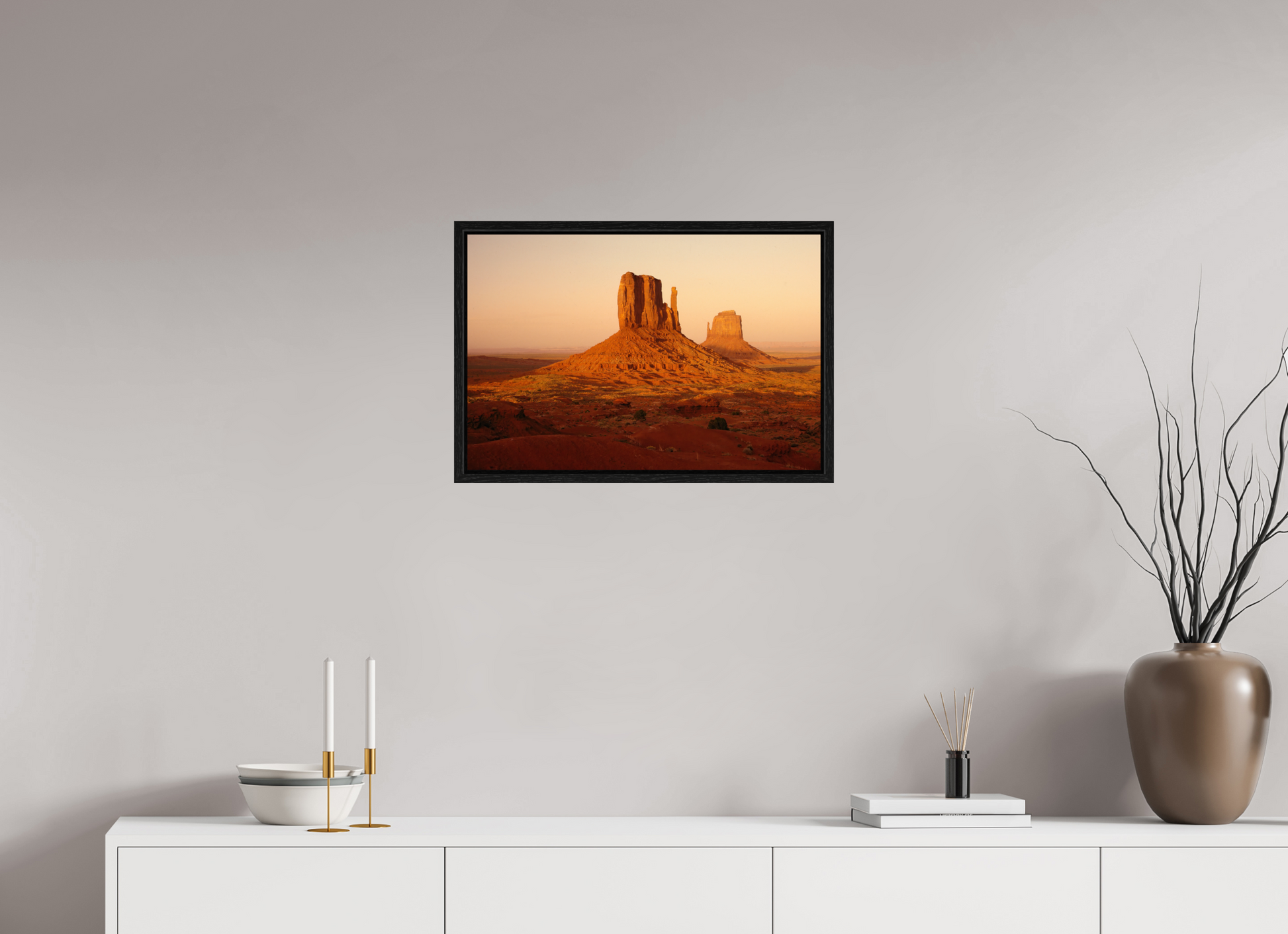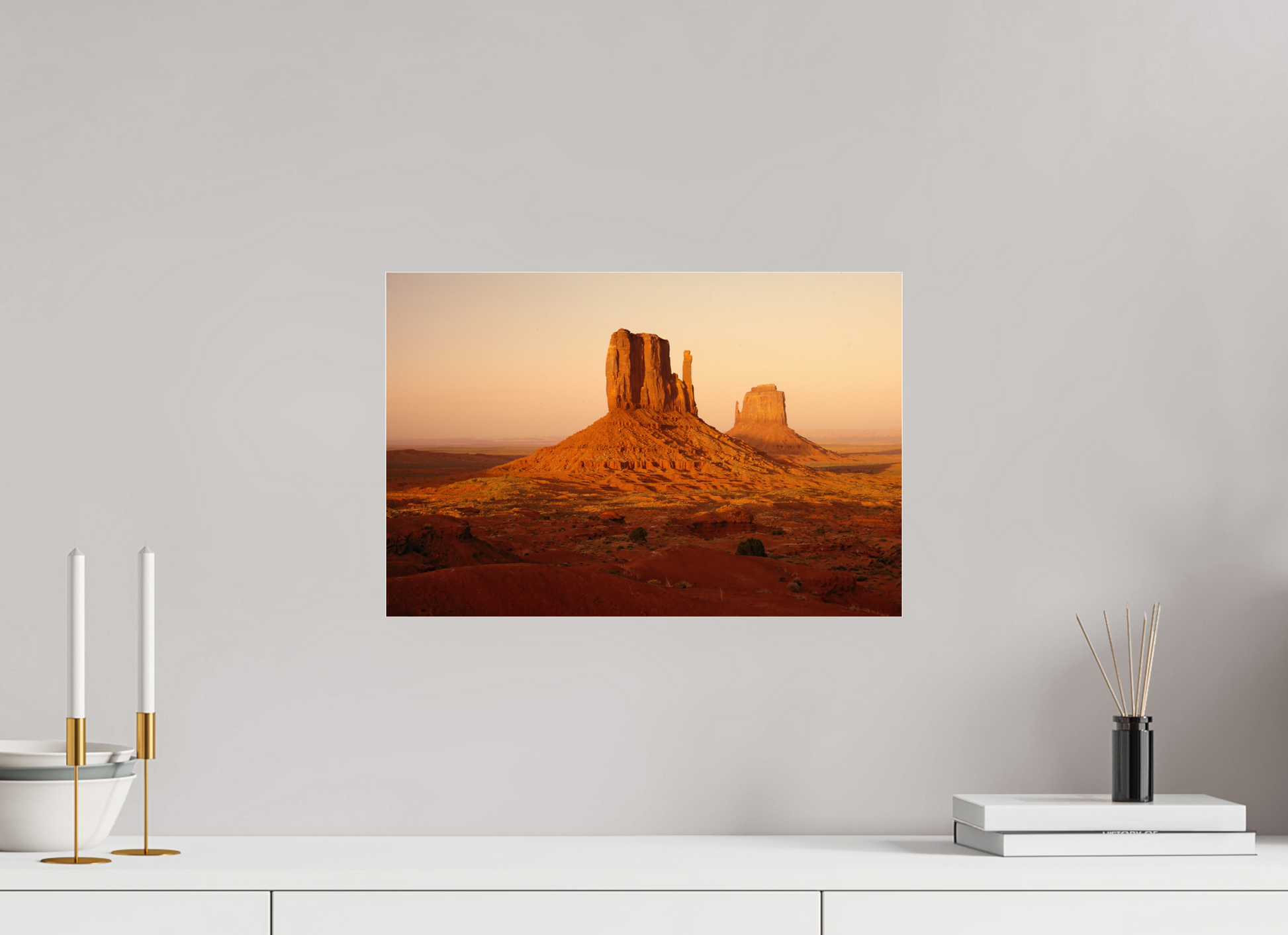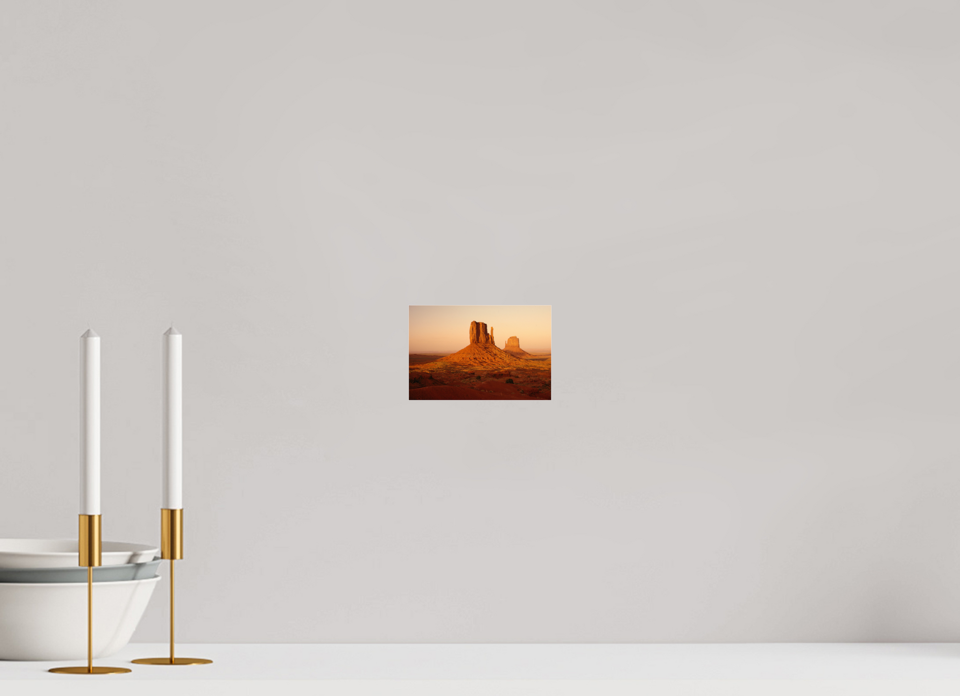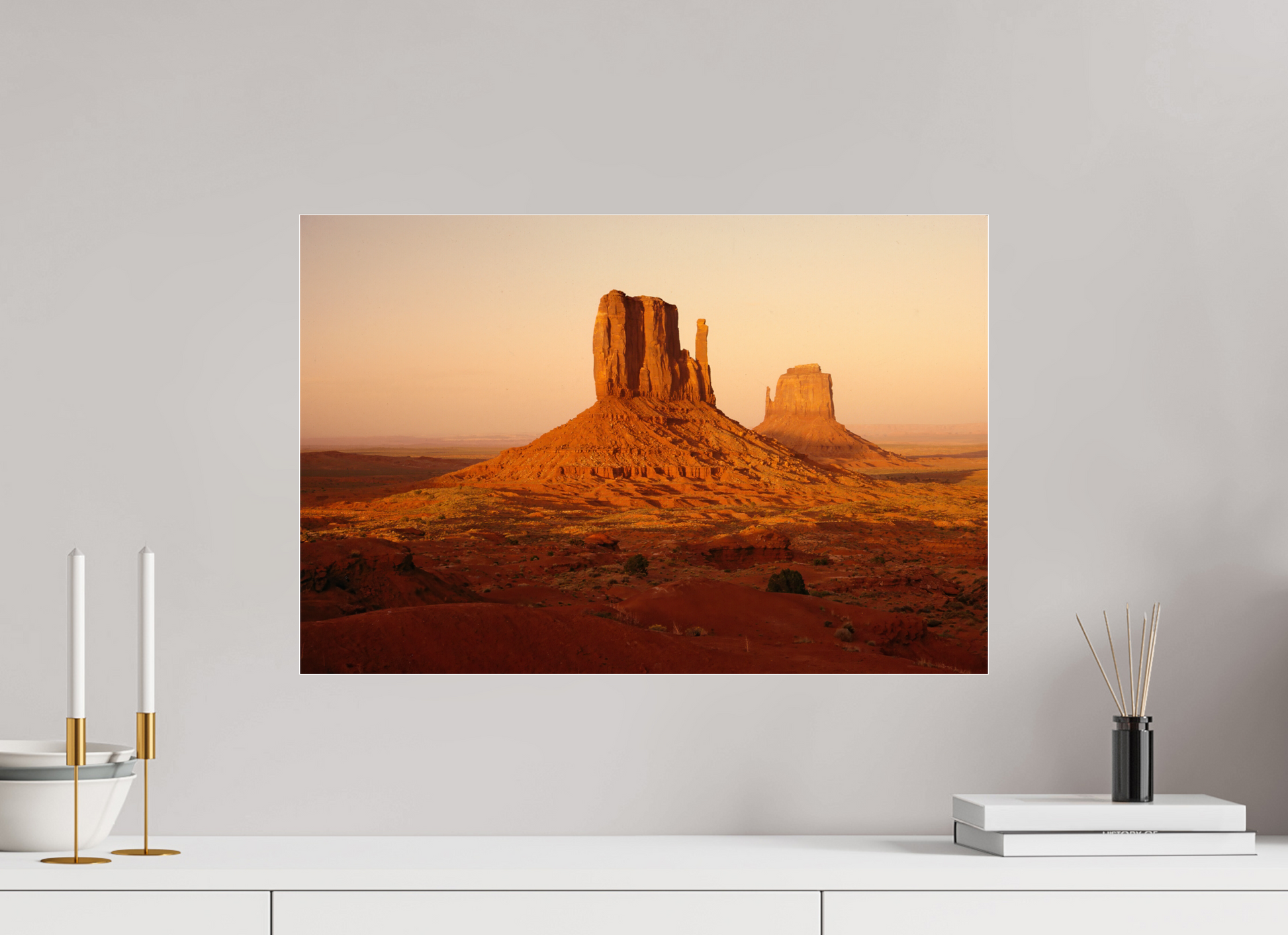 Monumental rock formations rise from the desert floor, their rugged silhouettes bathed in the warm glow of the setting sun, creating a scene of timeless beauty and solitude.
