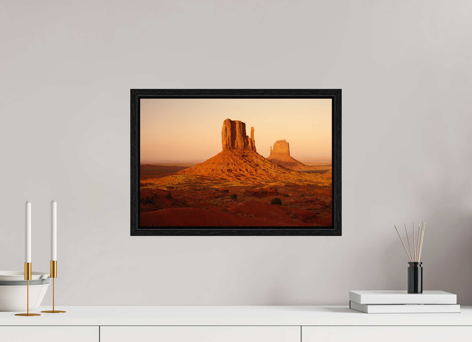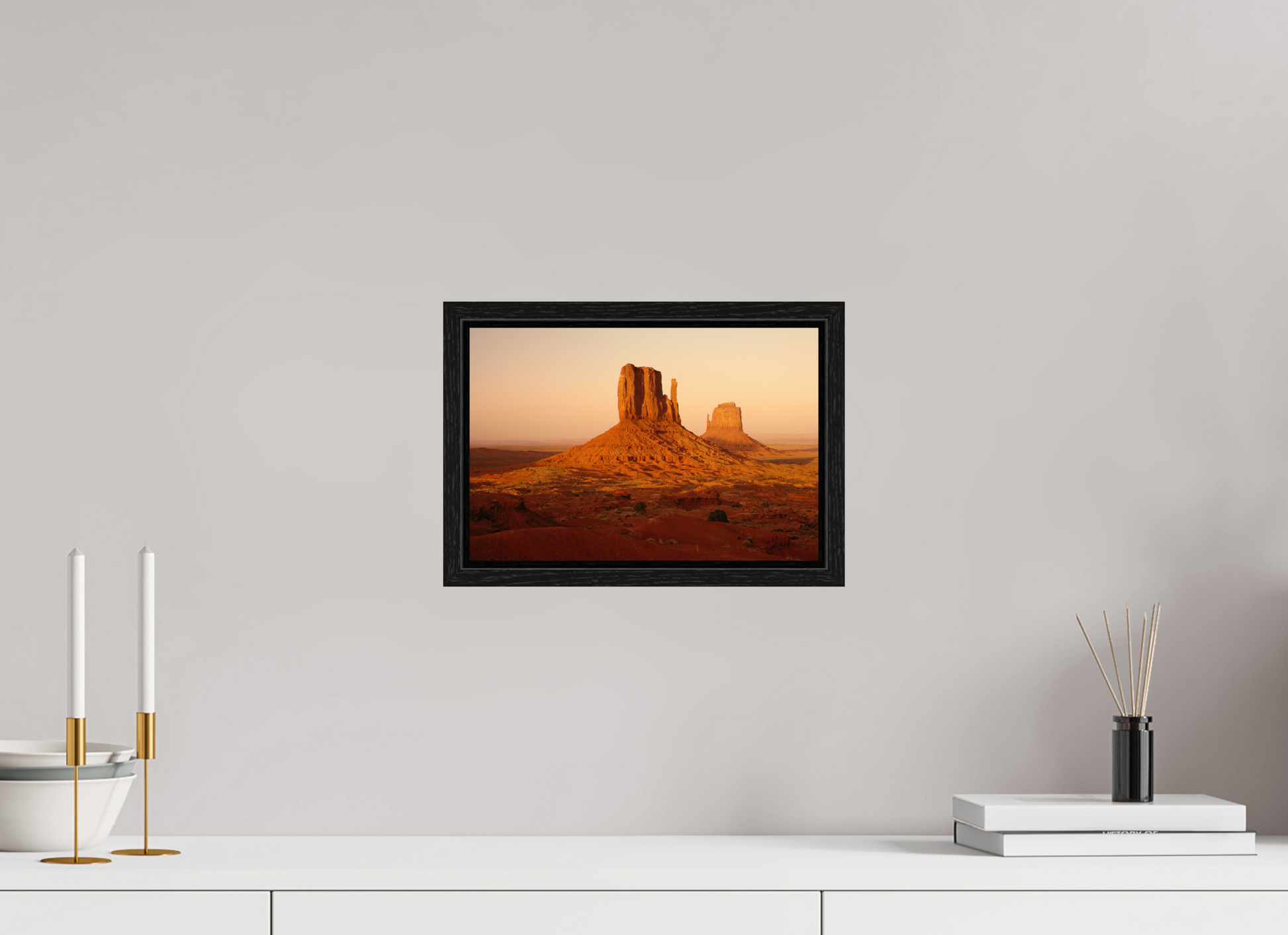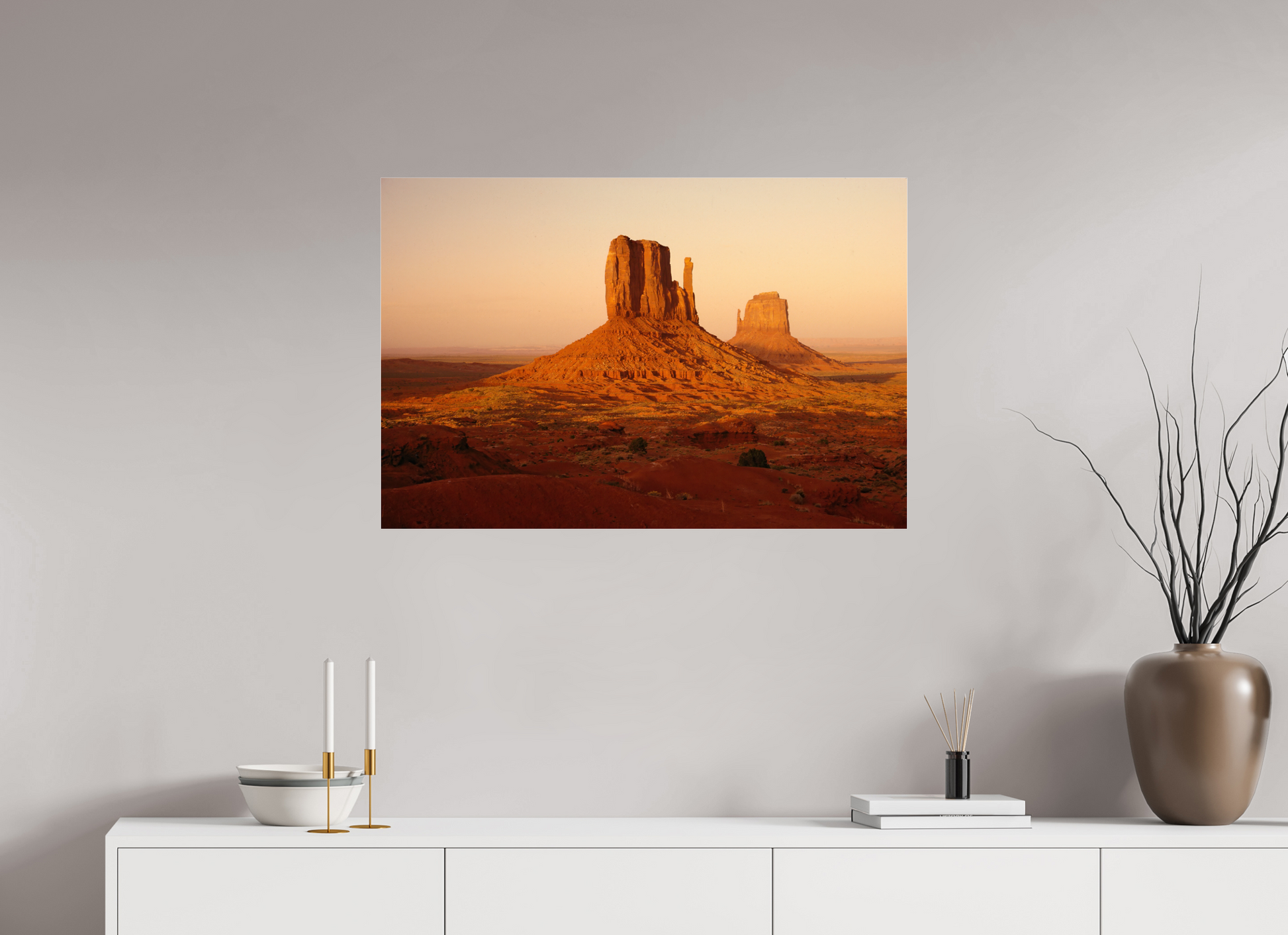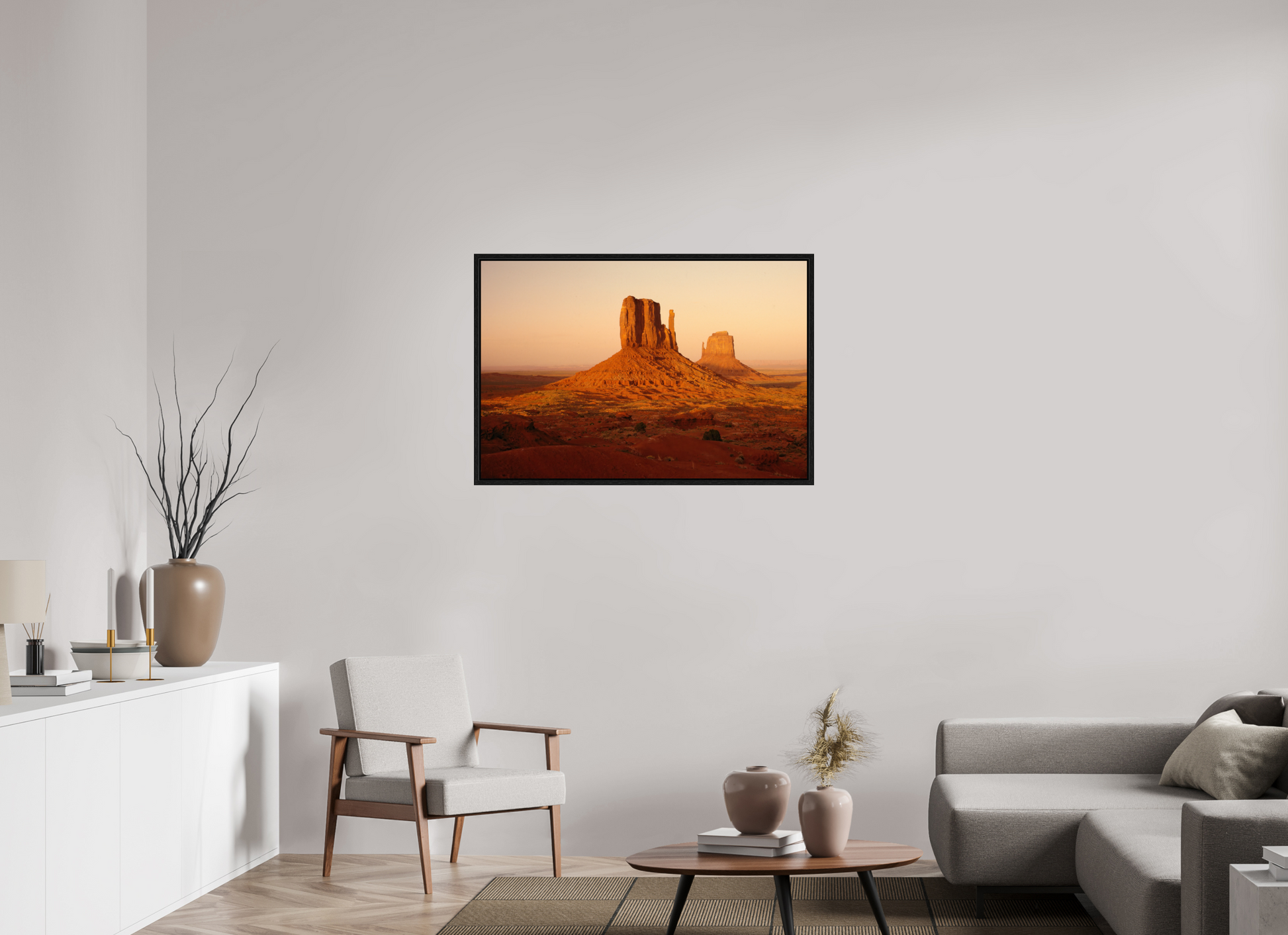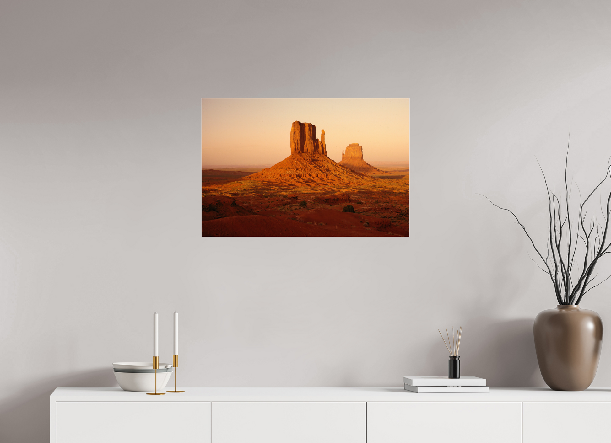 Monumental rock formations rise from the desert floor, their rugged silhouettes bathed in the warm glow of the setting sun, creating a scene of timeless beauty and solitude.