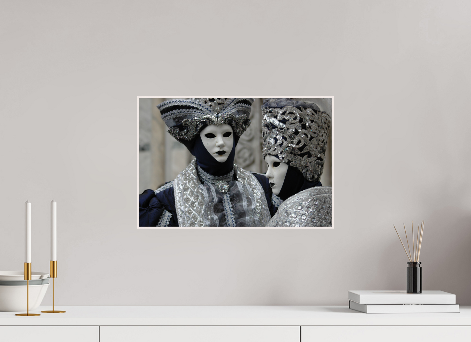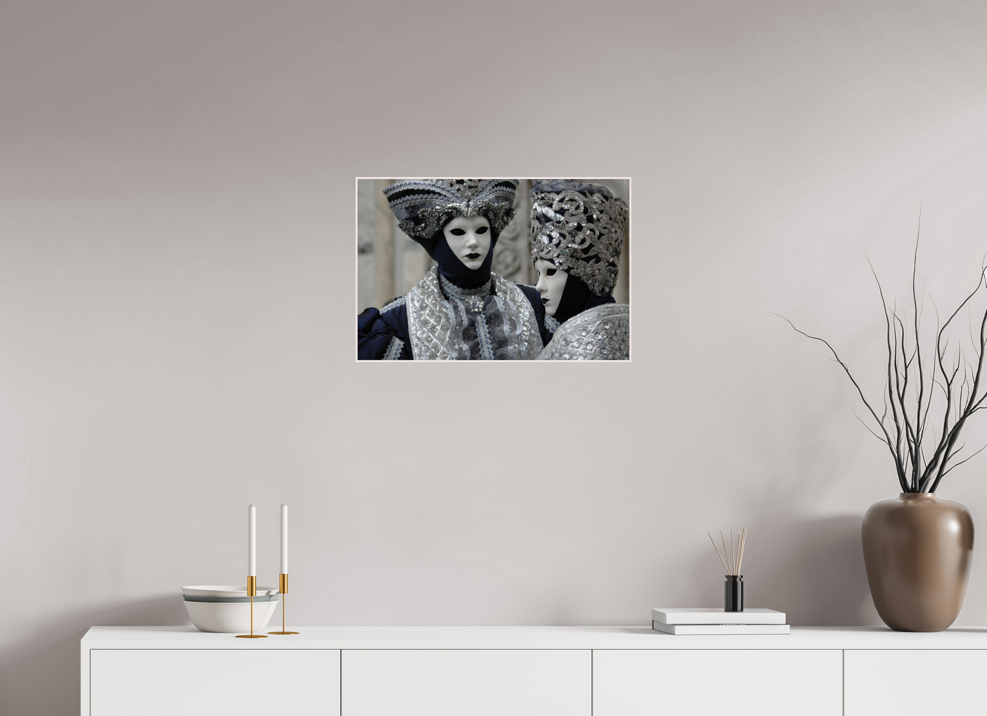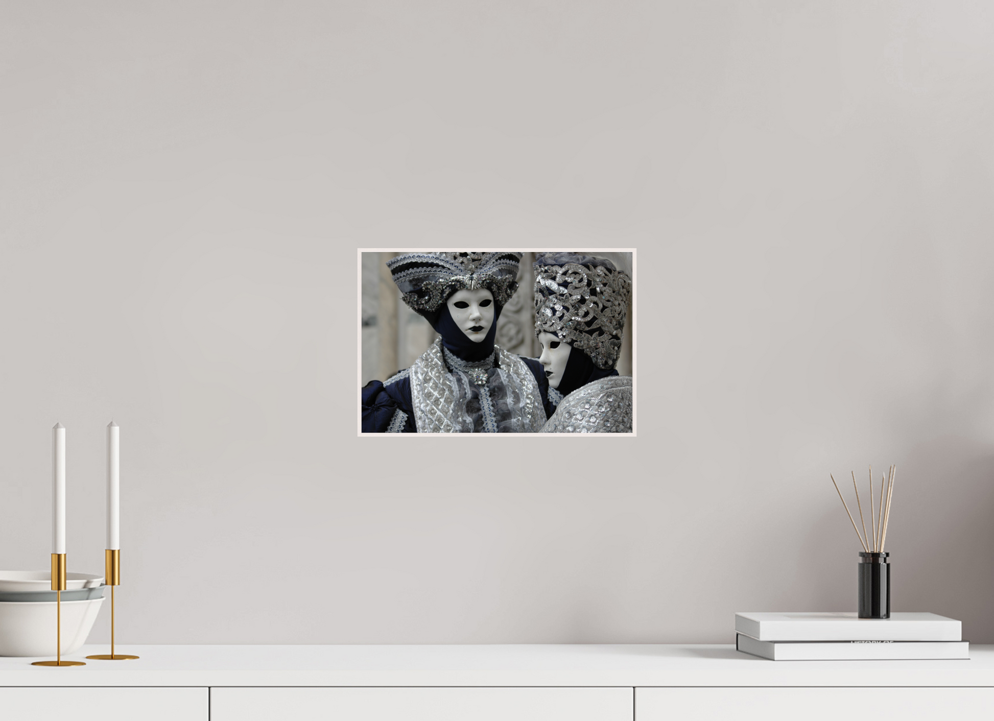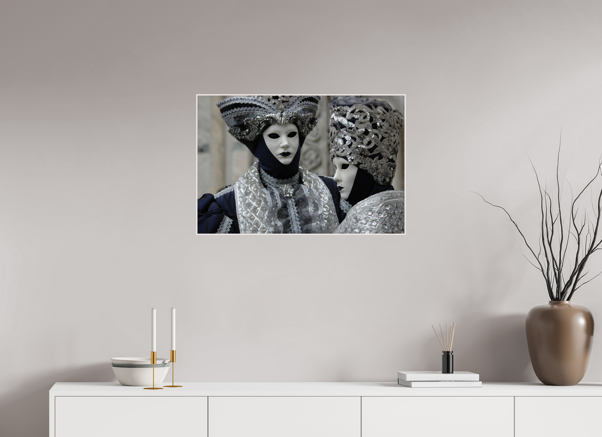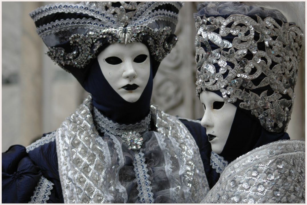 This image showcases a mask adorned with intricate silver detailing, exuding an air of mystique and elegance. The elaborate design of the mask, combined with the luxurious silver and black costume, captures the essence of Venetian opulence. The craftsmanship reflects the rich history and artistic heritage of the Venice Carnival, where masks serve as a symbol of anonymity and freedom.