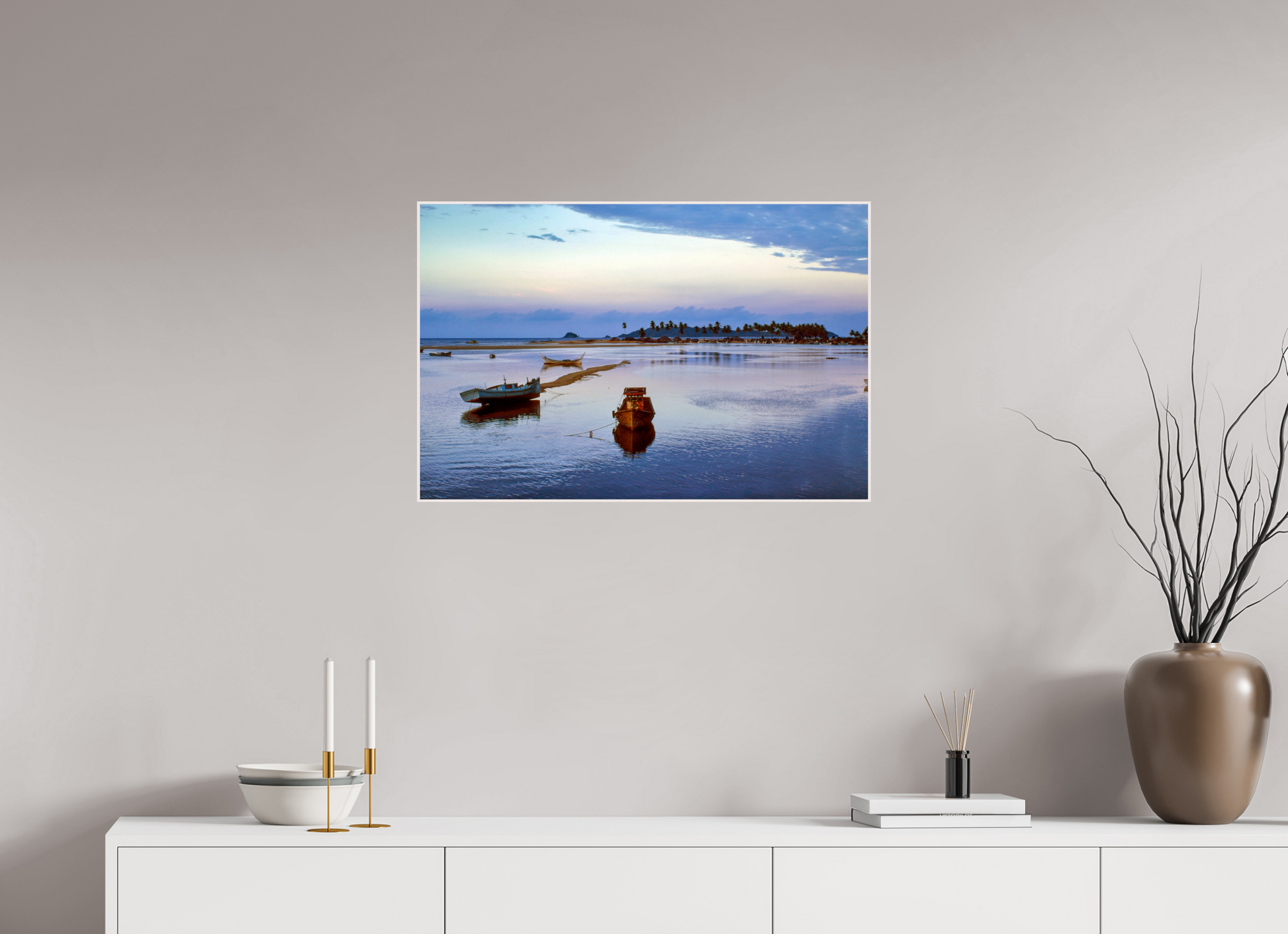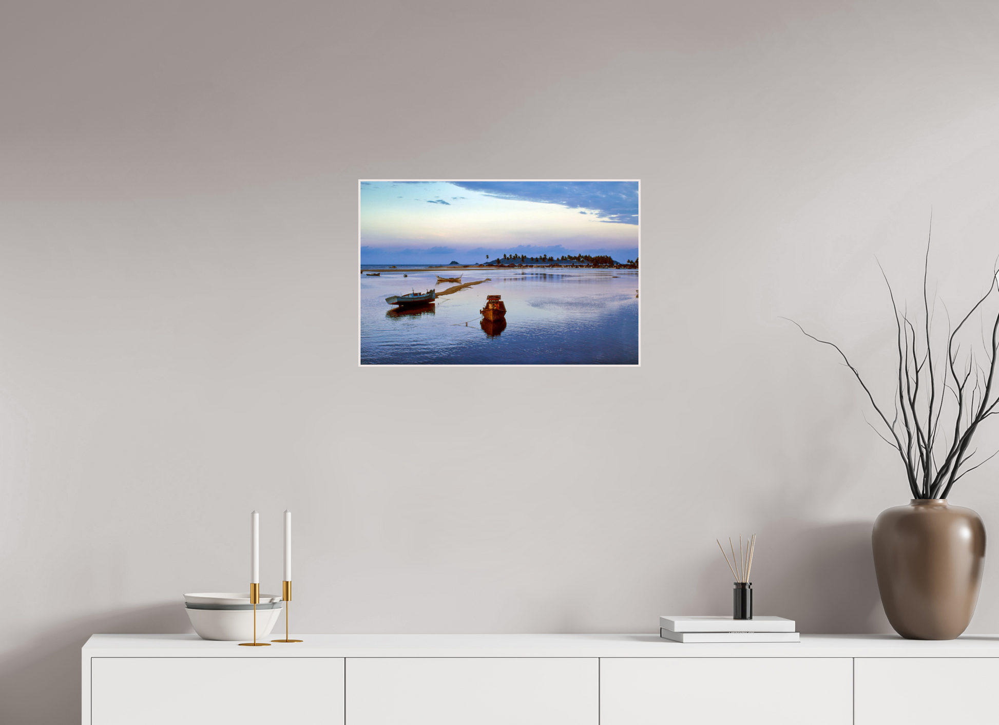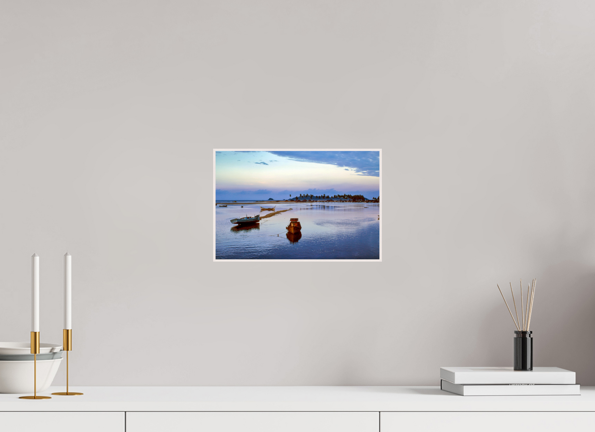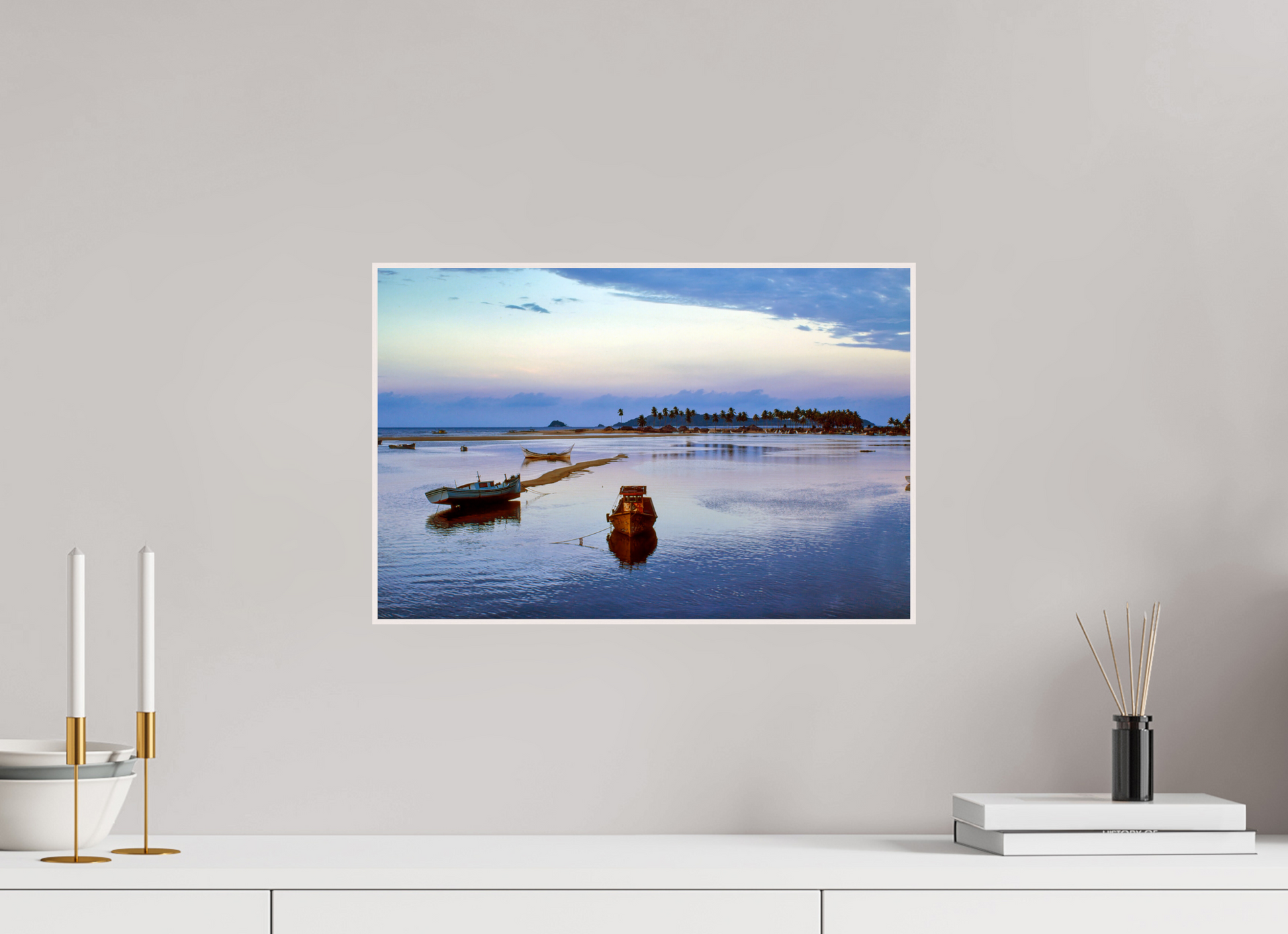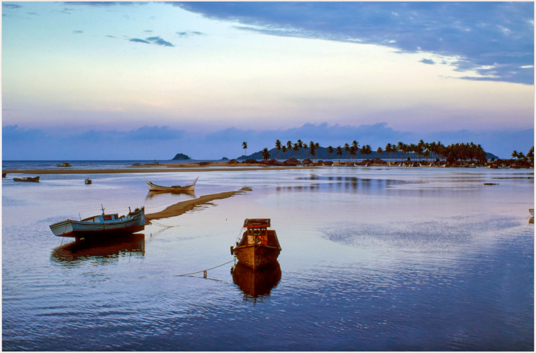 Boats rest peacefully on the calm waters as the sun sets, painting the sky with hues of pink and blue, creating a serene and romantic atmosphere.