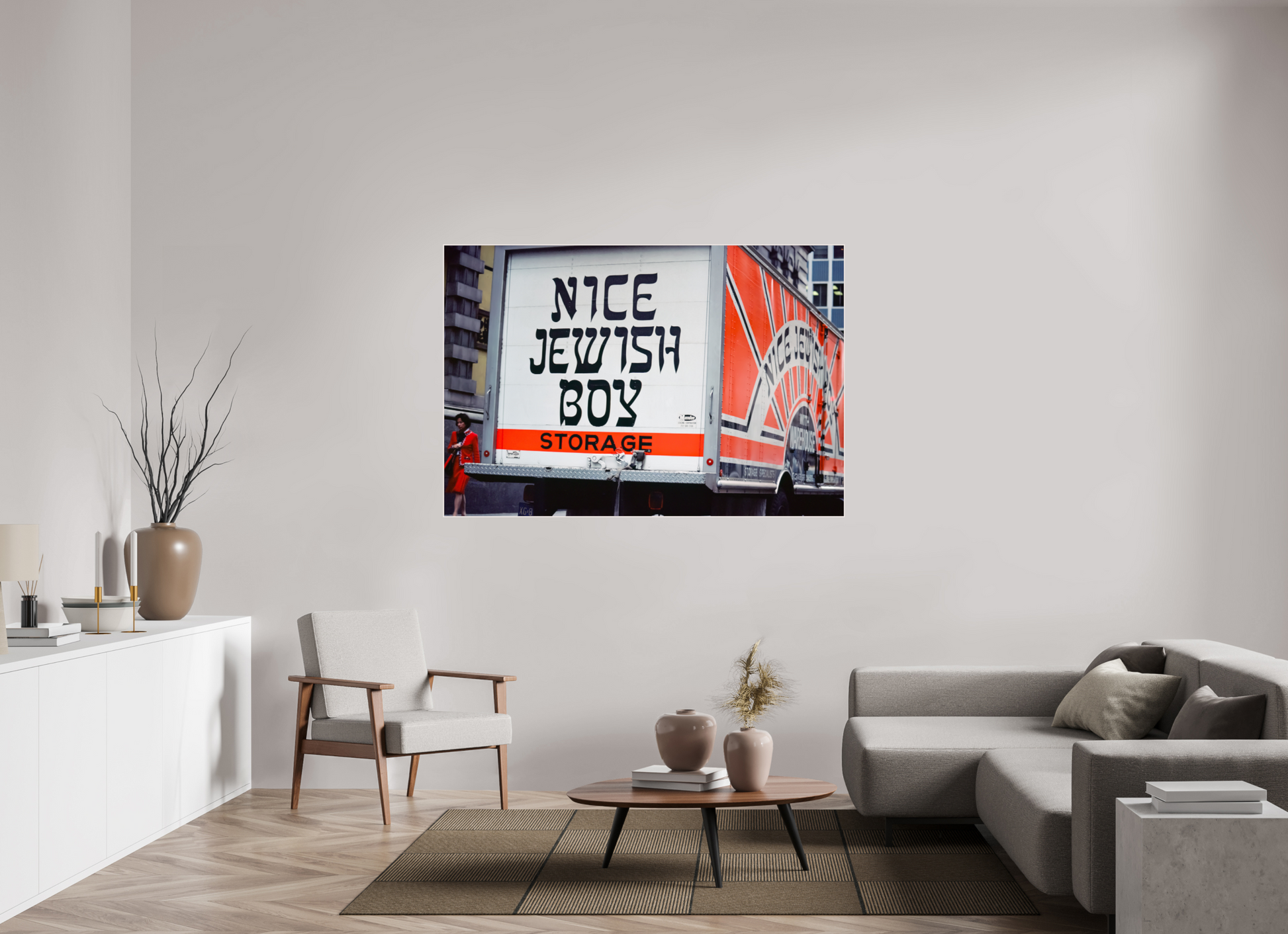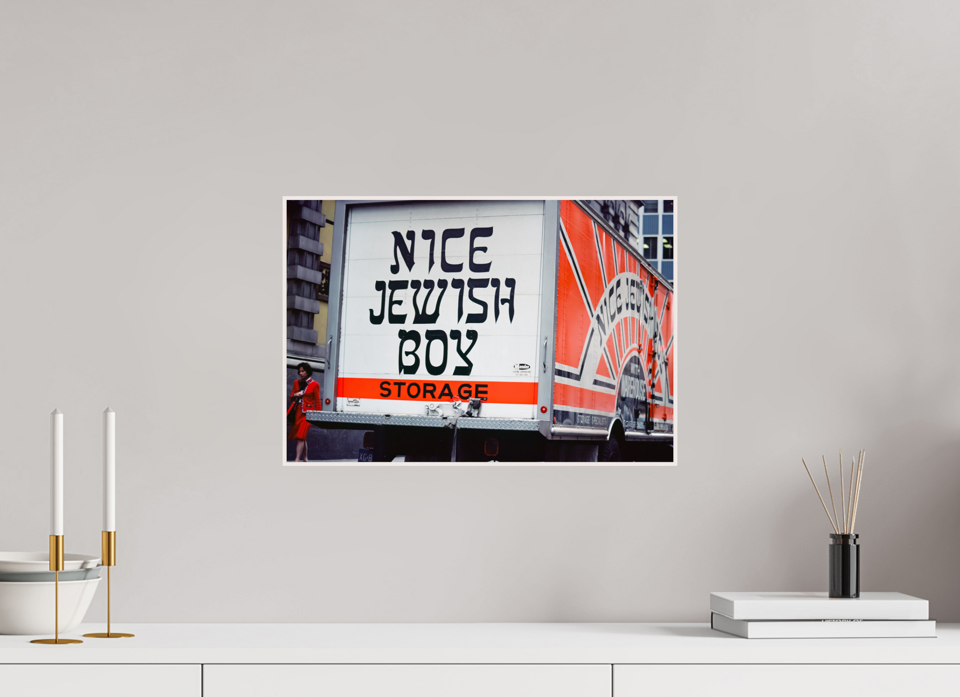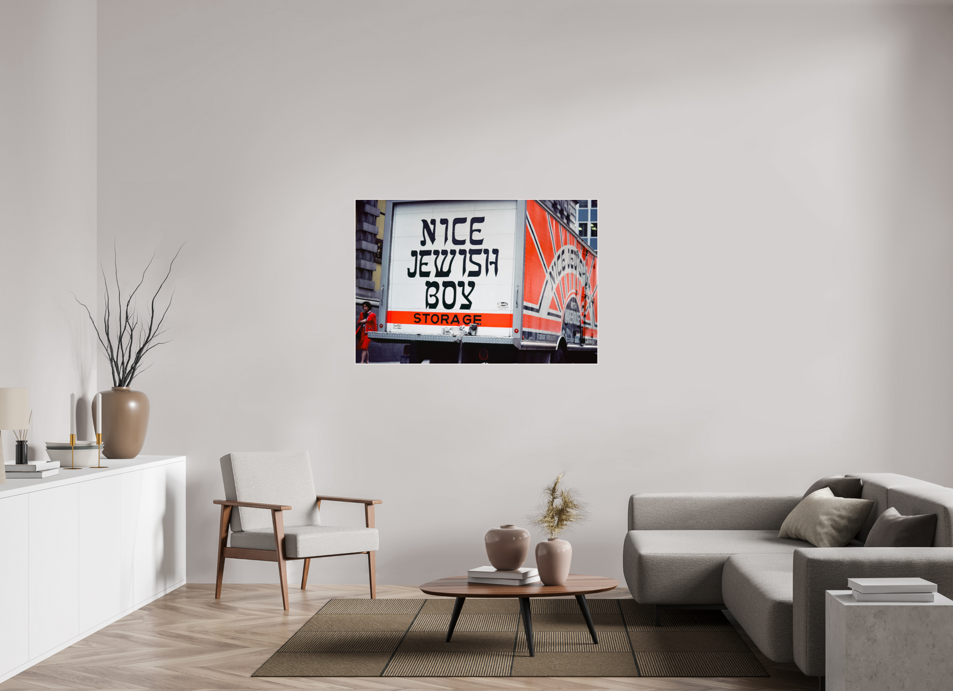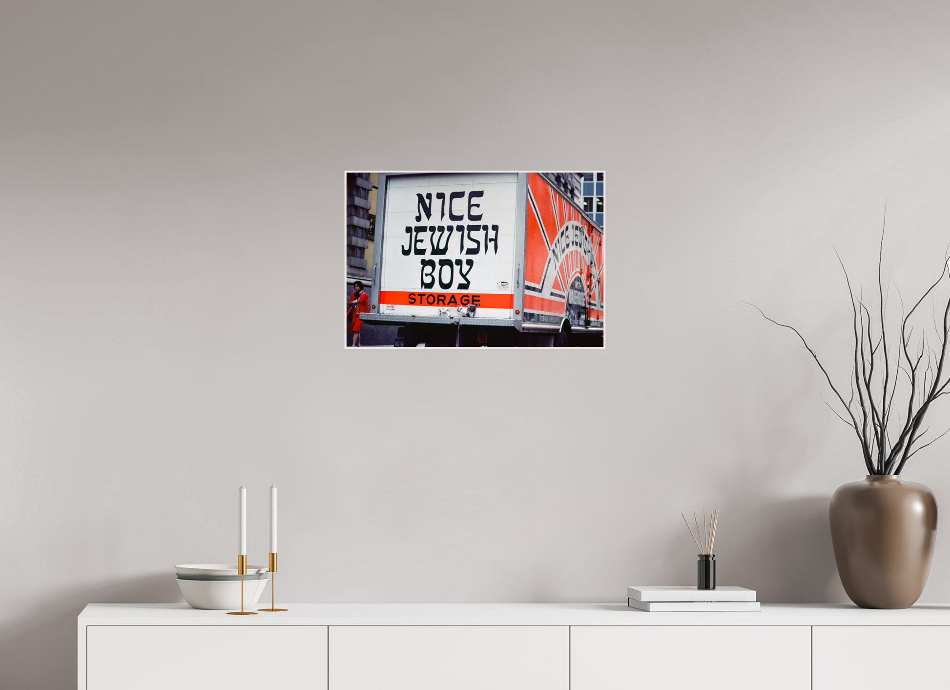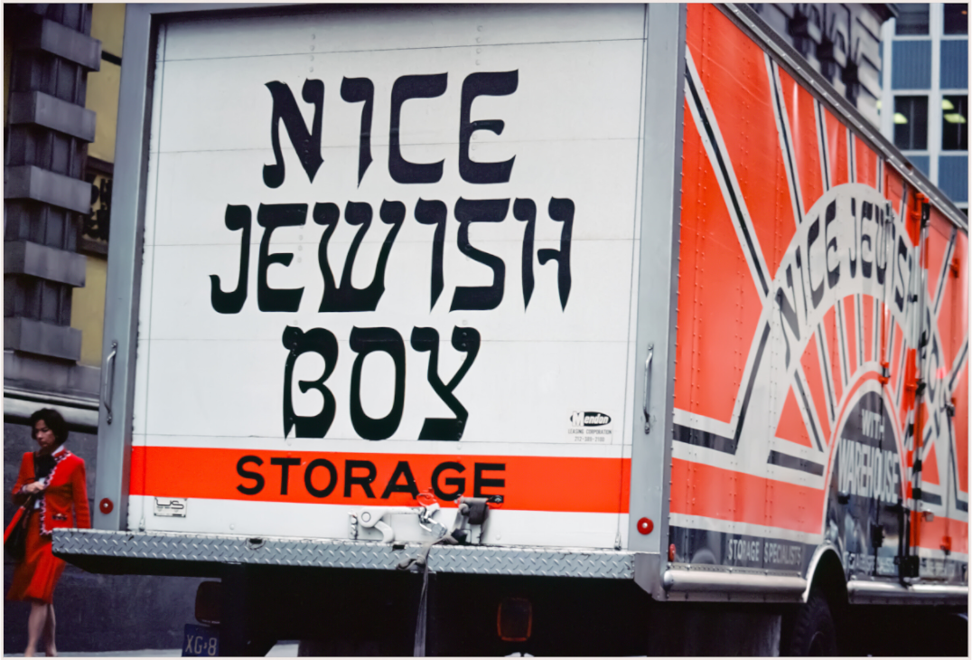 A bold statement on a storage truck captures the essence of urban humor and street life. The text is written in bold, black letters on a white background, with the word "STORAGE" in orange. The phrase "NICE JEWISH BOY" is a playful and humorous statement.