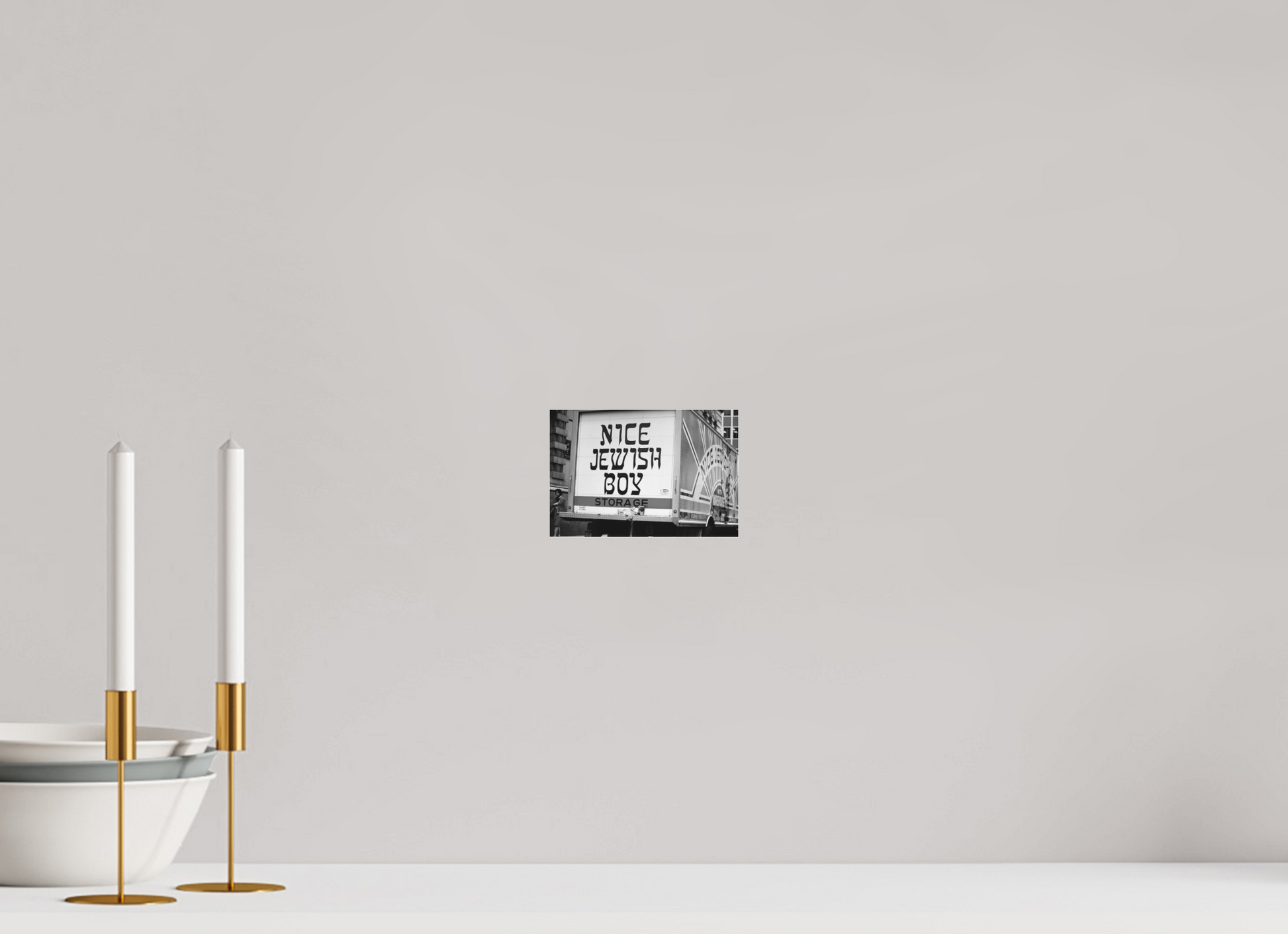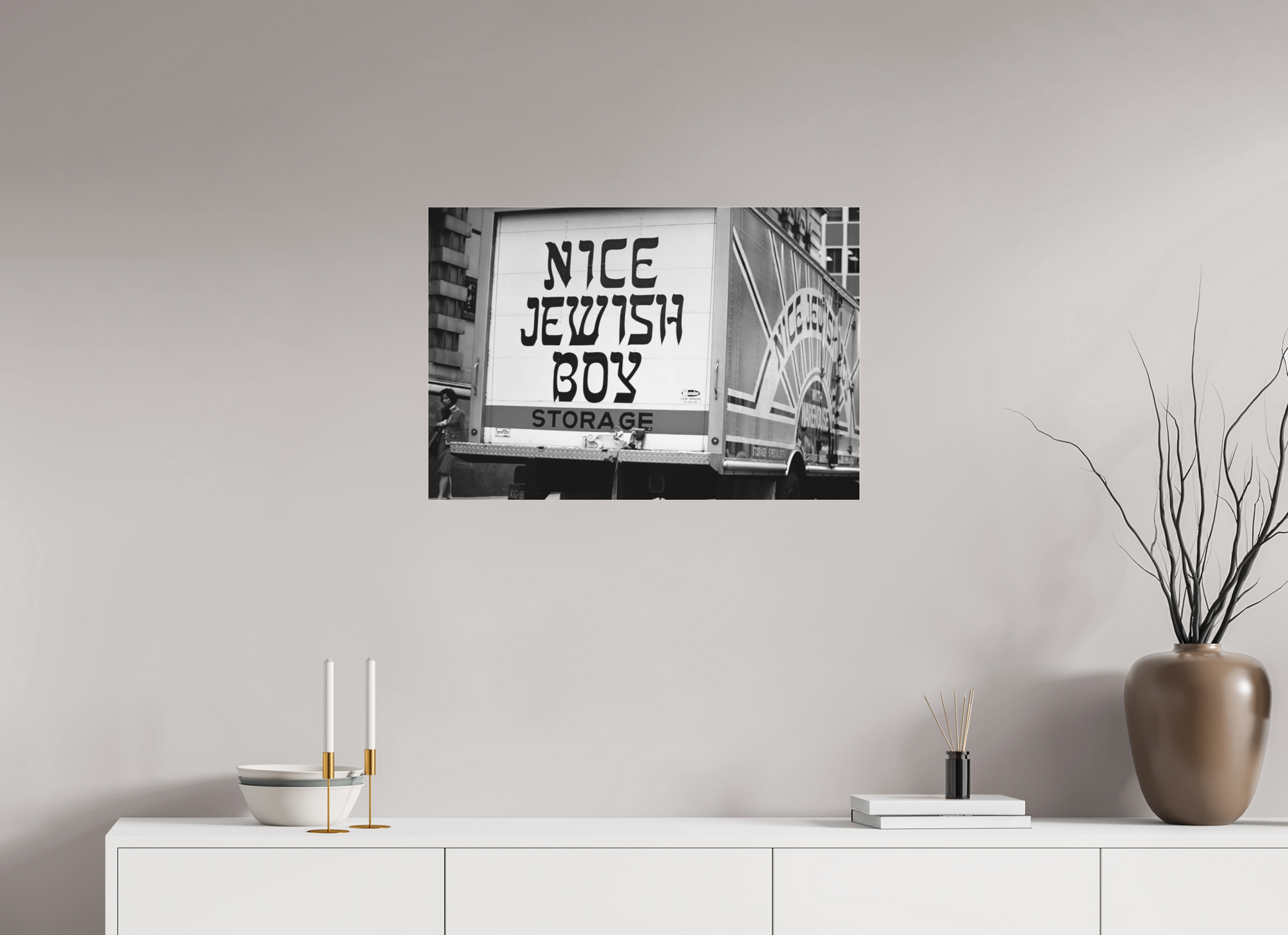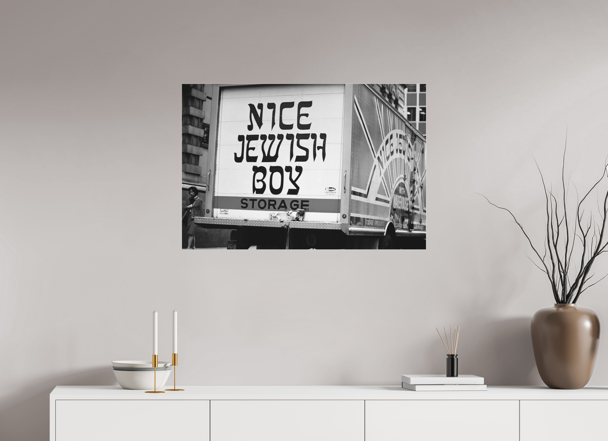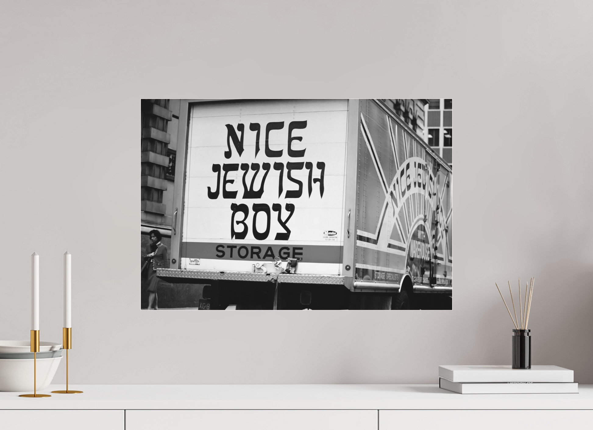 A bold statement on a storage truck captures the essence of urban humor and street life. The text is written in bold, black letters on a white background, with the word "STORAGE" in orange. The phrase "NICE JEWISH BOY" is a playful and humorous statement.