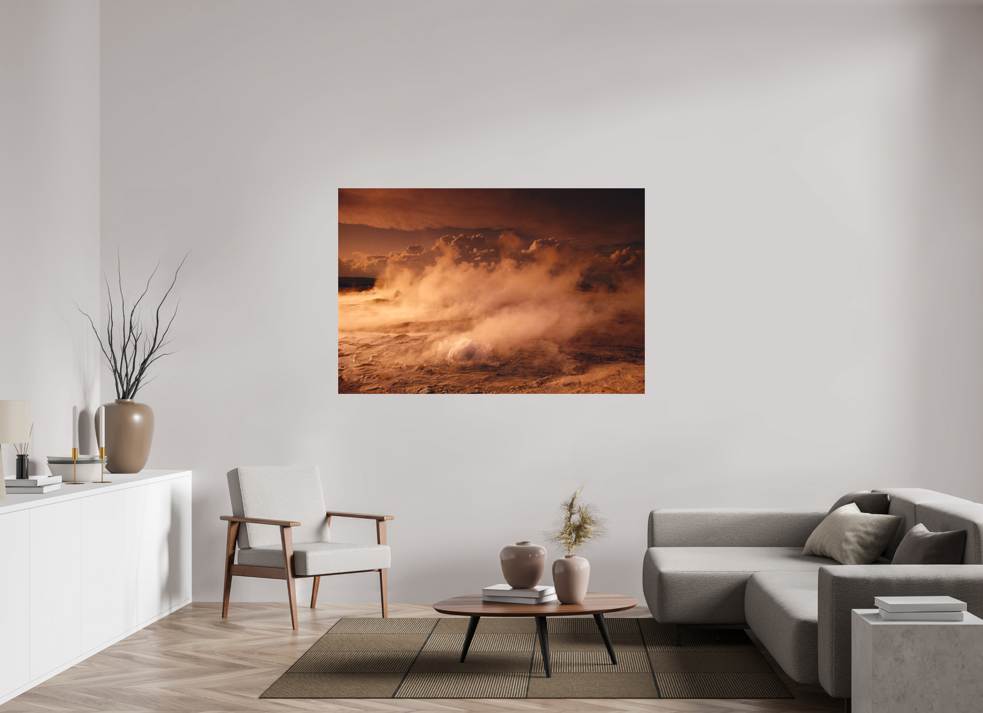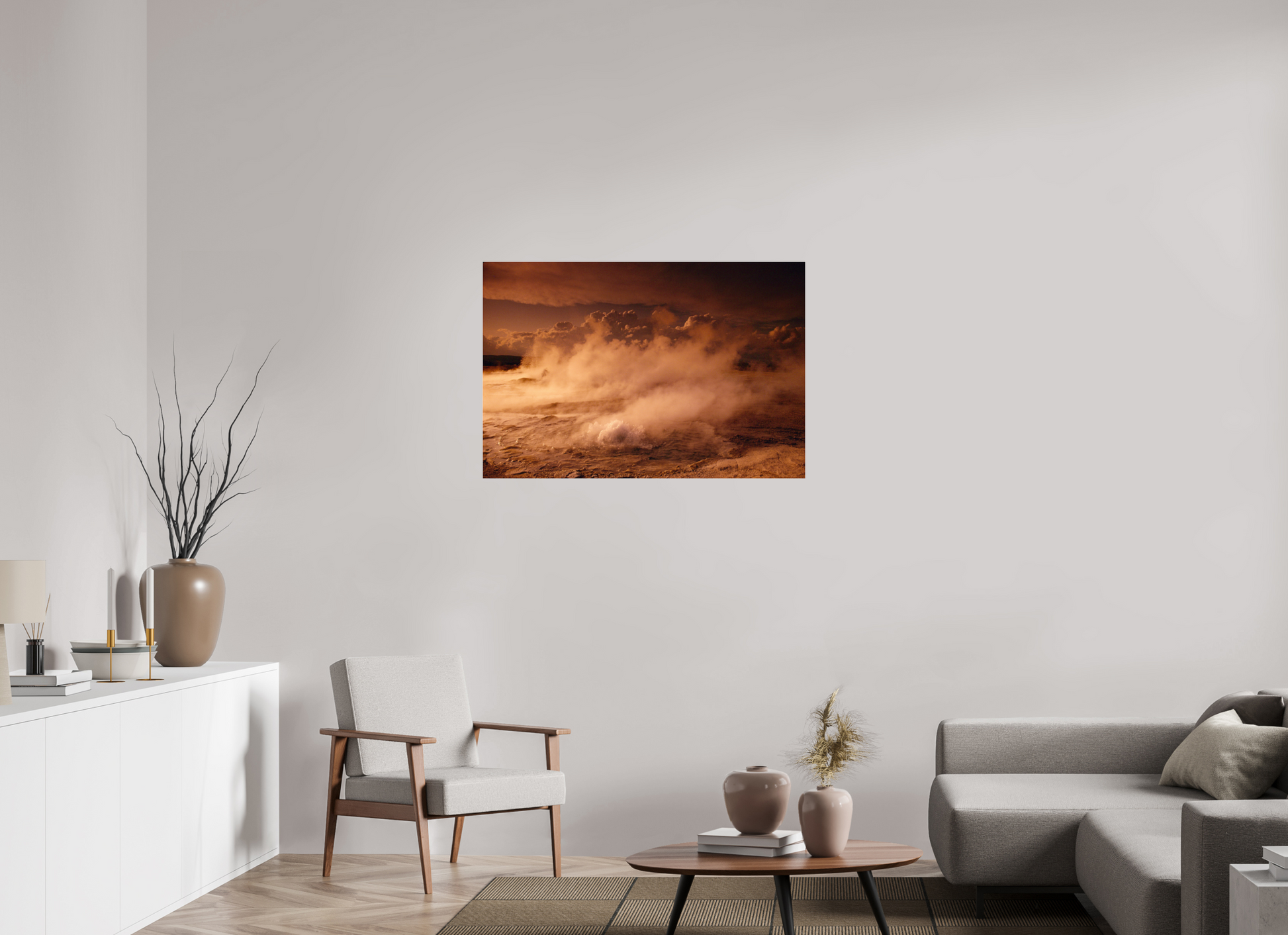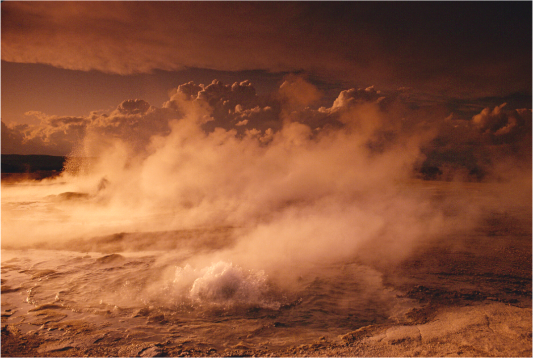 Steam rises from the earth, painting the landscape in a warm, golden haze, creating a dreamy and romantic atmosphere that invites you to lose yourself in nature's mystical embrace.