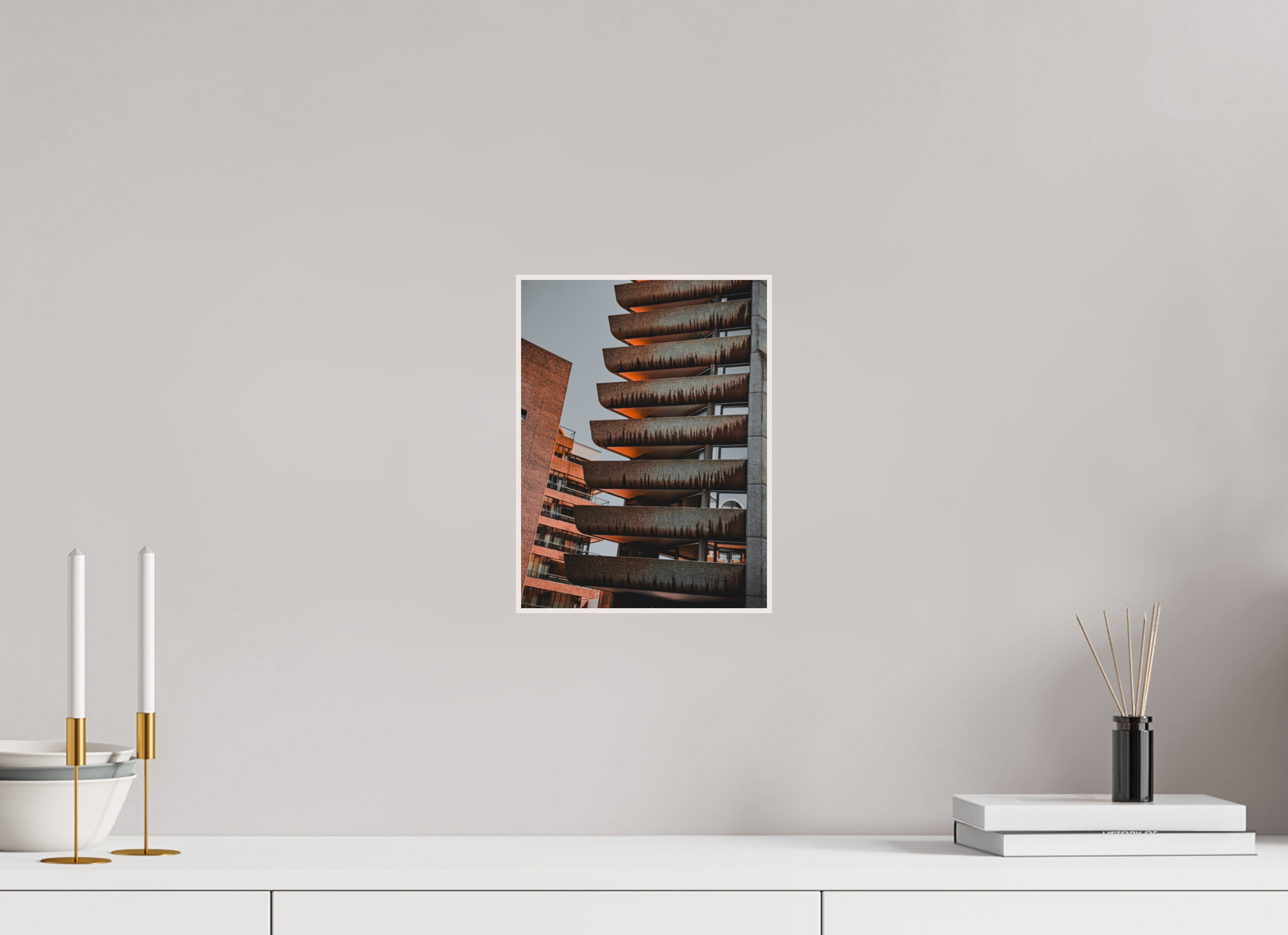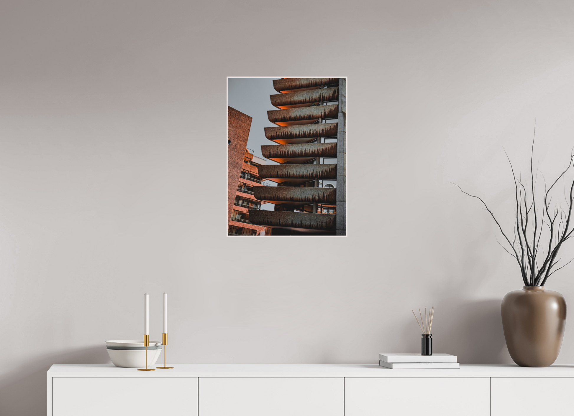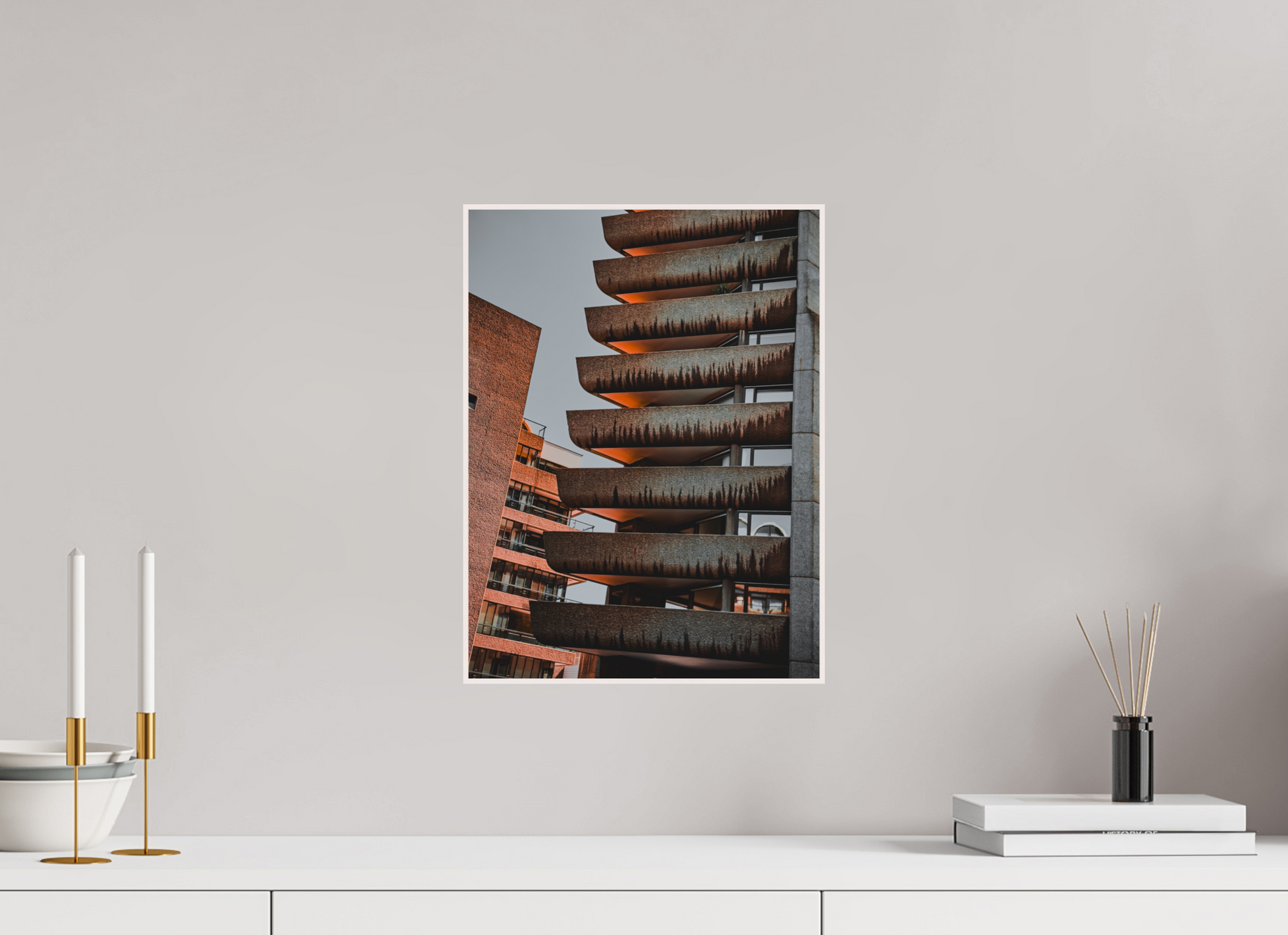 This striking image showcases the layered balconies and repetitive modular forms of the Barbican Estate. The warm light of the setting sun illuminates the concrete structures, creating a sense of depth and dimension. The interplay of light and shadow accentuates the textures and details of the Brutalist design.