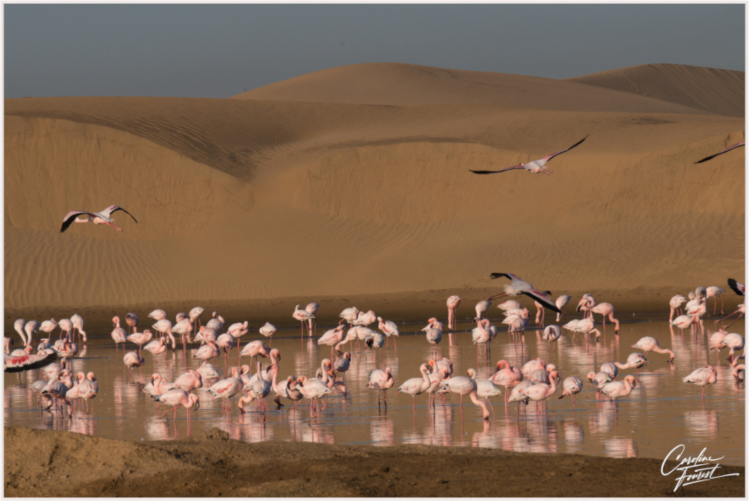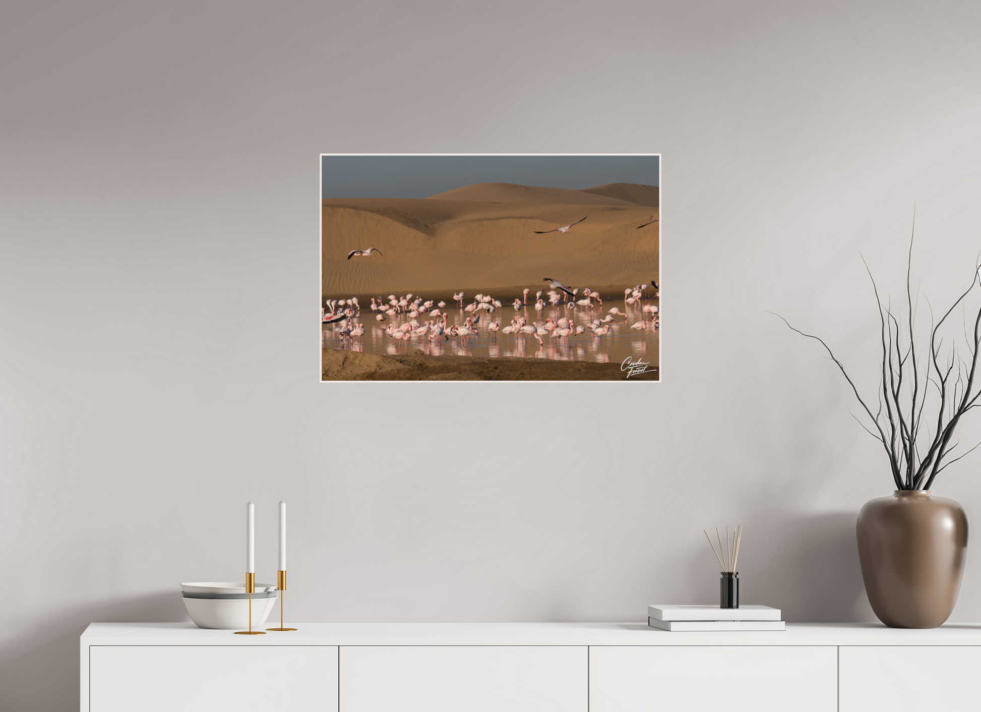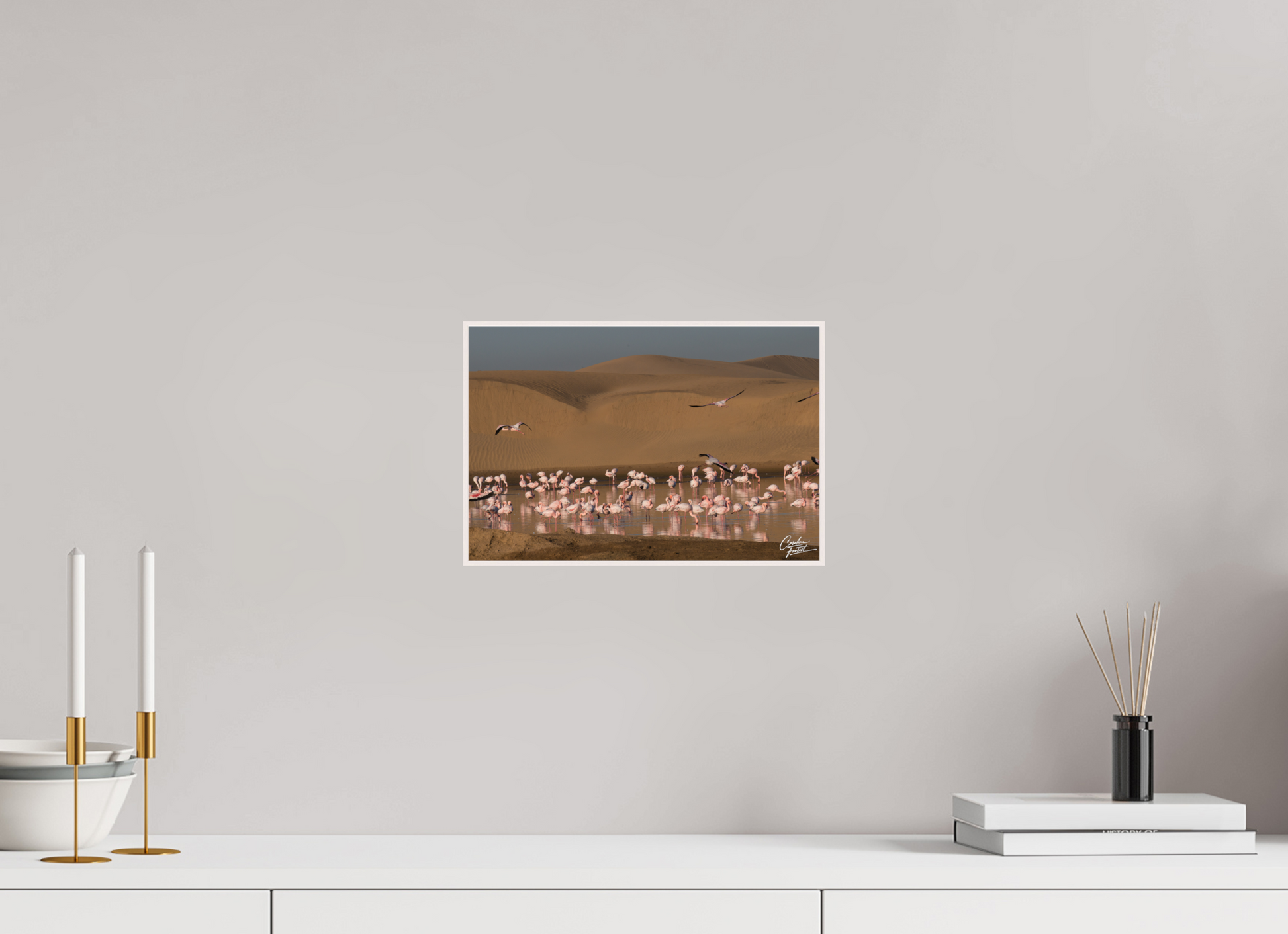 Flamingos gather by the water's edge, their reflections shimmering in the still waters, creating a serene and romantic tableau that whispers the secrets of the wetlands.