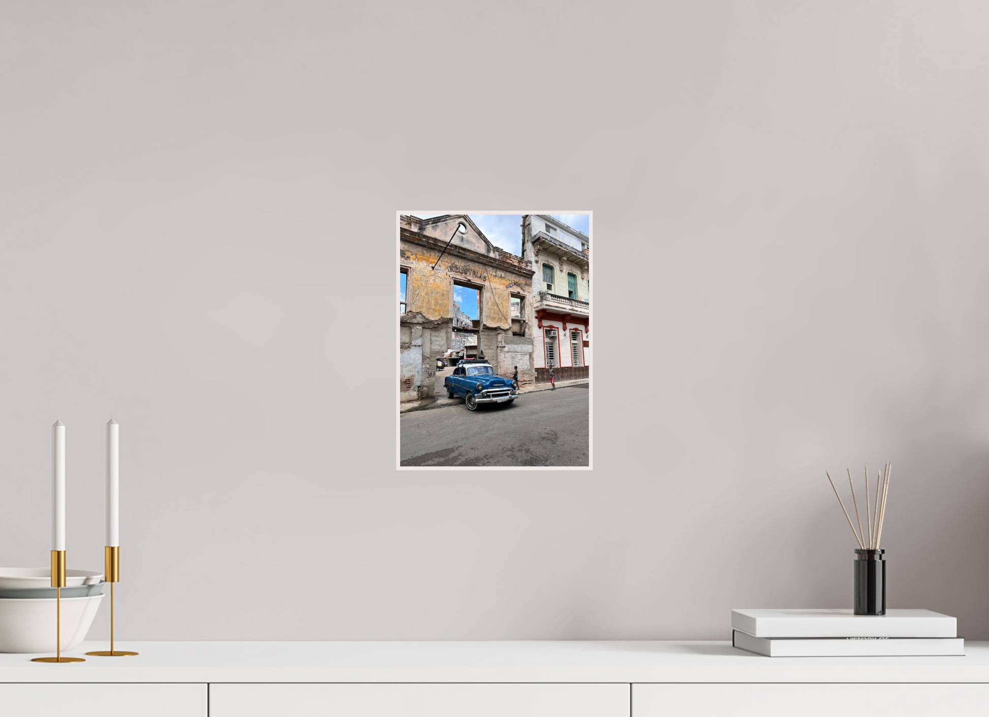 A classic blue car rests on the worn streets of Havana, its vibrant color contrasting with the faded pastel hues of the crumbling buildings. The peeling paint and weathered facades of the architecture tell stories of a rich history and cultural depth. The soft light of the day enhances the textures and details of the scene, casting gentle shadows that add depth and character. This image captures the essence of Havana's timeless beauty, where history and everyday life intertwine seamlessly. The car's sleek design and the rustic charm of the buildings evoke a sense of nostalgia and elegance.
