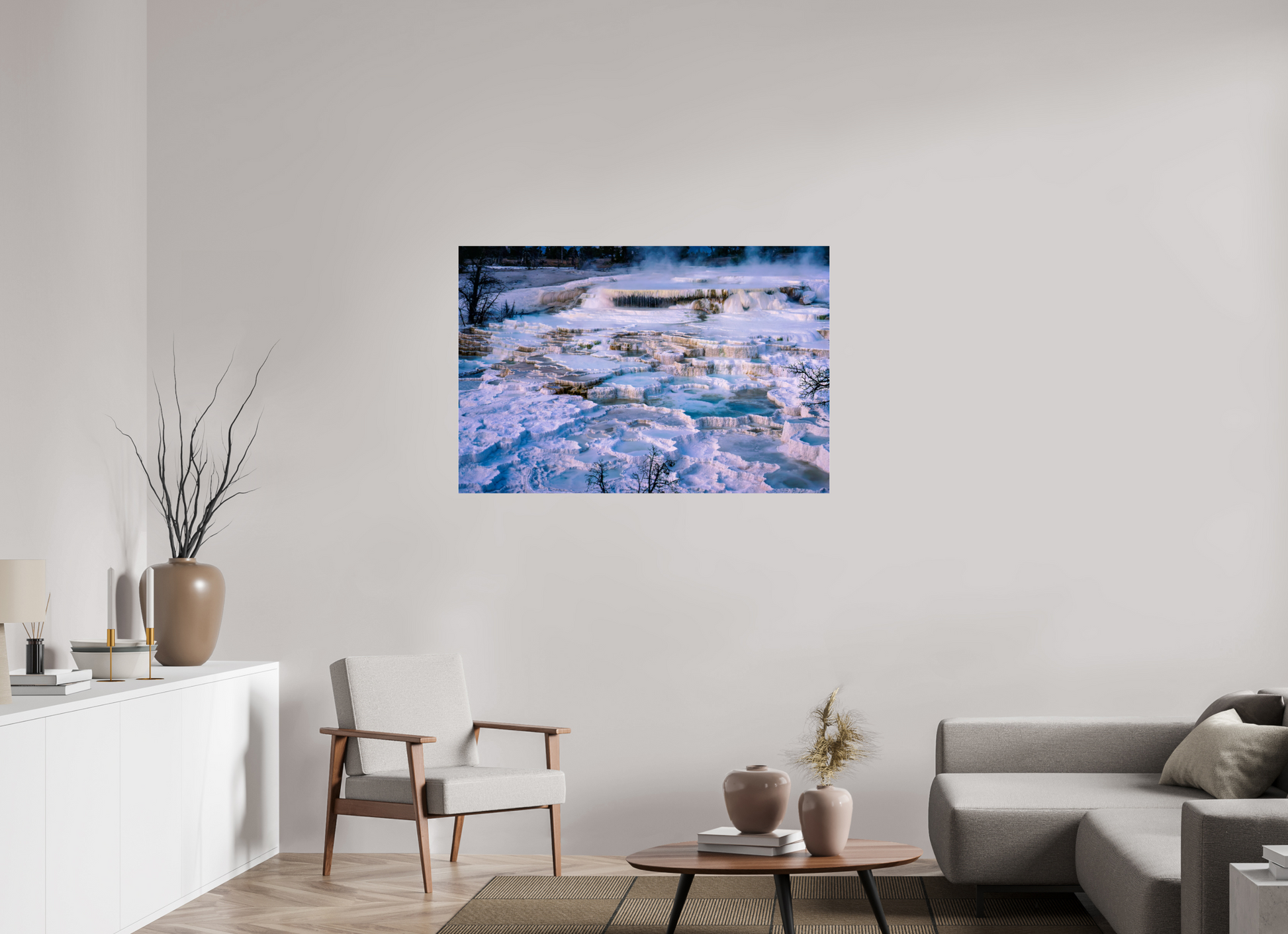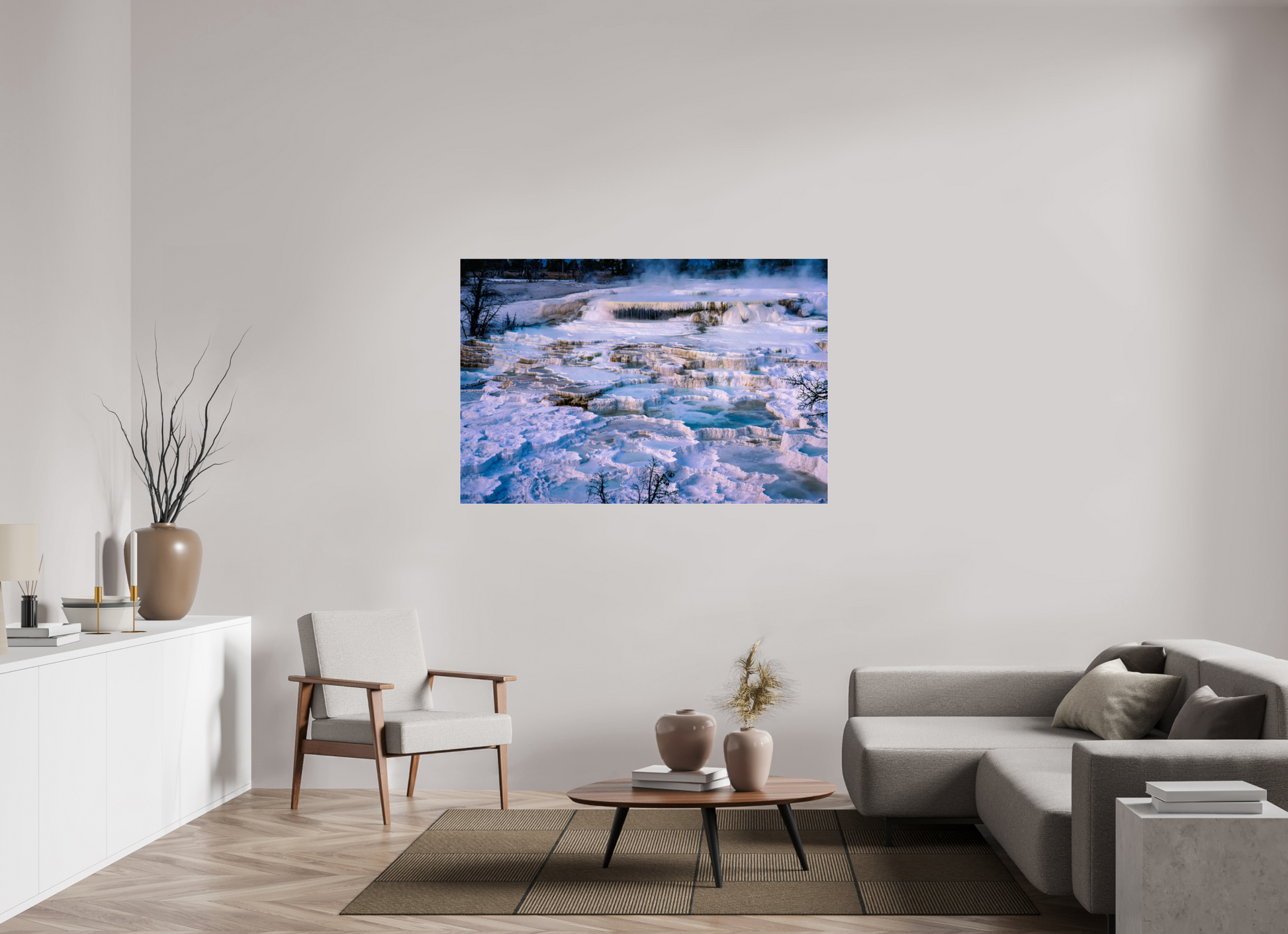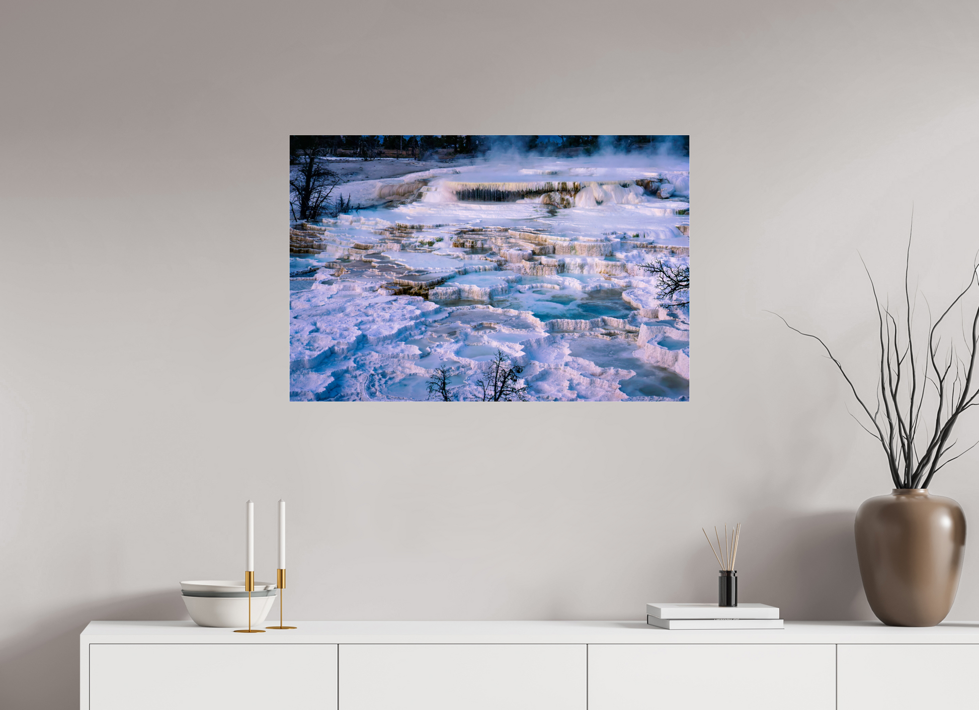 Icy terraces glisten under the winter sun, their frozen forms creating a symphony of texture and light in the serene landscape.