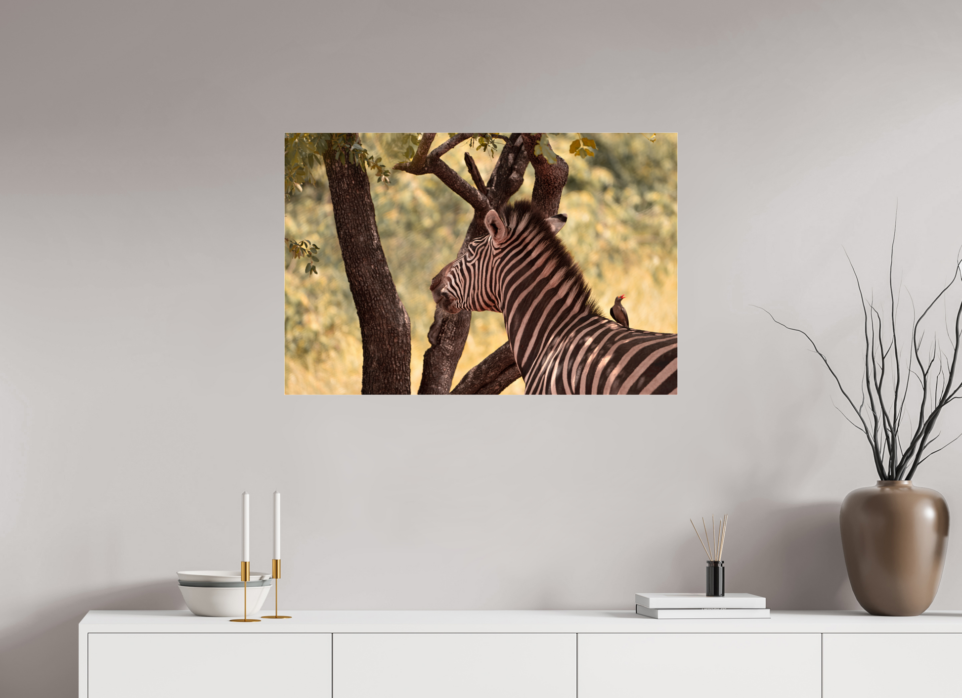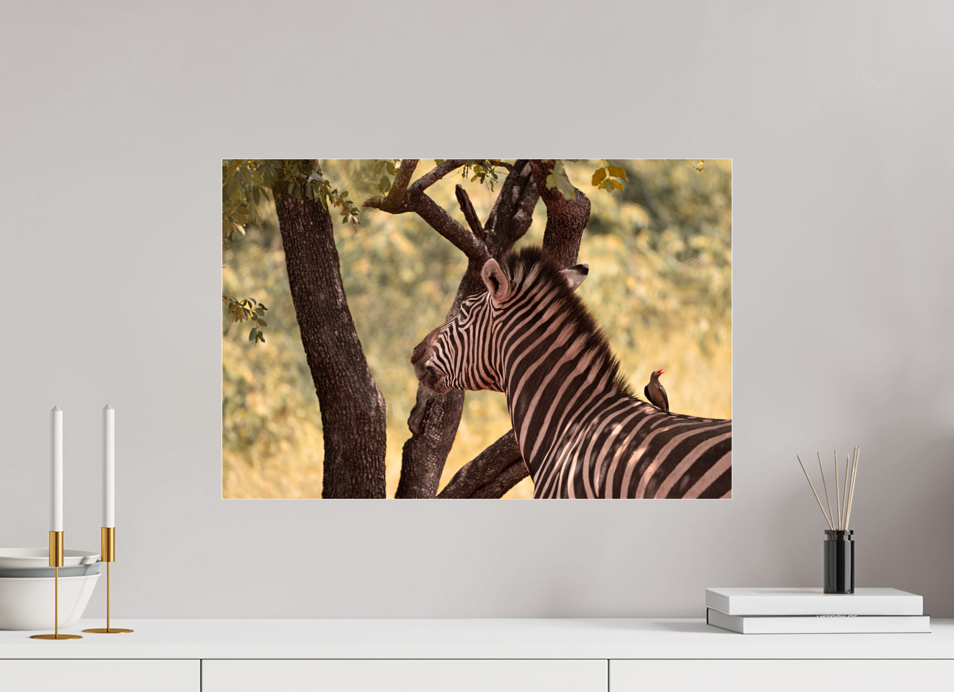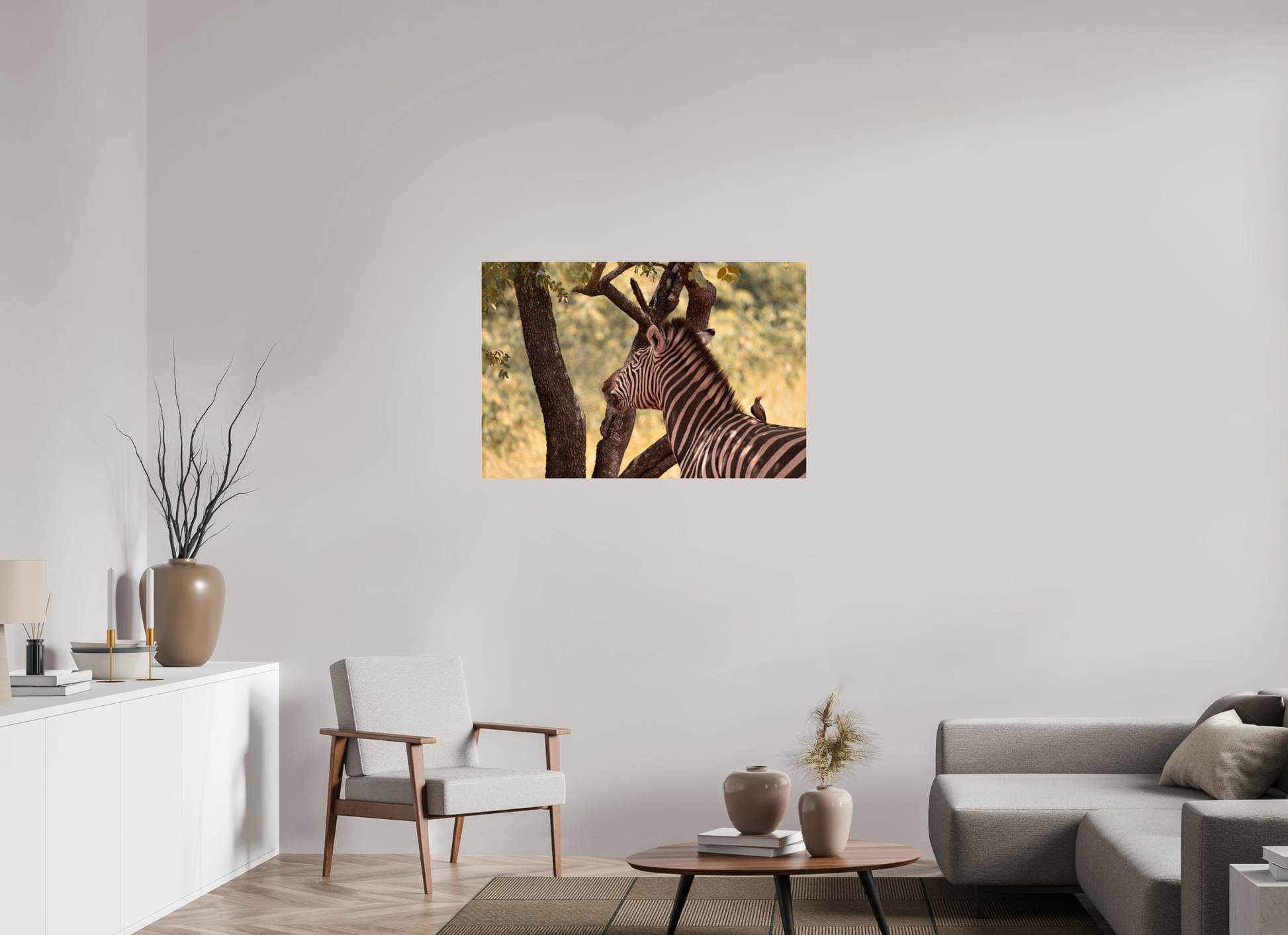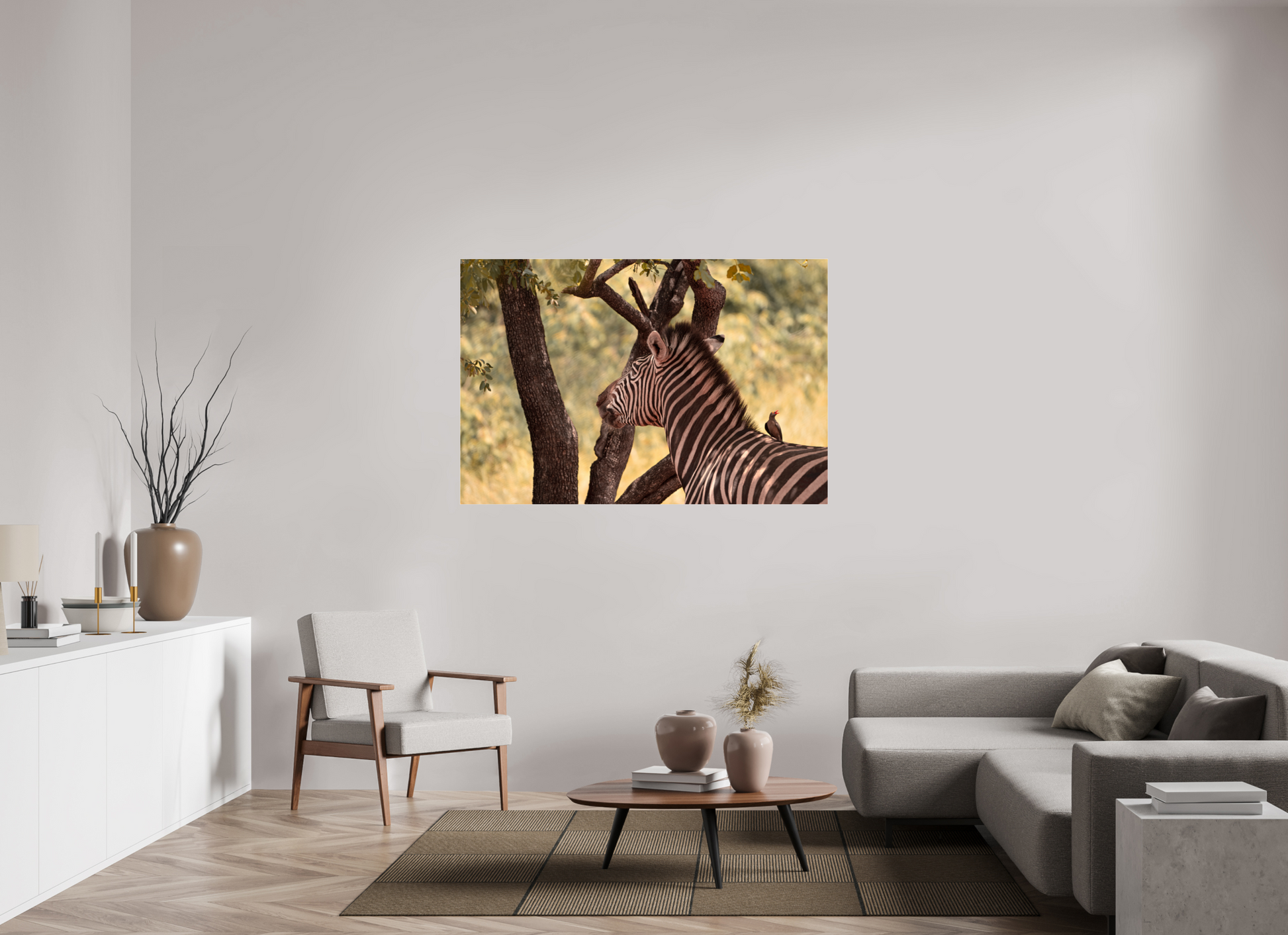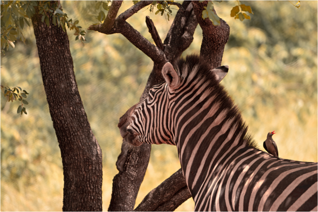 A zebra nibbles on the leaves of a tree, its elegant form framed by the lush greenery, embodying the gentle harmony between wildlife and their natural habitat.