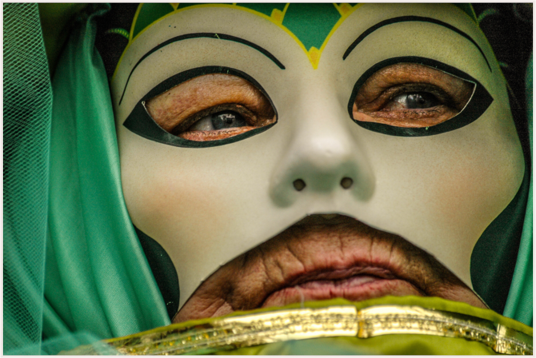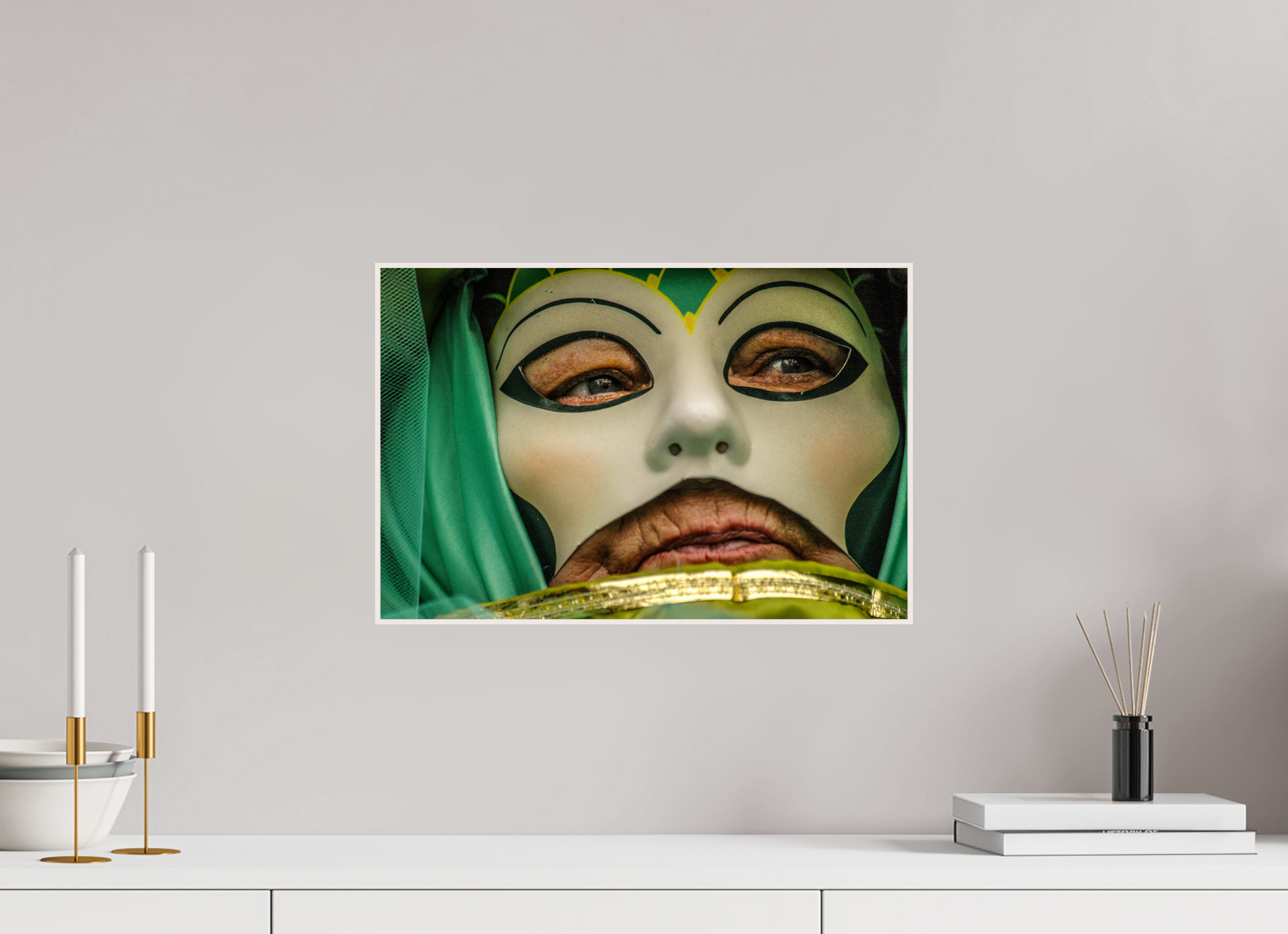 This mask, adorned with green and gold accents, exudes a whimsical and playful charm. The intricate details and vibrant colors reflect the joy and creativity of the Venice Carnival. The mask's design draws viewers into a world of fantasy and imagination, capturing the essence of this enchanting celebration.
