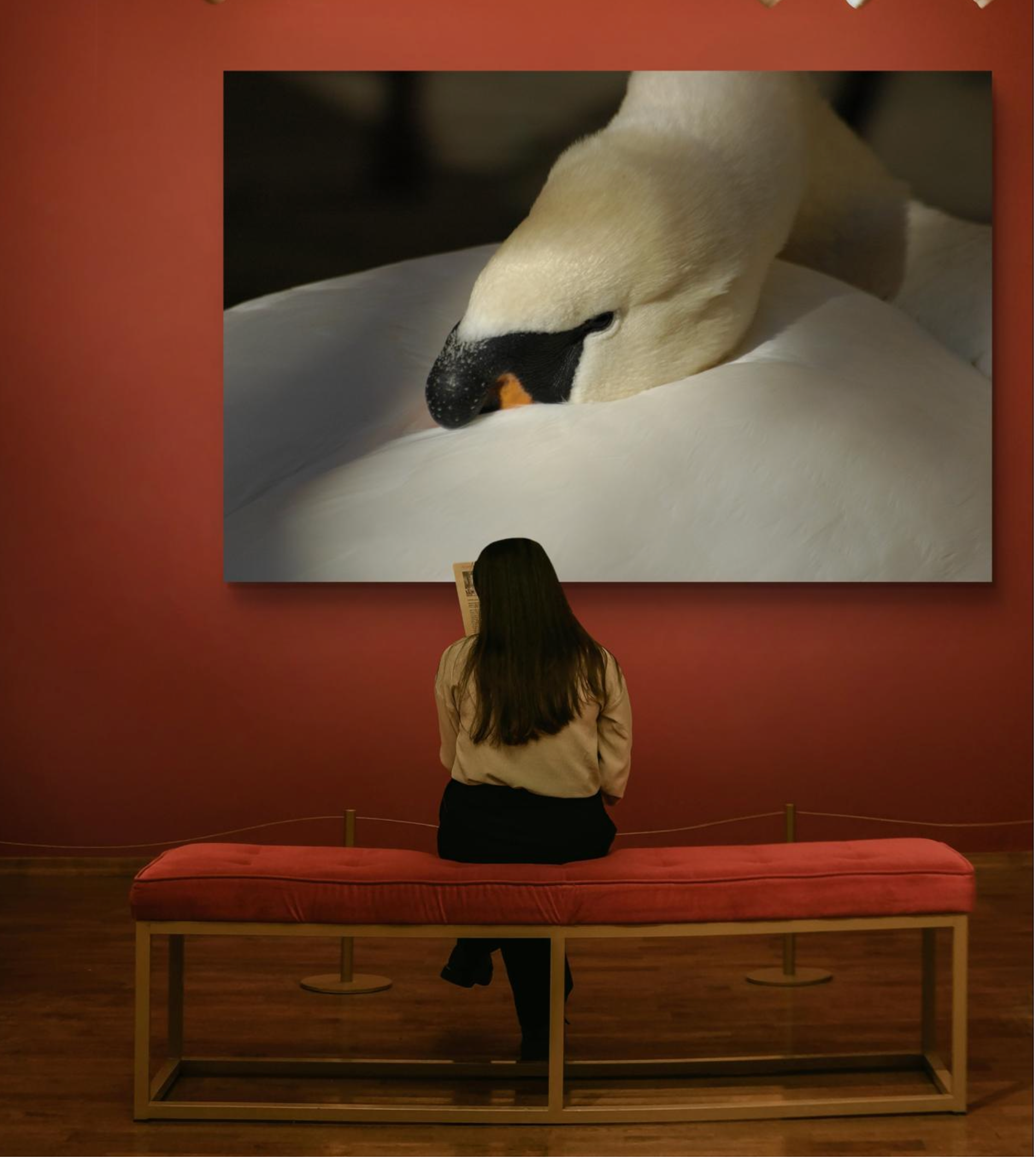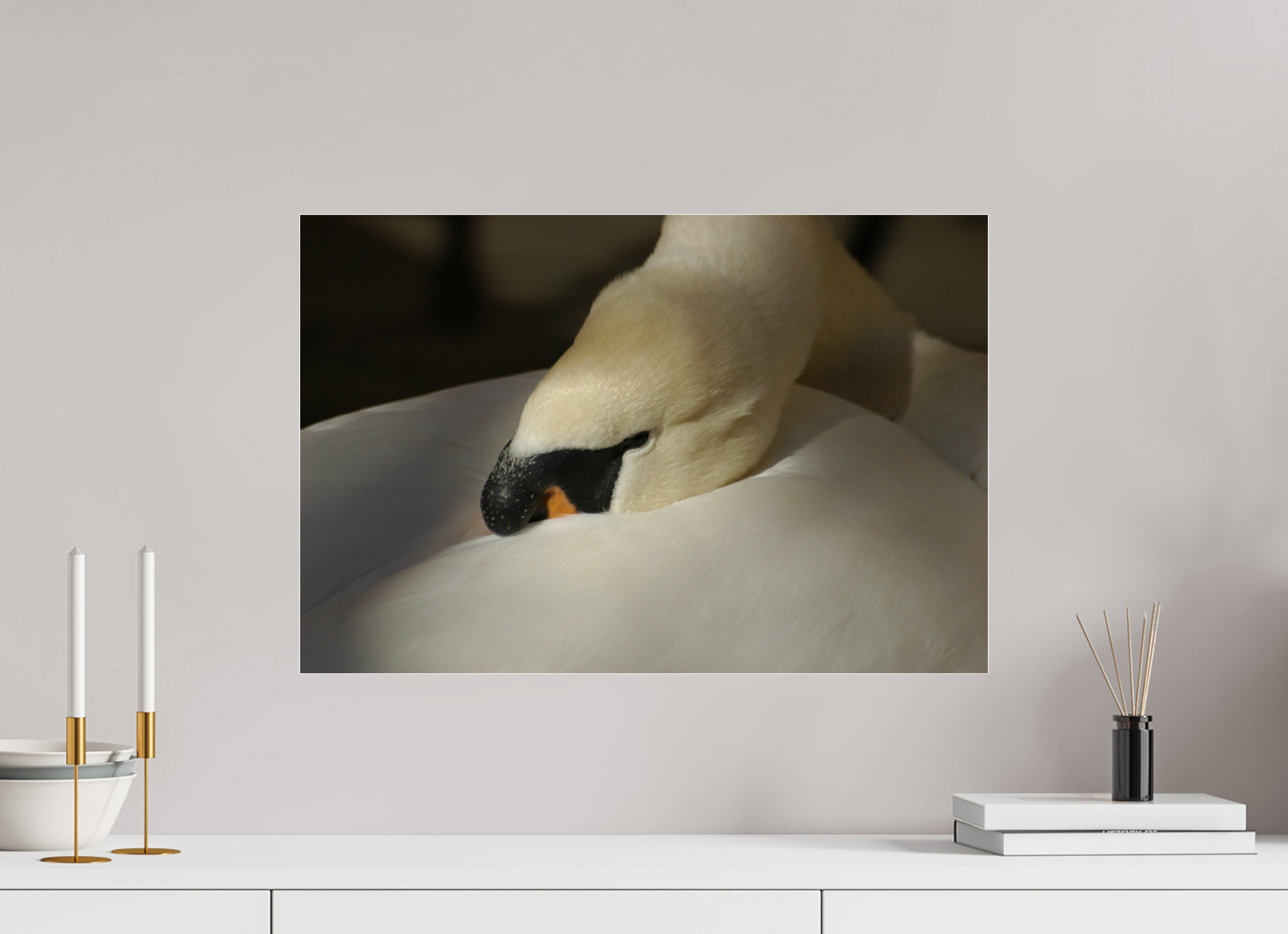A swan rests peacefully, its elegant form highlighted by soft light, capturing a moment of tranquility and natural beauty.