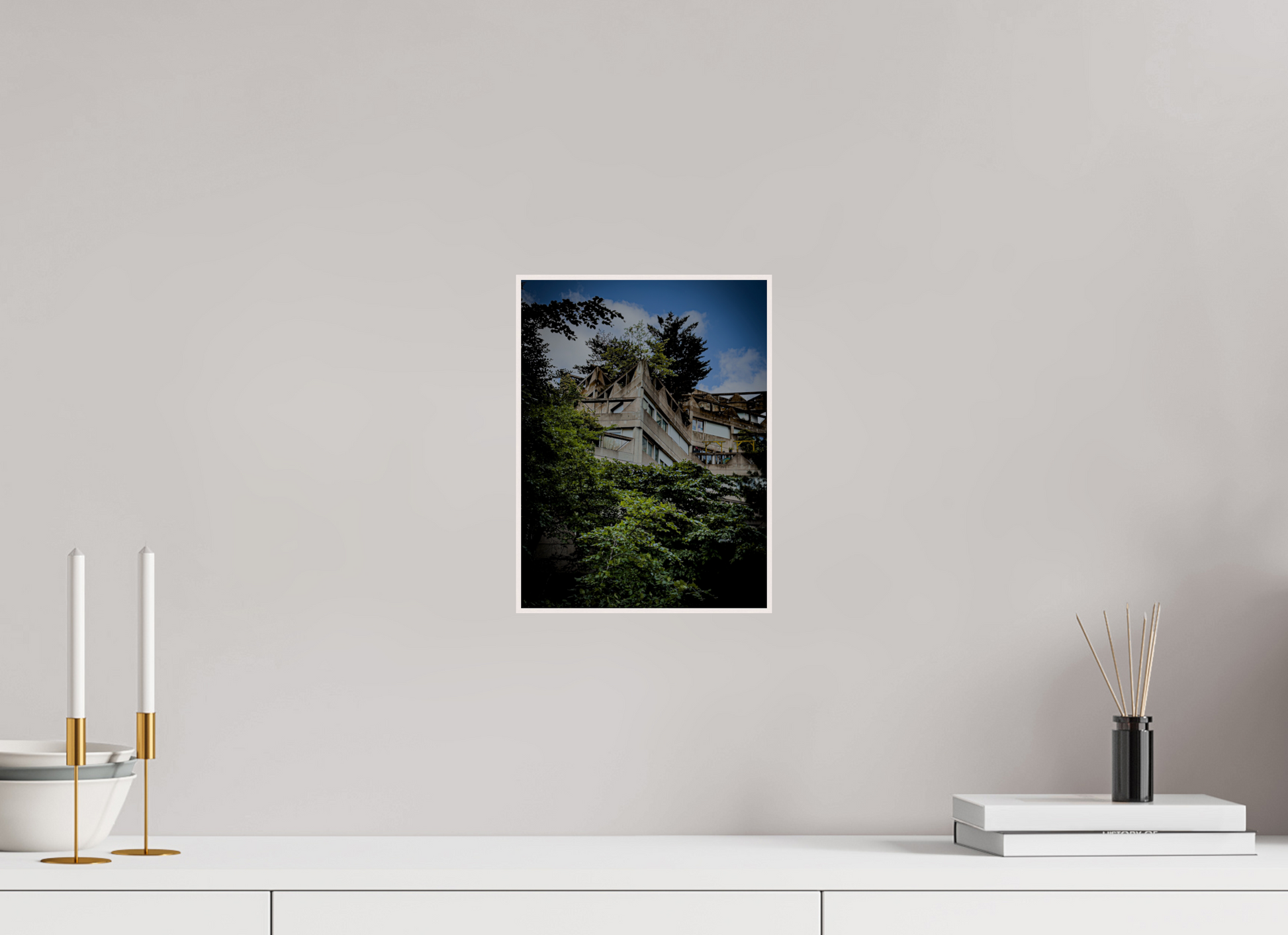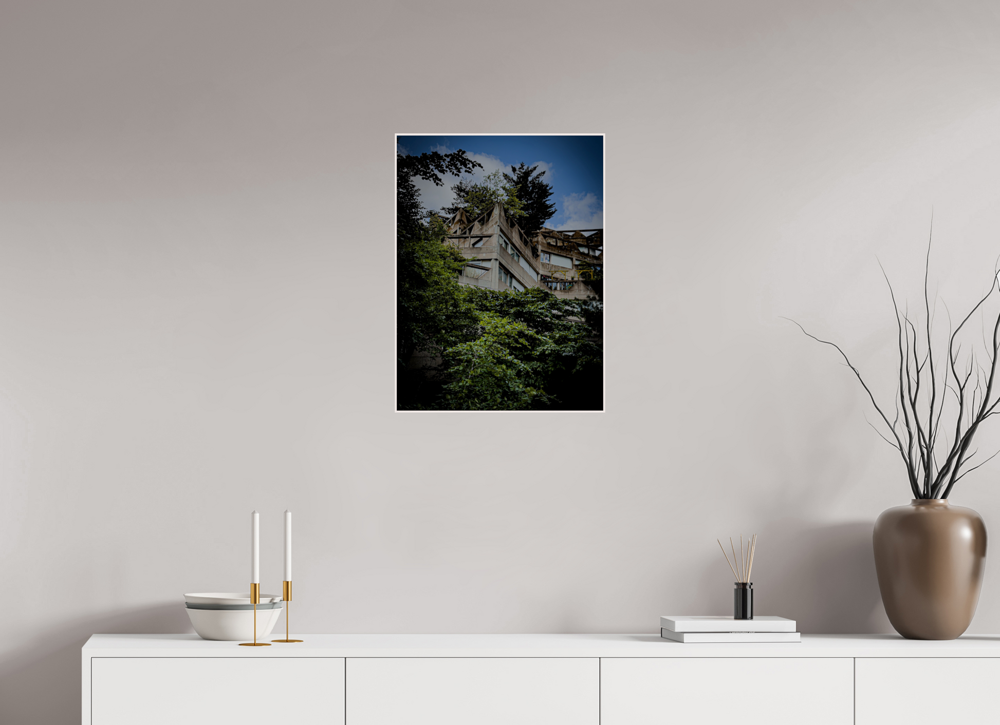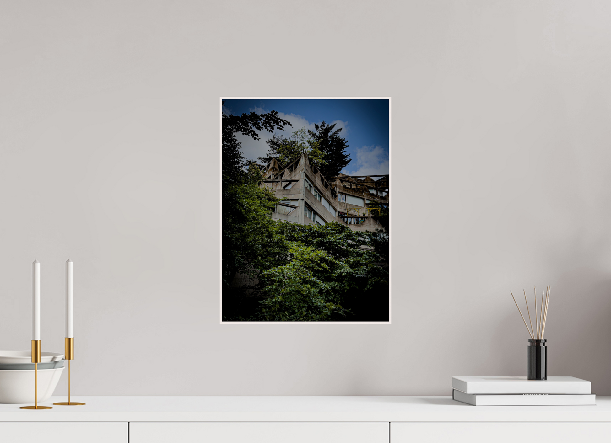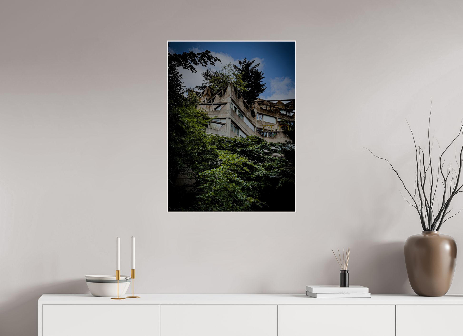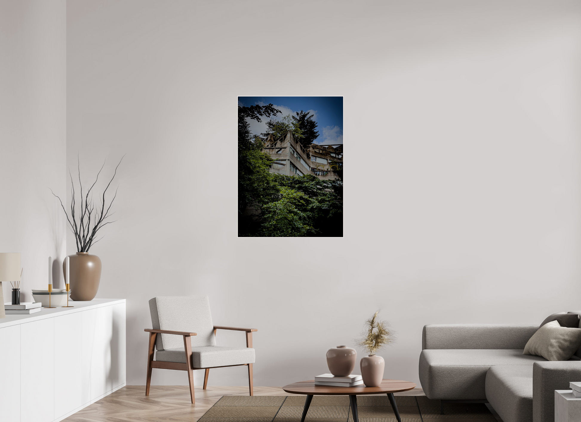 This image showcases the harmonious coexistence of brutalist architecture and lush greenery. The concrete facade of the building, with its characteristic angular forms, is softened by the vibrant foliage that climbs and surrounds it. The photograph highlights the juxtaposition of the raw, unyielding nature of concrete with the organic, fluid forms of the plants.