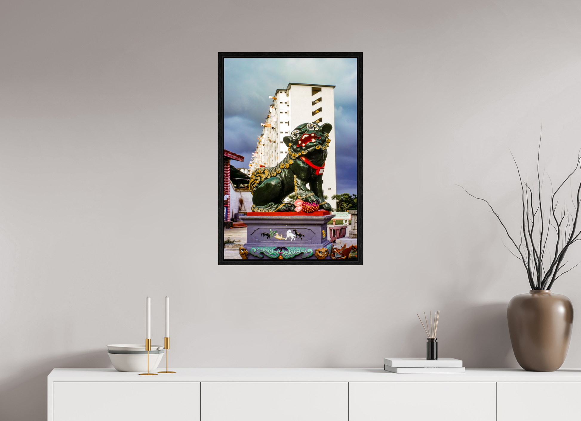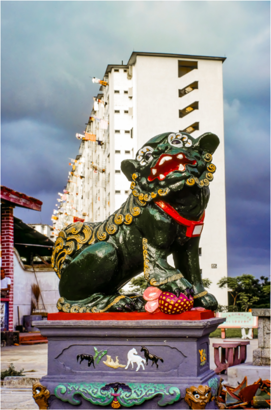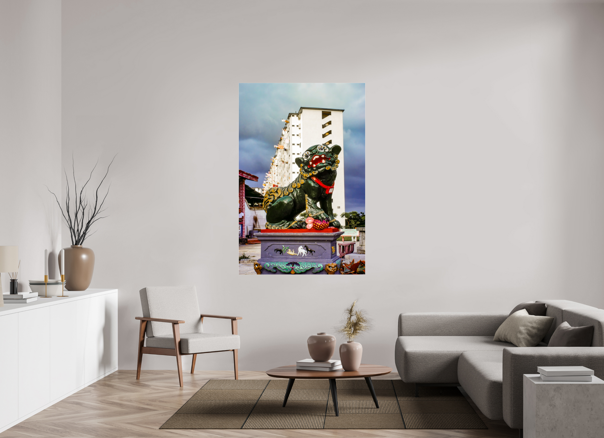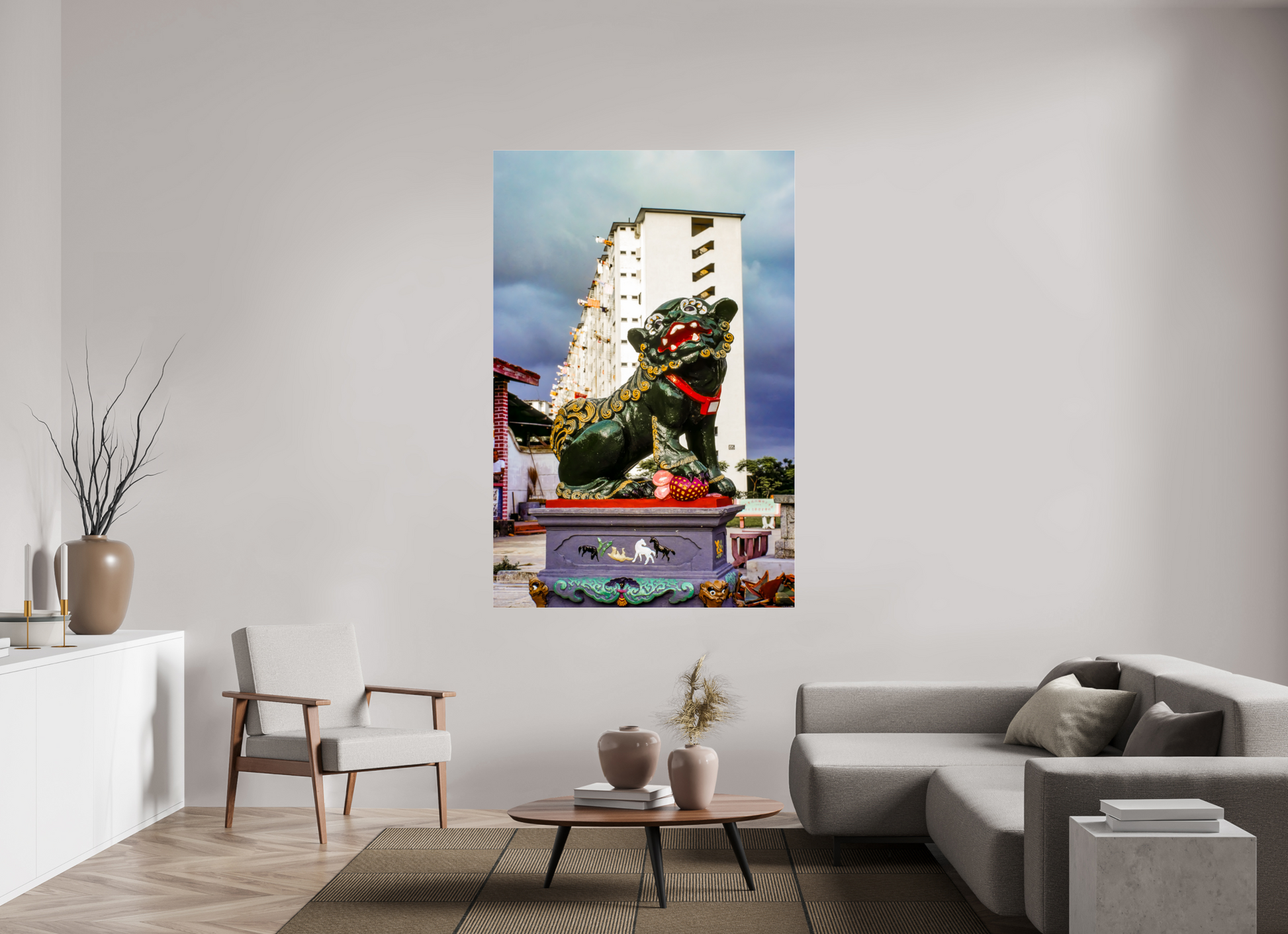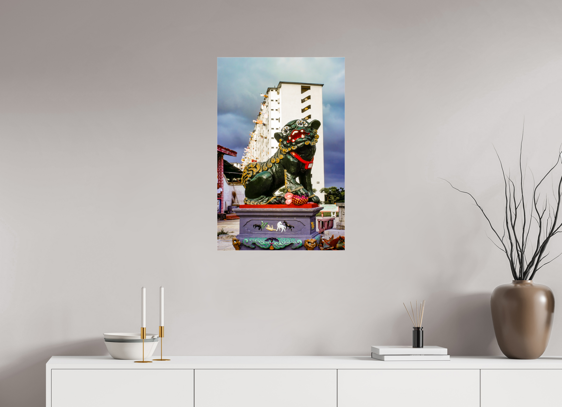 A majestic lion statue stands guard, its vibrant colors and intricate details reflecting the grandeur and spiritual significance of the temple it protects, inviting reverence and awe.