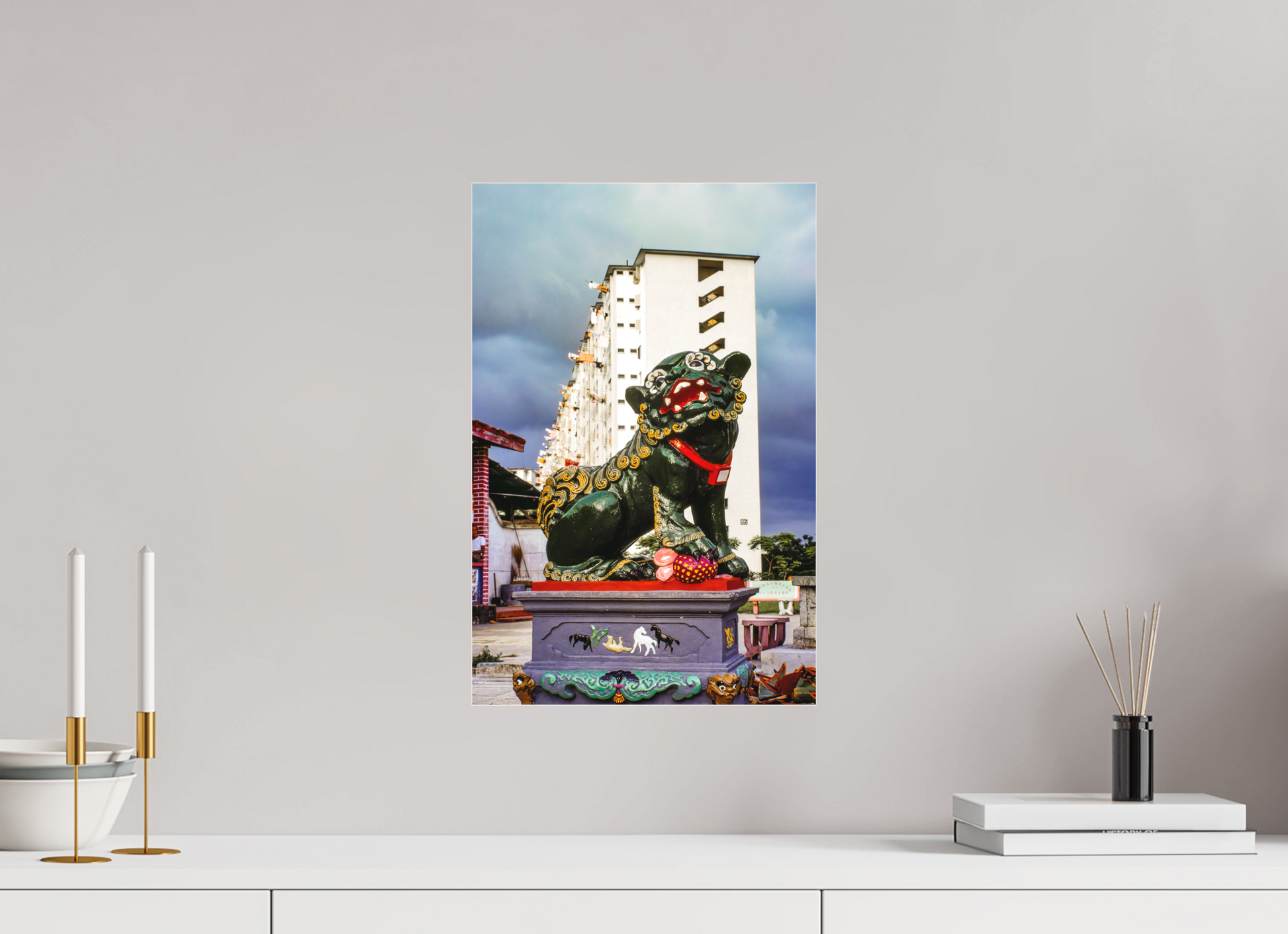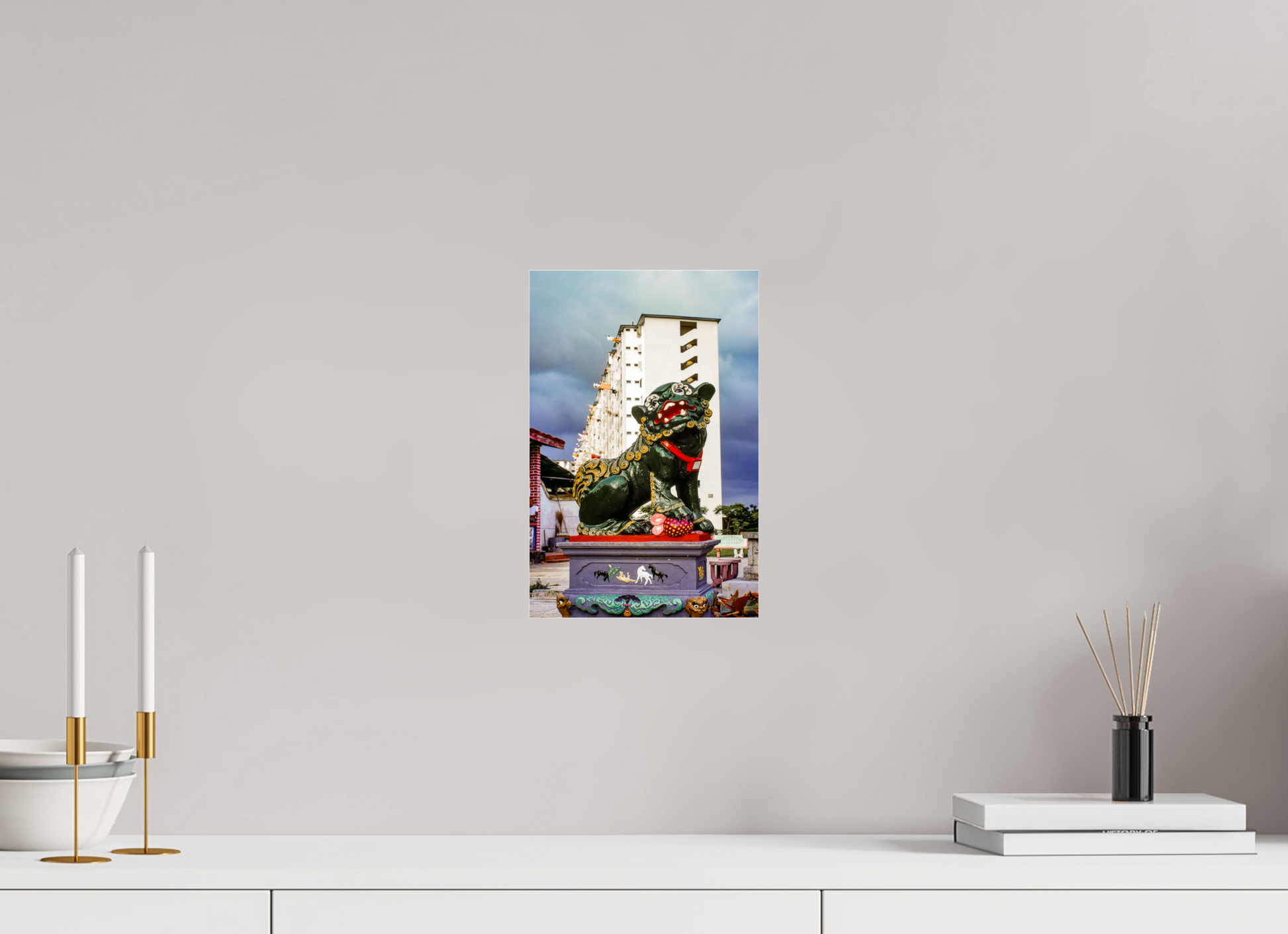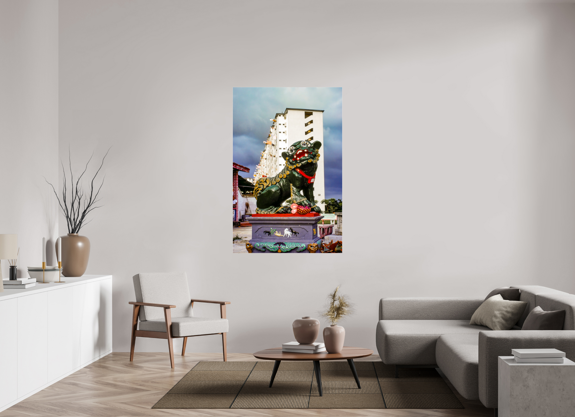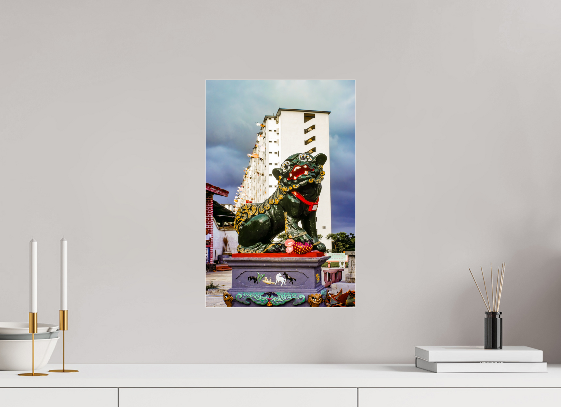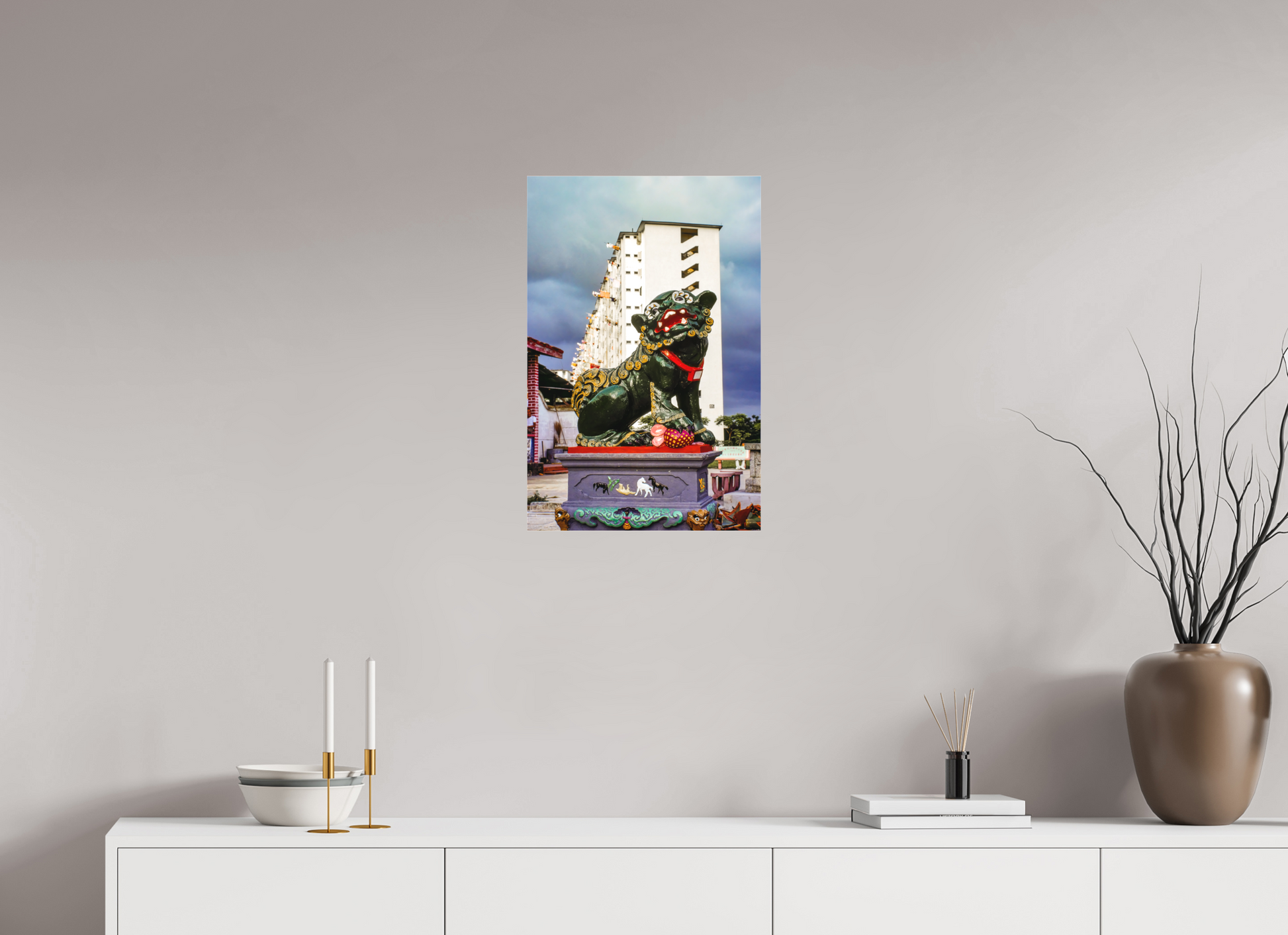 A majestic lion statue stands guard, its vibrant colors and intricate details reflecting the grandeur and spiritual significance of the temple it protects, inviting reverence and awe.