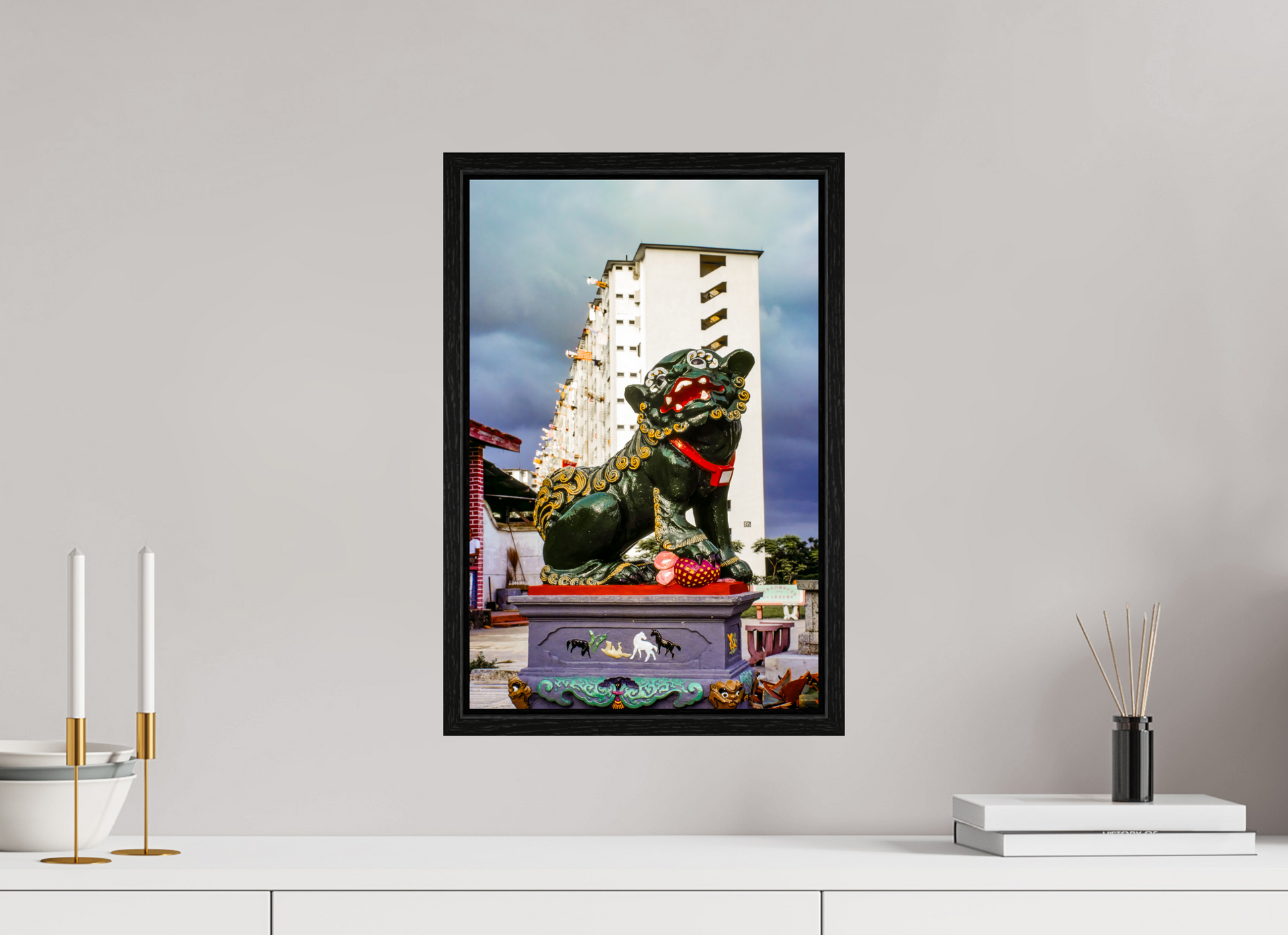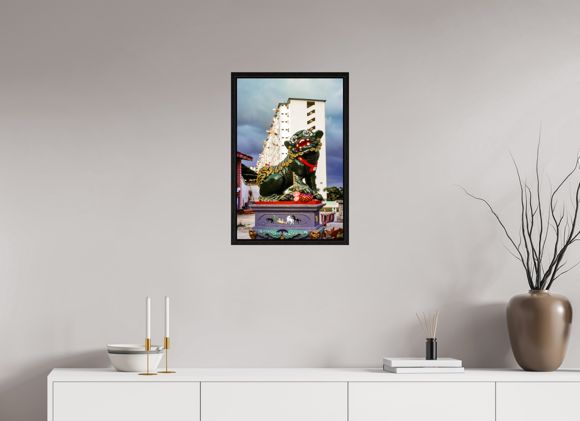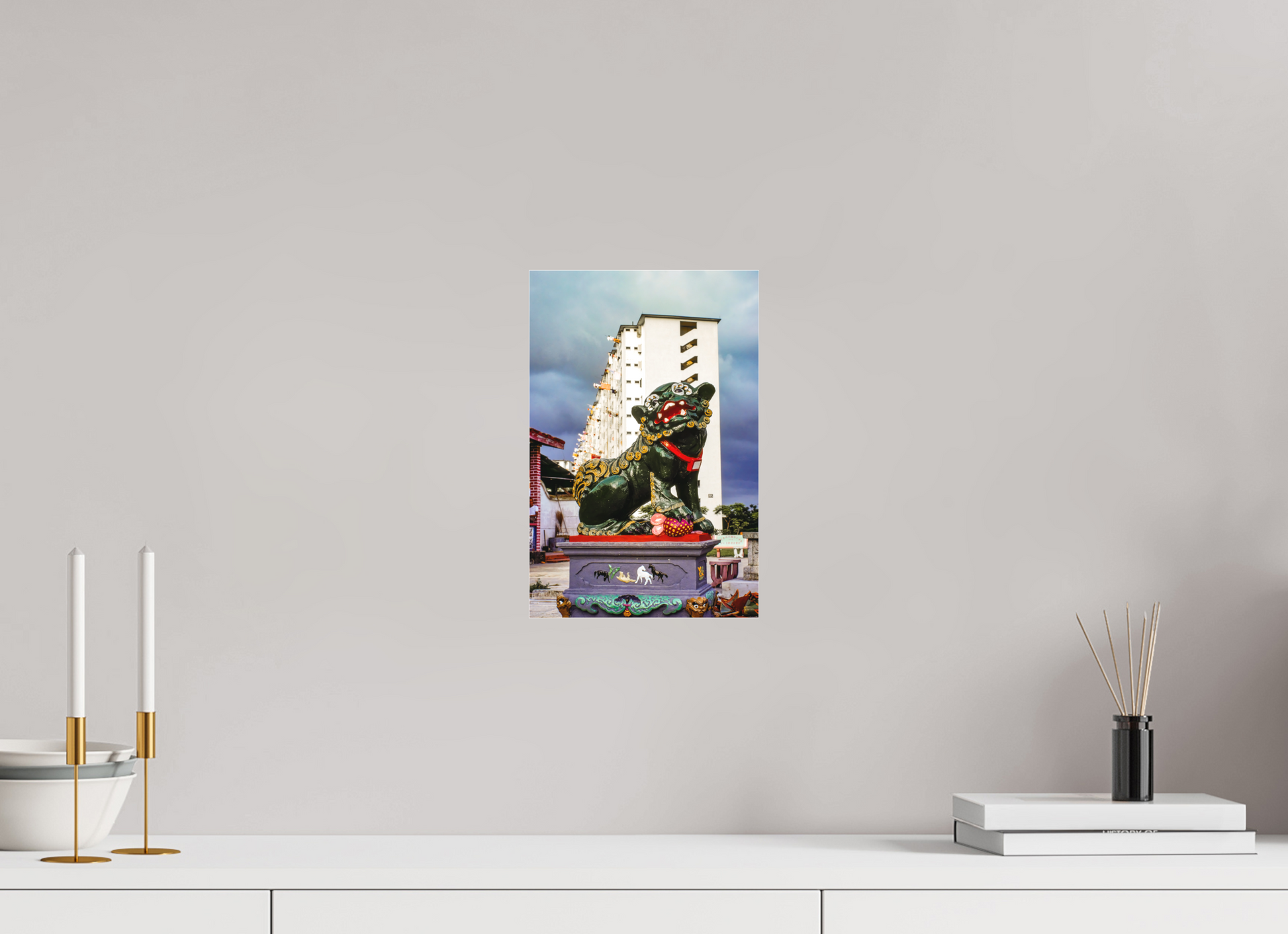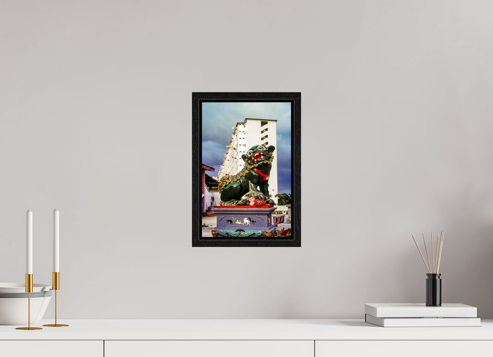 A majestic lion statue stands guard, its vibrant colors and intricate details reflecting the grandeur and spiritual significance of the temple it protects, inviting reverence and awe.