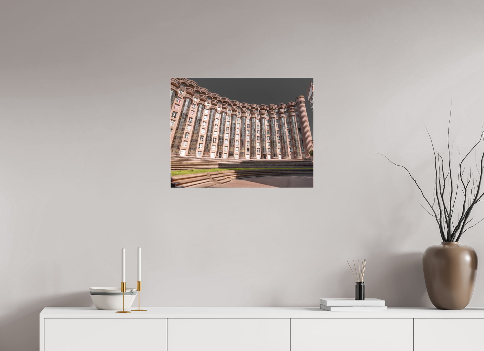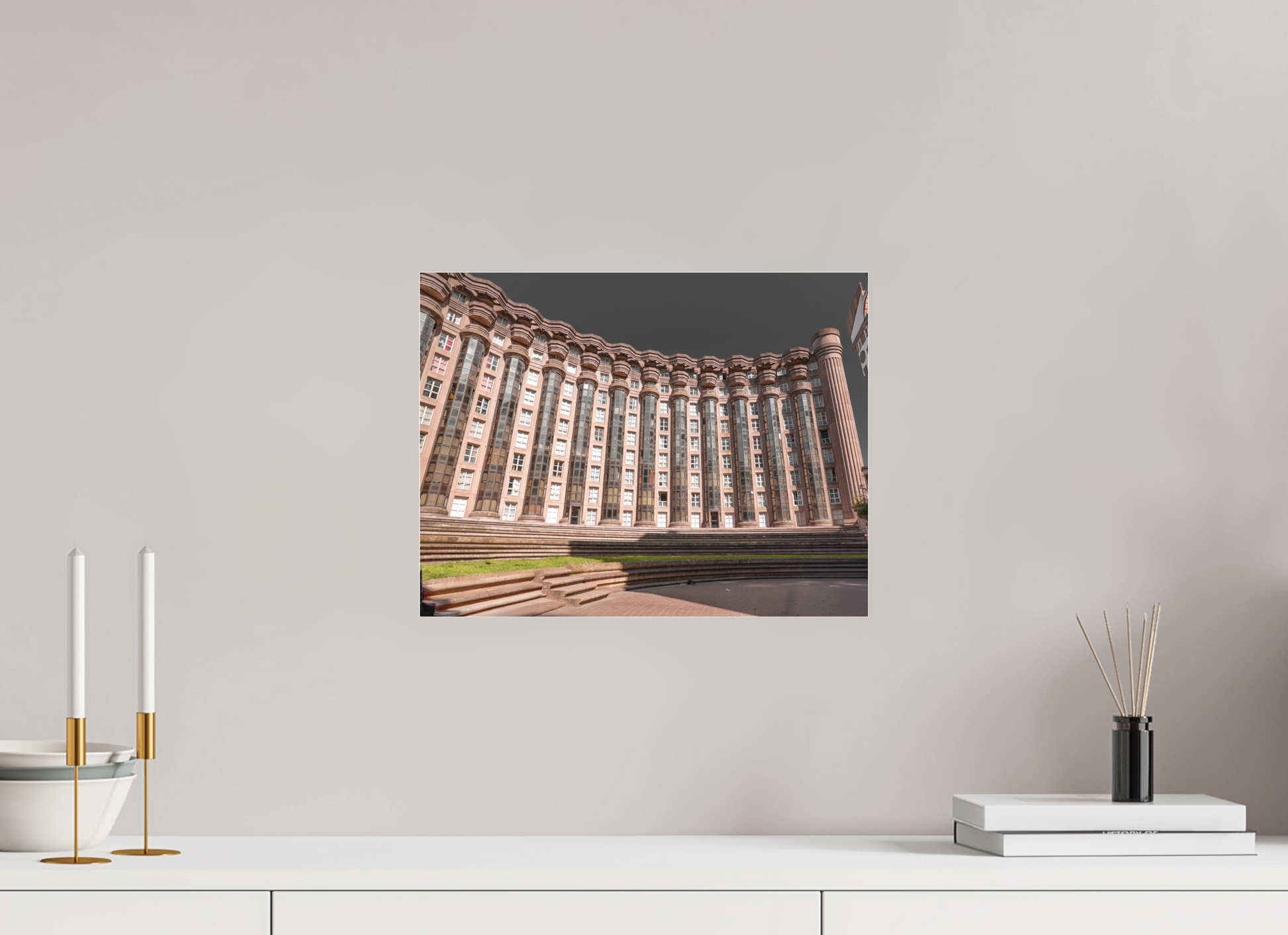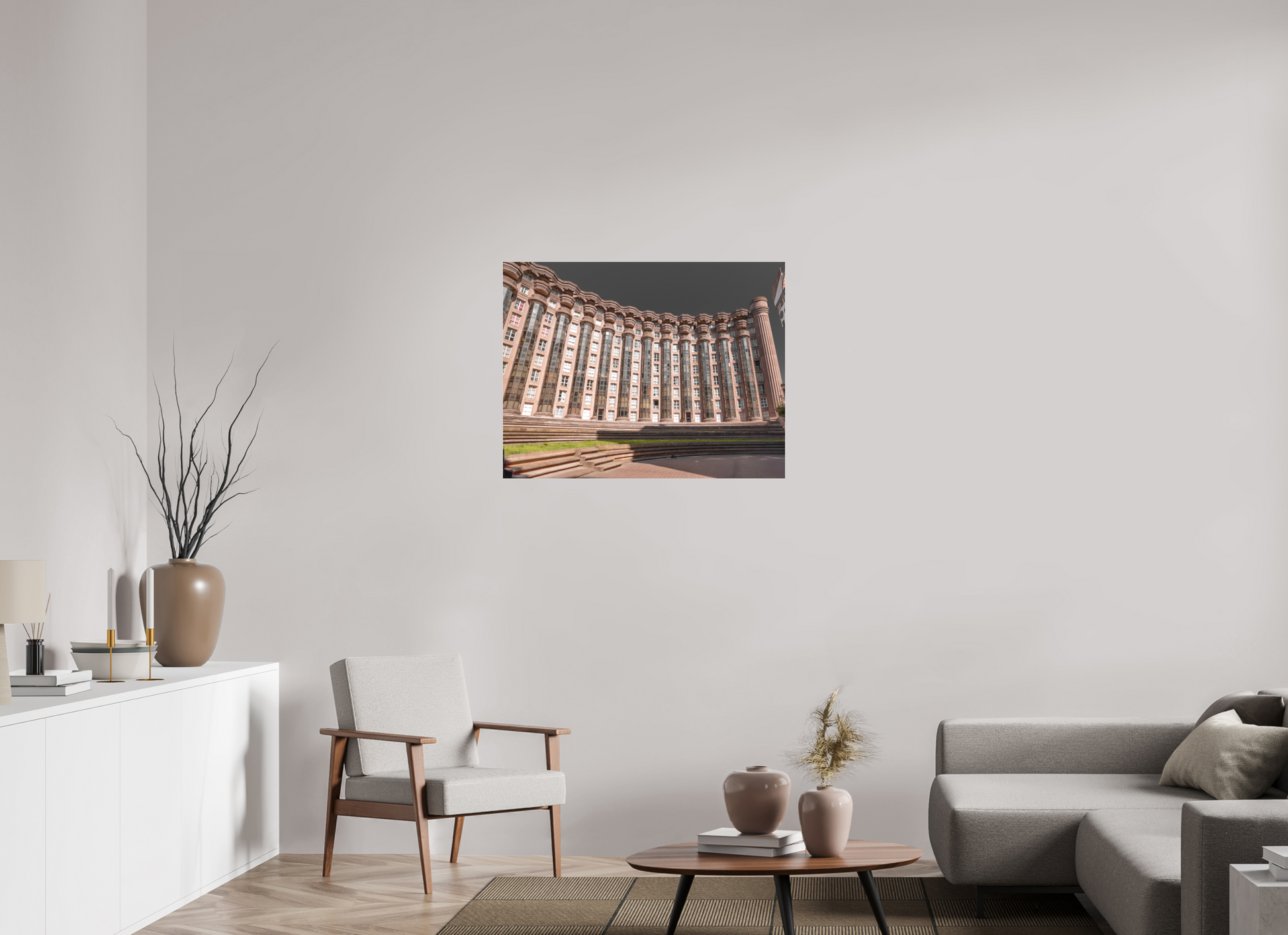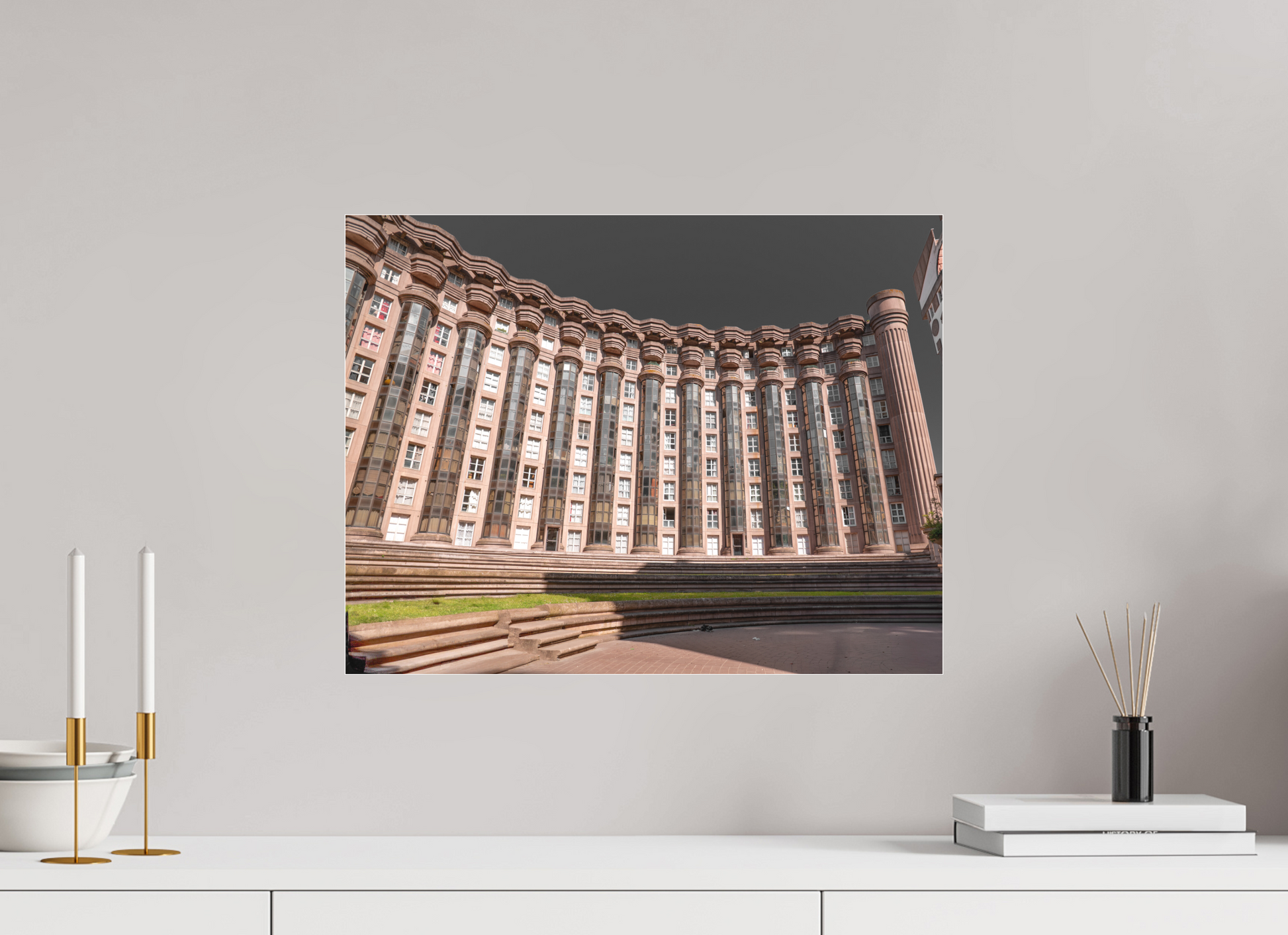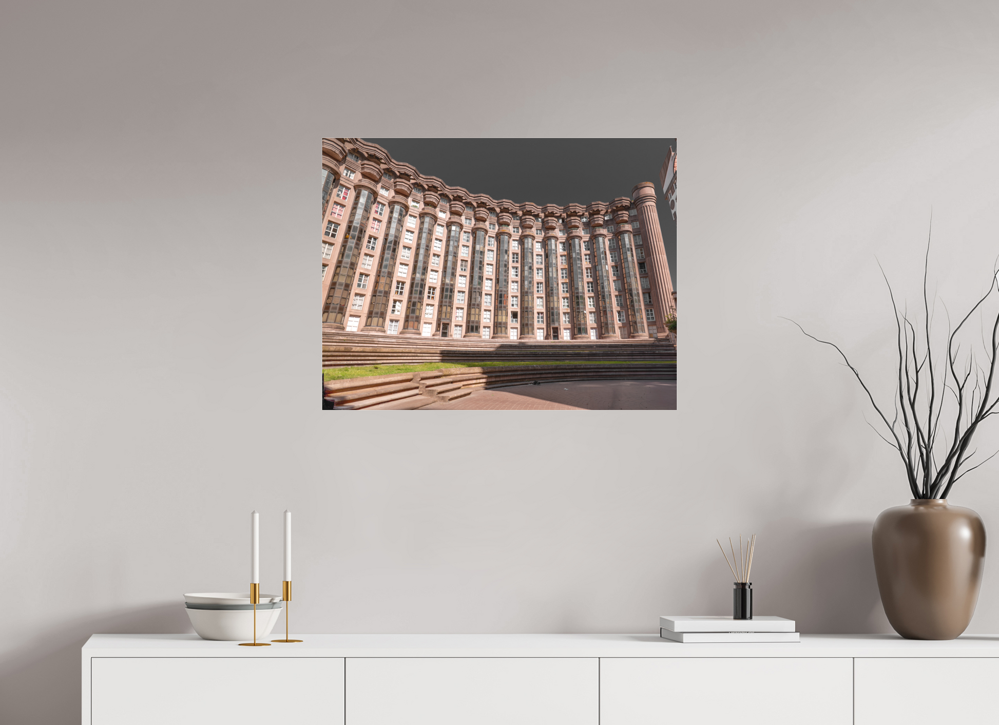 This image captures the imposing facade of the Espaces d'Abraxas, with its repeating columns and arches creating a sense of rhythm and order. The warm tones of the building contrast with the cool blue of the sky, adding depth and dimension to the scene. The intricate details and textures of the structure are highlighted by the interplay of light and shadow. Brutalism, the architectural style characterized by its use of raw concrete and bold, geometric forms, emerged in the mid-20th century as a response to the modernist movement. The term "brutalism" is derived from the French word "brut," meaning raw or unrefined, reflecting the style's emphasis on honesty and simplicity in design. Brutalist buildings often feature exposed structural elements, repetitive modular forms, and a lack of ornamentation. Despite its controversial reputation, brutalism has had a significant impact on urban architecture and continues to influence contemporary design.