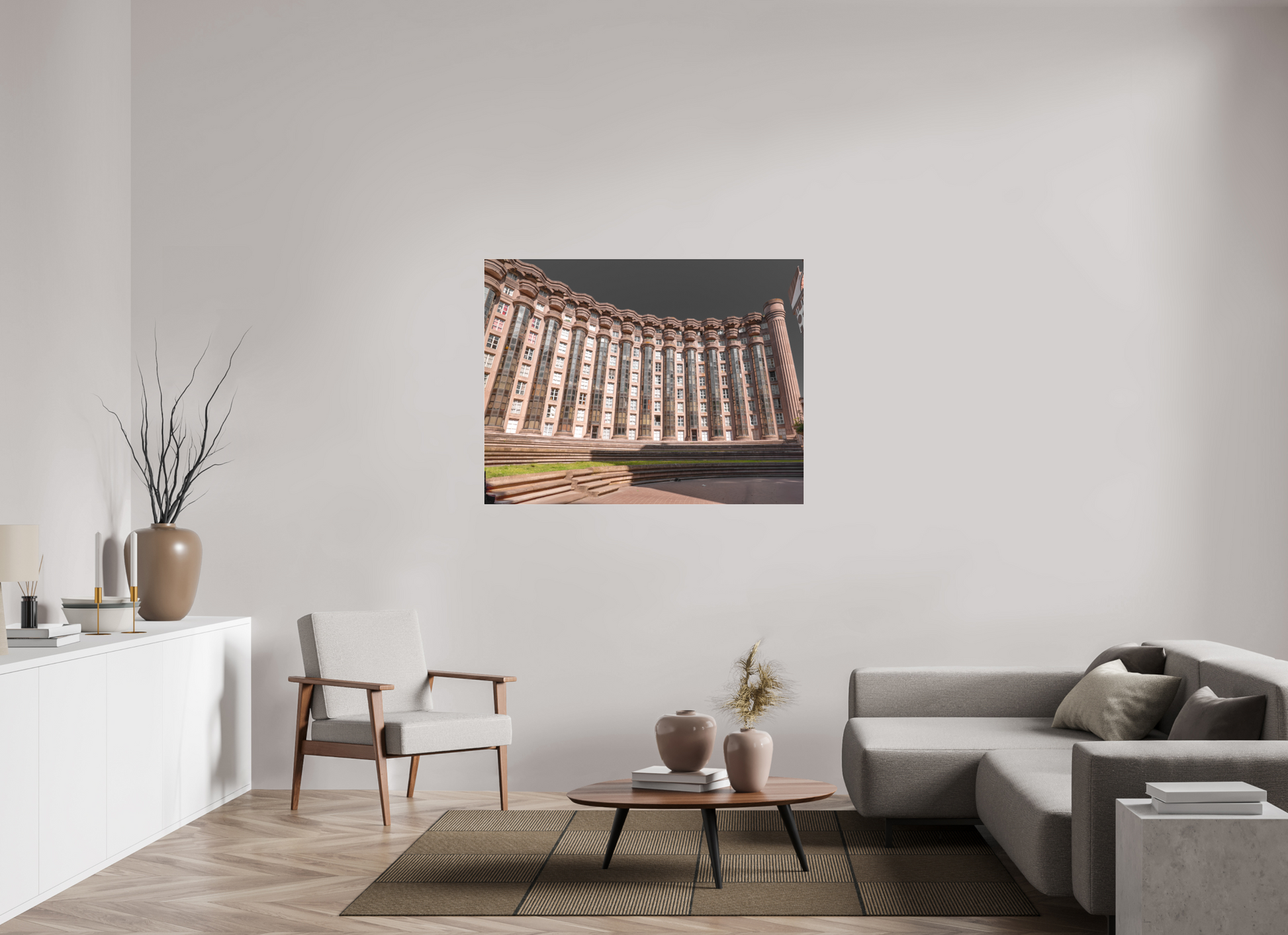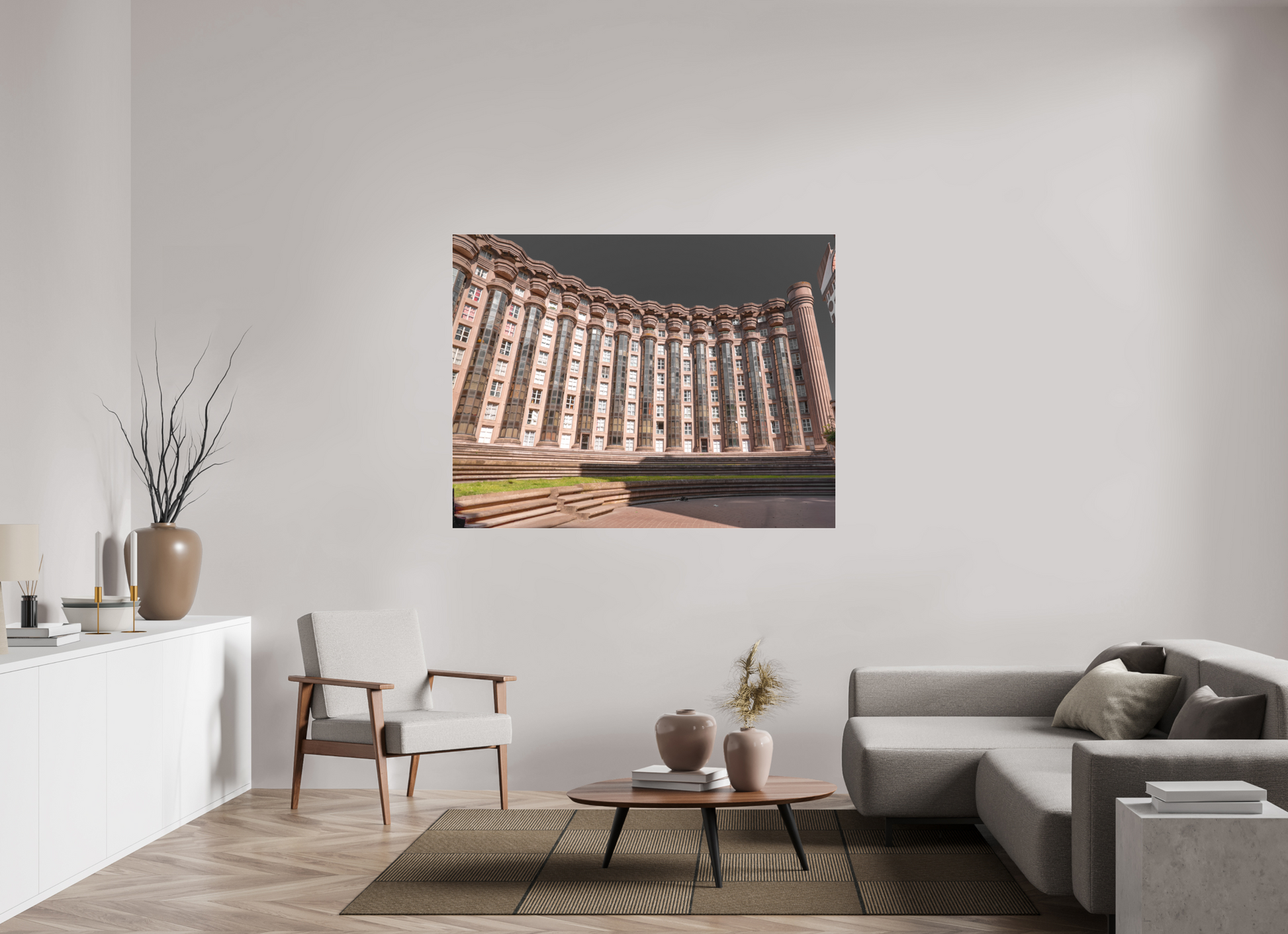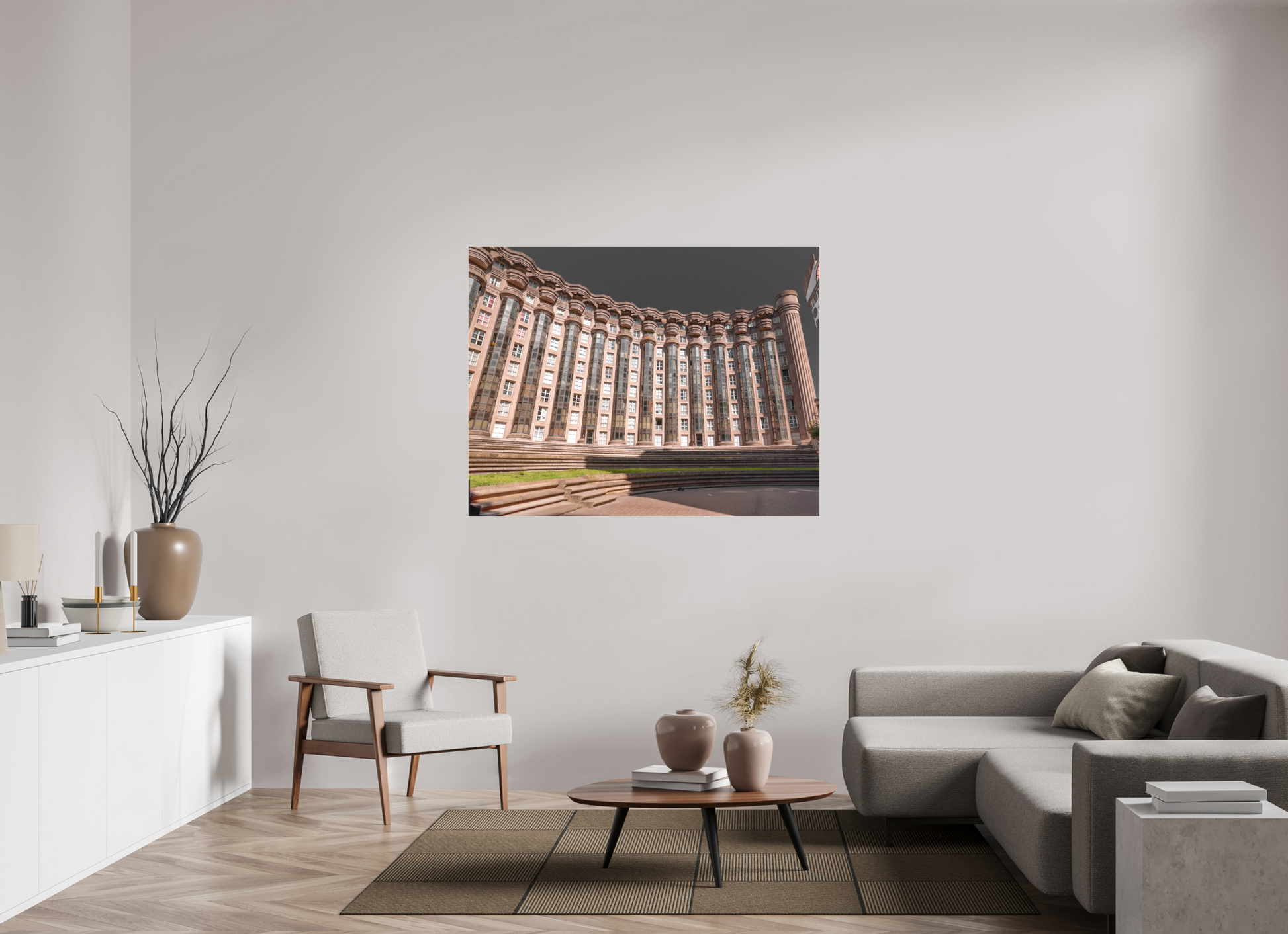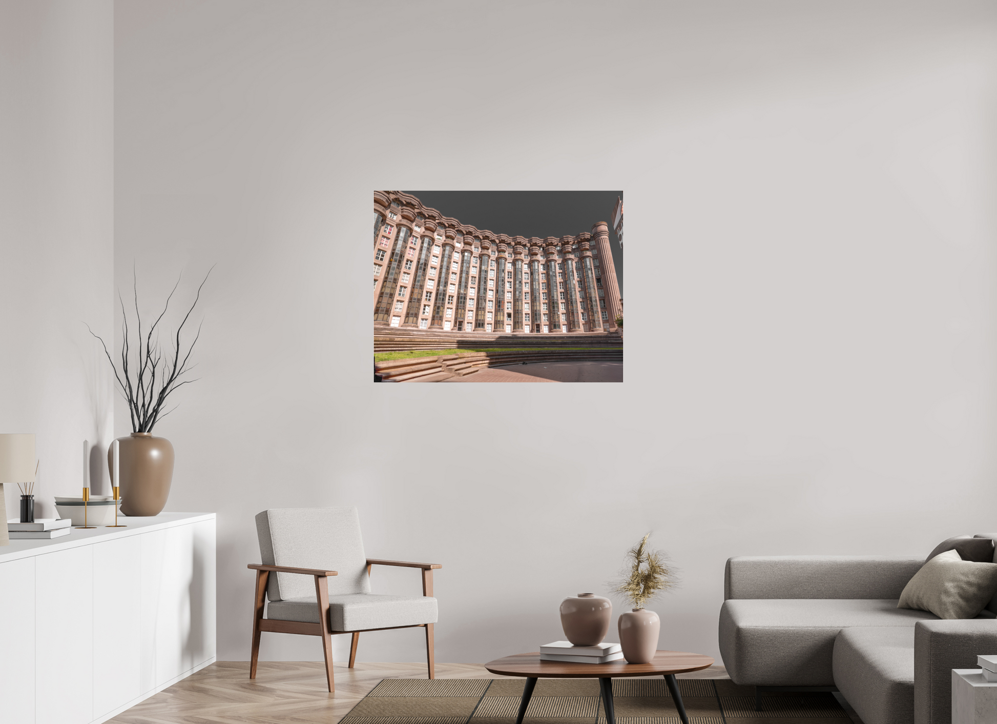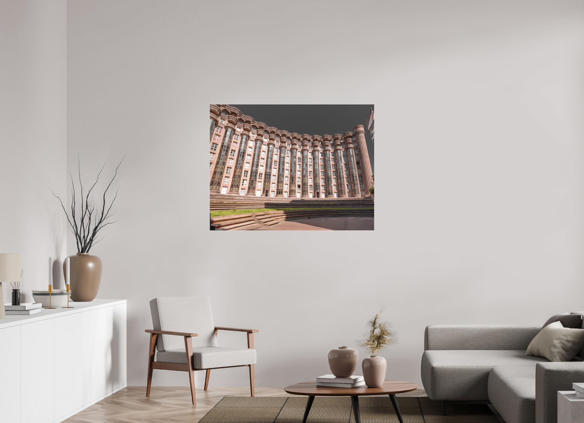 This image captures the imposing facade of the Espaces d'Abraxas, with its repeating columns and arches creating a sense of rhythm and order. The warm tones of the building contrast with the cool blue of the sky, adding depth and dimension to the scene. The intricate details and textures of the structure are highlighted by the interplay of light and shadow. Brutalism, the architectural style characterized by its use of raw concrete and bold, geometric forms, emerged in the mid-20th century as a response to the modernist movement. The term "brutalism" is derived from the French word "brut," meaning raw or unrefined, reflecting the style's emphasis on honesty and simplicity in design. Brutalist buildings often feature exposed structural elements, repetitive modular forms, and a lack of ornamentation. Despite its controversial reputation, brutalism has had a significant impact on urban architecture and continues to influence contemporary design.
